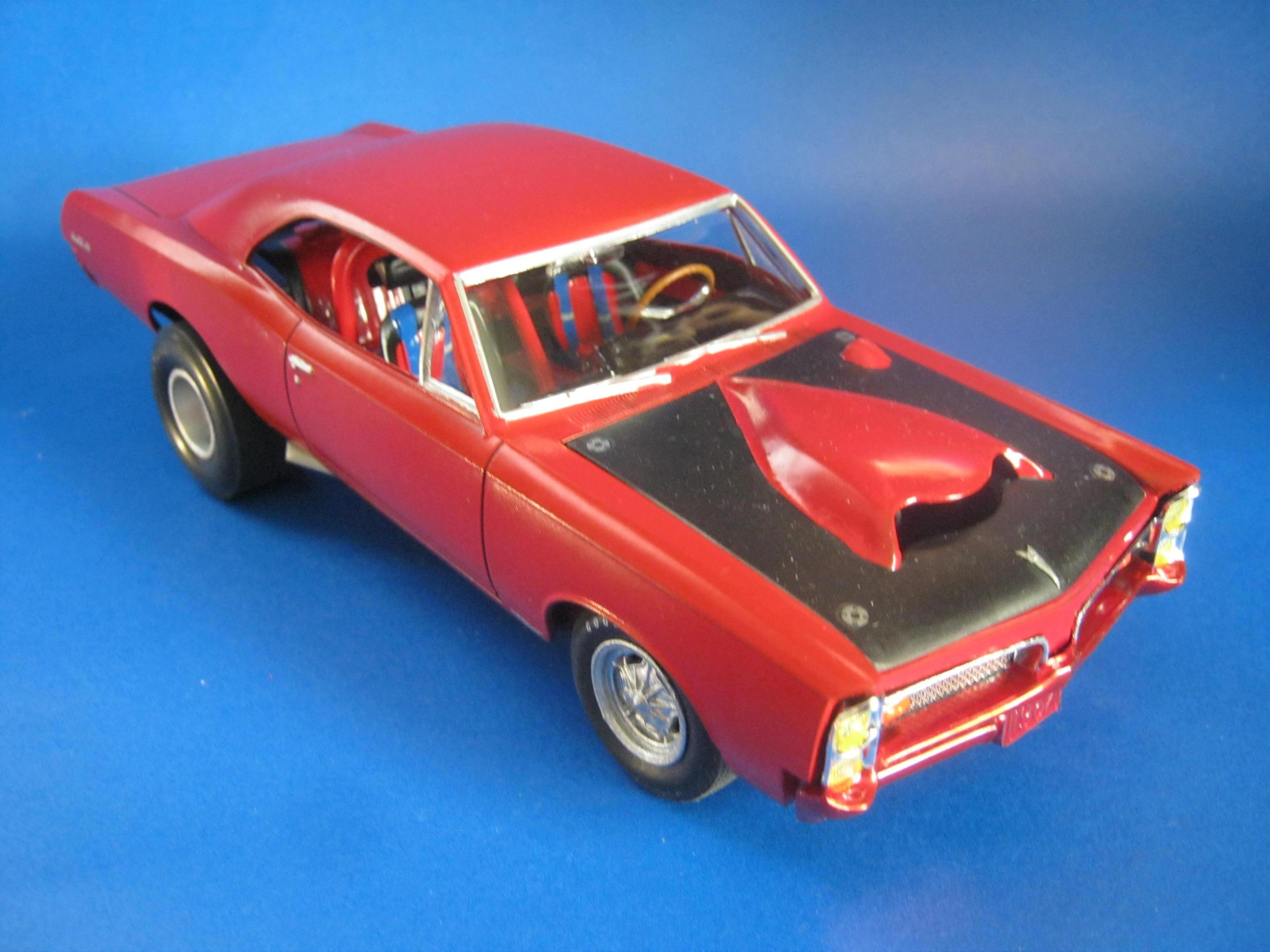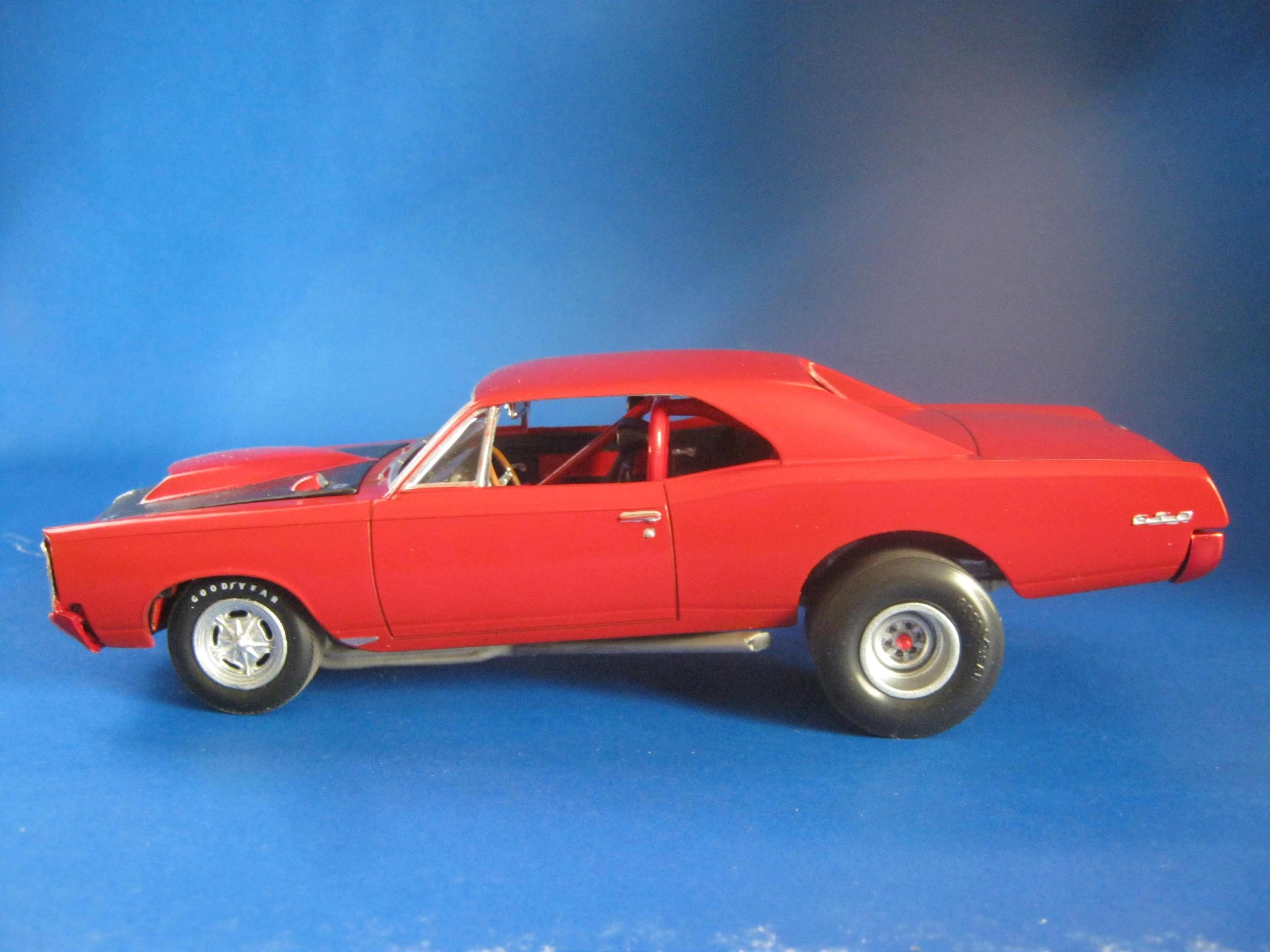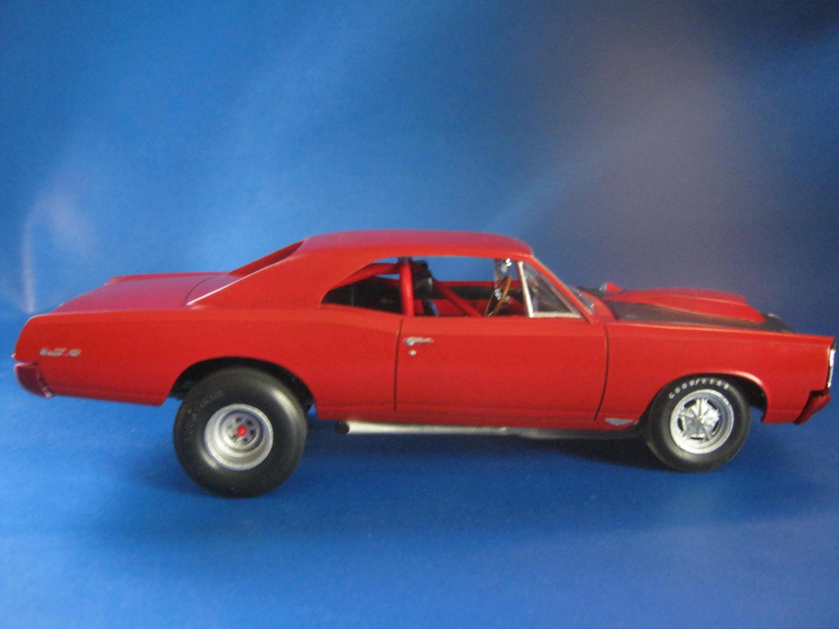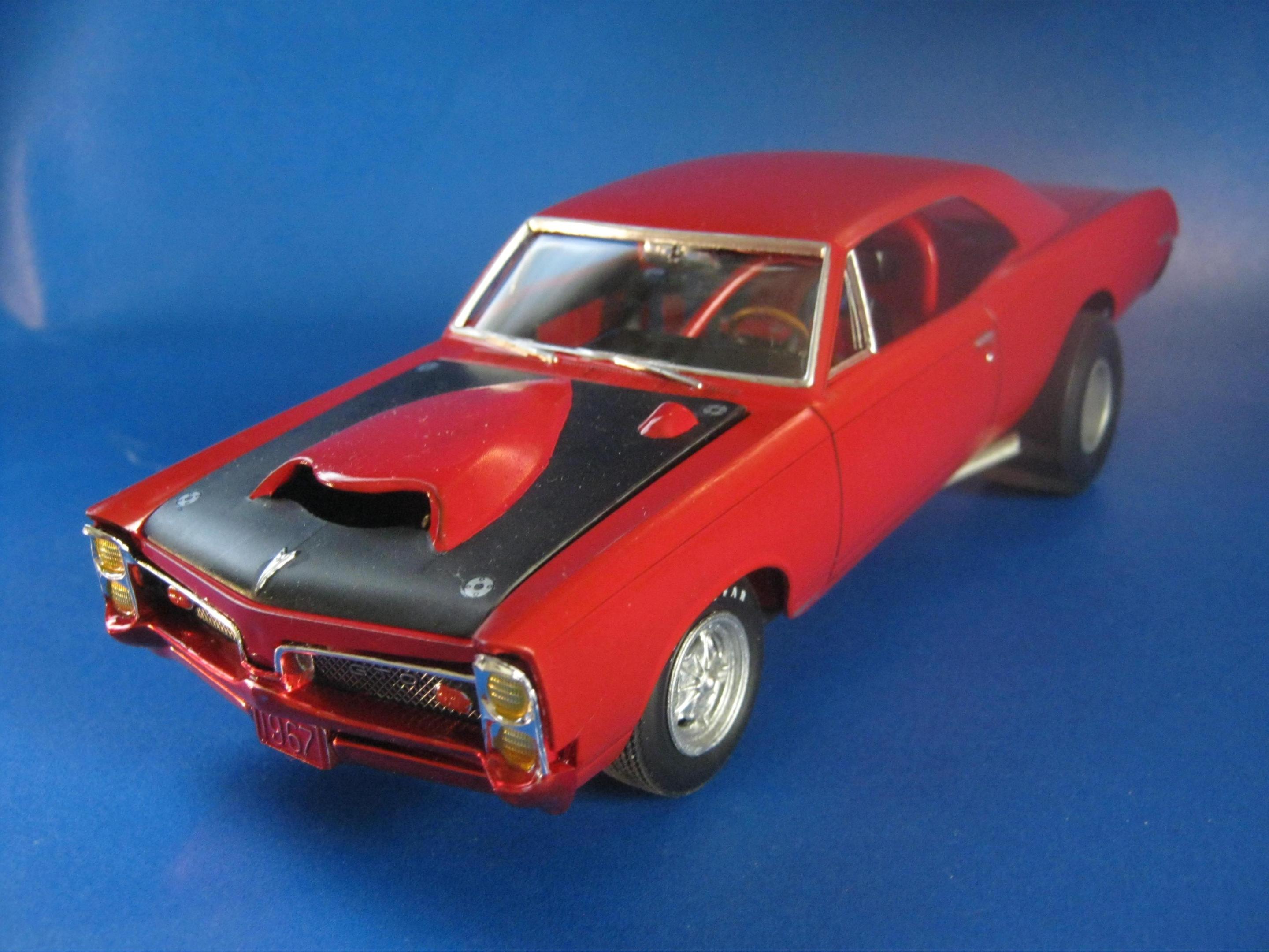 Happy Spring all,,its warming up here in motor City,,getting ready for the Autorama at cobo hall,,one of the best car shows in the nation,,along with the Woodward cruise in August. I just finished the MPC 67 ' GTO,,it turned out ok,,,warning about the front grill set. It dosent fit right. lol. not sure if its just the production lot I got my kit from Hobby lobby or what,,but man ,,had to file ..sand ect to get it this close. And as always I chopped,,cut,,modified quite a bit of it. I put some real tires on the back,,added some headrest to the seats,,added some side dump header pipes,,opened up the rear wheel wells to fit back tires,,installed a 409 mtr from the x-tras bx,,and 671 blower. Installed a replacement rear end from the x-tras bx. Rattle can sprayed red from the hardware store paint. hand painted everything else. Overall its a cool kit,,but it will test your fabrication+ modification skills. maybe if I had just left it stock it would have been easy,,but I hardly ever do that often. Build on!