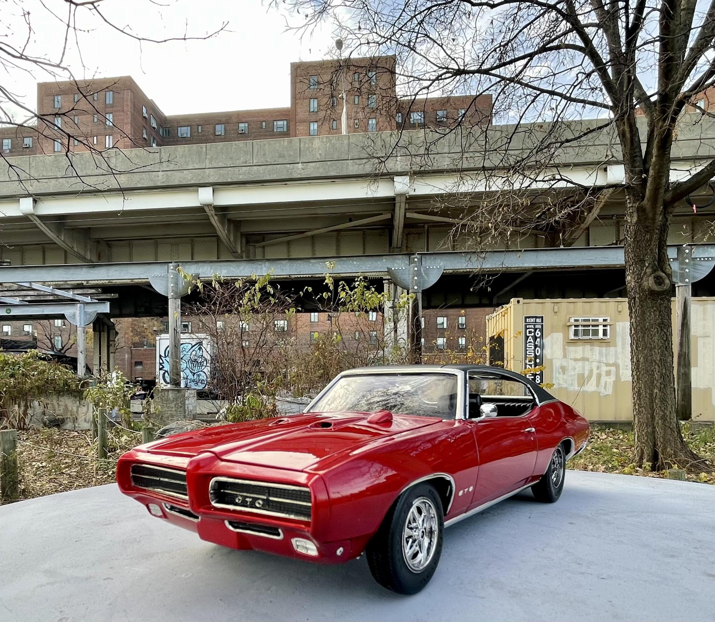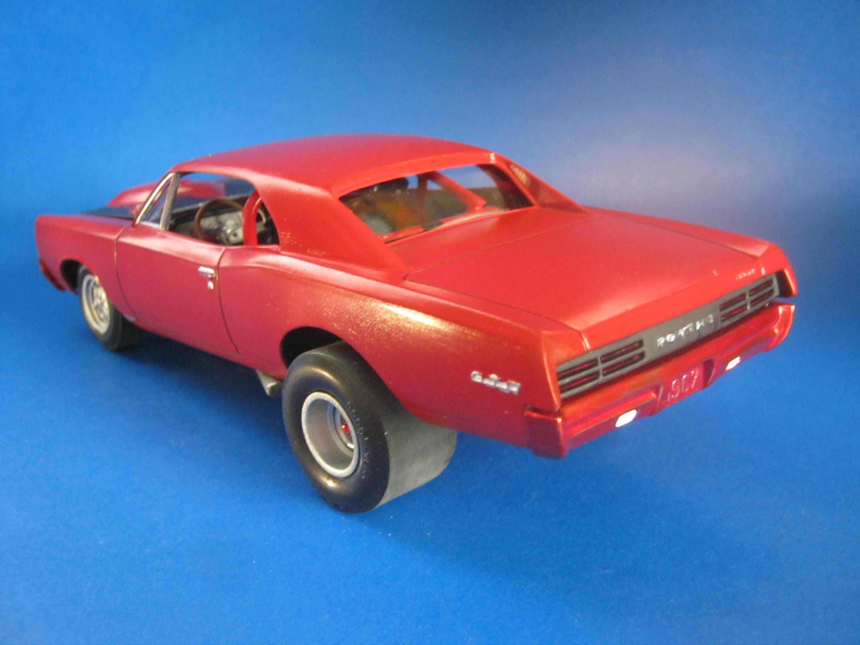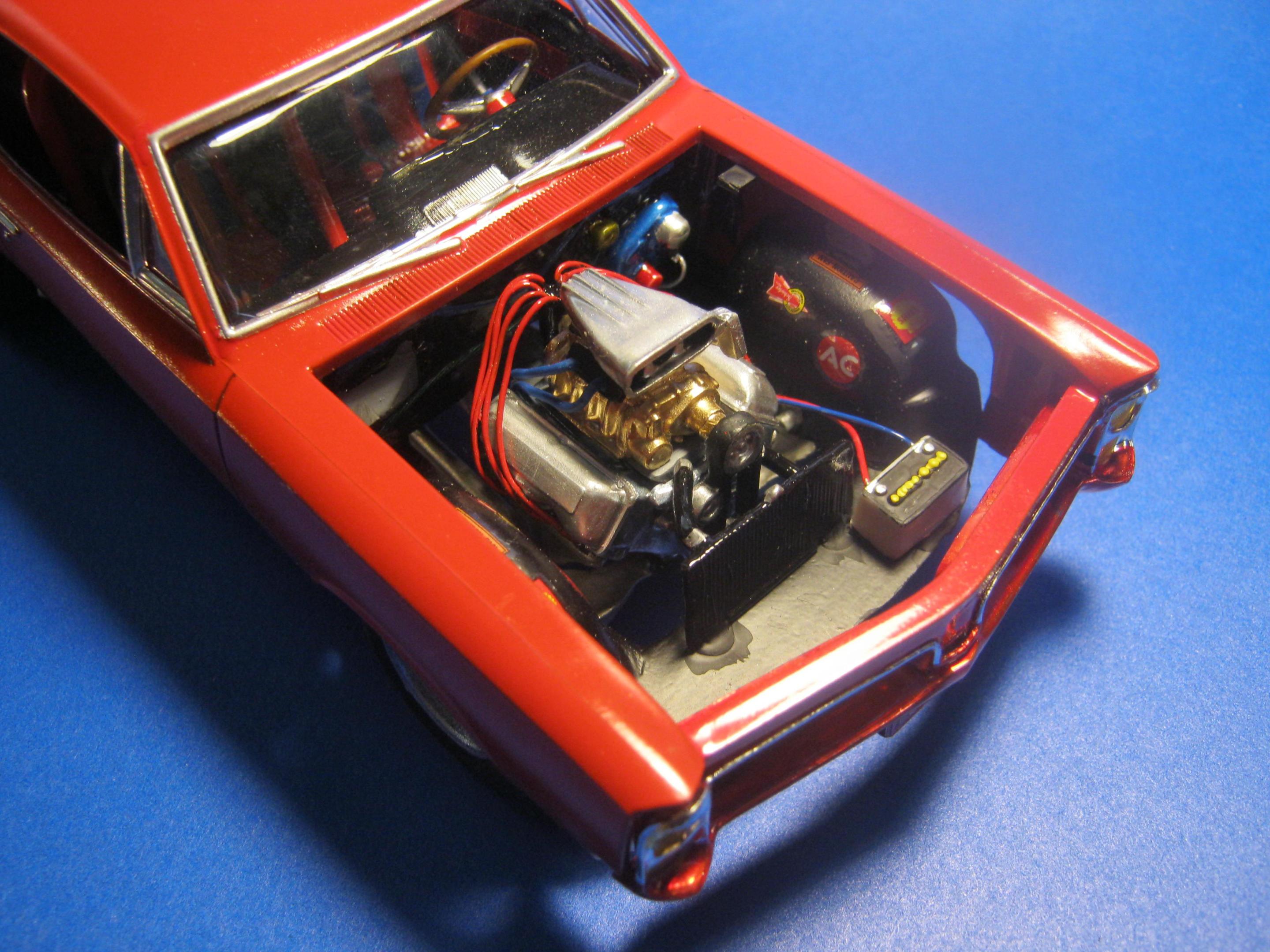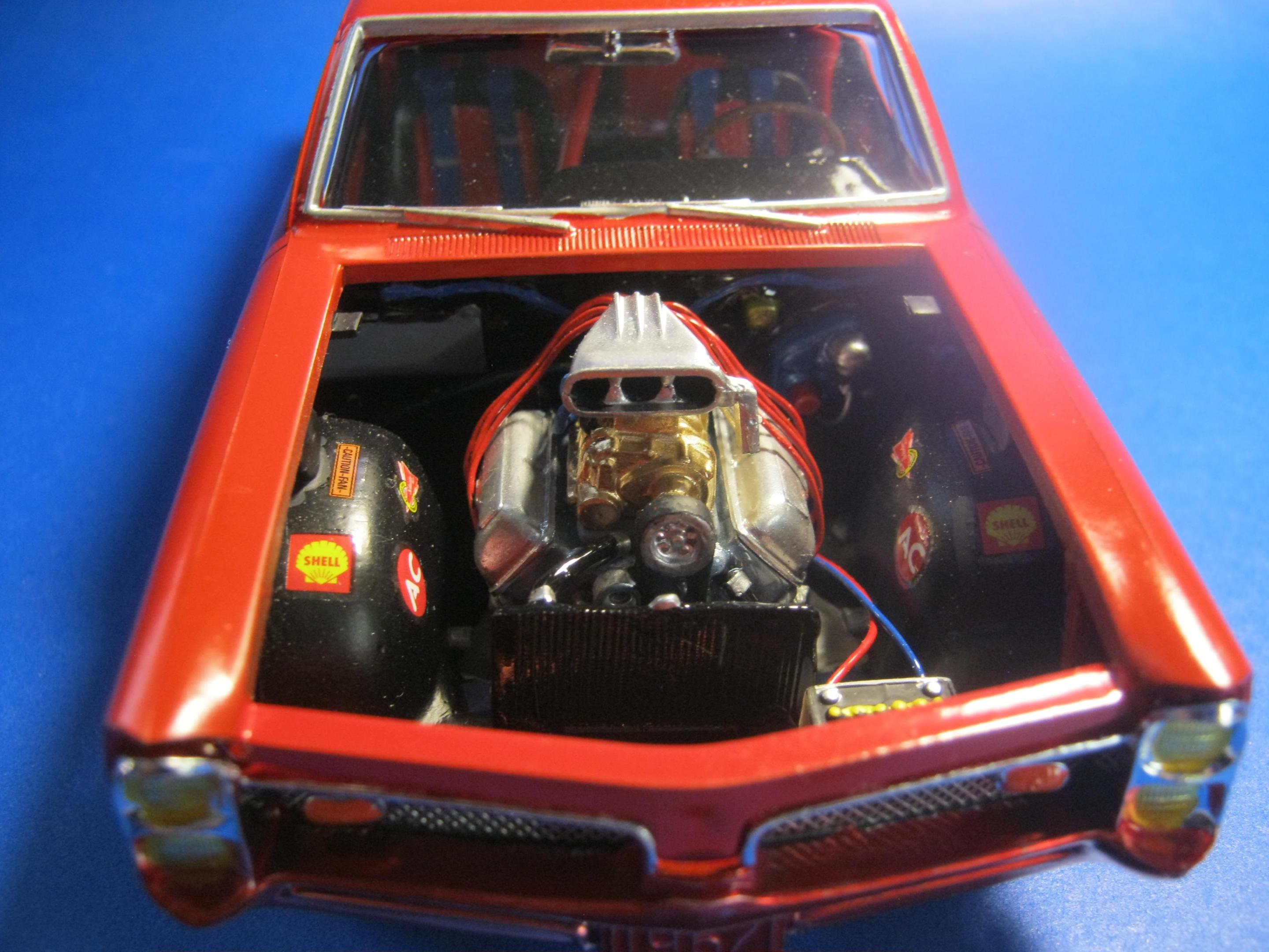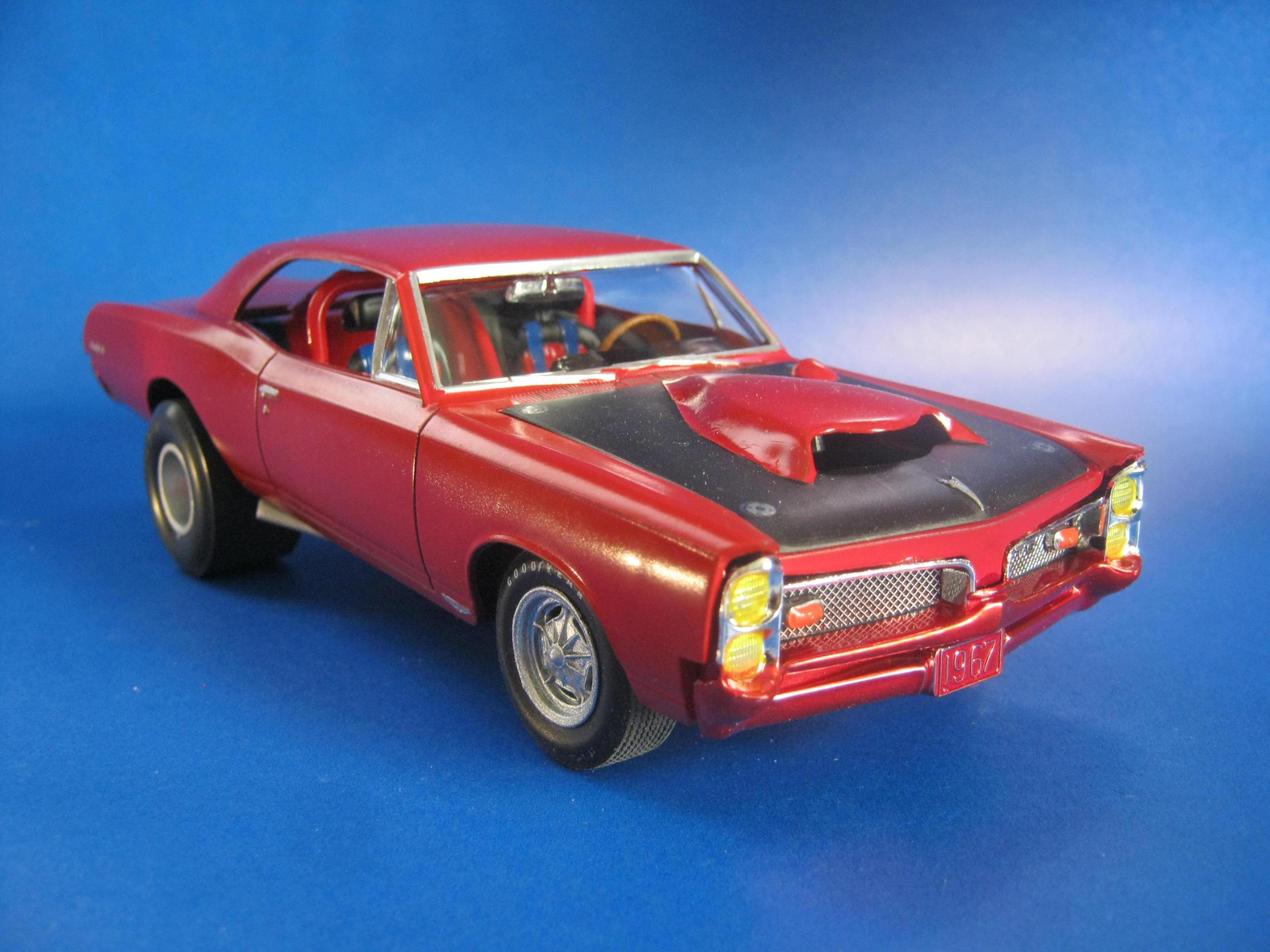 Happy Spring all,,its warming up here in motor City,,getting ready for the Autorama at cobo hall,,one of the best car shows in the nation,,along with the Woodward cruise in August. I just finished the MPC 67 ' GTO,,it turned out ok,,,warning about the front grill set. It dosent fit right. lol. not sure if its just the production lot I got my kit from Hobby lobby or what,,but man ,,had to file ..sand ect to get it this close. And as always I chopped,,cut,,modified quite a bit of it. I put some real tires on the back,,added some headrest to the seats,,added some side dump header pipes,,opened up the rear wheel wells to fit back tires,,installed a 409 mtr from the x-tras bx,,and 671 blower. Installed a replacement rear end from the x-tras bx. Rattle can sprayed red from the hardware store paint. hand painted everything else. Overall its a cool kit,,but it will test your fabrication+ modification skills. maybe if I had just left it stock it would have been easy,,but I hardly ever do that often. Build on!