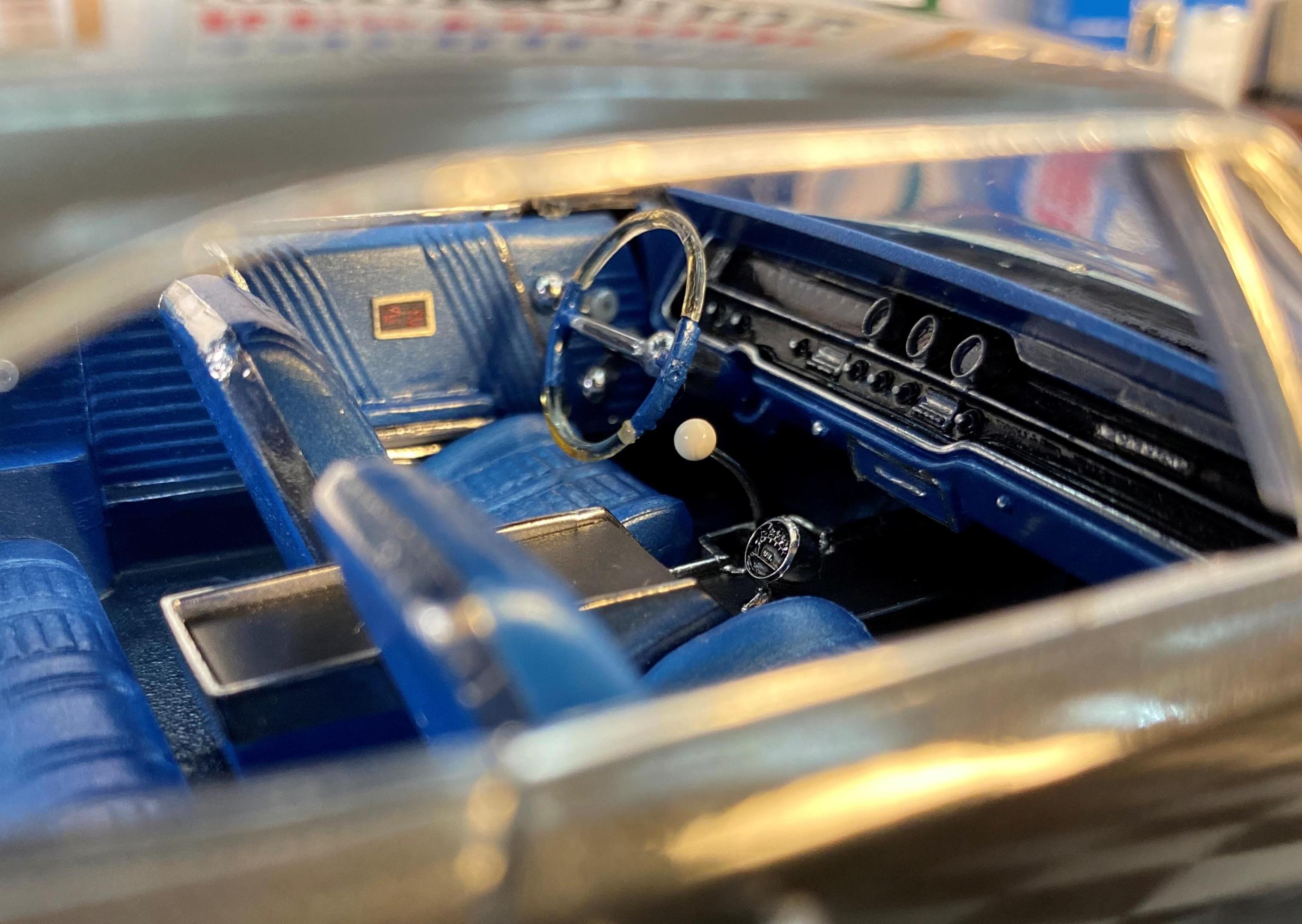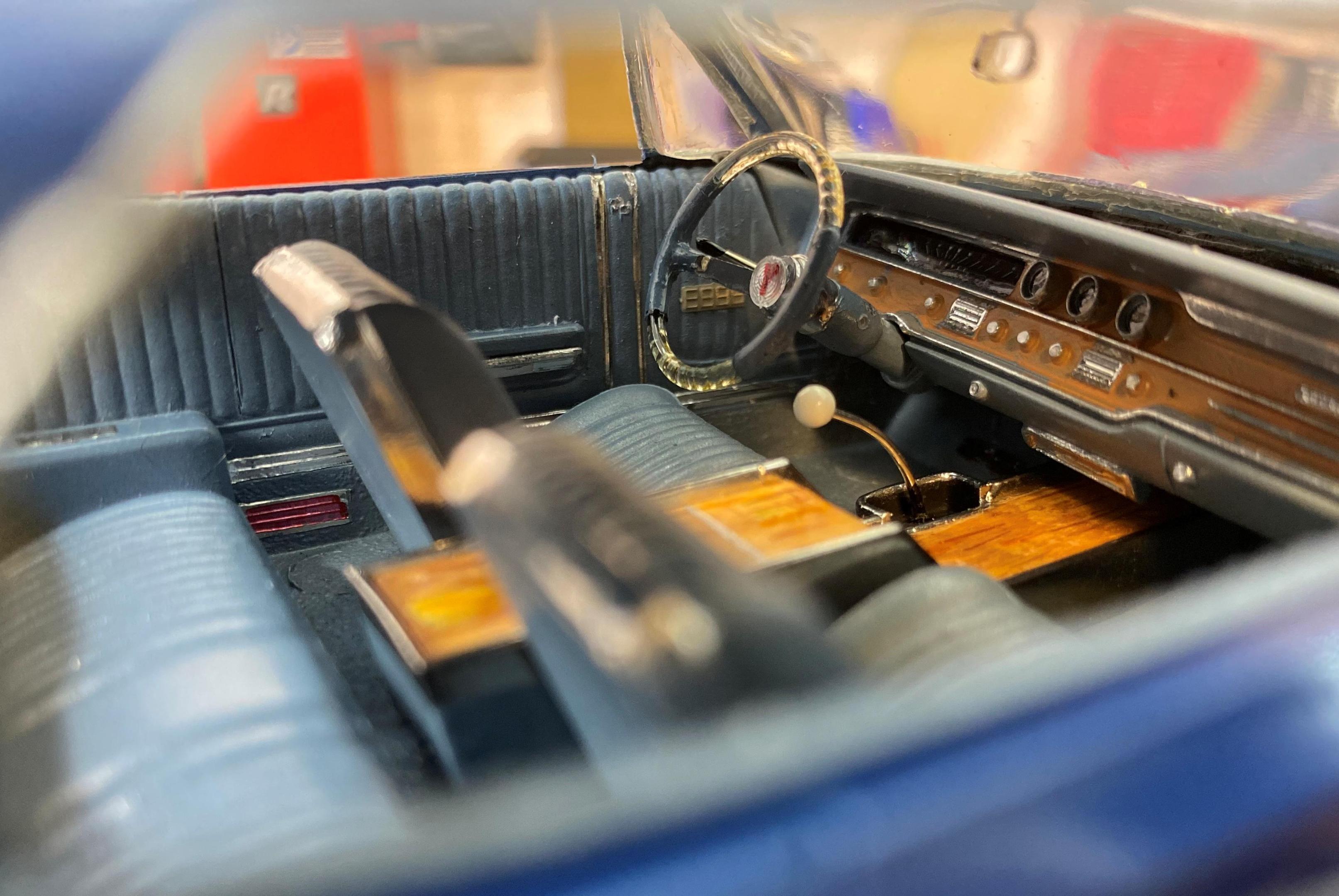 This one is now done. Introducing Sapphire. She is painted with Testors Arctic Blue enamel and has a, factory optional, slate interior. The console was scratch built and photoetched power window switches were installed. It is the luxury version of a Pontiac after all. She is one of the sisters in my Big Girls batch build.