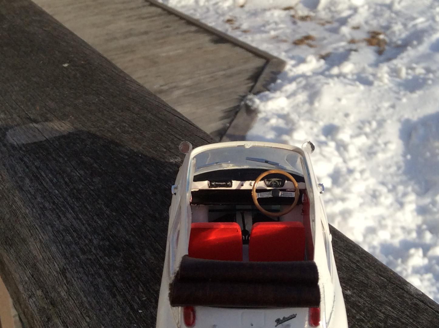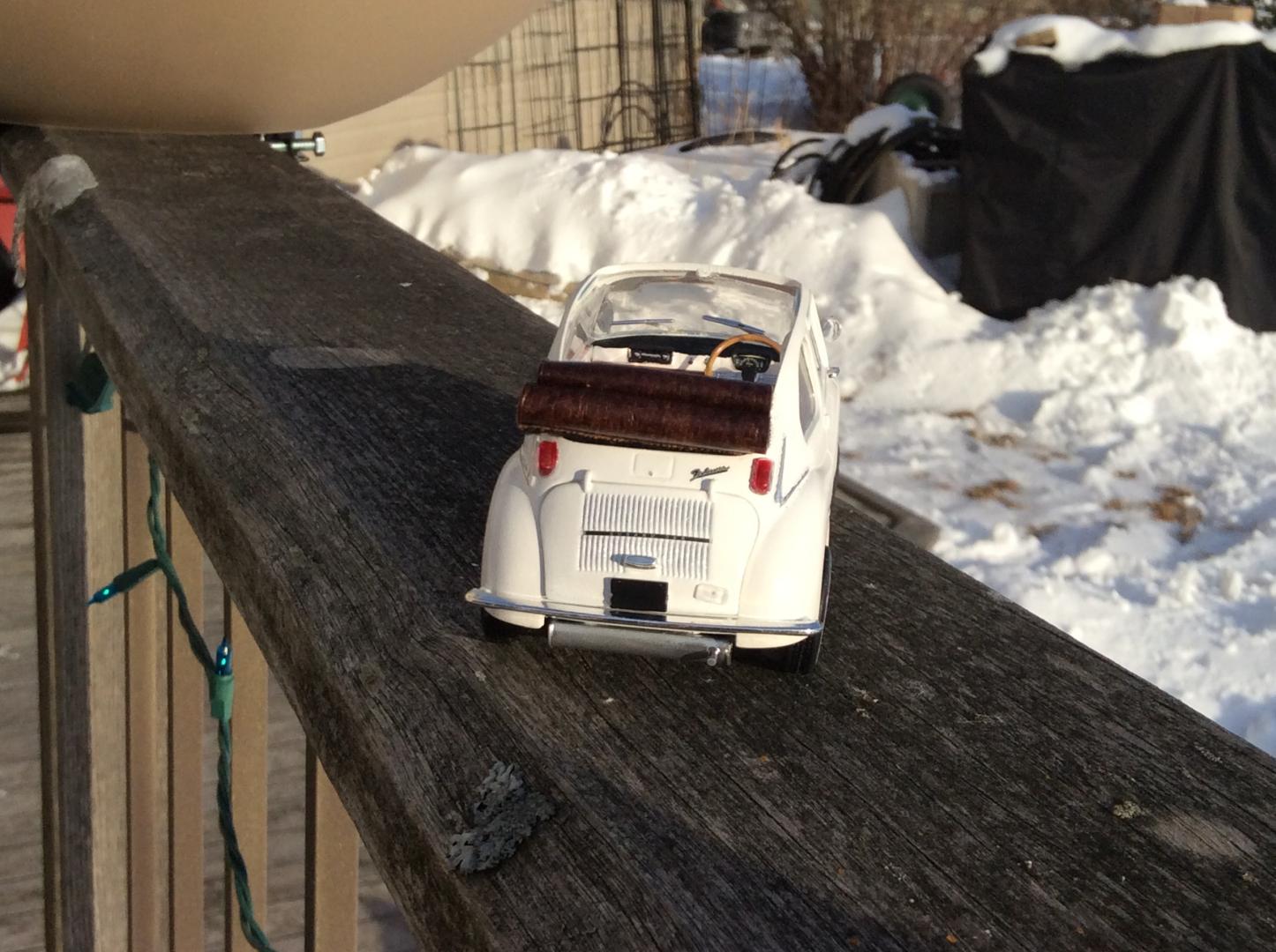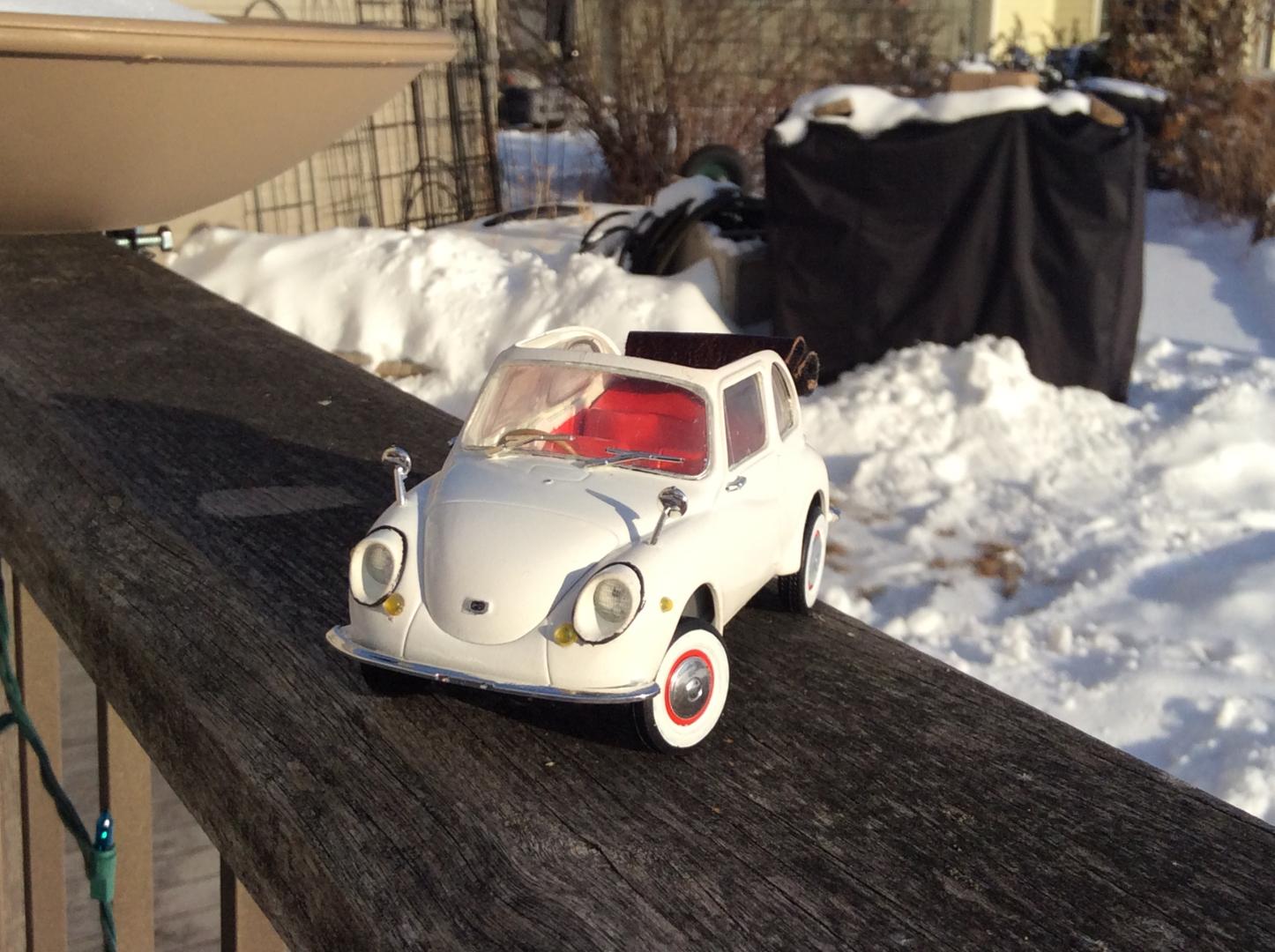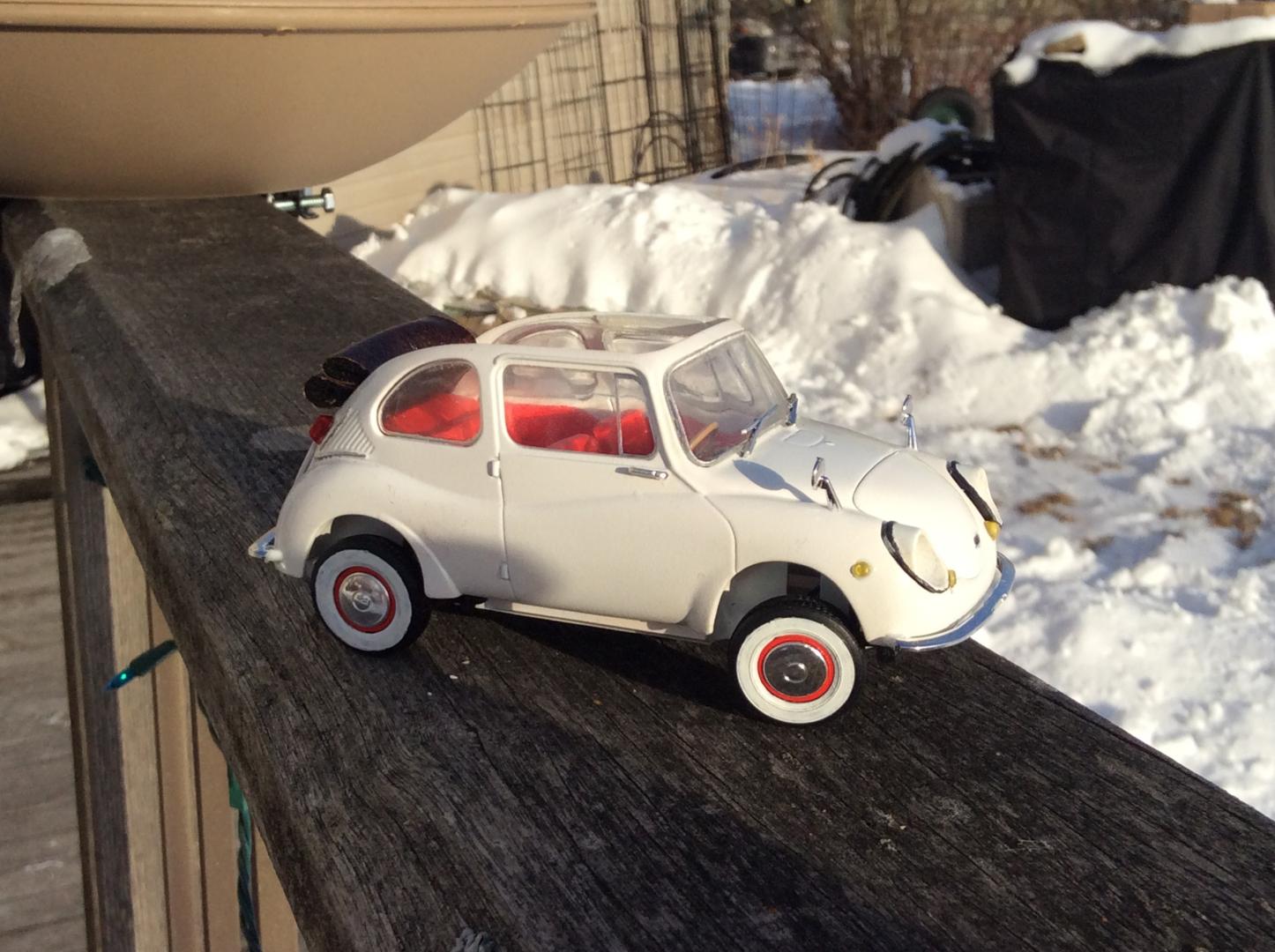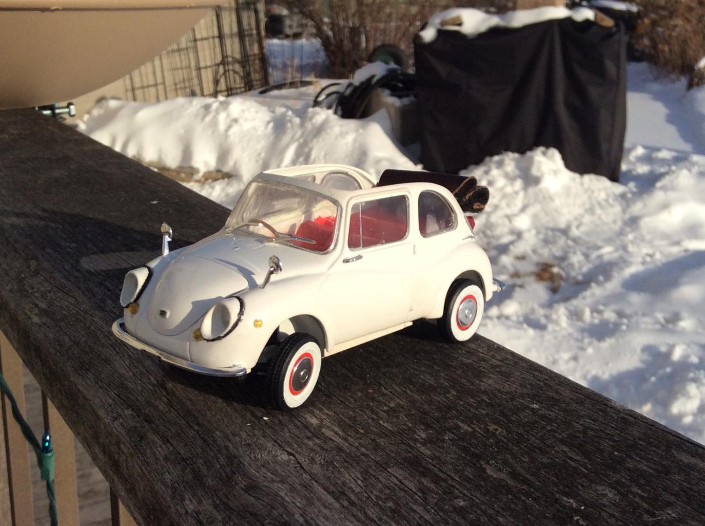 Just finished this little Subaru. It's the Hasegawa '68 360 kit. I've always loved the 360 but I love the 360 Cabriolet more. A lot less common than the normal 360 hardtop. The model is painted with Testors colors. I didn't like the kit's whitewall decals so I painted them on. The model is stock accept for the roof. I cut up some leather to replicate the folded rollback convertible roof to let some sun in!