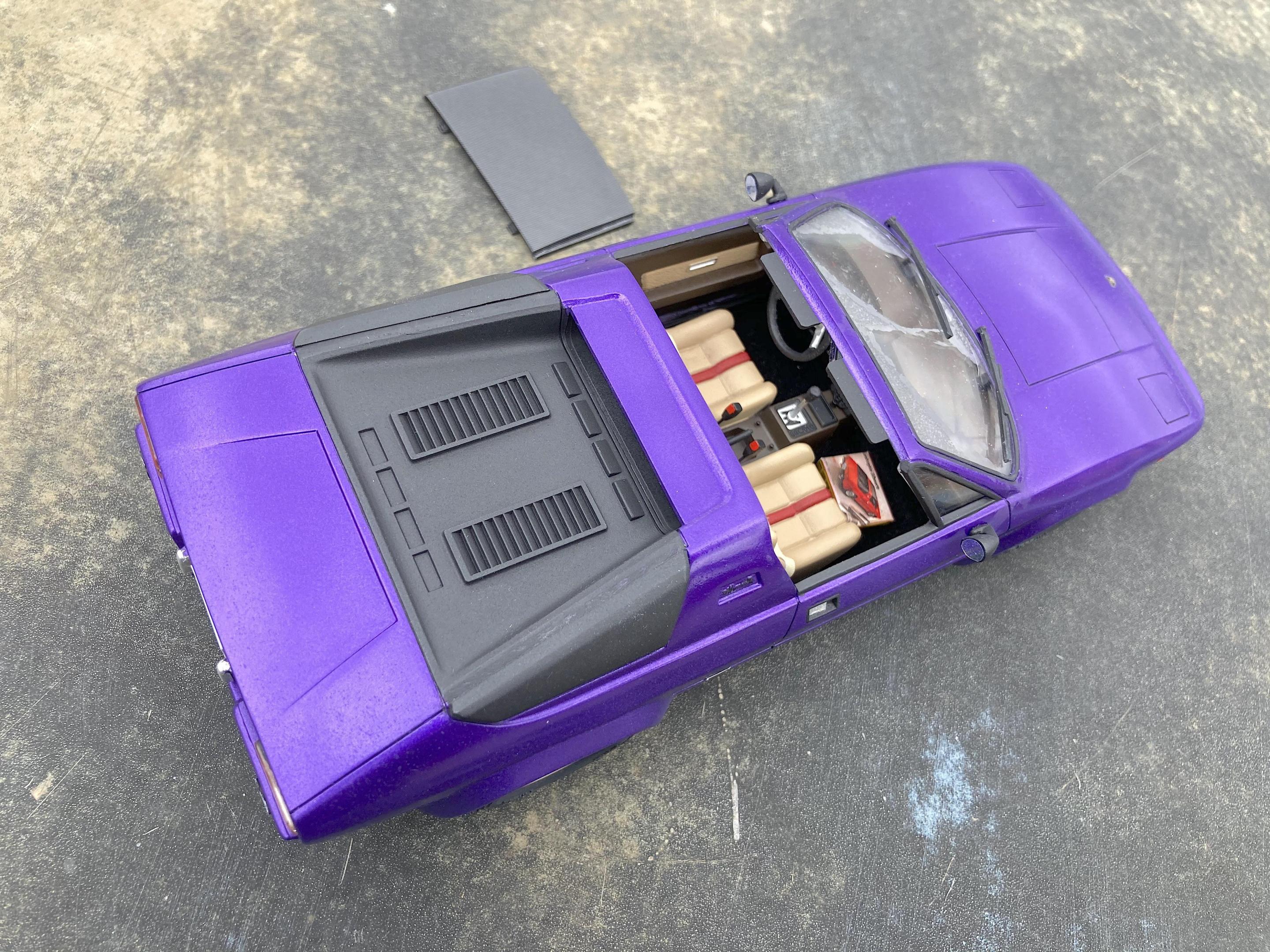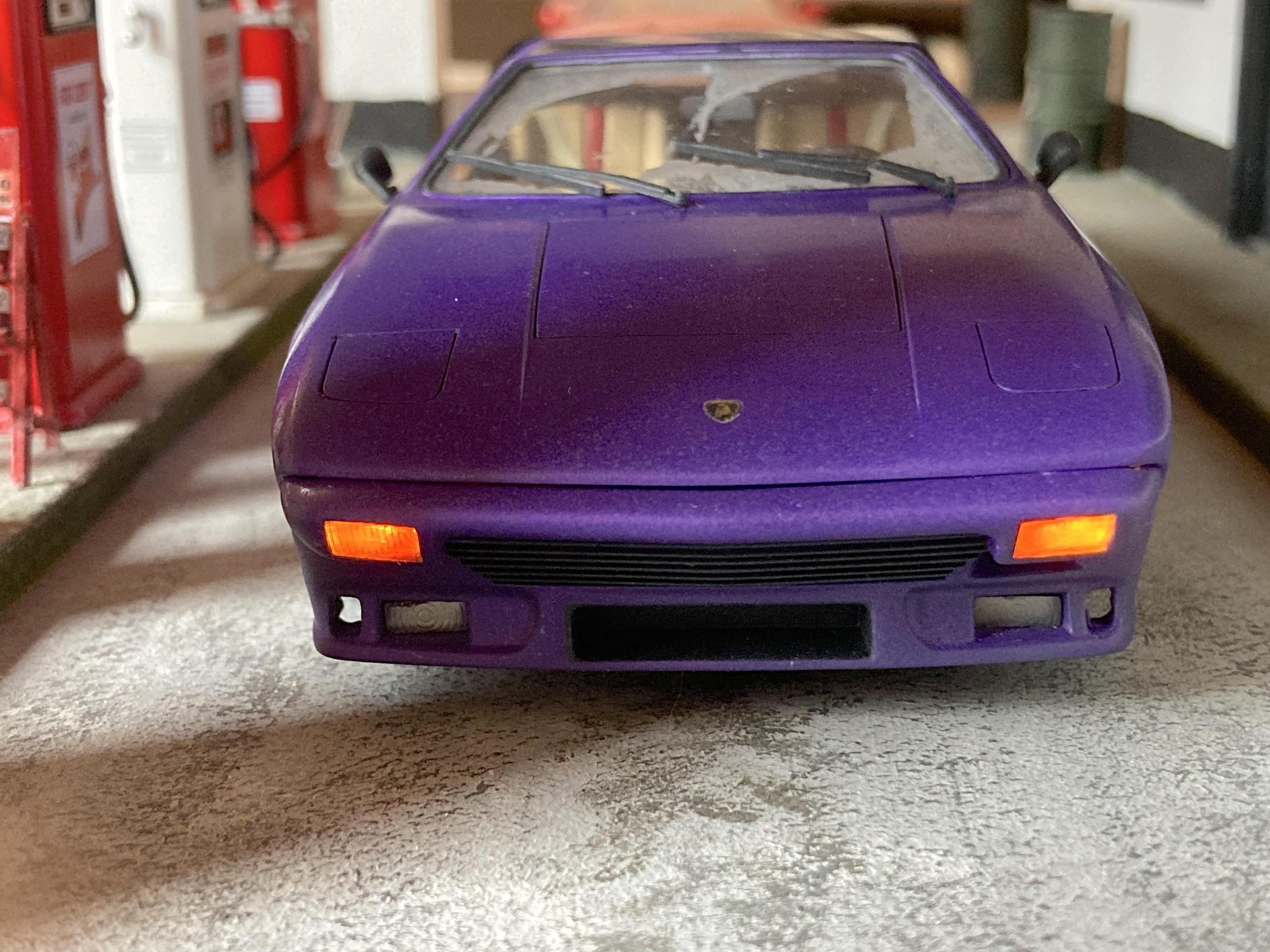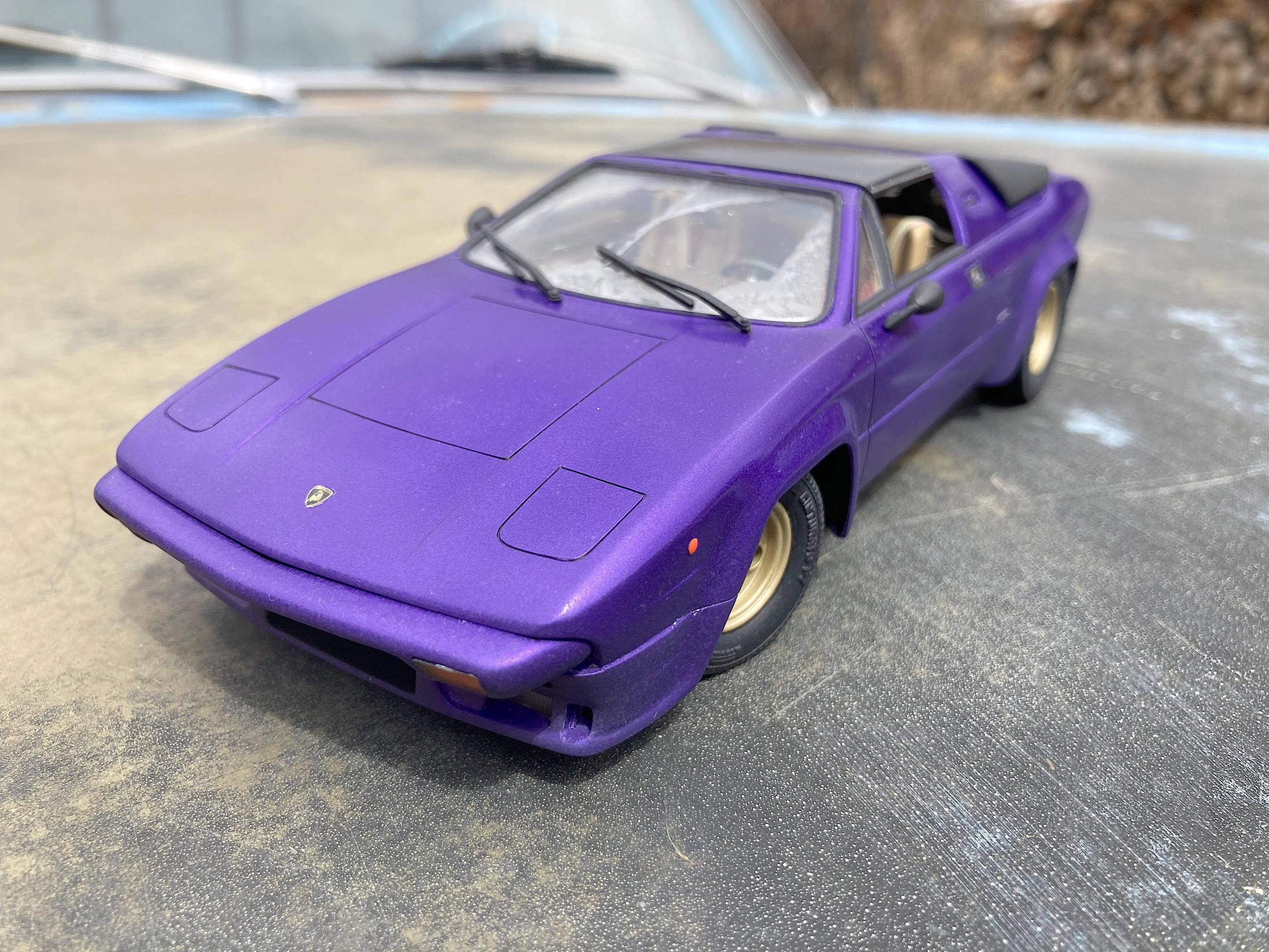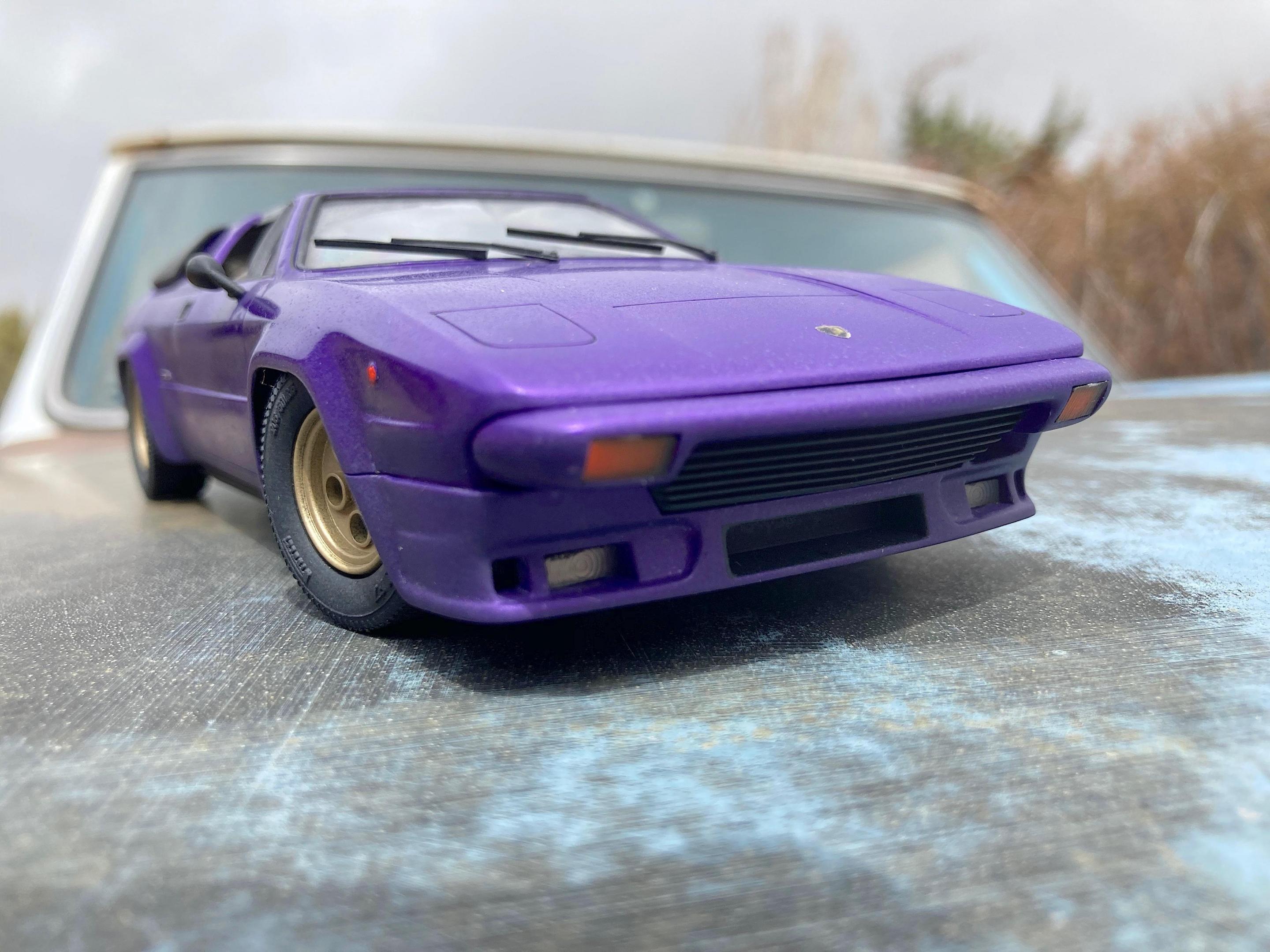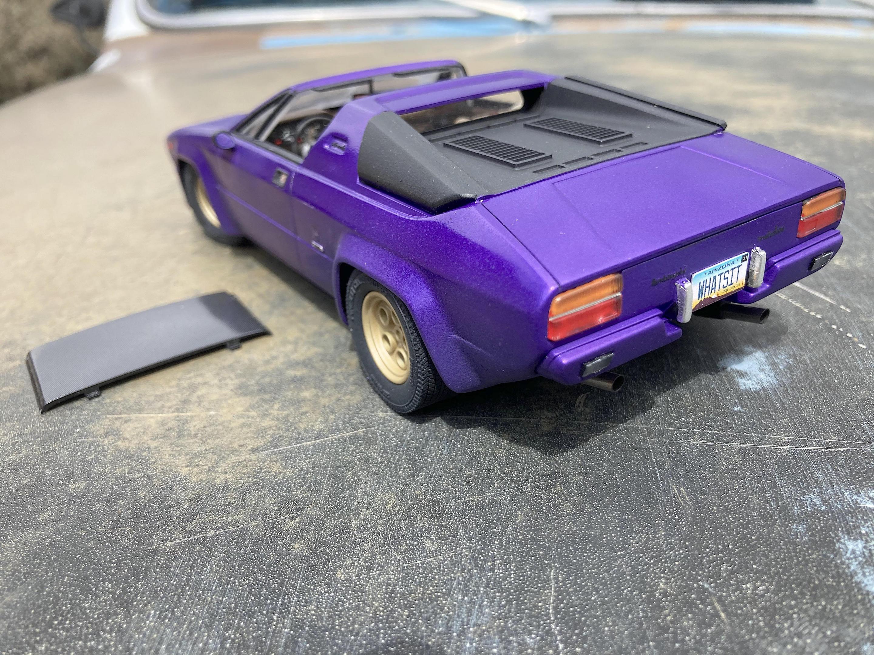 Calling this done. How does the line in Christine go, "You can't polish a ?"? Gunze - Sangyo motorized era. The real car, this one is the prototype. Beginning of the side light mandate, before battering ram bumpers were required. It sort of bombed, but just because of rarity, they are desirable. The kit doesn't do it justice. This is just before the Countach stole the show. Popular color was refrigerator white, bumpers were black. ? The right box was trashed, that is what was sacrificed, but was able to create a scale box from the remains. The red plastic bled through Tamiya putty, was concerned about bleed through. WIP: Testors (Gunze Sangyo) Lamborghini Spelling Bee Special (Silhouette) for the horror show. ? Don't look too close. Getting that Huracan color down right killed me. Cloudy lighting helped hide the defects. ? I figured it's easy enough to make a Carbon-Fiber replacement roof panel. Major (to me) correction was the front leading flare was moved back. The "phone dial" wheel holes have been drilled larger, but still the tires are totally wrong; Tamiya titanium gold. The G-S kit has the metal battery terminals, but not a motor; I fabricated single AA battery terminals to run the front turn signal lights. It's subpar for me, weathered like it was driven in the rain. Used the '68 Chevy hood for the studio. This is using the CA Pit Stop diorama It would be the background for a future Countach, Muria, etc. ?