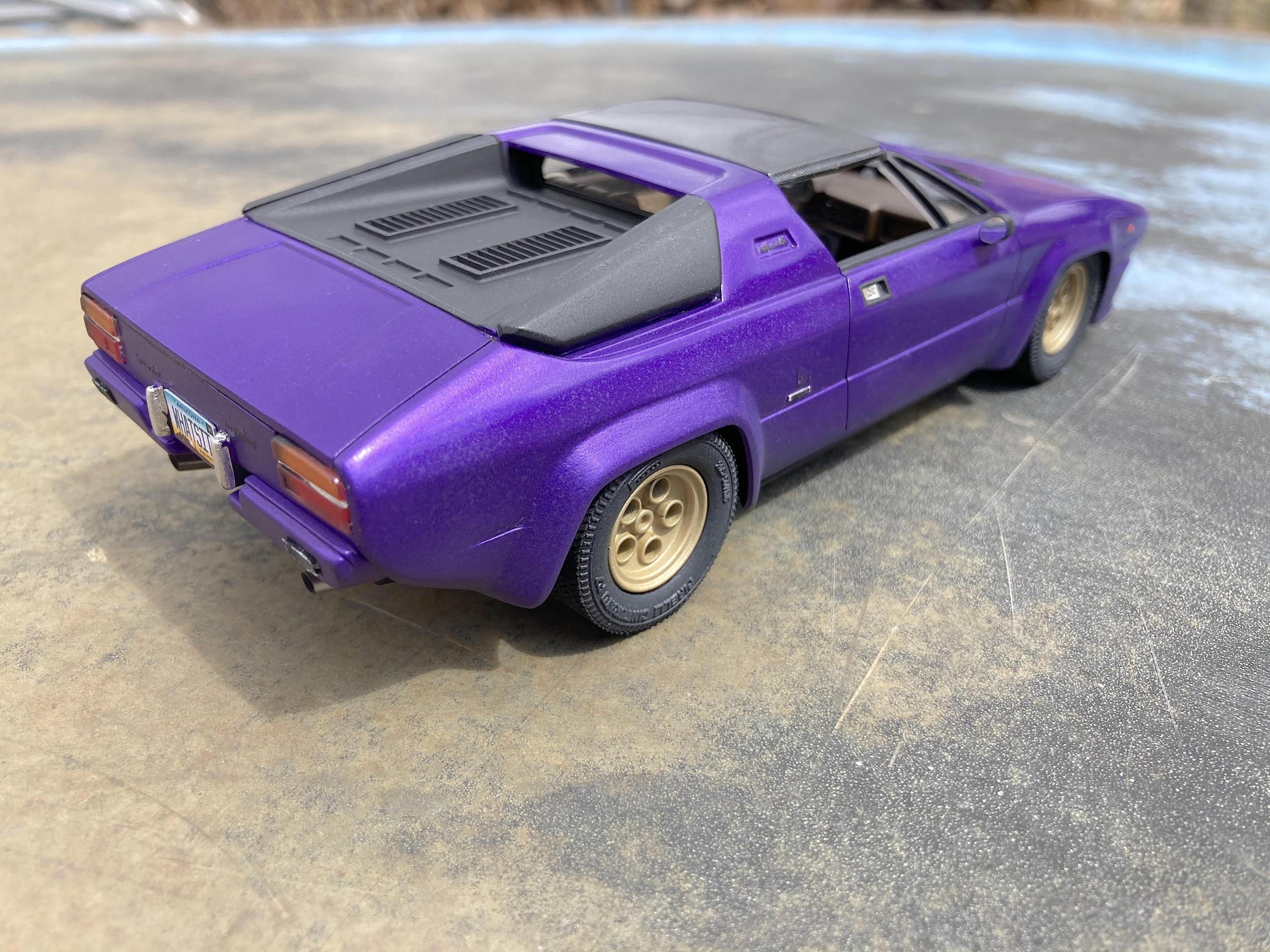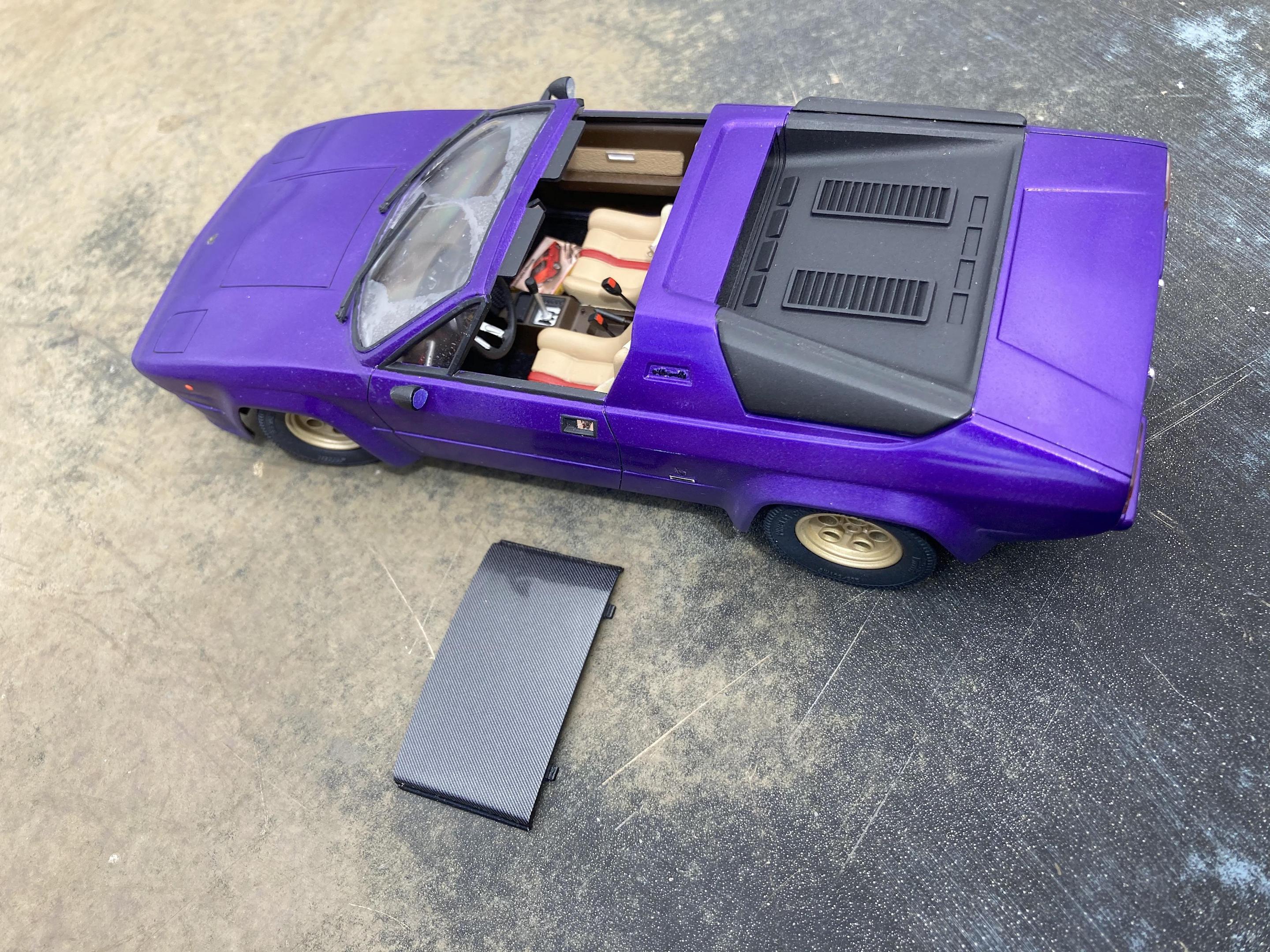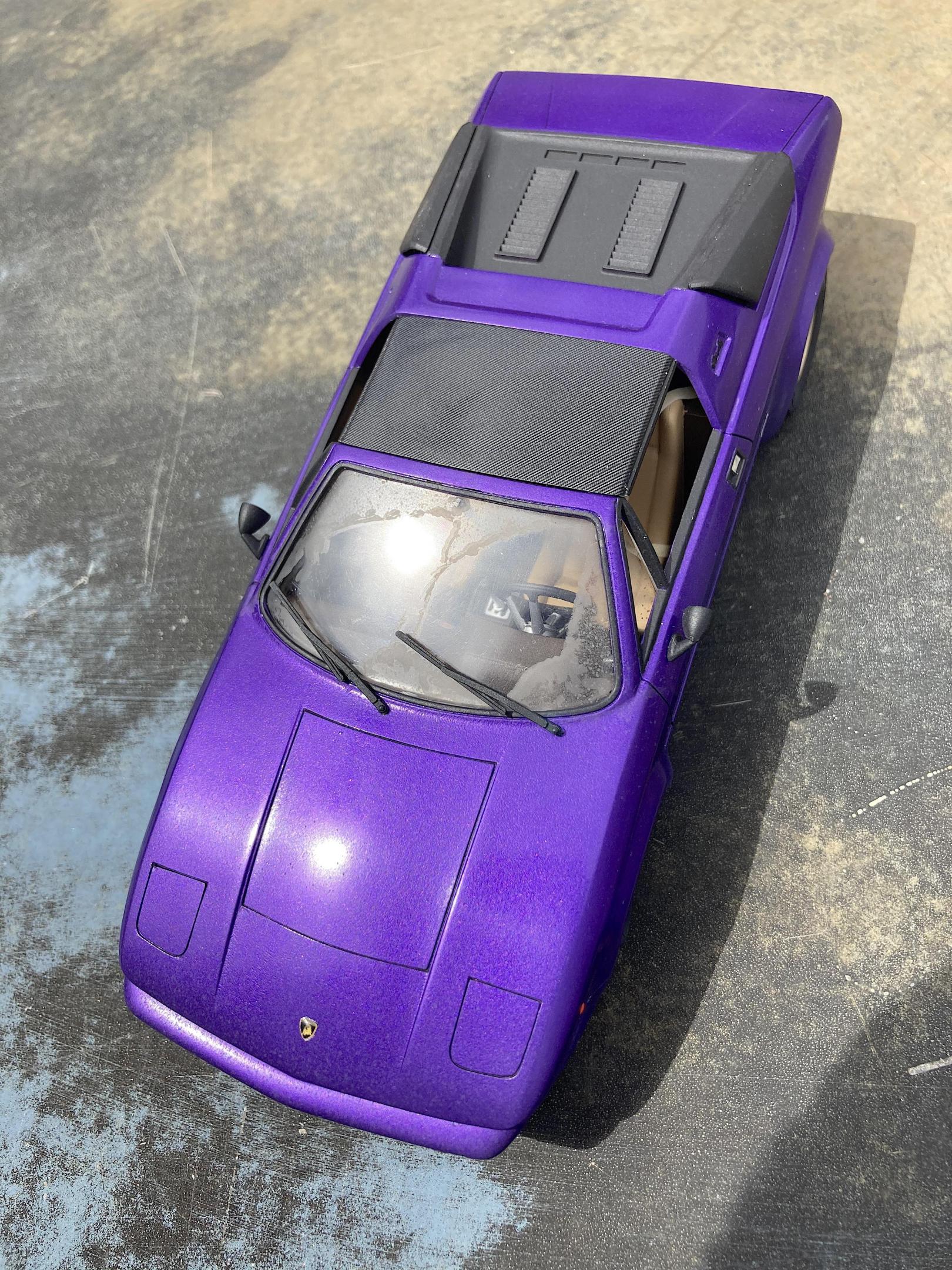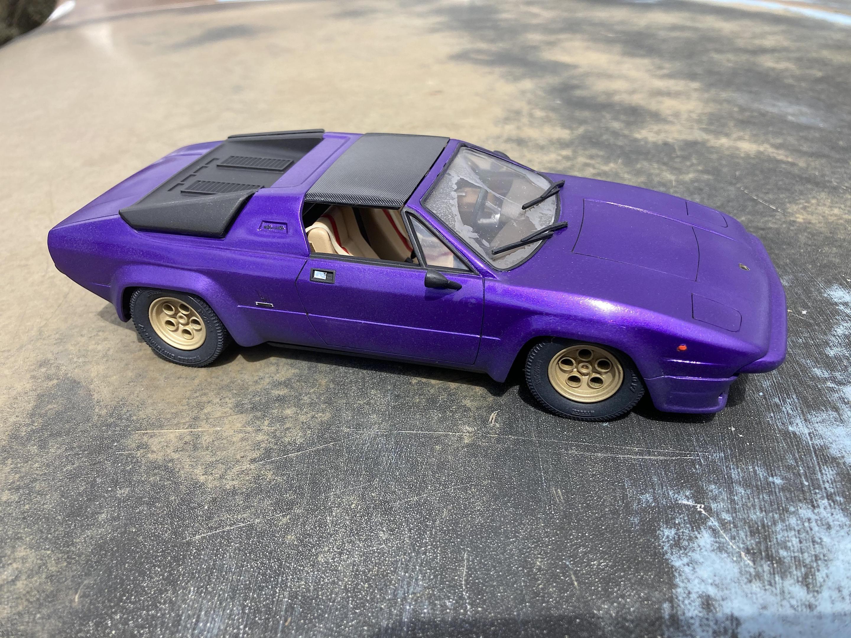 Calling this done. How does the line in Christine go, "You can't polish a ?"? Gunze - Sangyo motorized era. The real car, this one is the prototype. Beginning of the side light mandate, before battering ram bumpers were required. It sort of bombed, but just because of rarity, they are desirable. The kit doesn't do it justice. This is just before the Countach stole the show. Popular color was refrigerator white, bumpers were black. ? The right box was trashed, that is what was sacrificed, but was able to create a scale box from the remains. The red plastic bled through Tamiya putty, was concerned about bleed through. WIP: Testors (Gunze Sangyo) Lamborghini Spelling Bee Special (Silhouette) for the horror show. ? Don't look too close. Getting that Huracan color down right killed me. Cloudy lighting helped hide the defects. ? I figured it's easy enough to make a Carbon-Fiber replacement roof panel. Major (to me) correction was the front leading flare was moved back. The "phone dial" wheel holes have been drilled larger, but still the tires are totally wrong; Tamiya titanium gold. The G-S kit has the metal battery terminals, but not a motor; I fabricated single AA battery terminals to run the front turn signal lights. It's subpar for me, weathered like it was driven in the rain. Used the '68 Chevy hood for the studio. This is using the CA Pit Stop diorama It would be the background for a future Countach, Muria, etc. ?