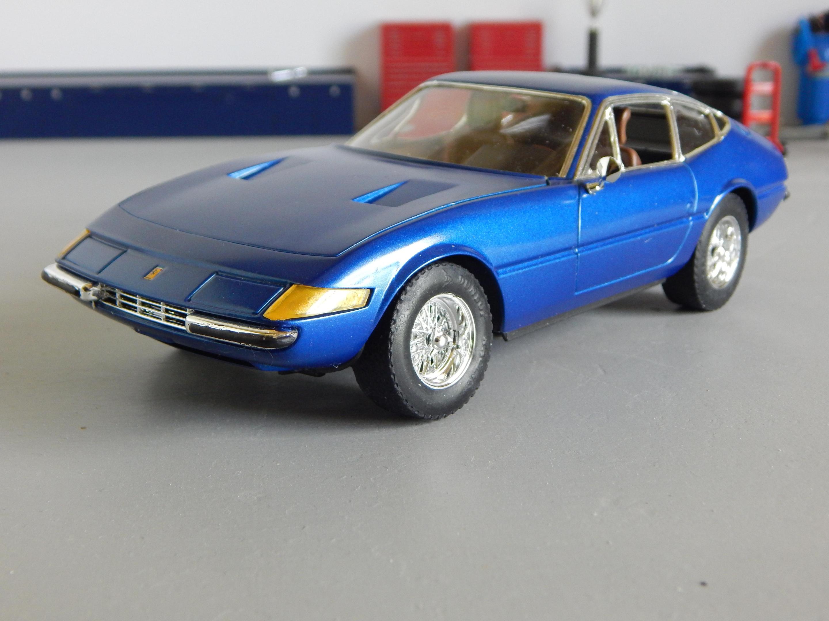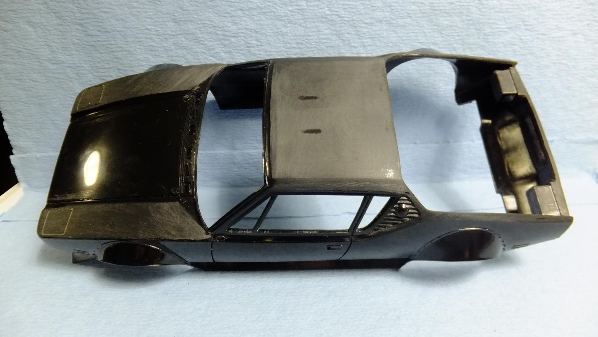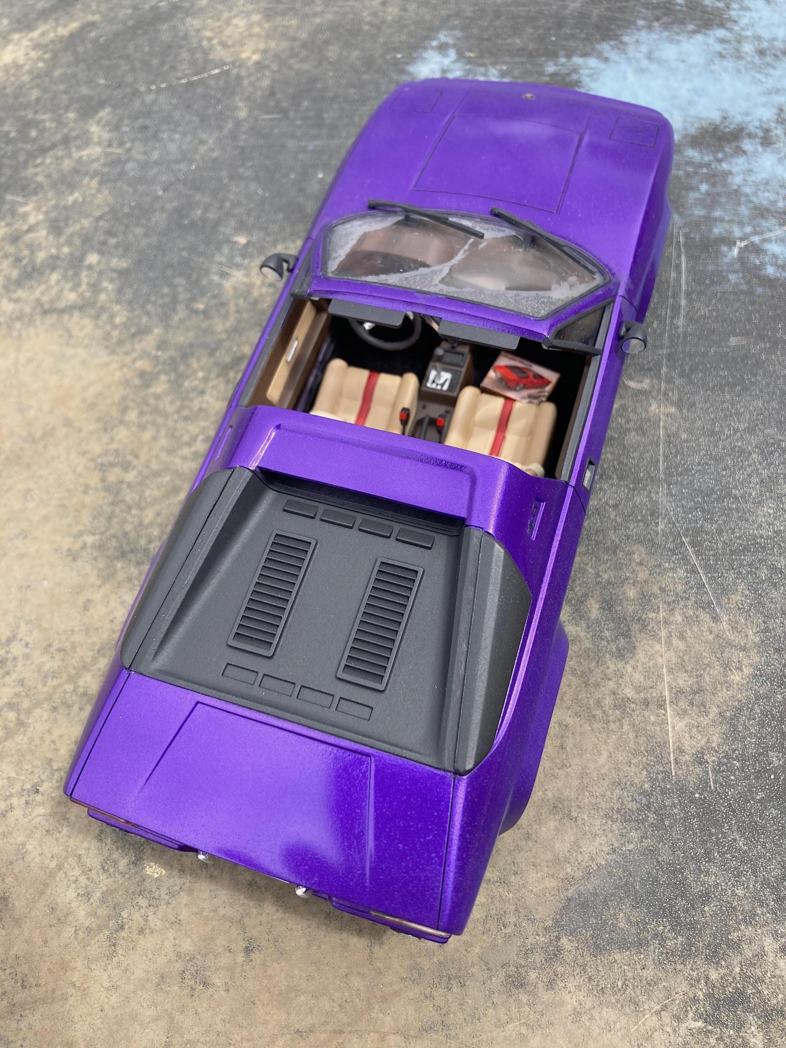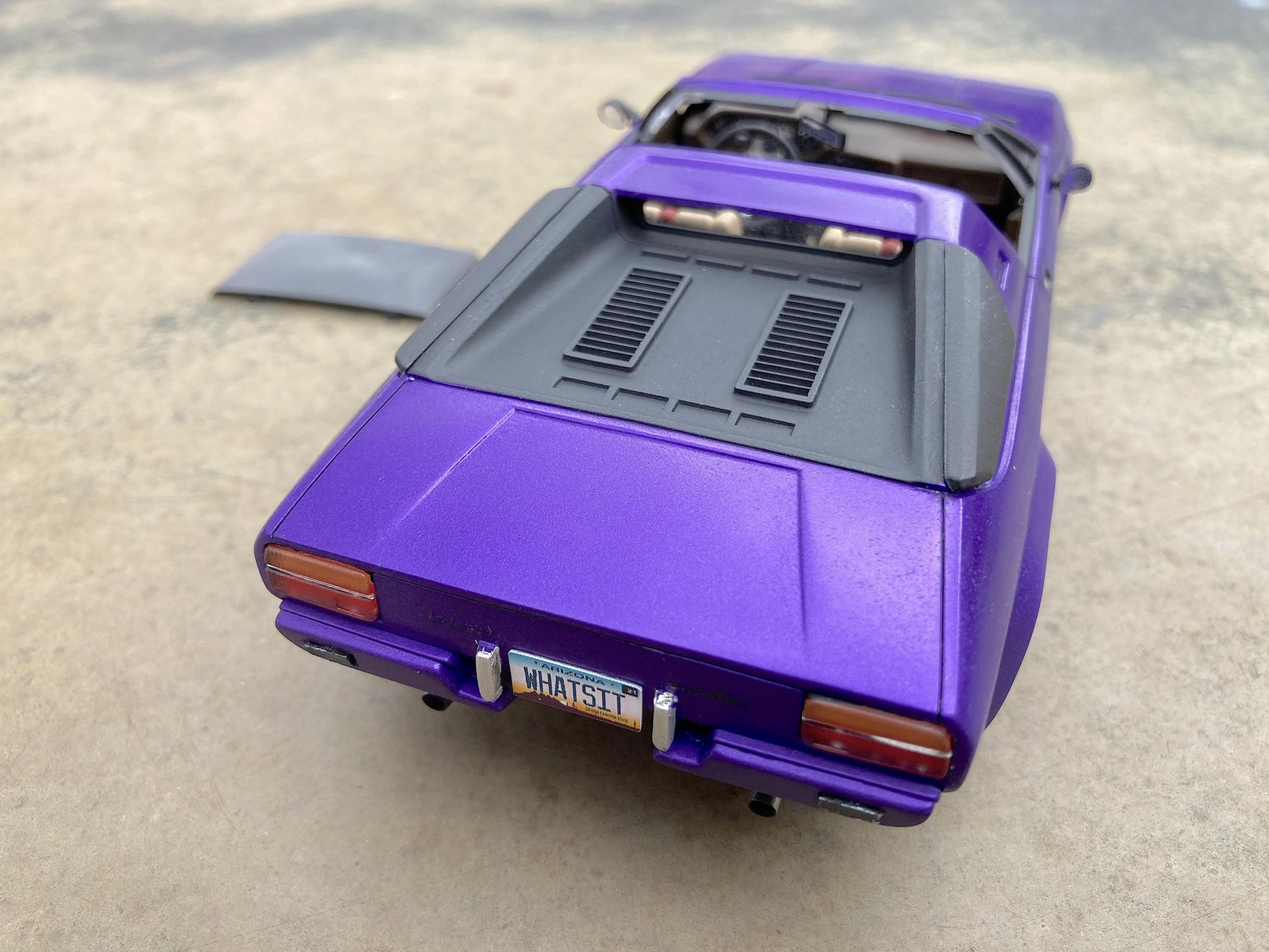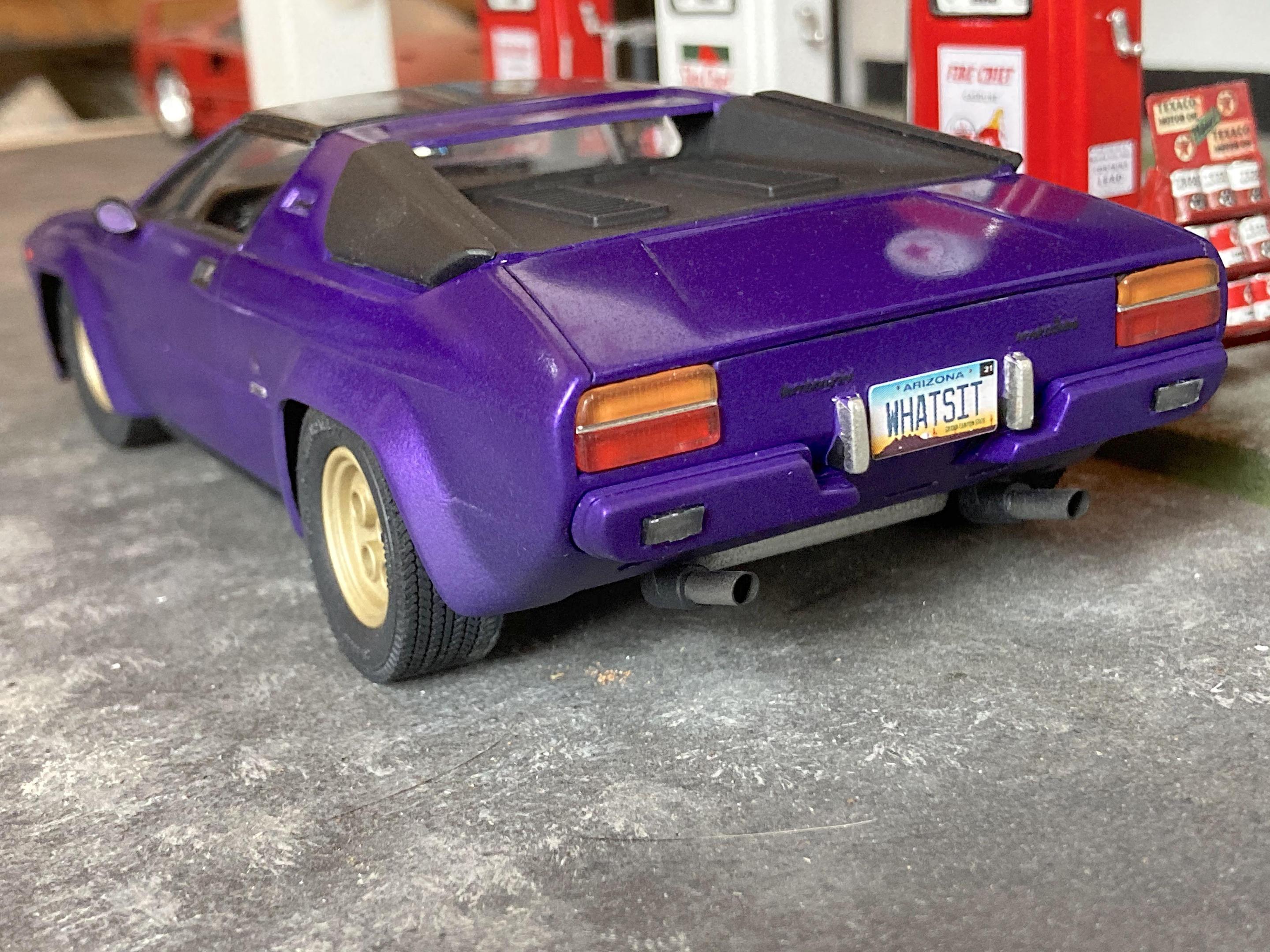 Calling this done. How does the line in Christine go, "You can't polish a ?"? Gunze - Sangyo motorized era. The real car, this one is the prototype. Beginning of the side light mandate, before battering ram bumpers were required. It sort of bombed, but just because of rarity, they are desirable. The kit doesn't do it justice. This is just before the Countach stole the show. Popular color was refrigerator white, bumpers were black. ? The right box was trashed, that is what was sacrificed, but was able to create a scale box from the remains. The red plastic bled through Tamiya putty, was concerned about bleed through. WIP: Testors (Gunze Sangyo) Lamborghini Spelling Bee Special (Silhouette) for the horror show. ? Don't look too close. Getting that Huracan color down right killed me. Cloudy lighting helped hide the defects. ? I figured it's easy enough to make a Carbon-Fiber replacement roof panel. Major (to me) correction was the front leading flare was moved back. The "phone dial" wheel holes have been drilled larger, but still the tires are totally wrong; Tamiya titanium gold. The G-S kit has the metal battery terminals, but not a motor; I fabricated single AA battery terminals to run the front turn signal lights. It's subpar for me, weathered like it was driven in the rain. Used the '68 Chevy hood for the studio. This is using the CA Pit Stop diorama It would be the background for a future Countach, Muria, etc. ?