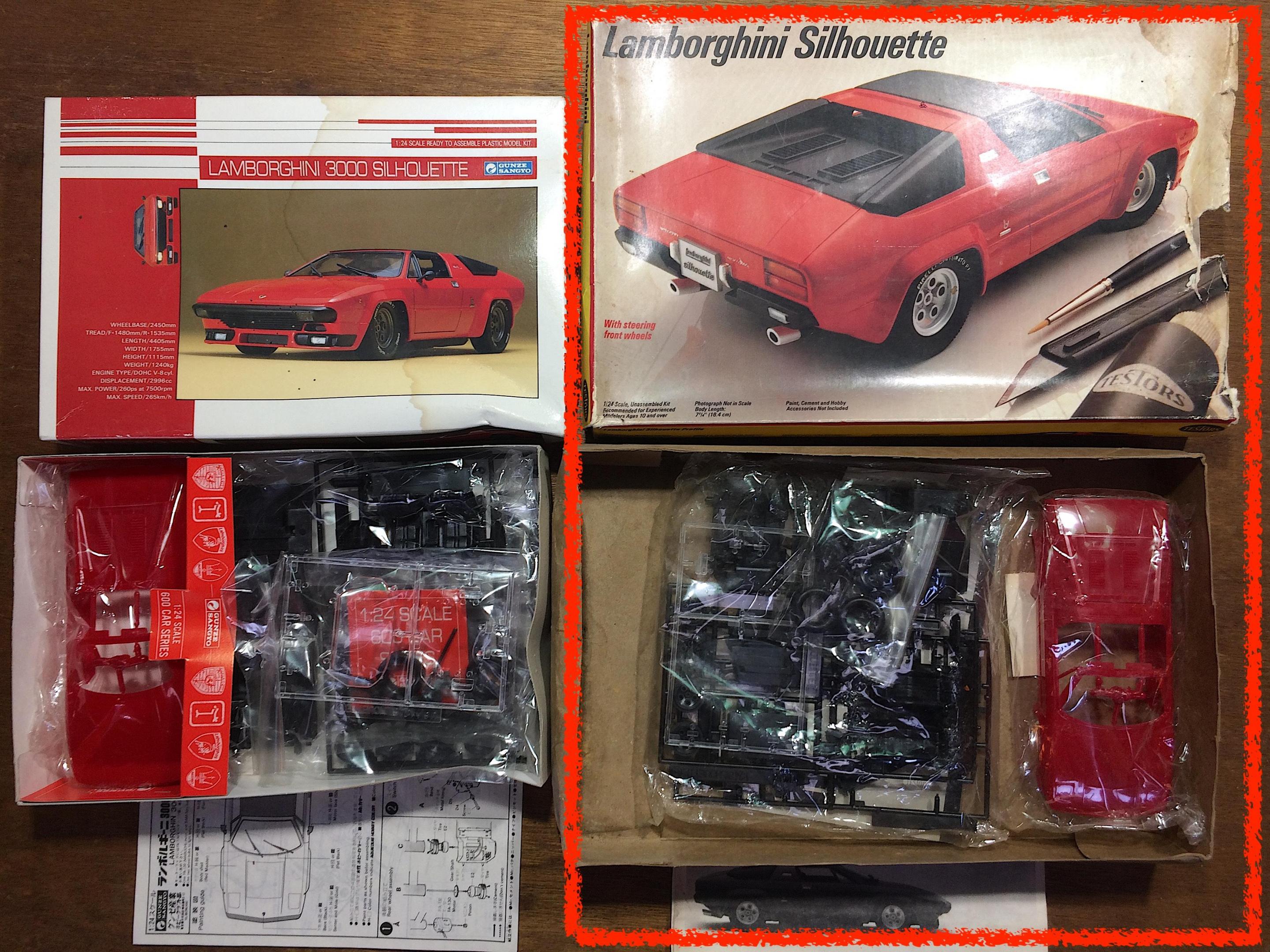 Since I'm burned out on three hero WIP, wanted to knock a Box Stock out before year's end. Had the chance to get these two kits, boxes are not in good shape, the Testors was terrible to begin with so it will not be saved. Same mold, the Gunze has the battery terminals but no motor (have a few laying around if I wanted), instructions show light bulbs for the front lights but no bulbs, the Cheetah kit had some so I will snag those. I find it amusing how the Testors model is poorly built, missing mirrors, top not set in enough, light lenses askew. I will paint a different color, think it will compliment the car, and it won't be Testors paint. I'm going to paint the safety bumpers the same color, it was common at the time with other cars. I love this interior. Read about the body needing work here: Lamborghini Silhouette 1978?. Was inspired here: Lamborghini Silhouette, Gunze-Sangyo, 1/24. Yep, the sink marks are severe on the doors! The panel lines need some sanding, and some minor mold seams to clean up. The wheels are the worst part of the kit. I'm going to drill out the holes a little. One wheel has bad sink marks, so this will be fun to fix! Tempting to use Fujimi P7 tires, wider for the rear should be done, but that would disqualify for Box Stock, and that would lead to installing and engine, and then another hero project......
