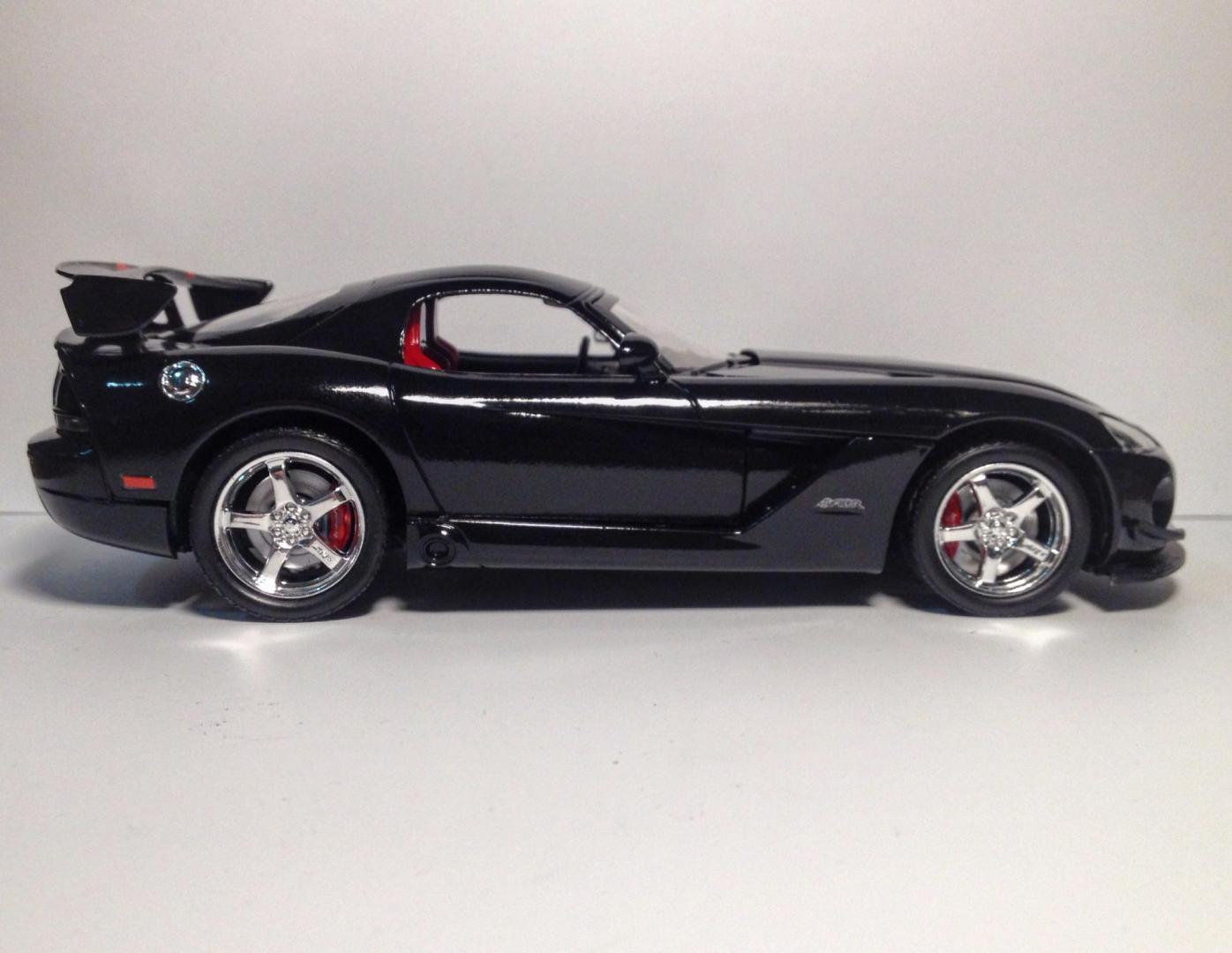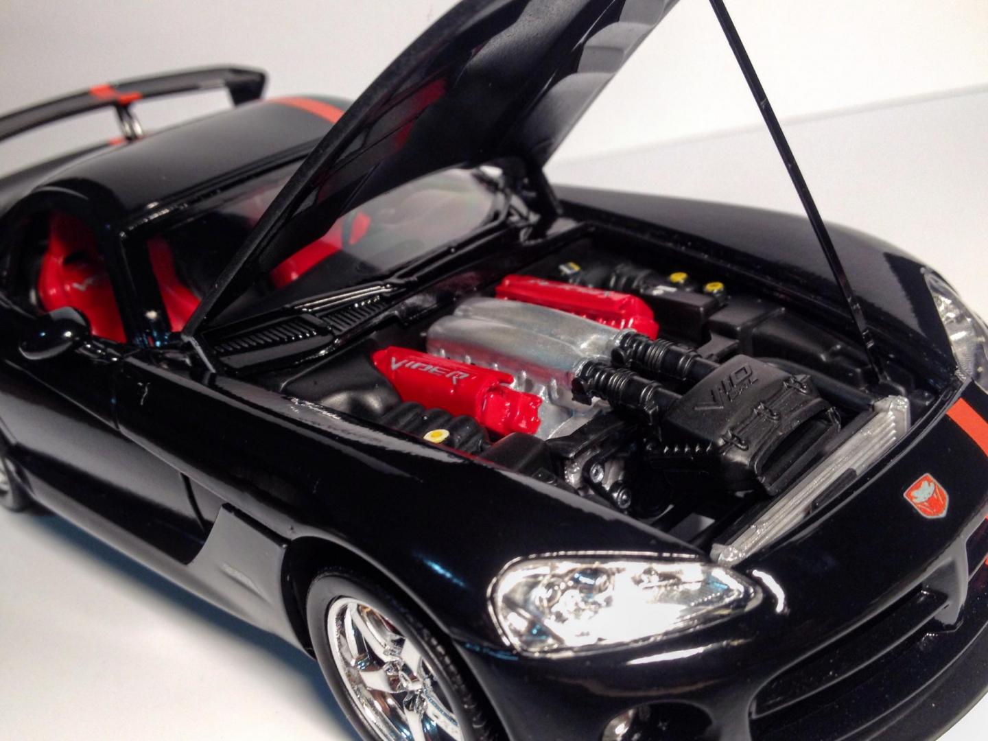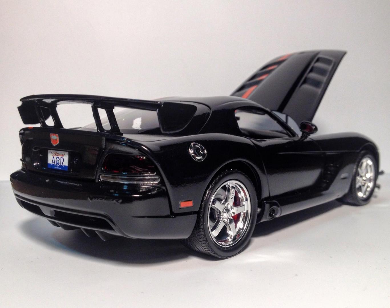 First one done for this year. This went a little better then the Cuda even if i made many mistakes and arent too happy about it. What is done is i bashed a AMT Viper coupe for suspension,engine,transmission,brake booster and engine managment. The rear back up lights was made out of clear parts three,inspired by two other builders on this forum. The plenum and intake is from Revell (Thank you evilbay lol). The steelies are from a member on here,dont remember hes name but has ebay store. The dog dish are from Missing Link and are great. Paint is tamiya,dip stick is home made,alternator wire is just wire lol. Heater hoses are wire isolation,radiator hose is scale production,the hose clamps are Top Studio. Exhaust is modified Cuda AAR. I regret having some blackwash on the engine,because now it looks dirty. Also the rear window is a joke. Anyway,thanks all for the tip and suggestions in the WIP. Here are some pics. Thanks for watching,and if you like it or hate it,let me know.