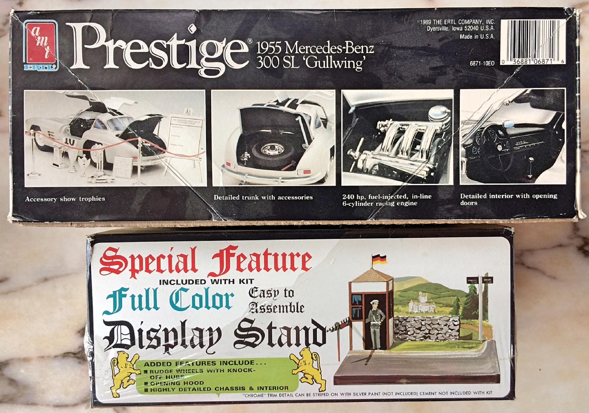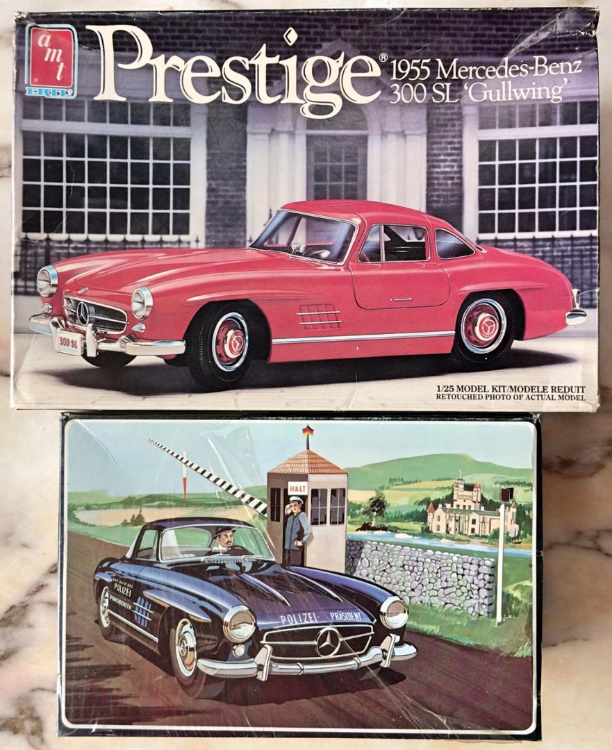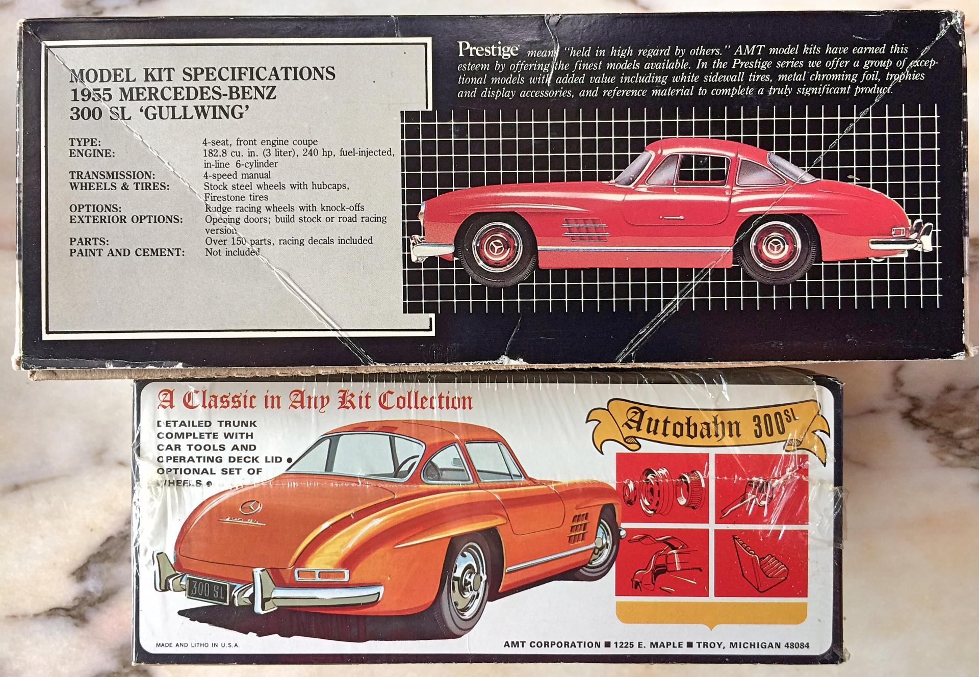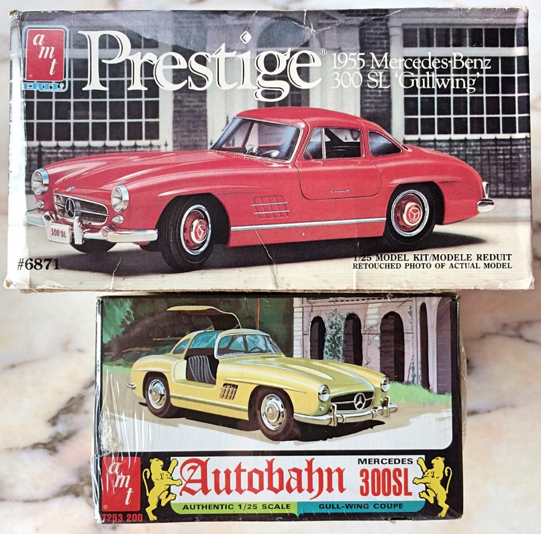 Got the blue/orange/yellow Gullwing kit from an estate. I've had the later release for some time, so know it's the typical AMT quality that pales when compared to the Tamiya kit. But I *had to* get this early version because it's just too cool! Comes with a cardboard diorama display, don't think there is a driver figure. The bigger box version has a chrome tree of trophies. I don't see any on eBay, so have to ask, is this a rare kit? Too bad some of the plastic wrap is ripped off.