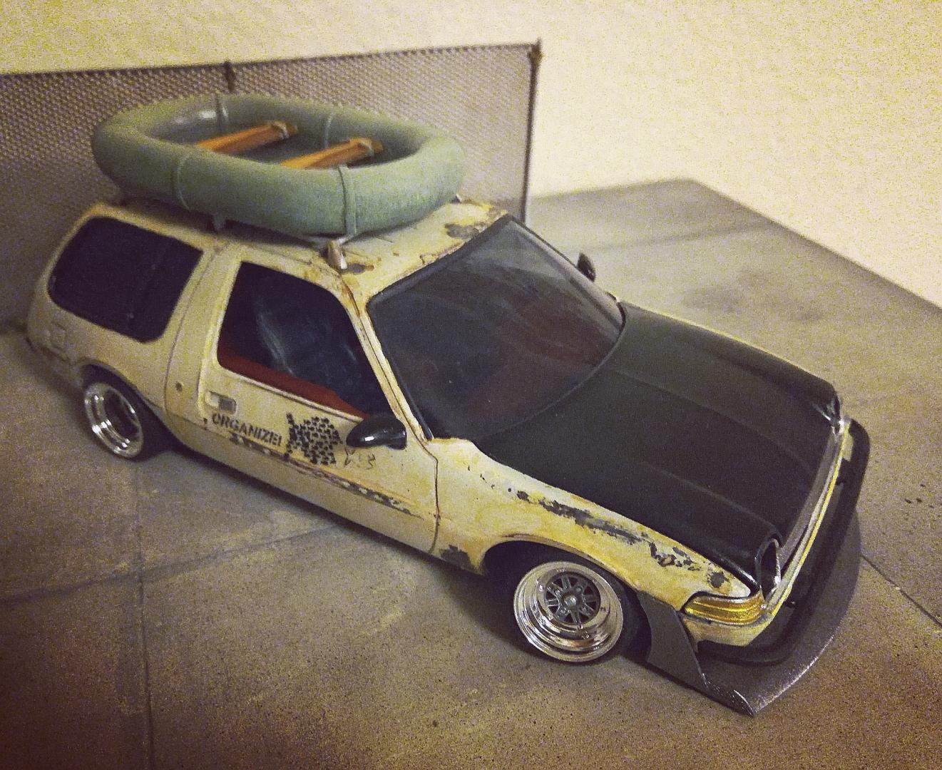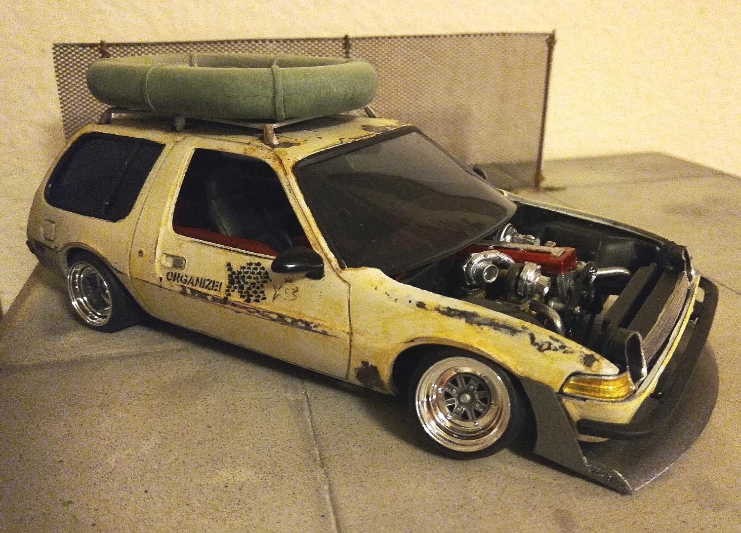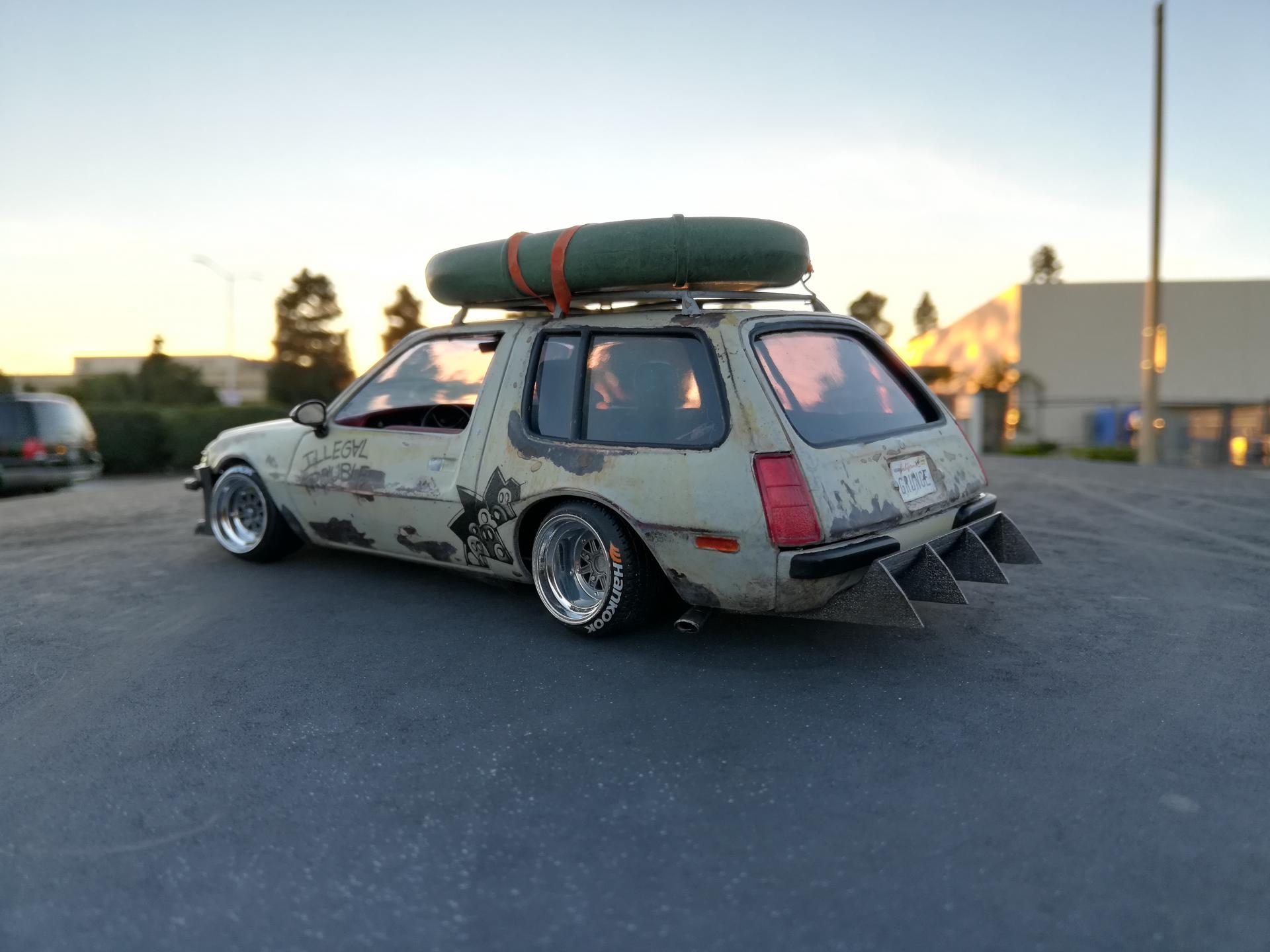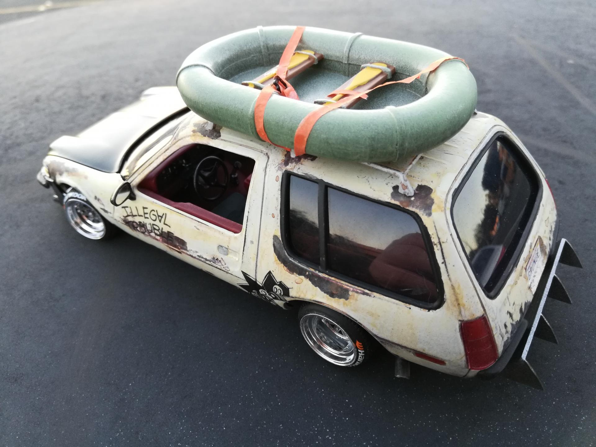 The MPC Pacer Wagon, with Vette rear suspension, a Toyota 2JZ-GTE engine with a front mount intercooler, seasoned with a dash of rust and topped with an inflatable raft.