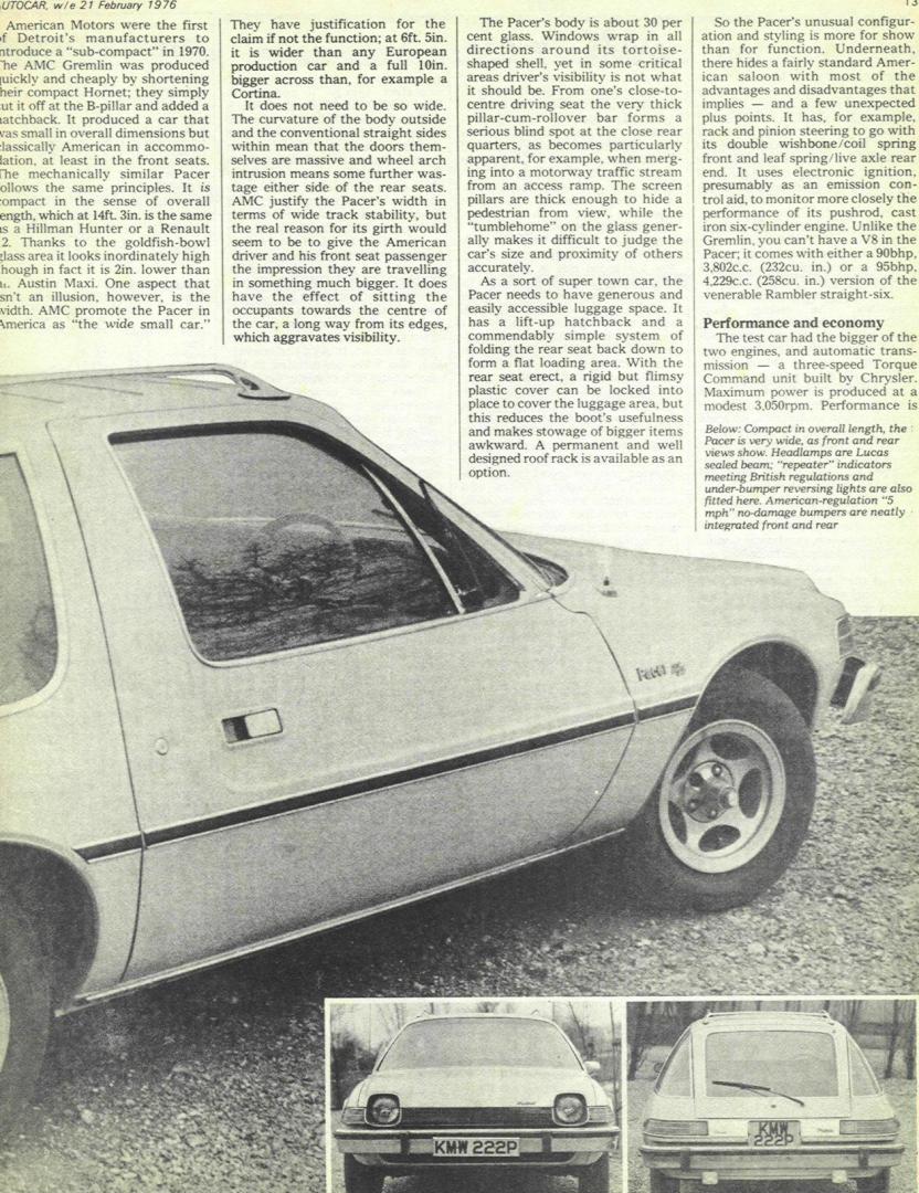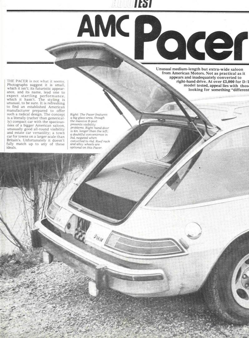 Note the RHD conversion was performed by the importer, and so explains the less-than-inspiring dash design. Other aspects of the conversion left the reviewers less than impressed, such as the windshield wiper pattern is unchanged and original left-hand mirror remains adjustable, while its mate on the RHD driver's side is not. It's fun to get the British take on the rather peculiar (and yet still typically American) Pacer. Here's what they had to say regarding the issue of the Pacer's doors : "More fundamental is the Pacer's major gimmick--its unequal size doors--is negated by the change [to RHD]. The doors are massive (so heavy in fact they can be an effort to open) and that on the right hand side is 4in longer behind the window than its opposite partner. The intention is to allow easier access for the rear seat passengers from the (right hand) kerb side. In practice, unless the front occupant is at the most forward point of seat travel it is not possible to get into the back without tipping the front seat. As a driver's door, however, it can present considerable difficulties of exit in a confined space. The door's width, plus the long trailing edge mean that it is not possible to get out with the door opened, say, a foot clear of the body--potential owners with narrow garages beware!"