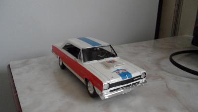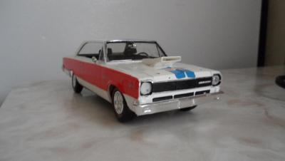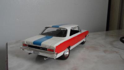 Had to do a lot of work on this one. Got a really crappy Rambler pro-street model and then had to buy the decals separately. The fit was horrible and I had to trim a lot of the pieces to make them fit. However the rods for the wheels were of plastic and could not be trimmed, so I just glued the wheels straight onto the model. The decals were a tad larger than the car, so I had to trim them. They were also on giant sheet, so I had to trim all of them out separately too. It was a pain, but it looks good.