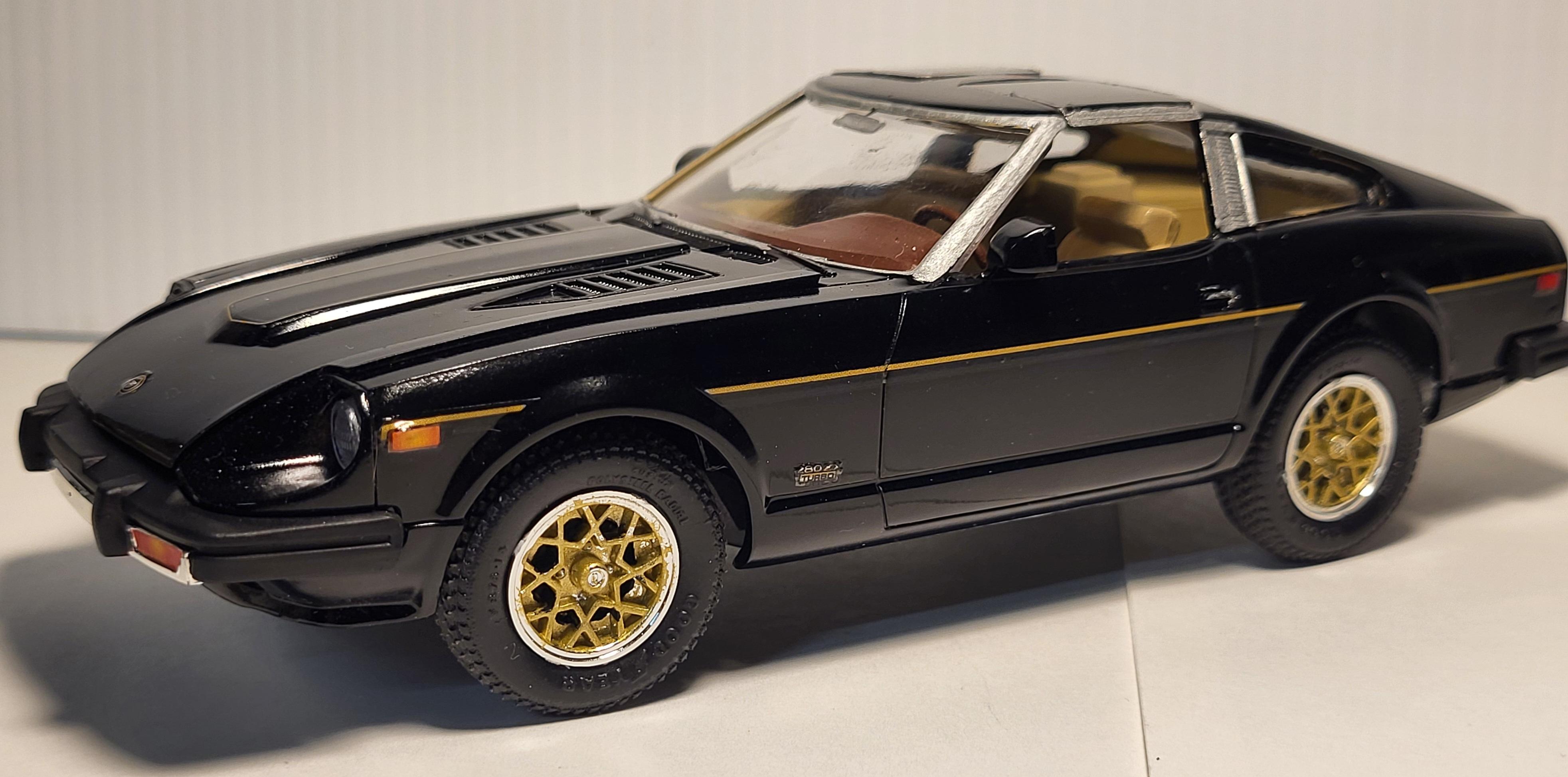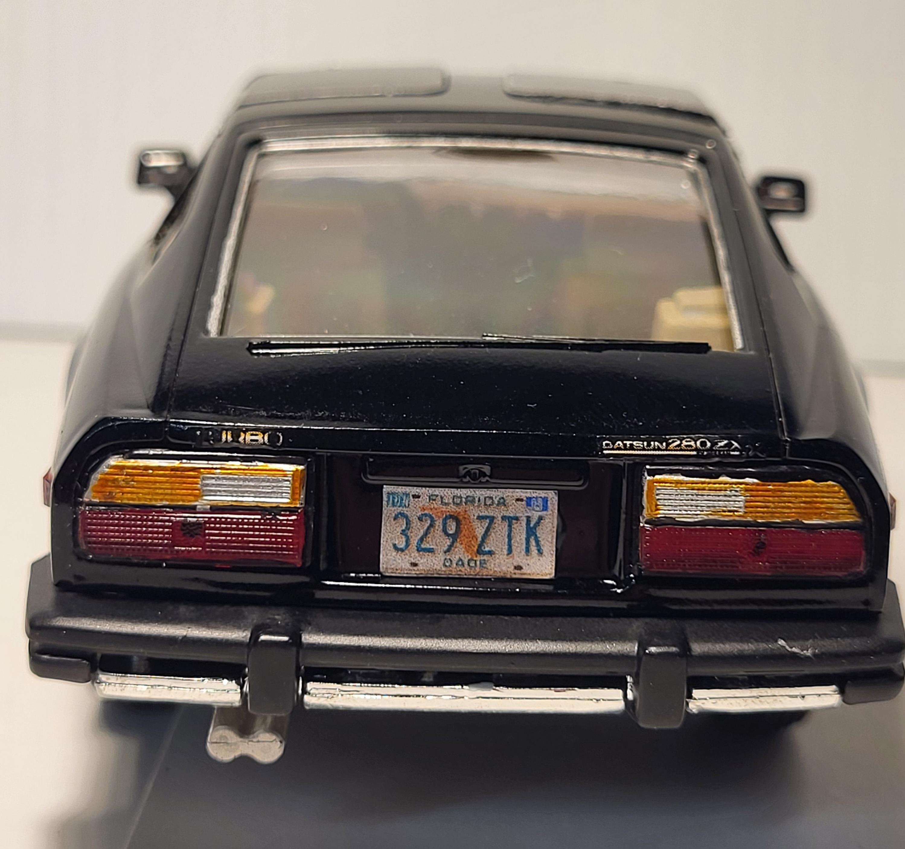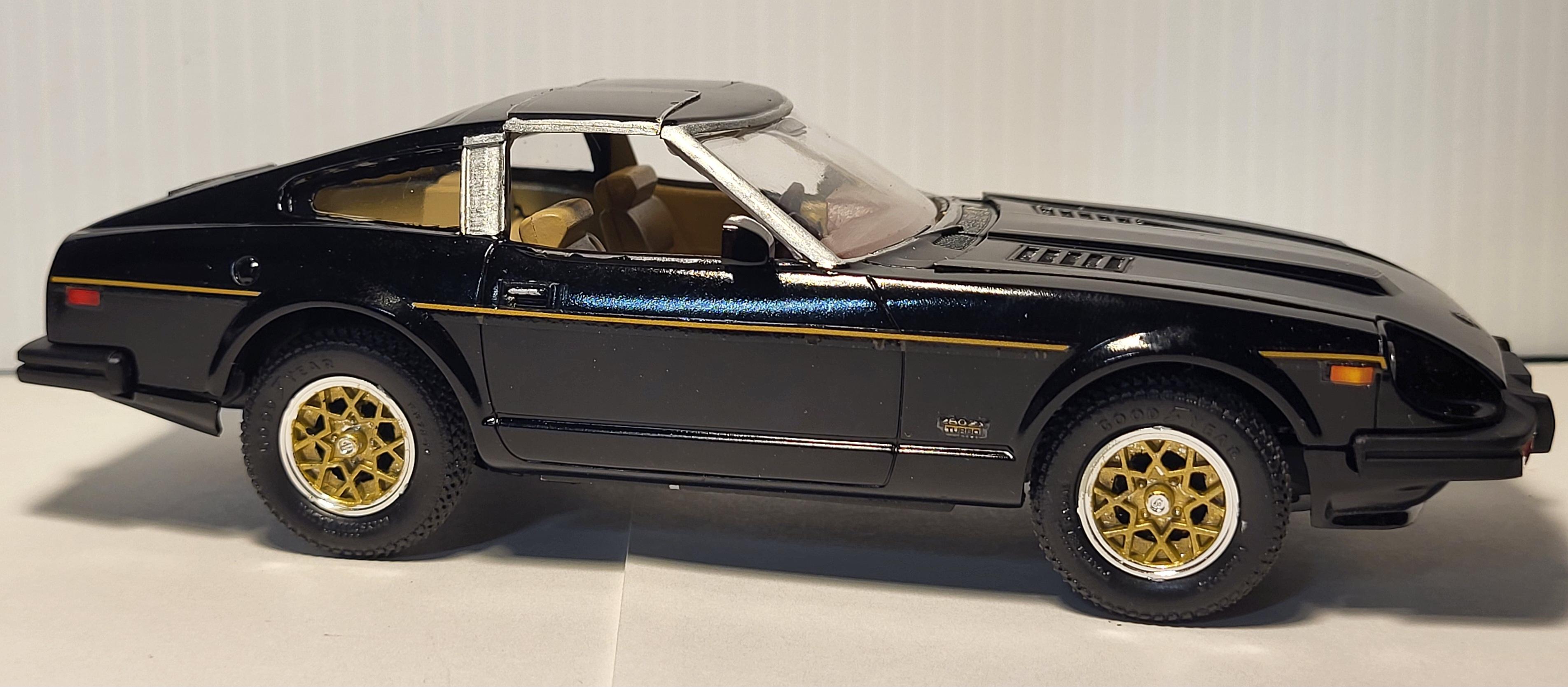 Here is my completed AMT 1981 Datsun 280ZX Turbo. This was one of those cars that many of the guys wanted back in the 1980s in Miami, FL, when I was in high school. Well, this and a 1965 Mustang, but that’s another story. My build is box-stock, and is what I would have wanted my 280ZX to look like if I had had one. I didn’t. I had a Dodge Aries K, grey with a red interior. Not the same thing. The model is painted with Tamiya colors: body is TS-14 Black, interior is XF-57 Buff with XF-68 NATO Brown dash & console. T-tops were painted TS-71 Smoke. For an AMT kit, the fit was surprisingly good, not great, but good (can’t believe I actually wrote that), however there was an issue with the gold stripe decals, and I did use the optional gold badges. Found a 1986 Dade County license plate online, so I added that. Oddly, the taillights are molded on the clear red tree, but need to be red, silver, & amber. Probably would have been better on the chrome tree. I would have had louvers on my rear window if this were my actual car, but they're not in the kit anymore. Engine bay: Underside (I think I need an alingement): Interior: It's far from perfect, but I'm pleased with the results.