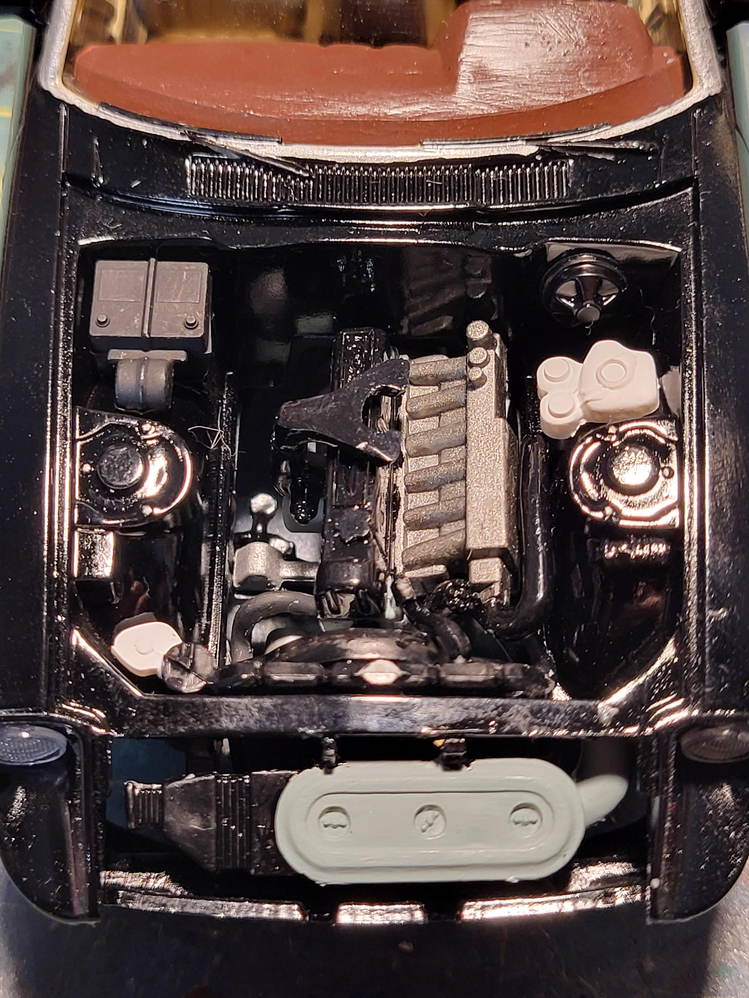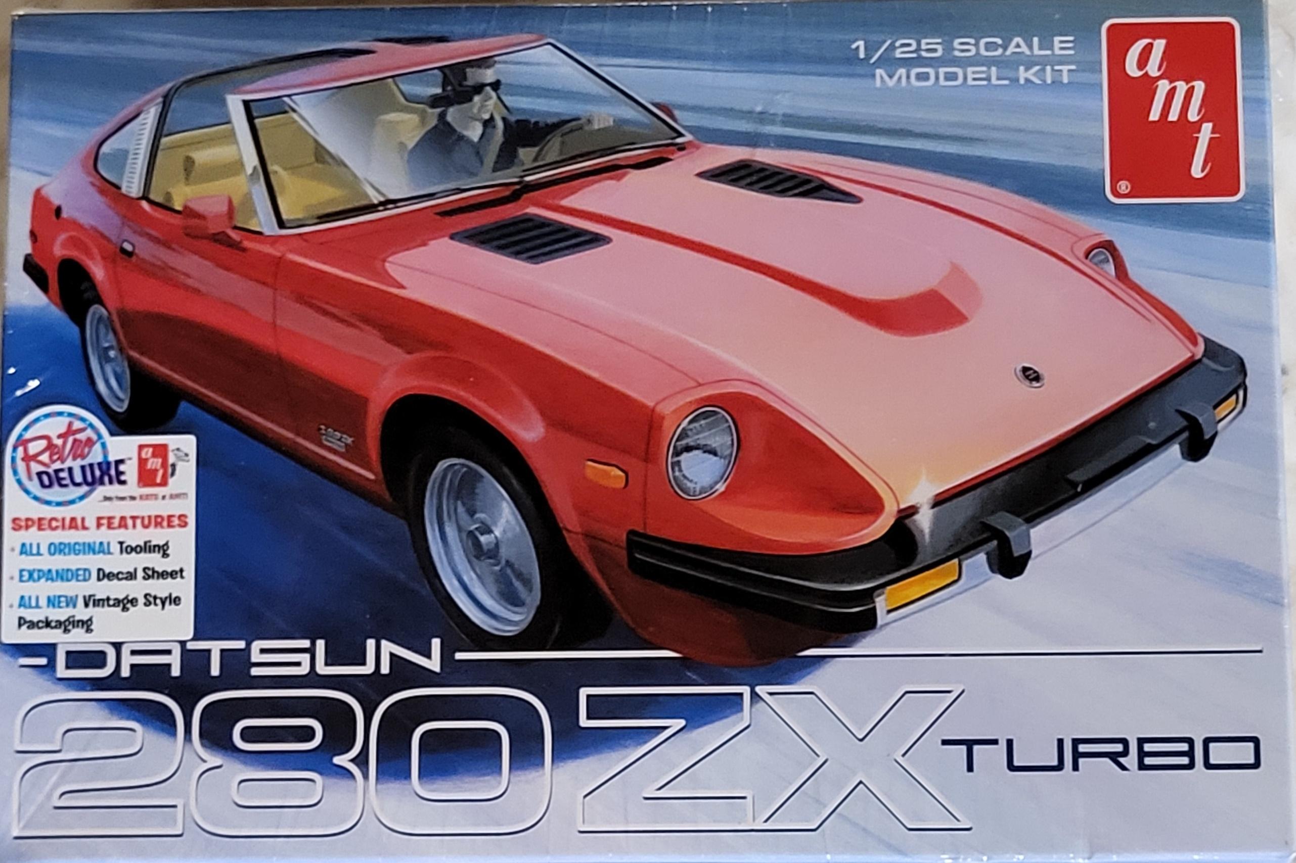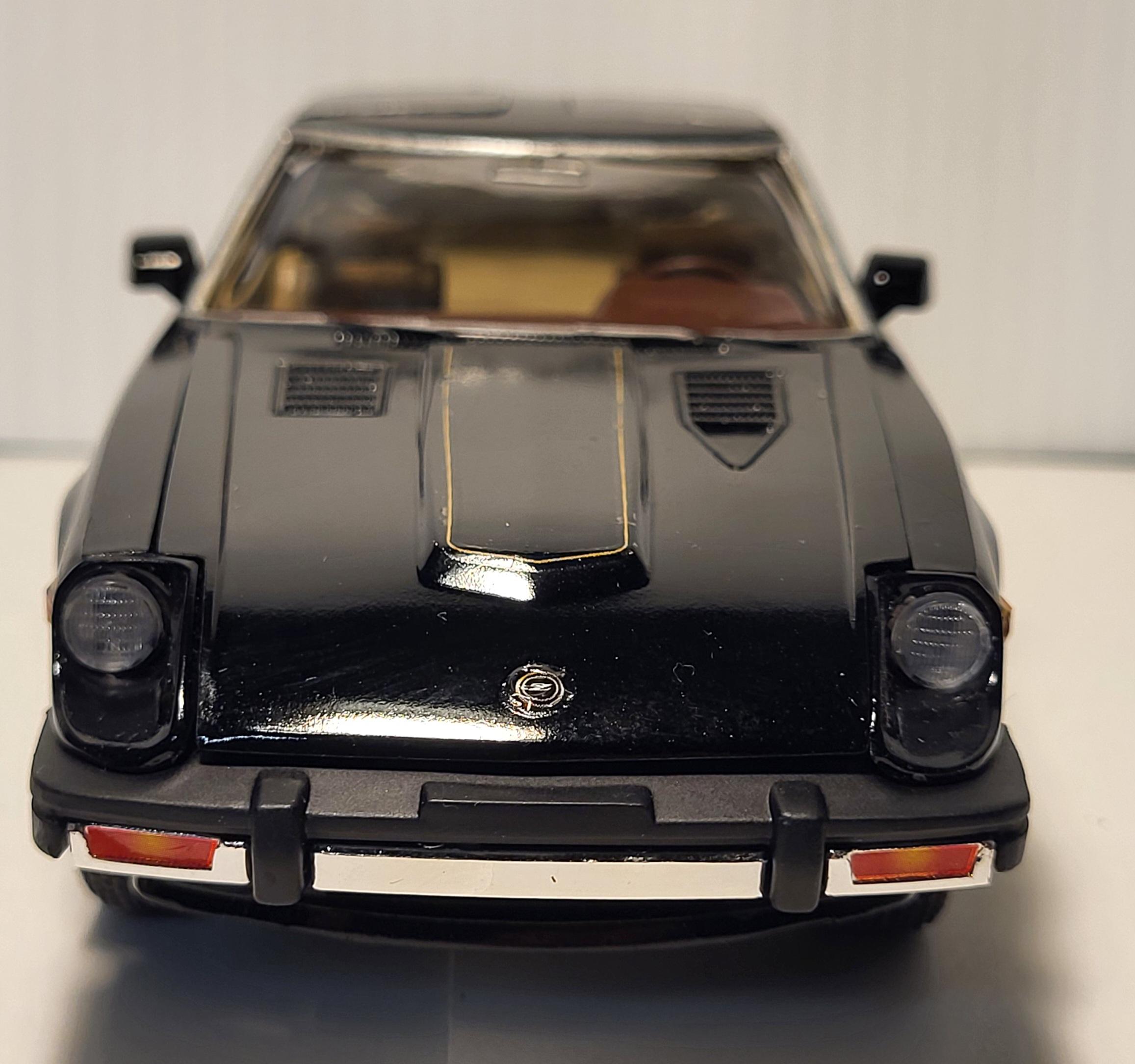 Here is my completed AMT 1981 Datsun 280ZX Turbo. This was one of those cars that many of the guys wanted back in the 1980s in Miami, FL, when I was in high school. Well, this and a 1965 Mustang, but that’s another story. My build is box-stock, and is what I would have wanted my 280ZX to look like if I had had one. I didn’t. I had a Dodge Aries K, grey with a red interior. Not the same thing. The model is painted with Tamiya colors: body is TS-14 Black, interior is XF-57 Buff with XF-68 NATO Brown dash & console. T-tops were painted TS-71 Smoke. For an AMT kit, the fit was surprisingly good, not great, but good (can’t believe I actually wrote that), however there was an issue with the gold stripe decals, and I did use the optional gold badges. Found a 1986 Dade County license plate online, so I added that. Oddly, the taillights are molded on the clear red tree, but need to be red, silver, & amber. Probably would have been better on the chrome tree. I would have had louvers on my rear window if this were my actual car, but they're not in the kit anymore. Engine bay: Underside (I think I need an alingement): Interior: It's far from perfect, but I'm pleased with the results.