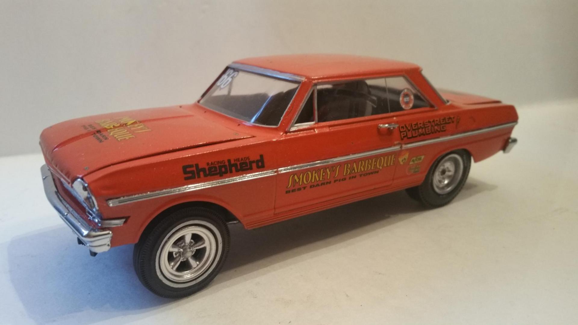 I got this one in a trade. It was freshly painted black and then dropped. It was broken in three places. Fixed it up the best my skills would allow...just small details left now. Built it like a small town drag car with local sponsors.