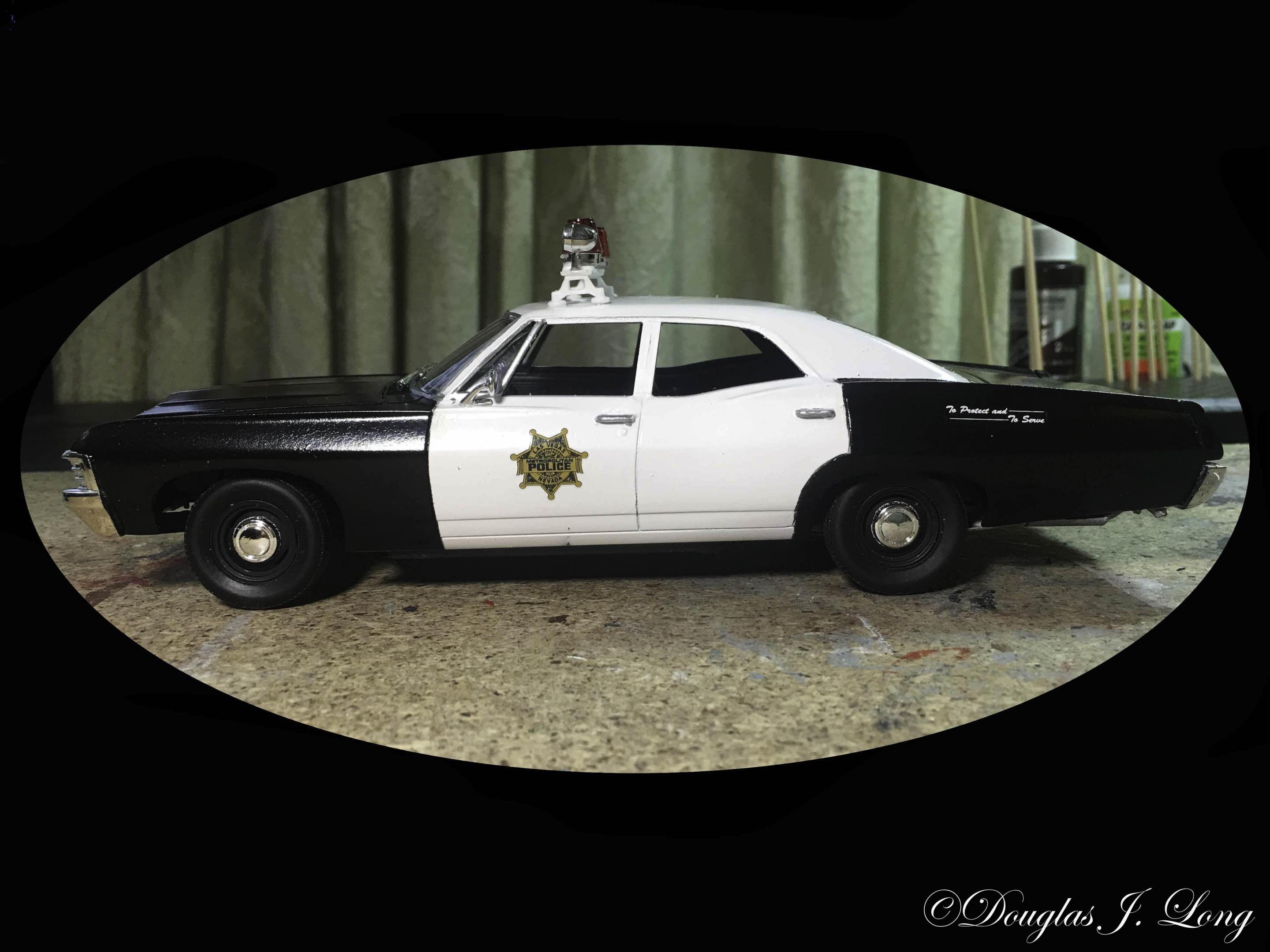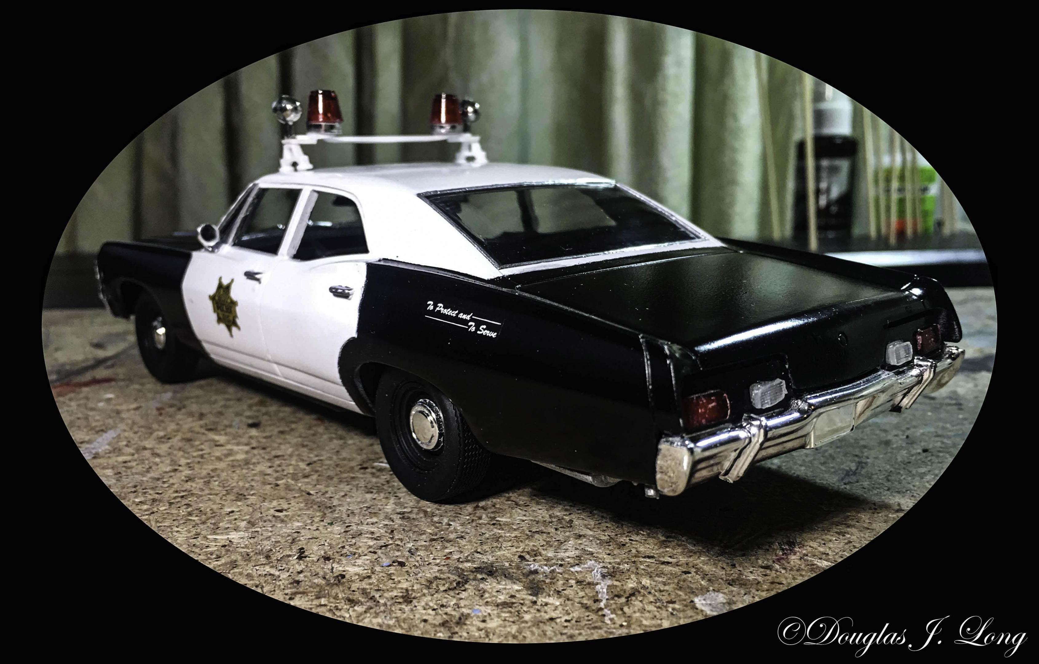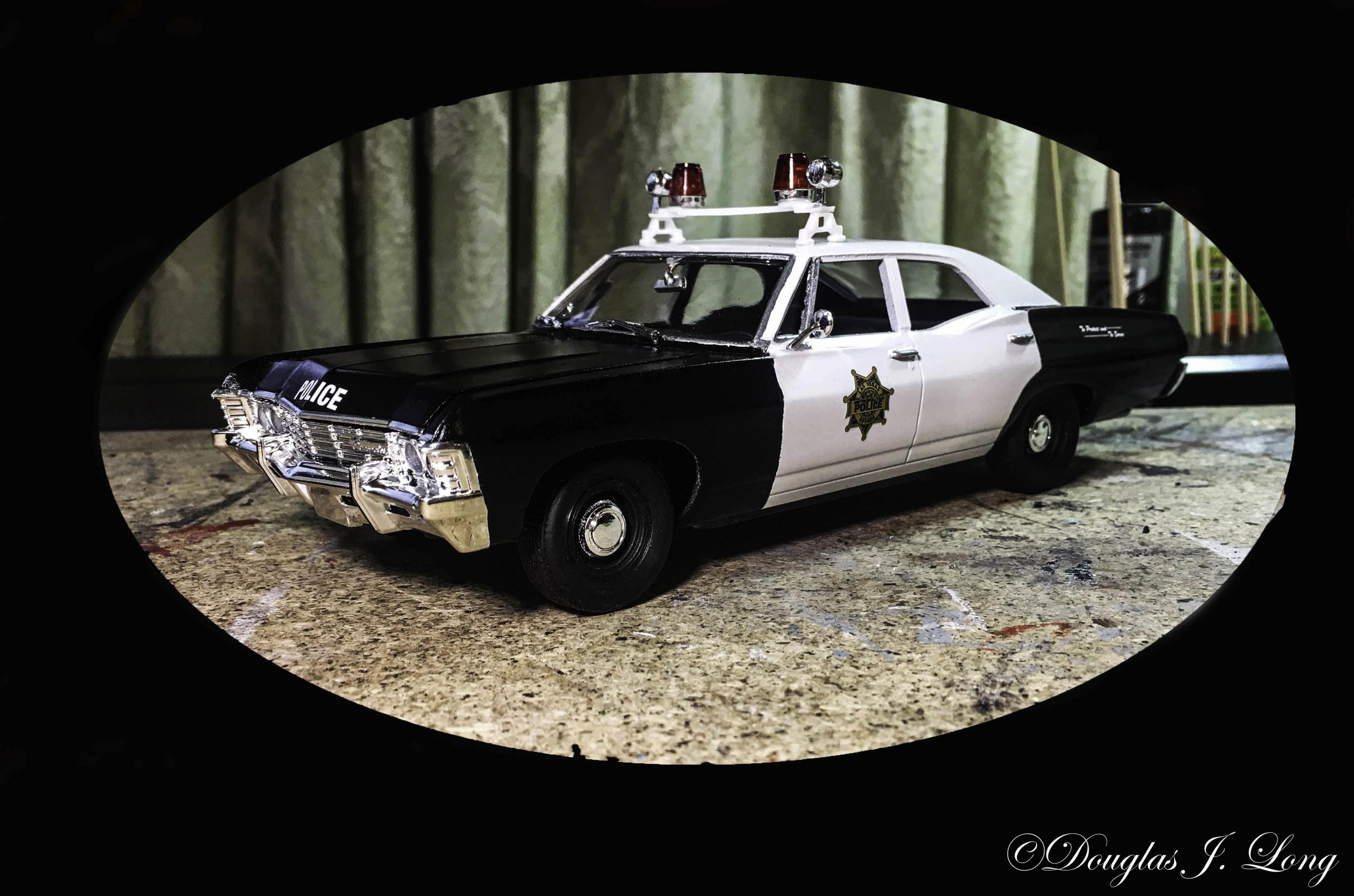 I made a couple of minor changes t the Supernatural 1967 Chevrolet Impala Supernatural kit. It is now a Biscayne police car. I probably don't have all the police items correct, as this is the first time that I've ever done a police car, and I'm out of my comfort zone. I did not include an areal as they have a tendency to get knocked off, or worse, broken. When I introduce it into a diorama sometime in the future, I'll then include the antenna(s). I really expect to see AMT produce a police car from the Supernatural kit as the interest for the kit wanes. For those of you who are considering this transformation, I have some information to add. The rear center of the trunk has to be reworked. Impalas had a trim piece on the lower edge of the trunk. The Biscaynes do not. This trim is molded on with the rear bumper. You will need to carefully cut that from the bumper, sand it smooth, and add it to the bottom of the center trunk lid. The tail lights are also different. Once again, turn to the rear bumper. Carefully file the upper trim from above the lights, leaving the backing intact. After the trim is removed, sand the detail from the light area. I used parts bins lights for it, which suffice quite well, since I'm just going for a shelf model. To reach a higher level of authenticity, I would suggest that you plan ahead and acquire slightly larger lights, and include the trim surrounds for them. The seats have to be addressed. Straight from the kit, the seats don't match each other. I resolved this by sanding both seats semi-smooth. I then added .010 strips for the detail. I did not alter the trim on the doors, as it would not be noticeable through the small window openings. If you're using the beige color that some departments used, you may want to give the door panels consideration. The 1965 Chevelle wagon comes with surf boards and a rack to carry them on. I used the uprights for the racks to build the sides for the light bar. The cross piece was in one of my miscellaneous parts drawers. It was a piece that says remove on it, and probably was from the hood opening section of a long built model. This one was perfect as it had to round areas on either side that matched the emergency strobe lights. Those strobe lights came from the red lens trees for big rig trucks.