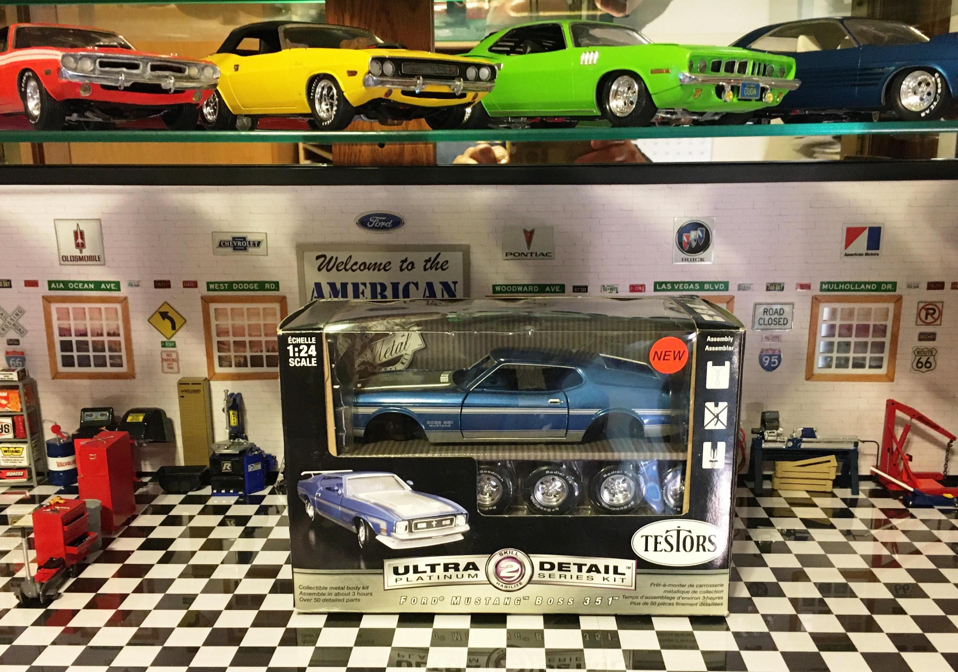 Wanted to get back into building cars again so I opened up the easiest one I have in inventory. A metal pre-painted Testors 1971 Boss 351 Mustang in my favorite color combo Blue and Silver. I started to do some research to find out how to detail it appropriately and learned that is NOT a '71 but a '73 with only a '71 grille. I plan on changing the interior to factory white/black. Follow along if you are interested.