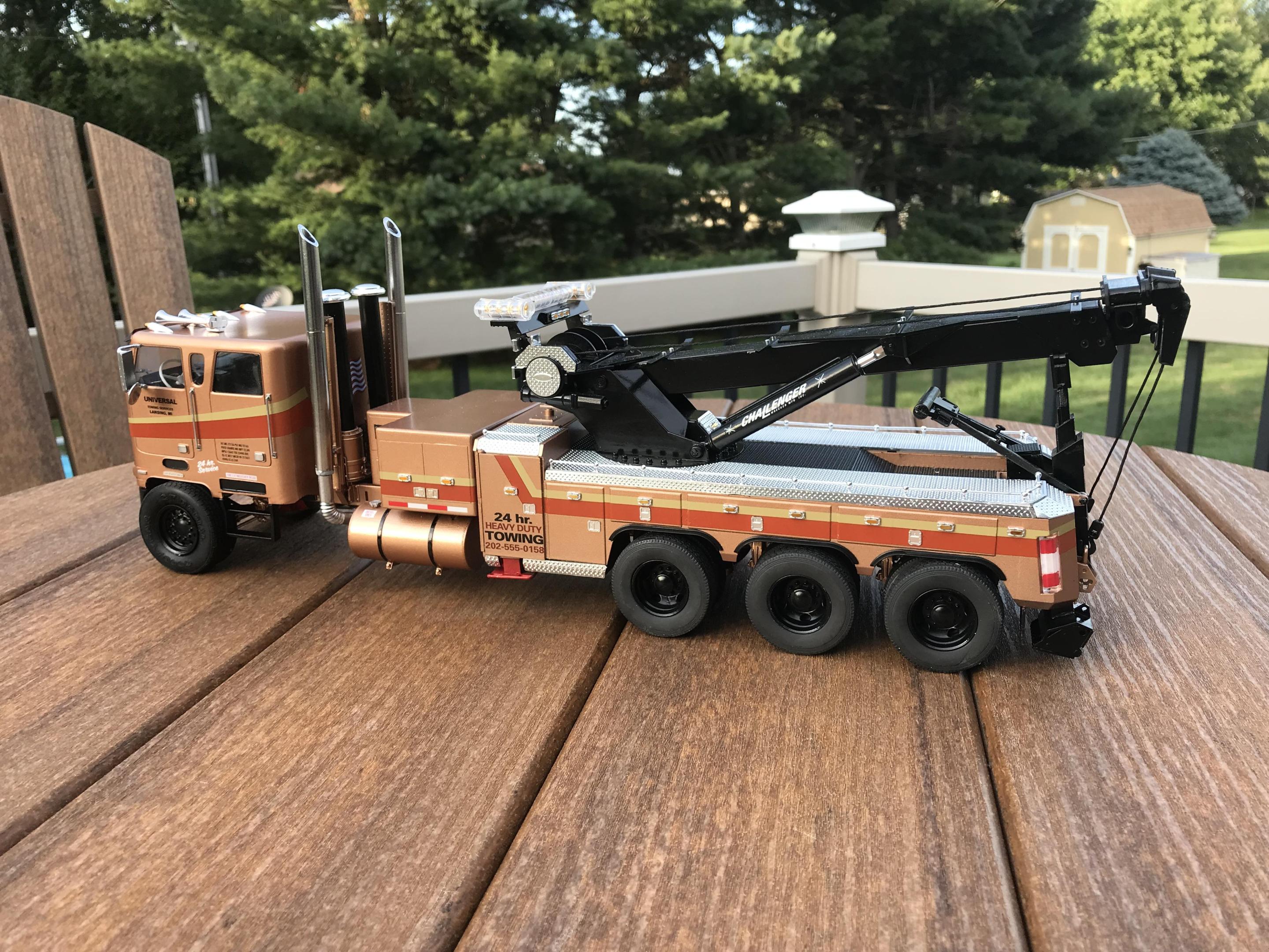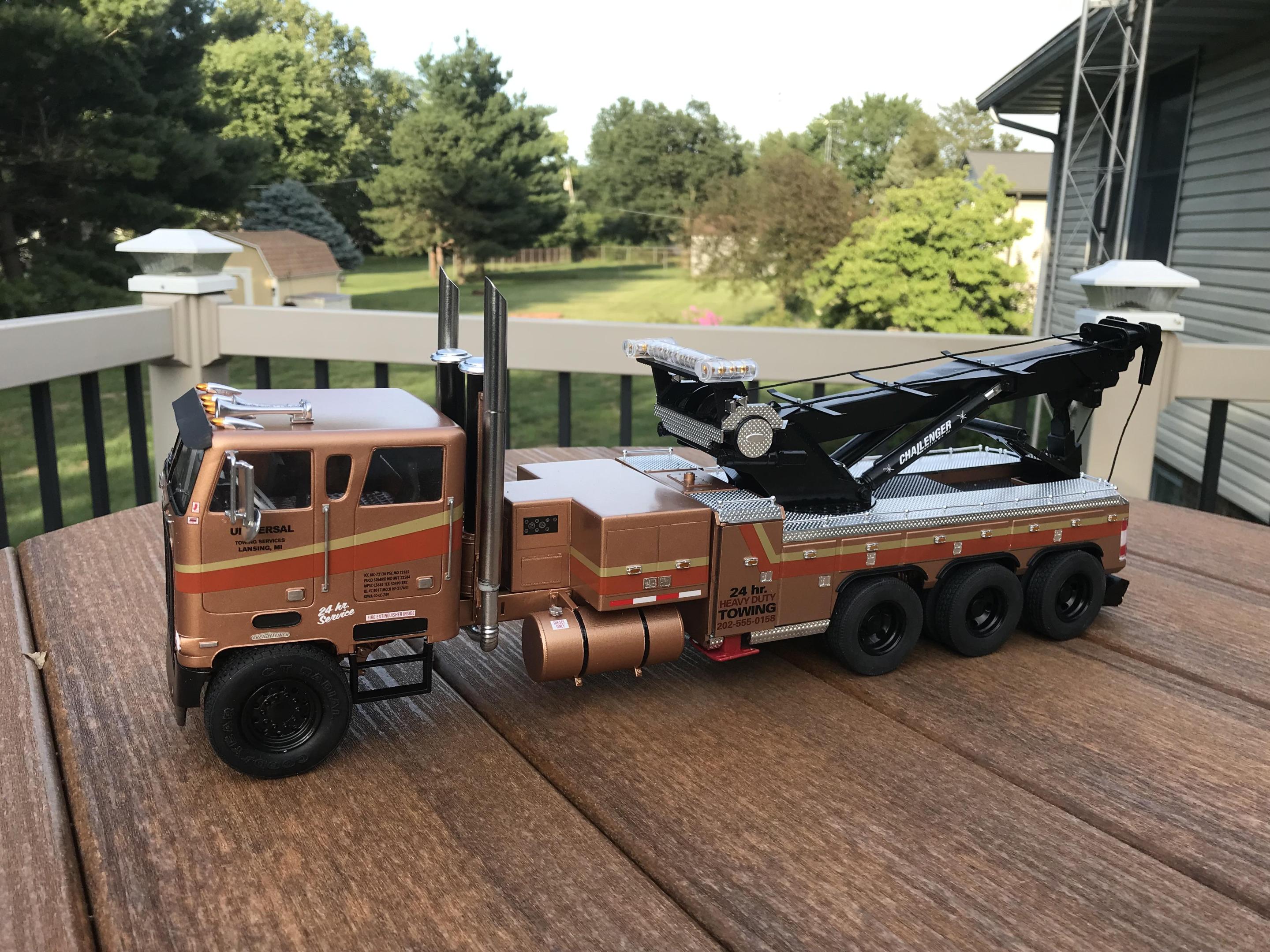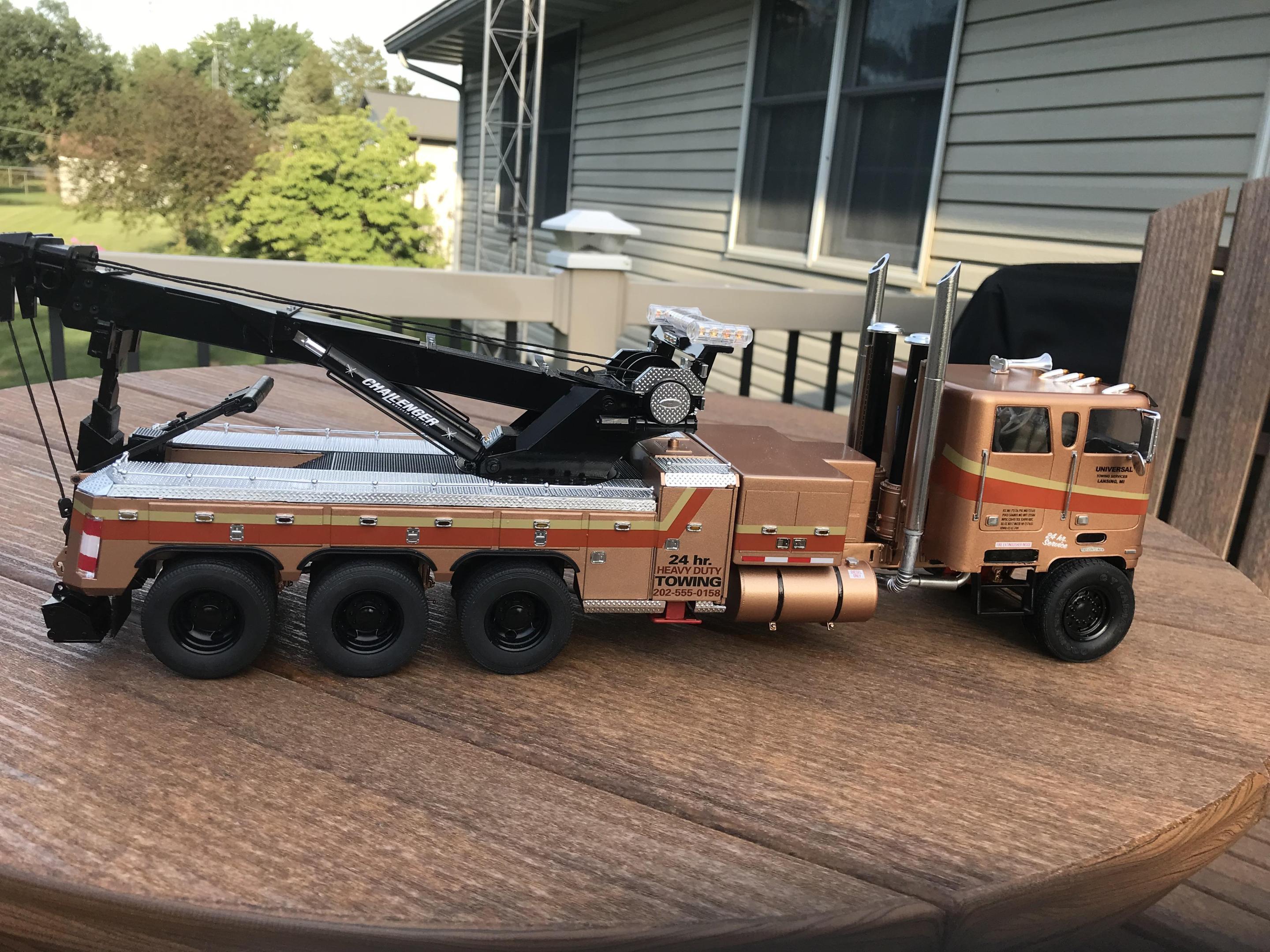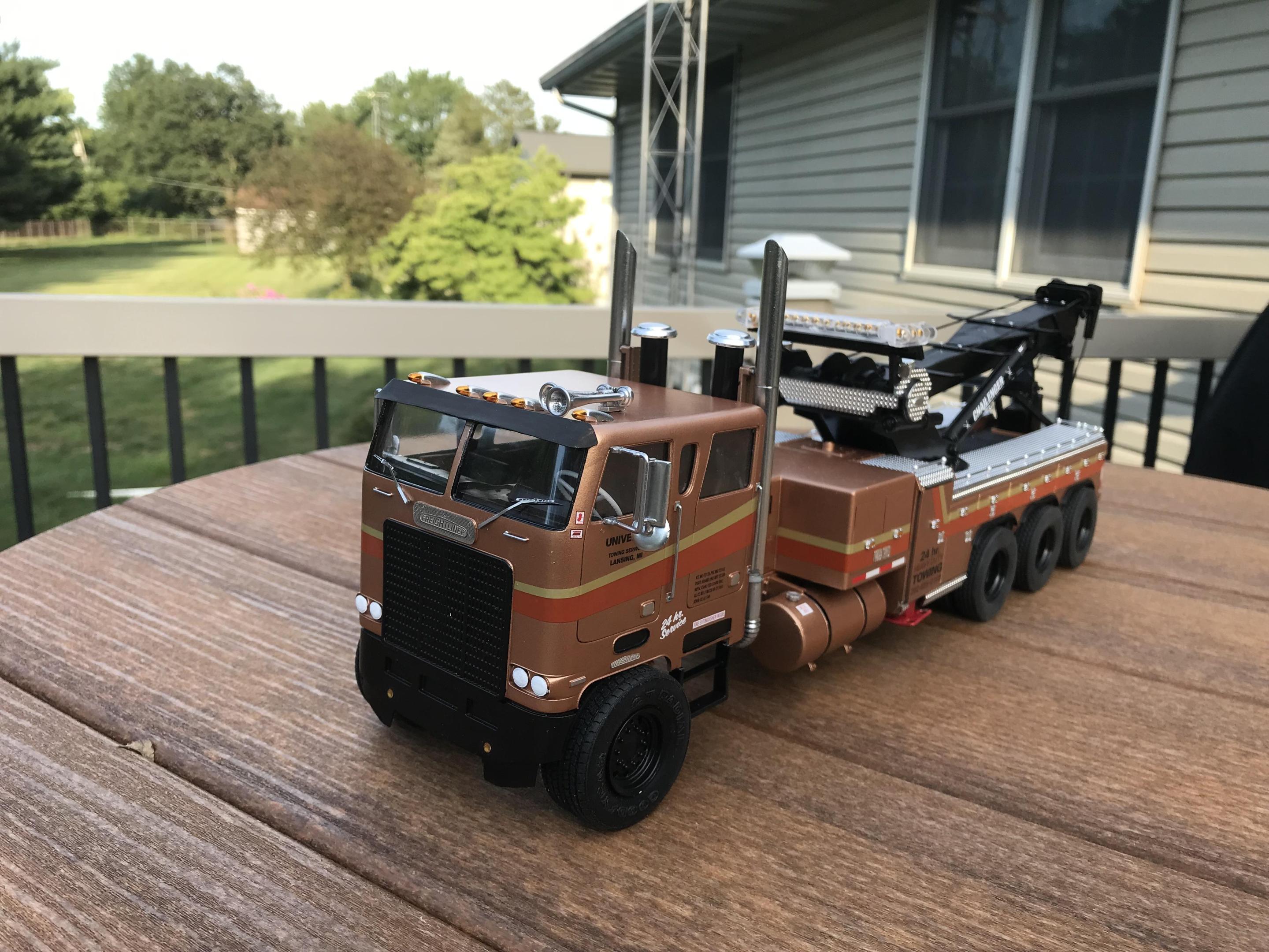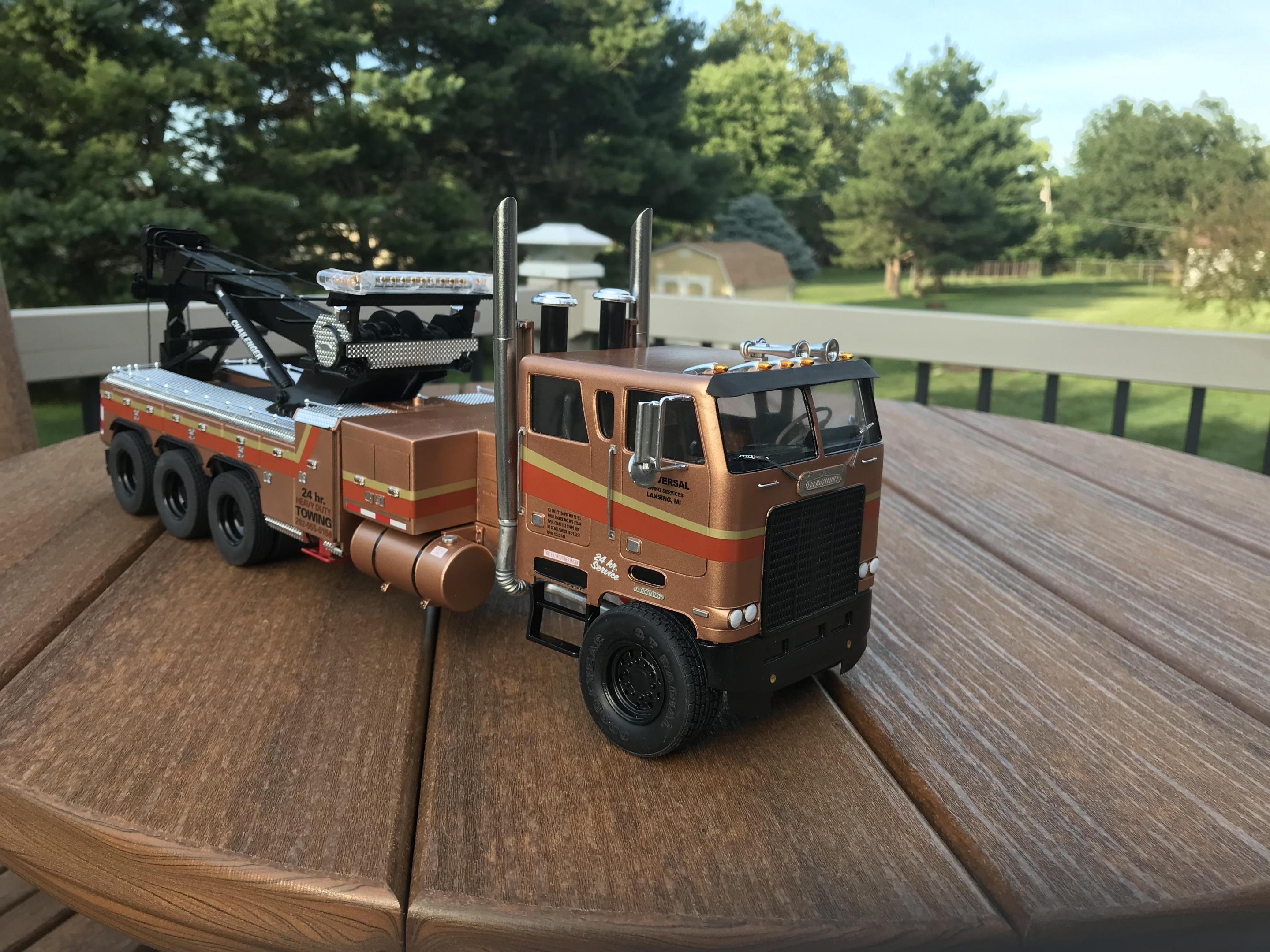 Finally putting this build under glass. The build took longer than expected but I think it came out well. I used the Revell of Germany Stepps Peterbilt wrecker as the major components for the build. 3D printed items include the POWERLINER cab ( designed by 3dmodlermon on CG Trader), additional storage box, rear wheels and tires, and air horns. Decals came from the reissue AMT reefer trailer and various other kits. The color is rose gold over black automotive black primer. The interior is caramel with black seats. The interior was made from 2 AMT Freightliner kits. The upholstery was made from the seal of a coffee can.