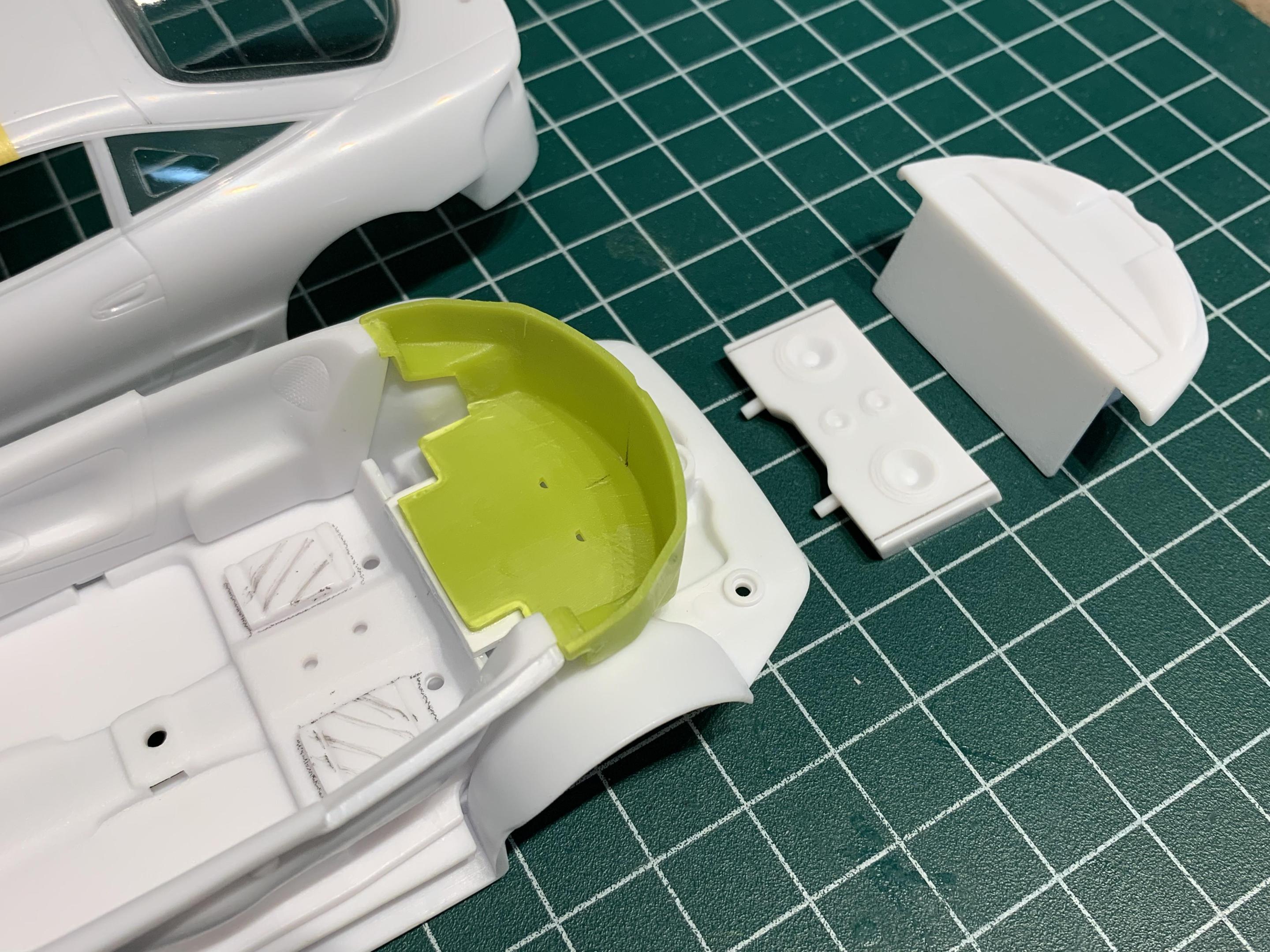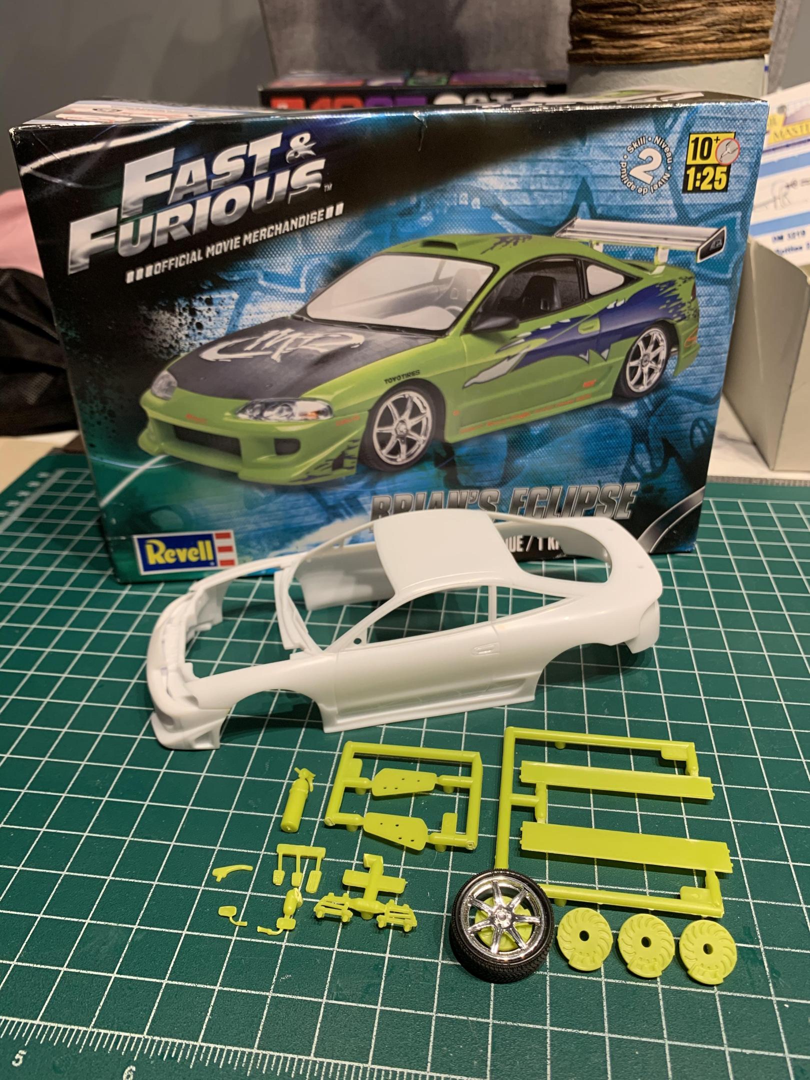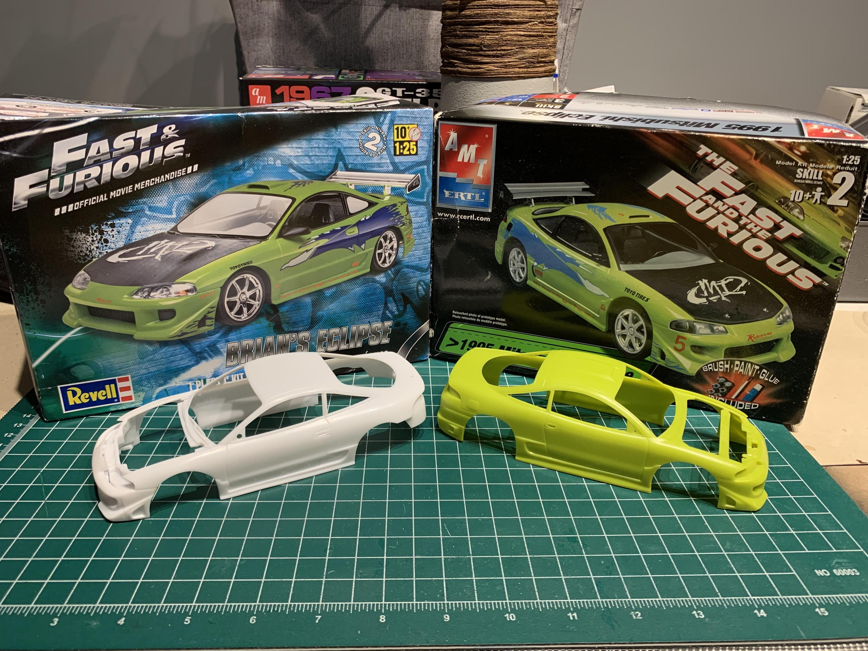 This is a project that I am doing as a tribute to Paul Walker and the first 3 cars (Eclipse, Supra & Skyline) driven by his character “Brian O’Conner in the films “The Fast and the Furious” and “2 Fast 2 Furious”. The 1995 Mitsubishi Eclipse GS was first seen in the opening clips of the movie “The Fast and the Furious”. The bright green paint scheme got my attention right from the start and like others, I was an immediate fan (of the soon to be franchise). The Mitsubishi Eclipse model was soon produced by both Revell & AMT. I wanted to build the best version of this vehicle with the most accurate & detailed parts. The solution was for me to use the Revell kit as the primary and combine parts from the AMT kit as well as a bunch of after market parts and photo-etched goodies. The rear interior of both kits did not accurately show what was behind the front seats, so I decided to add all the missing details to this model and used the AMT’s rear interior and amalgamated them both. I will remove the stereo amplifiers and place them in the rear hatch. The back seat mounted sub woofer wall will be converted into a sub woofer box and will also be moved to the back hatch area with the amplifiers. The rear seat wall and hatch cover will be repurposed into a deck that will cover up the rear seats and provide a place for the two NOS bottles to be mounted to.