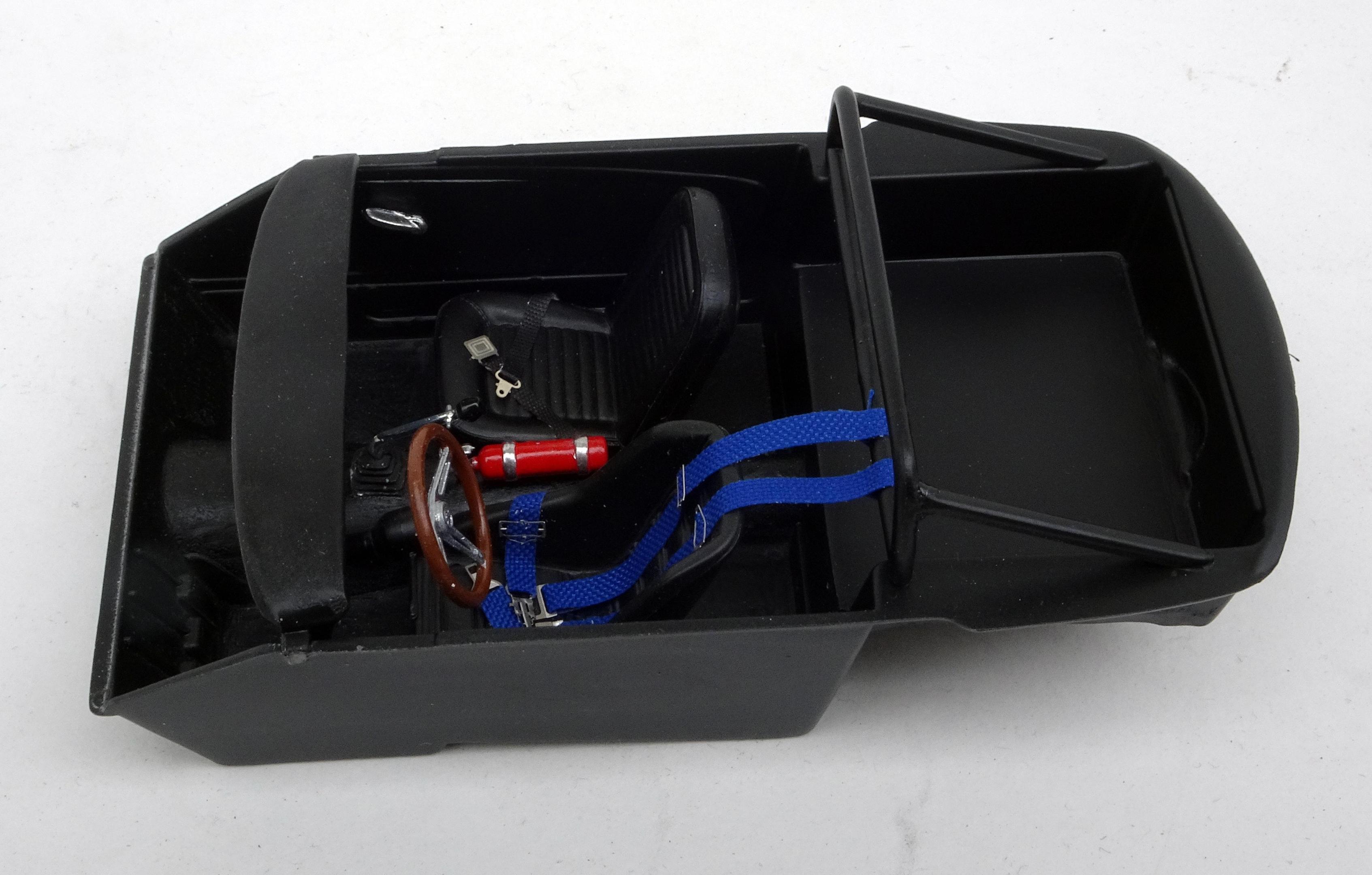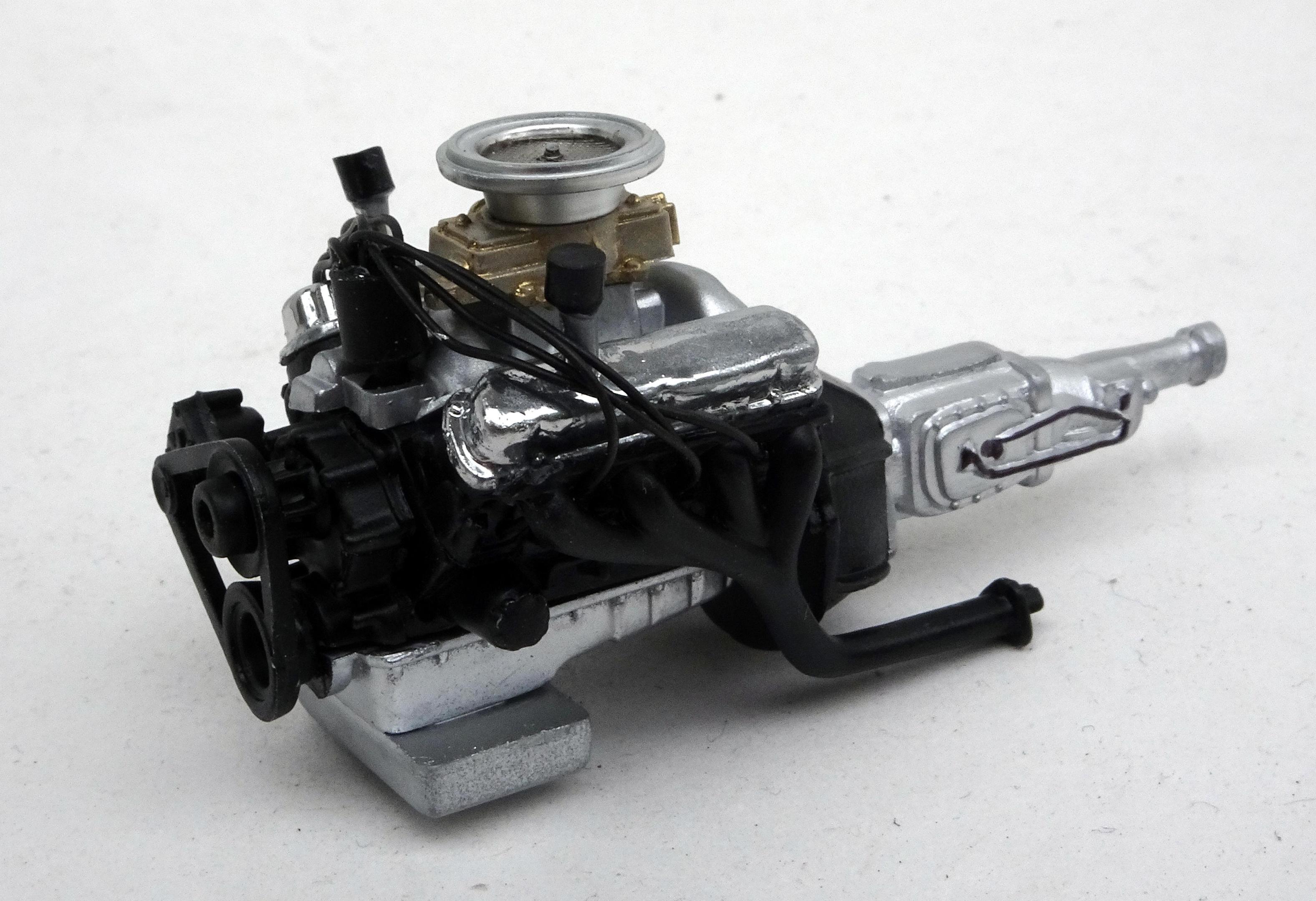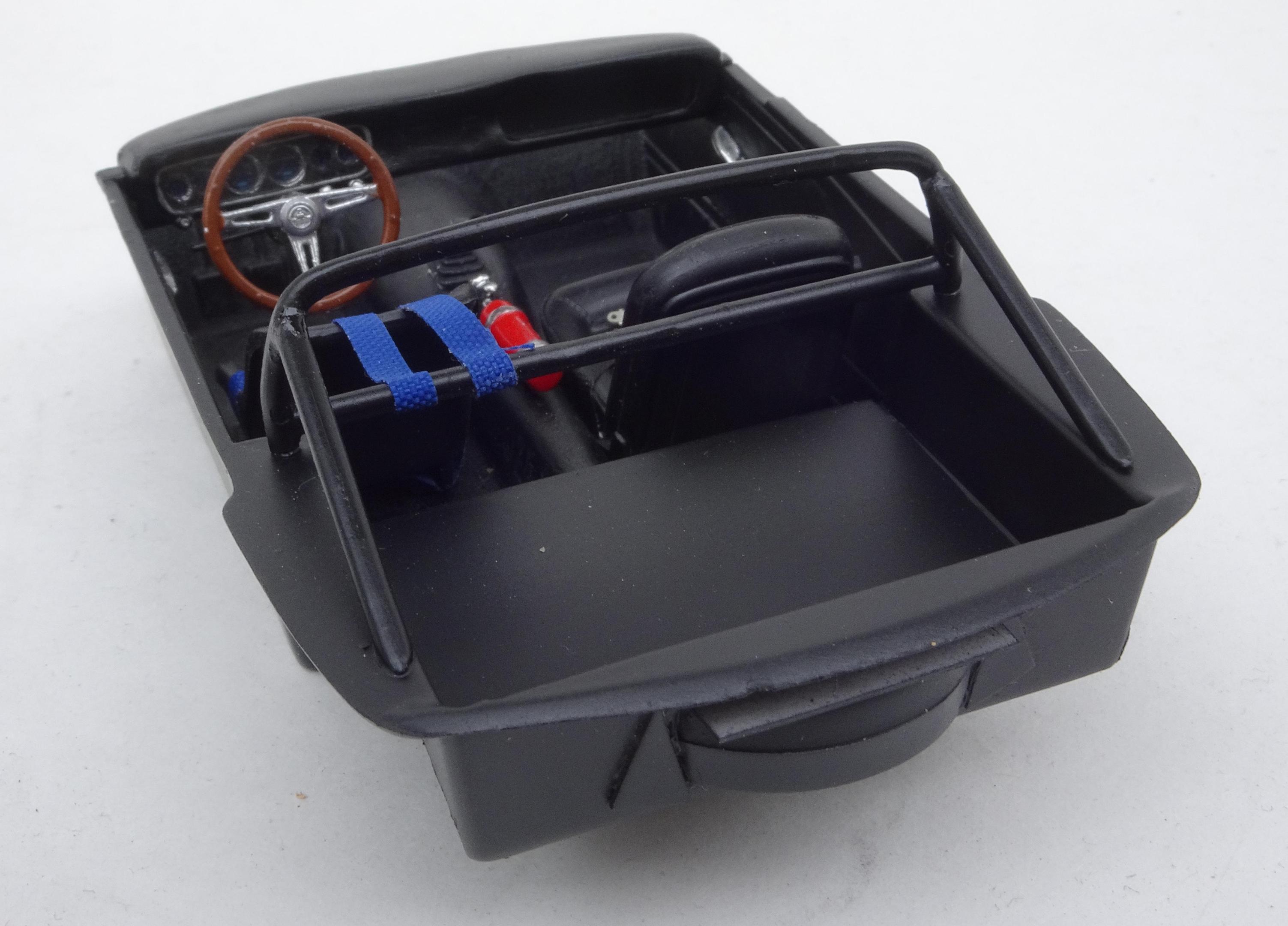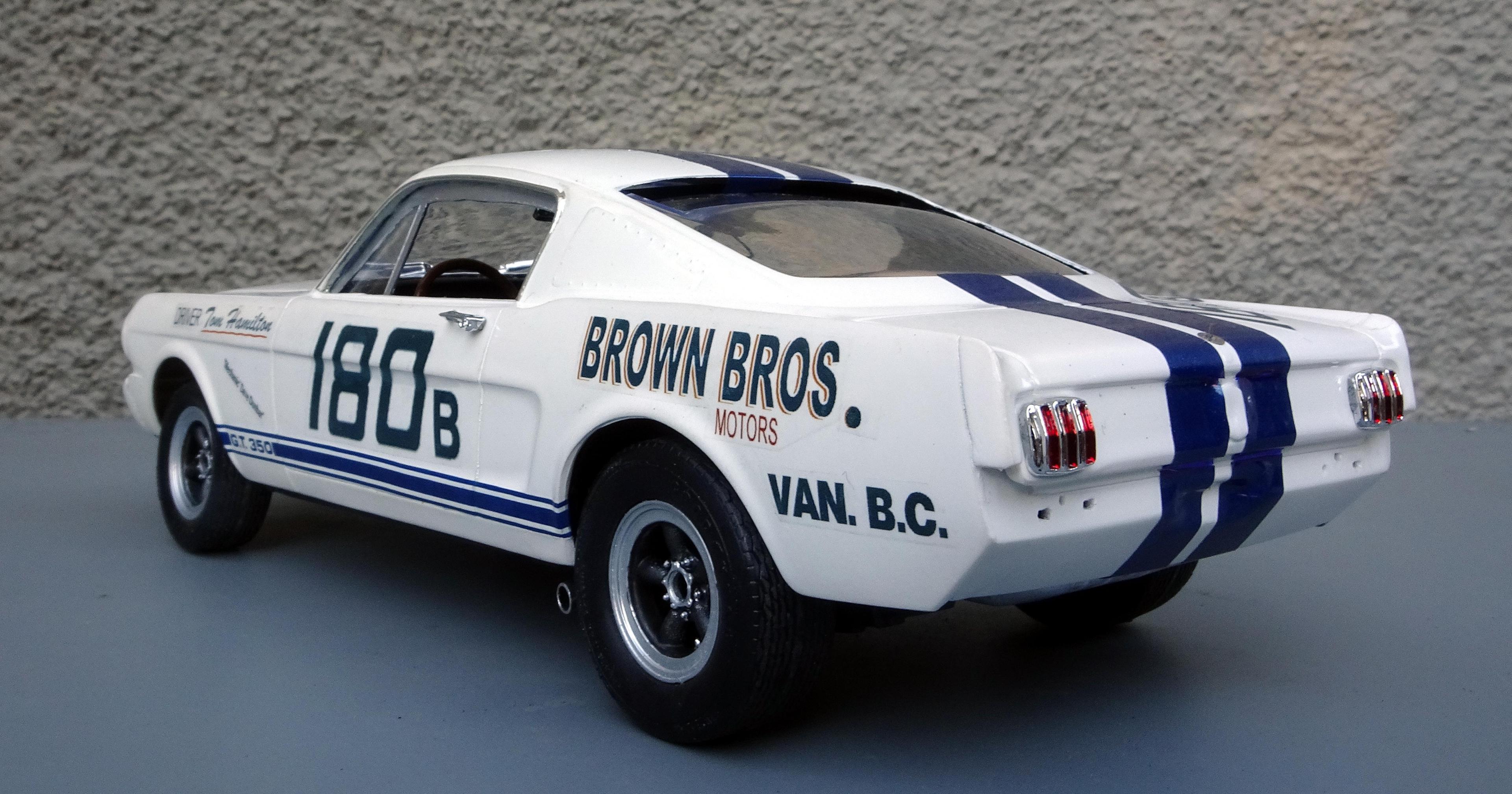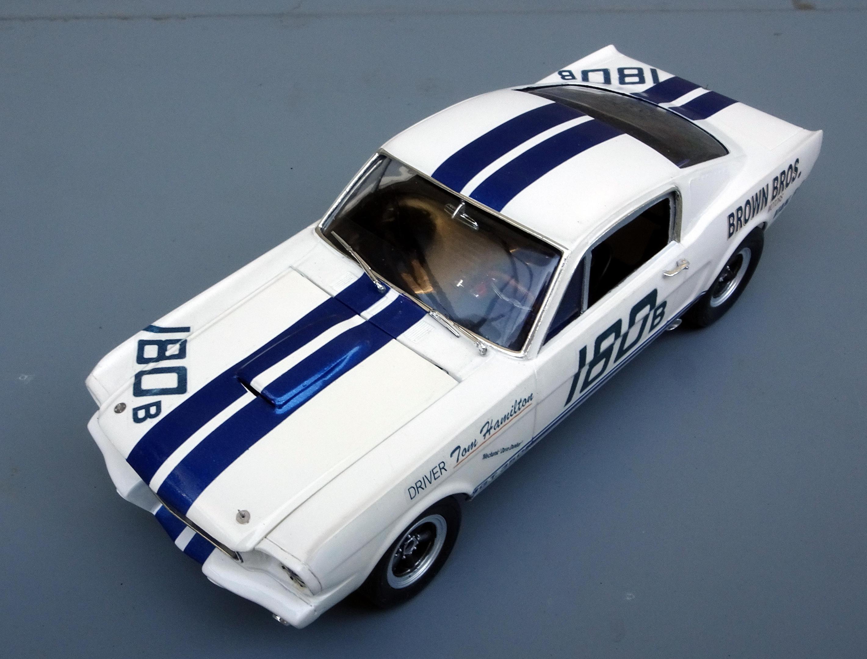 This is the second time I have built a replica for the Brown Bros GT350R. The first time was for the original driver - Tom Hamilton. That led to me decaling about 75 1/18 diecasts sold to collectors. There is a very real chance that the livery on the restored car was based on the decals I made up for Tommy's model because he asked me to leave off the name of the other driver who only raced the car once but his name always remained on the original along with Tom Hamilton. Although my initial intention was to do a relatively simple build, I ended up doing virtually all the modifications to make it quite accurate. The real car was not sold by Shelby to Brown Bros. until 1967 and was raced extensively for the next two years. Apparently its next incarnation was as a street racer with a lace panel paint job! ALTERATIONS & ADDITIONS BODY – Replaced molded wipers and door handles with separate ones from 64 Fairlane, removed emblems, front valance - covered round holes and cut in oval brake cooling openings, rear valance filled reverse light holes and added bumper mount holes, covered gas filler hole with thin styrene, made up R model side window frames, removed rear window trim, replaced grill with one from a stock 1966 GT350, added hood pins INTERIOR – dash modified by removing top pad, glove box door, radio and other surface detail, removed door panel upholstery and floor carpet detail, added slot for spare tire in rear bulkhead, added web belts for window raising & lowering, drilled out gauges and backed with reduced photo of actual gauges CHASSIS – Tubed rear wheelwells and narrowed rear track to get tires to fit within body, removed gas tank for separate painting, installed over rider traction bars ENGINE COMPARTMENT – Separated from body for separate painting, removed battery and platform, added an oil cooler ENGINE – Stock style chrome valve covers with extra breathers added PAINT – Tamiya Pure White over Racing White which does seem to give a bit of a Wimbledon White look DECALS - The side stripes by Fred Cady but the rest of the livery are my decals from art work done almost 20 years ago. The center stripes are metallic blue vinyl in keeping with the fact that back in the day Tommy Hamilton re-striped the car with reflective vinyl used on telephone booths.