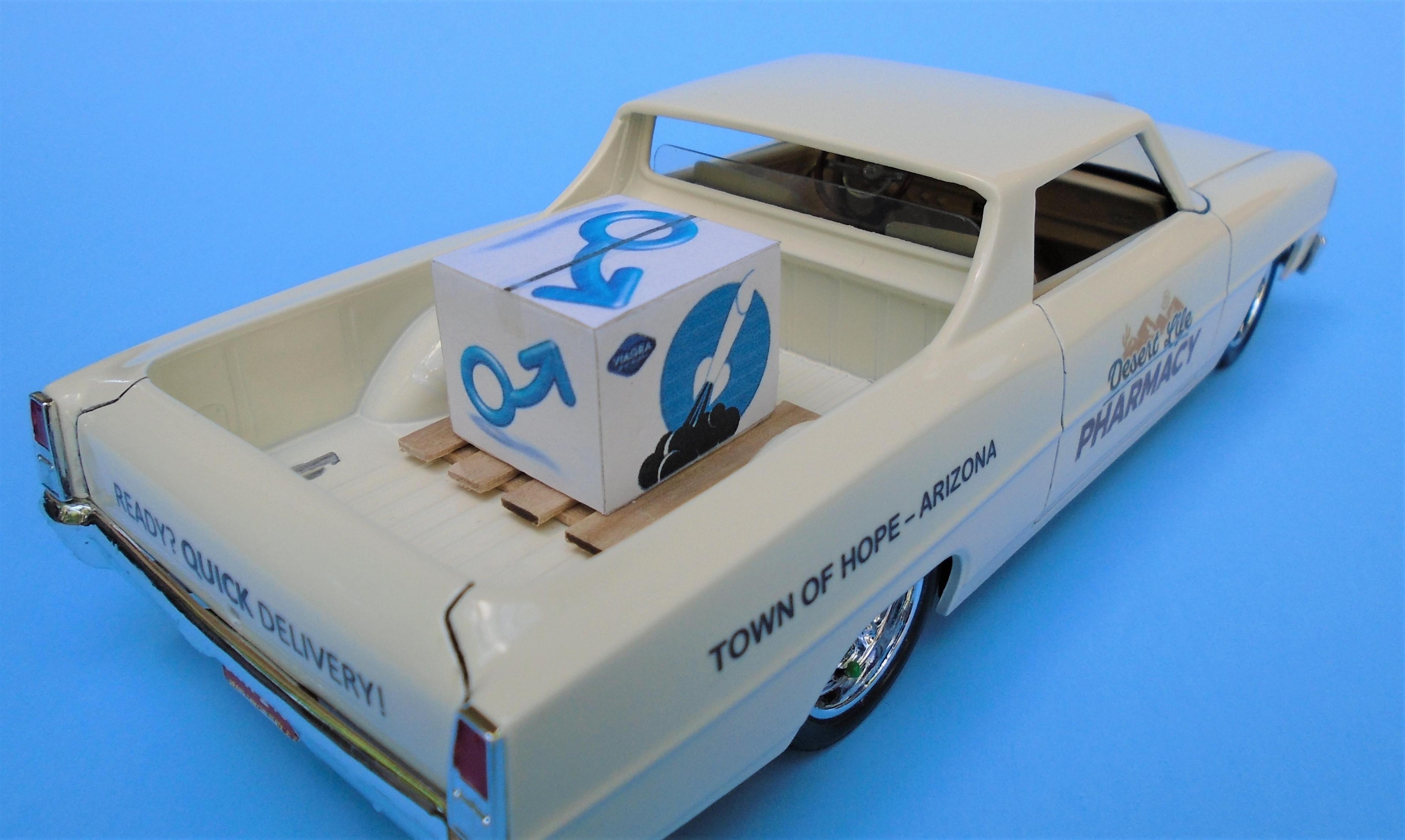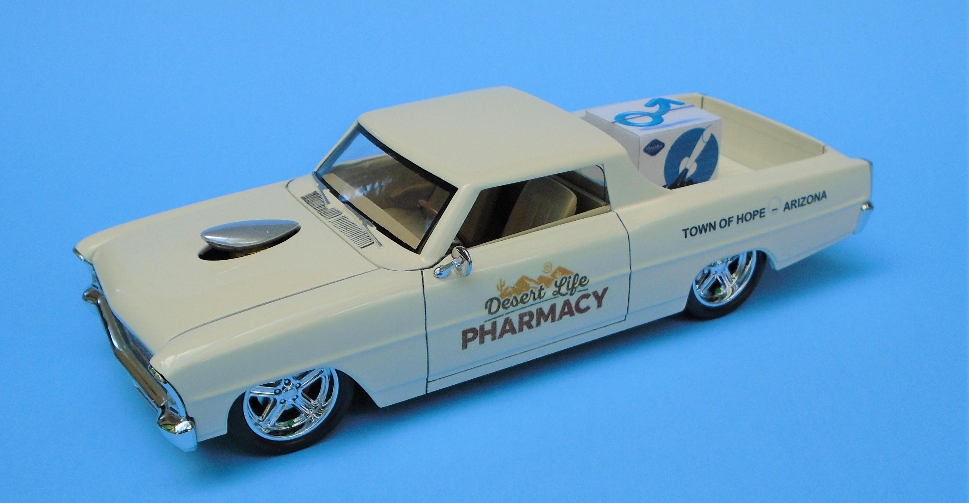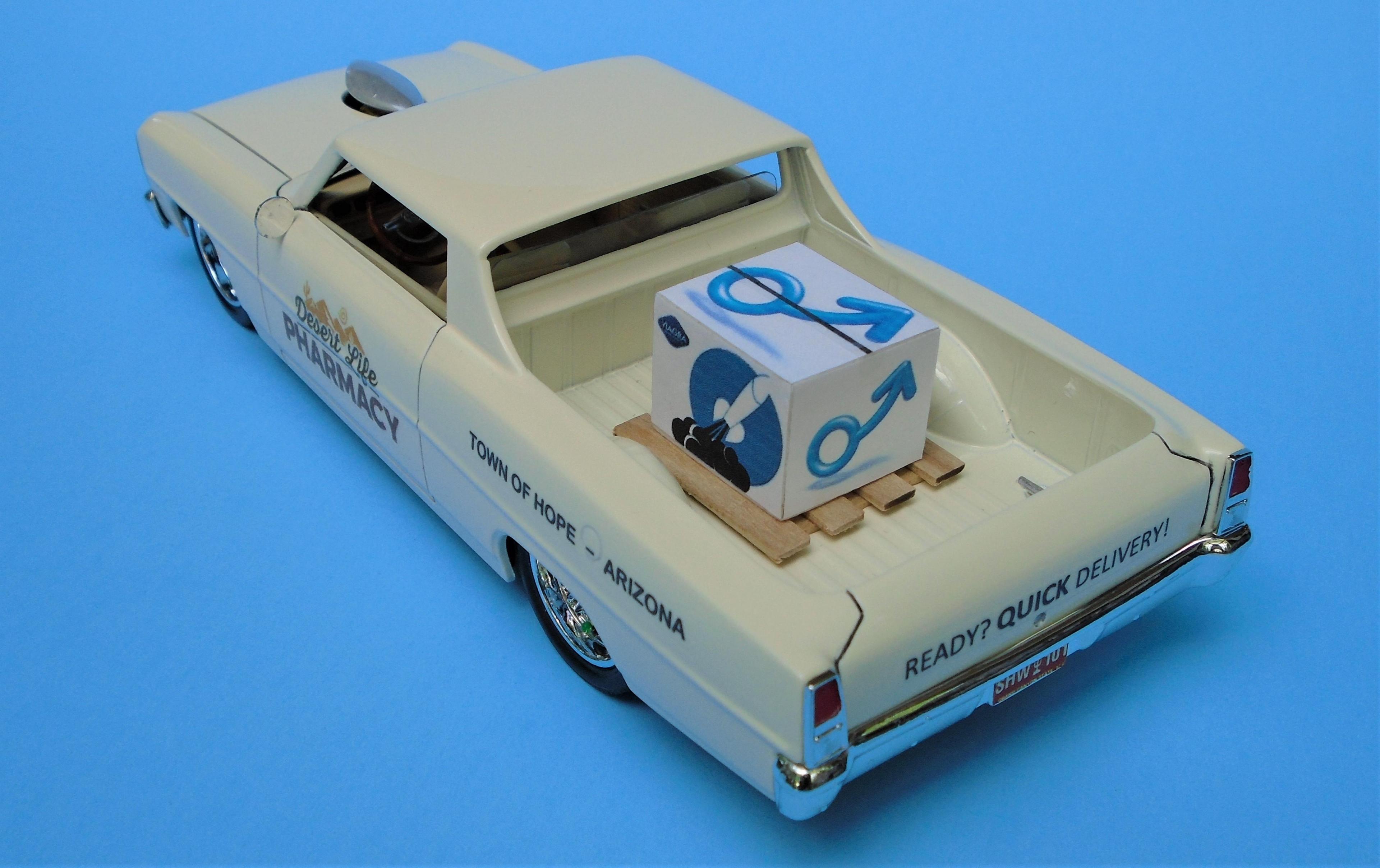 Hi! I love Arizona! I visit as often as I can. I've noticed a great deal of "mature gentlemen", even more so in the winter months (the dreaded snow birds!). One day, I drove trough a town called Hope, and it gave me an idea... What about a convenient medicine delivery "ute" with the livery of the local pharmacy? On to the web, searching for actual phramacy logos. And voilĂ ! AMT's 66 Nova, mashed with the bed of the 61 Ranchero. Chopped top, fabricated B pillar & tailgate, scooped hood with Altered states air intake, wood pallet made of coffee sticks, with a crate of the blue pills. Home made decals. Tamya's racing white + Wet Look clear. Rolling stock from Revell's 70 Cuda. Life is short, might as well have fun with... styrene! What were you thinking? CT