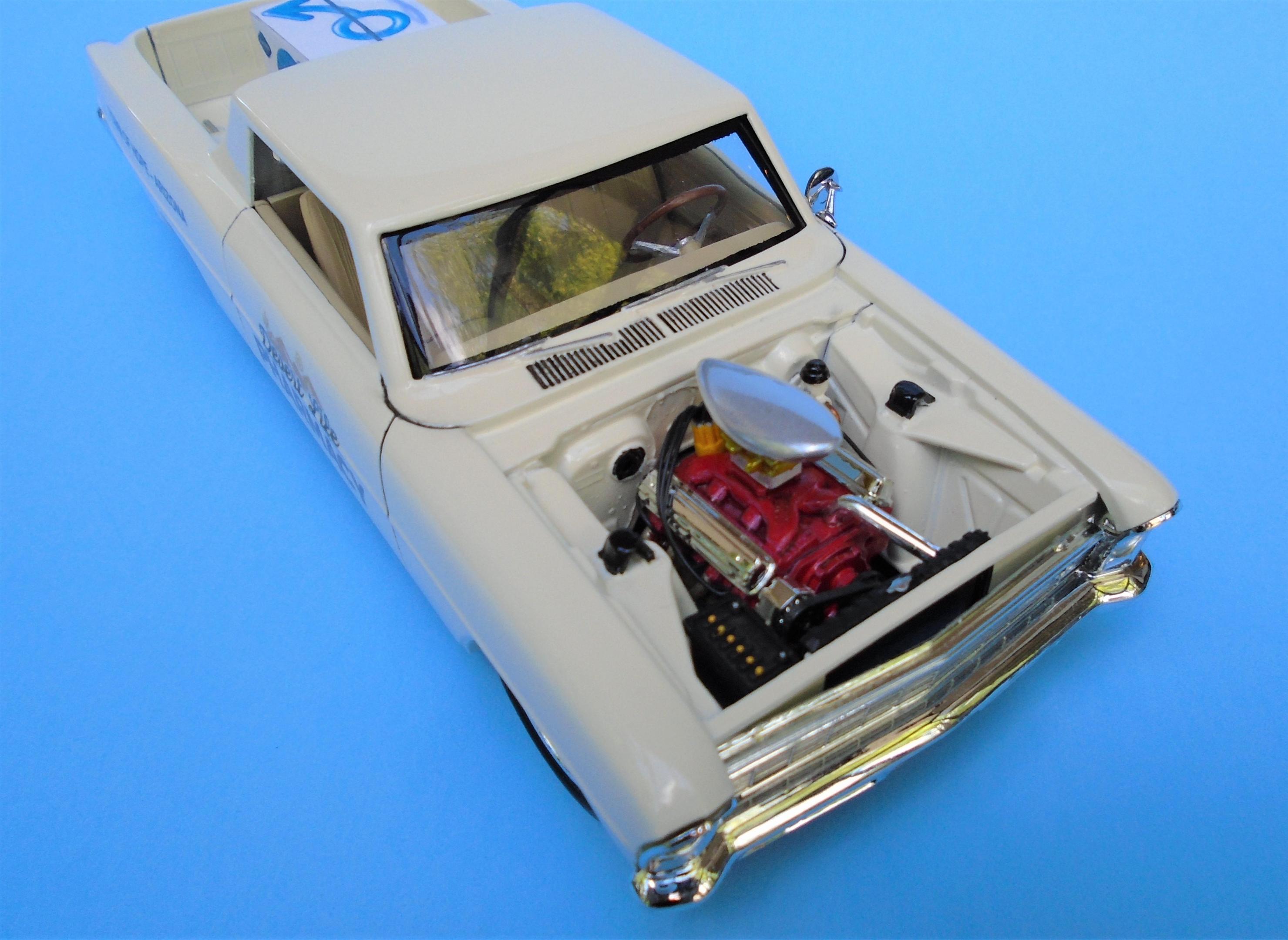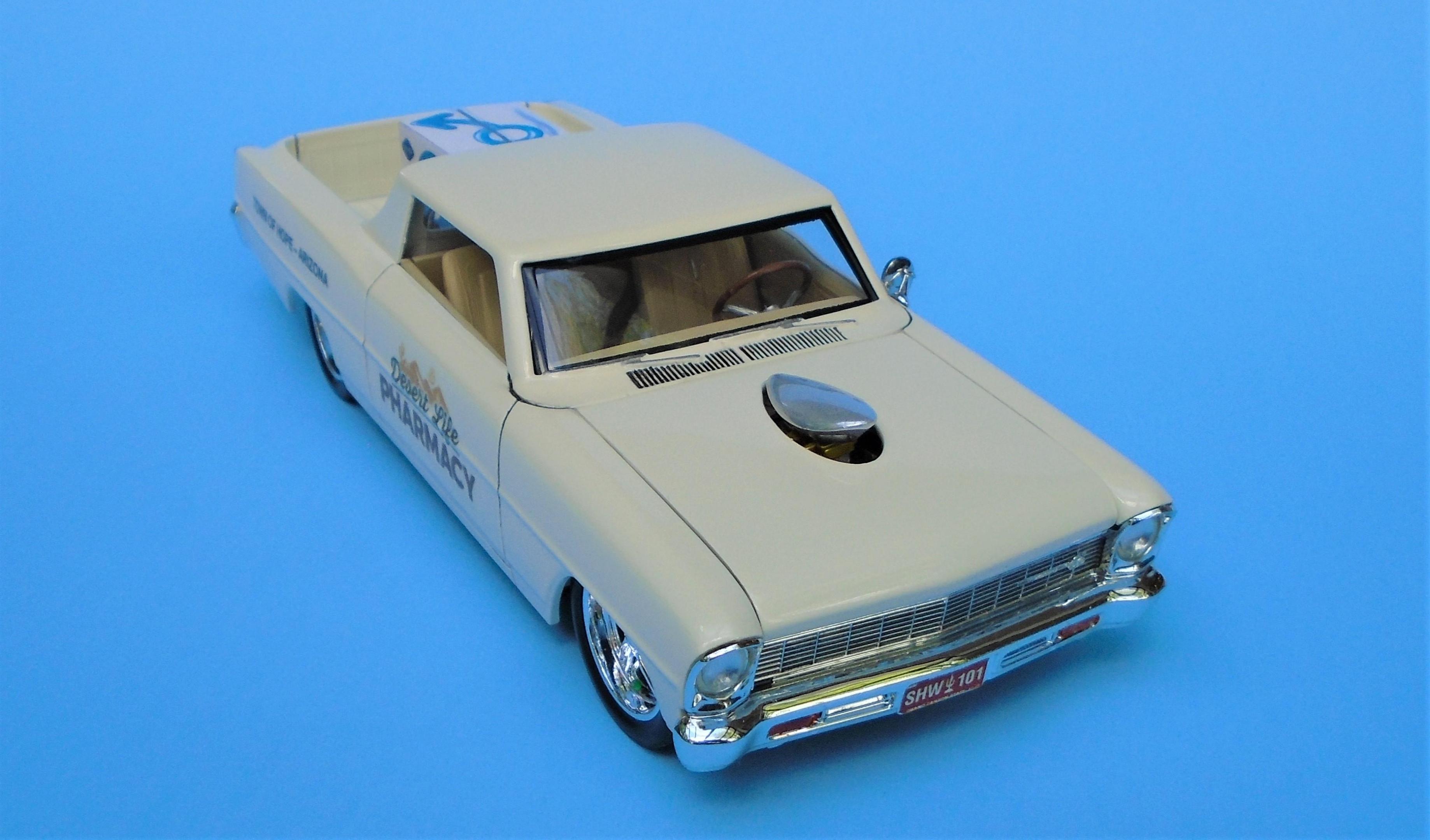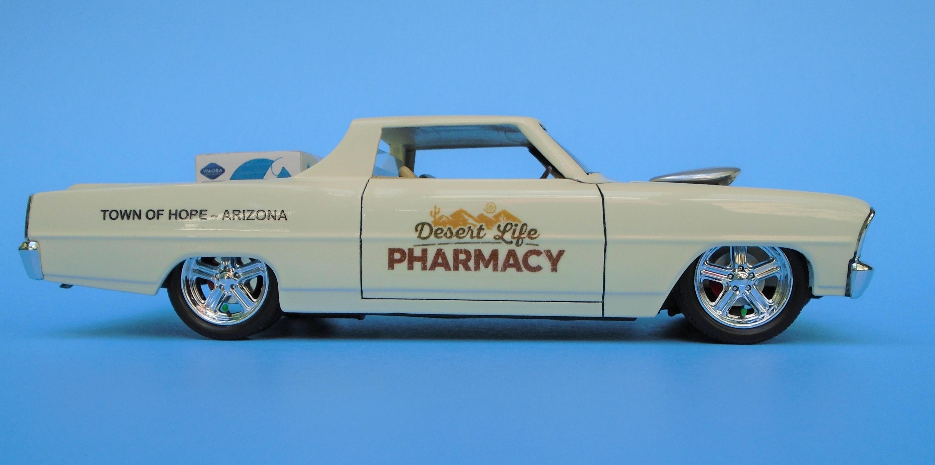Hi! I love Arizona! I visit as often as I can. I've noticed a great deal of "mature gentlemen", even more so in the winter months (the dreaded snow birds!). One day, I drove trough a town called Hope, and it gave me an idea... What about a convenient medicine delivery "ute" with the livery of the local pharmacy? On to the web, searching for actual phramacy logos. And voilĂ ! AMT's 66 Nova, mashed with the bed of the 61 Ranchero. Chopped top, fabricated B pillar & tailgate, scooped hood with Altered states air intake, wood pallet made of coffee sticks, with a crate of the blue pills. Home made decals. Tamya's racing white + Wet Look clear. Rolling stock from Revell's 70 Cuda. Life is short, might as well have fun with... styrene! What were you thinking? CT