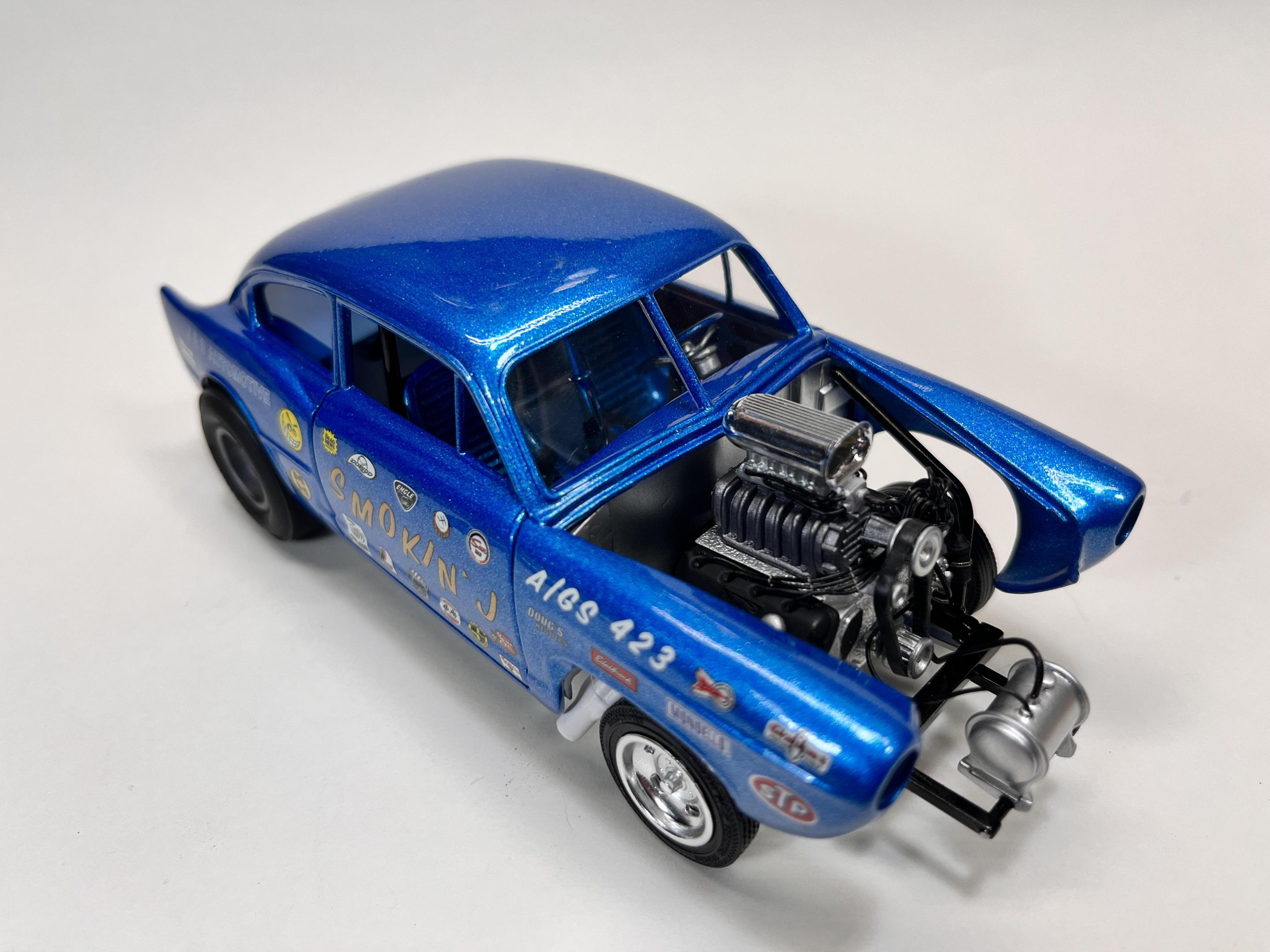 The venerable Revell Henry J kit we (some of us old timers anyway) all know and love from our childhoods. Doors welded shut and fenders attached to the body. Rear wheel wells tubbed. Cammer from the parts box. Other bits and pieces from here and there. Paint is Testors Extreme Icy Blue. -RRR