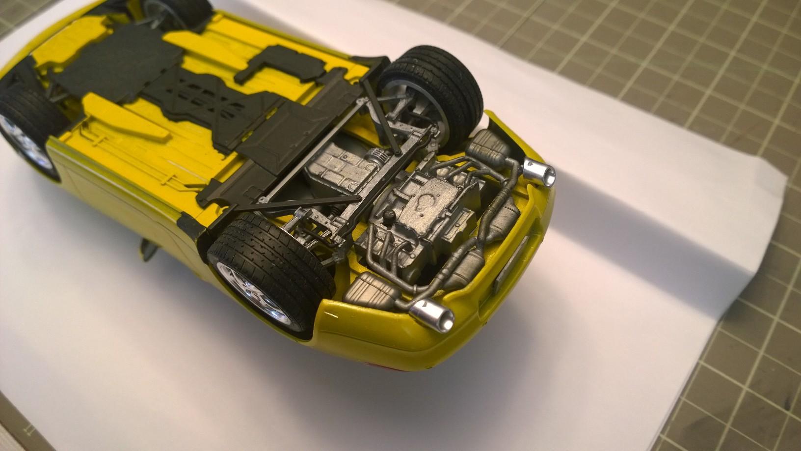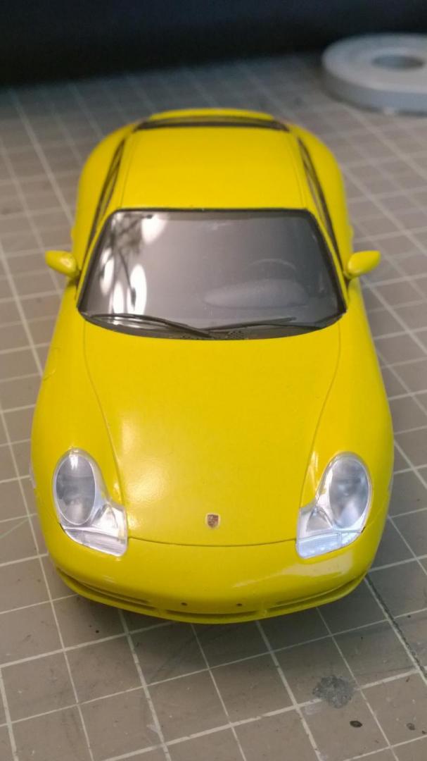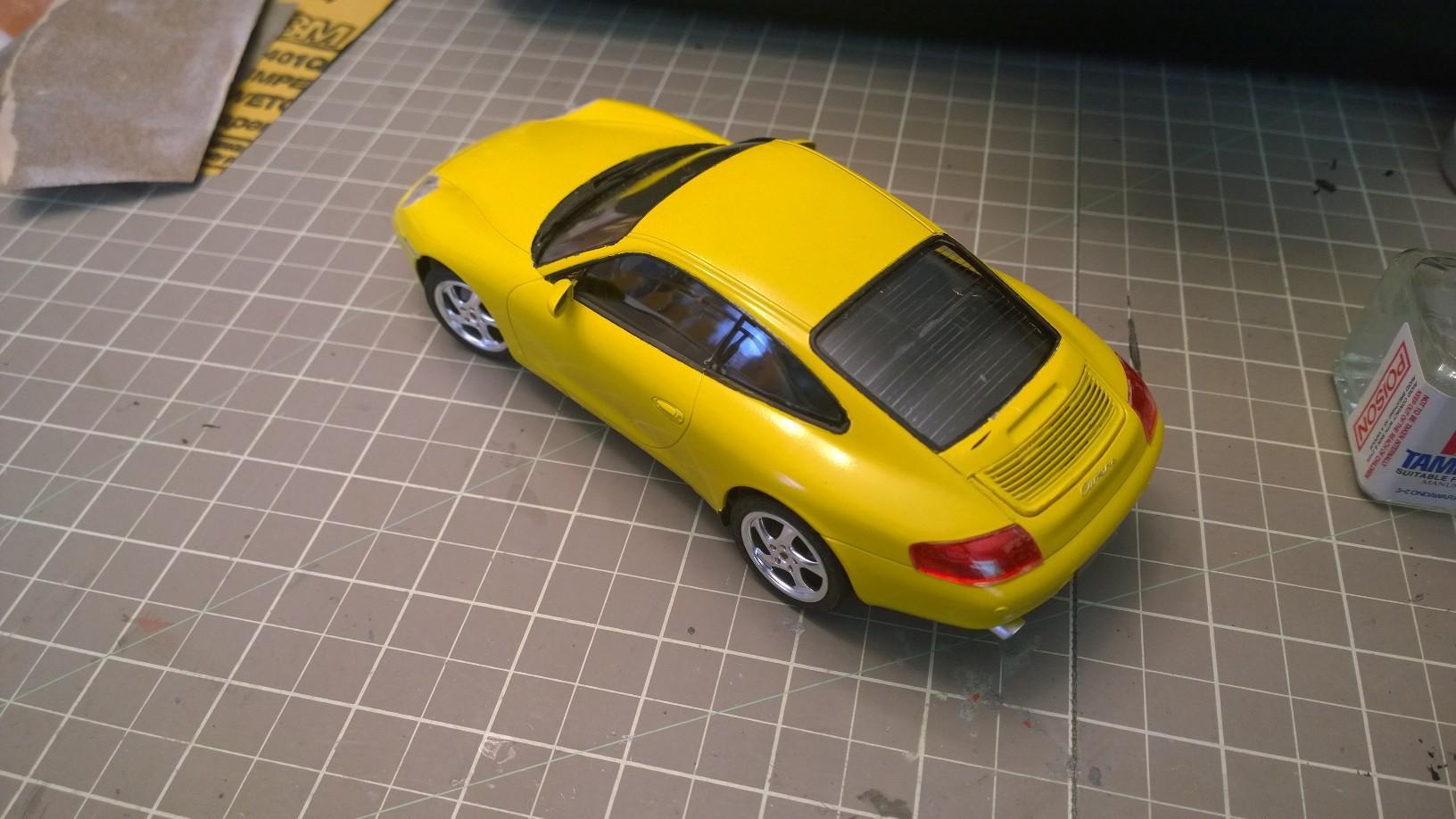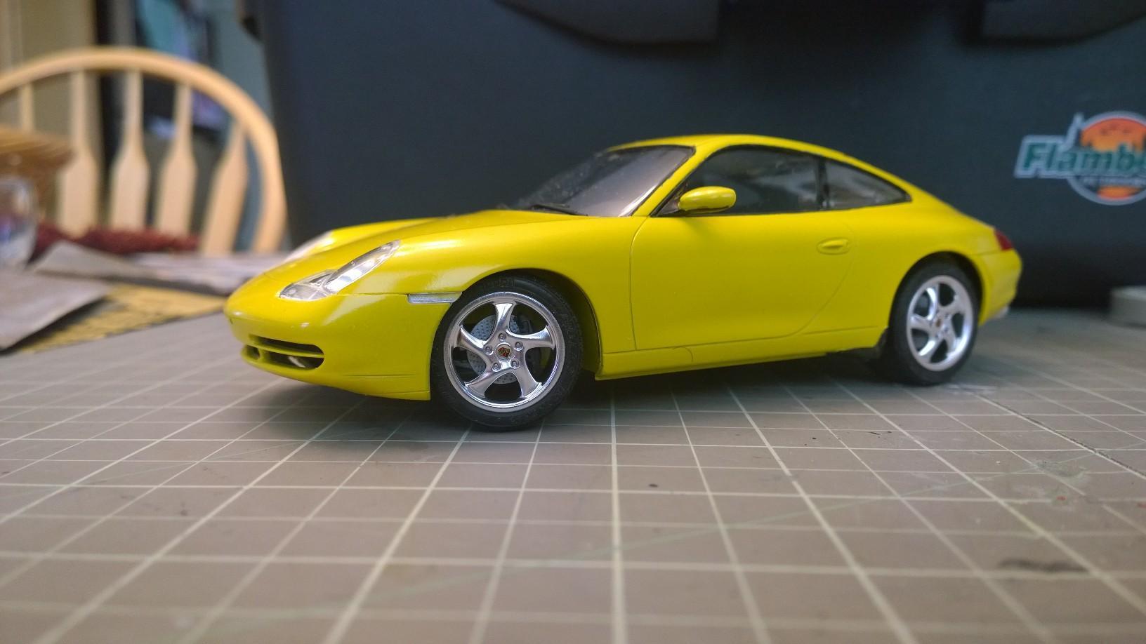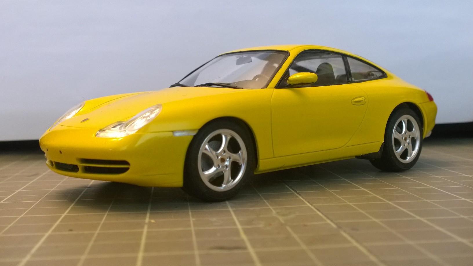 Finally finished this one. It's the Tamiya kit and I bought it about 5 years ago for $5 on Ebay. Body parts had been partially glued together, but no painting done on it. Luckily, after I got it stripped (without breaking anything) I discovered that everything was there. Yellow isn't my fav Porsche colour, but I went with a combo near and dear to my heart. I spend many years working for the local Porsche dealership. After I transferred to sales, the first factory order I took was a 2000 Porsche 996 coupe. Speed Yellow with black leather, 18" chrome Turbo alloys, sport exhaust, manual transmission, navigation, sunroof delete. When the car arrived, all orange reflectors were replaced with clear pieces. So this is my version of that car. The holes in the front bumper are intentional. In my province, we don't require front plates, so the when the new cars arrive, they arrive with two holes in the front bumper for mounting the plate holder. I think I did a decent job on the interior, but I'm not happy with my paint. The black trim bugs me. Having said that, I'm comfortable enough with it to call it done. As for photography, I think I need to start wiping everything with microfibre cloths or something, as there's dust all over this thing that wasn't visible when I was taking pics. Anyway, there it is.