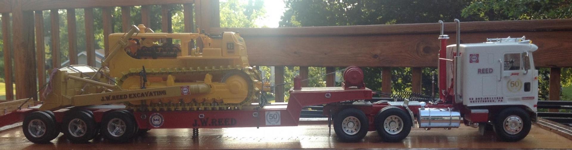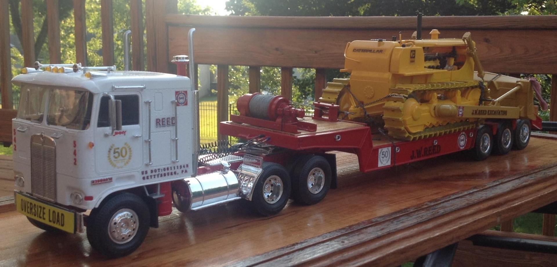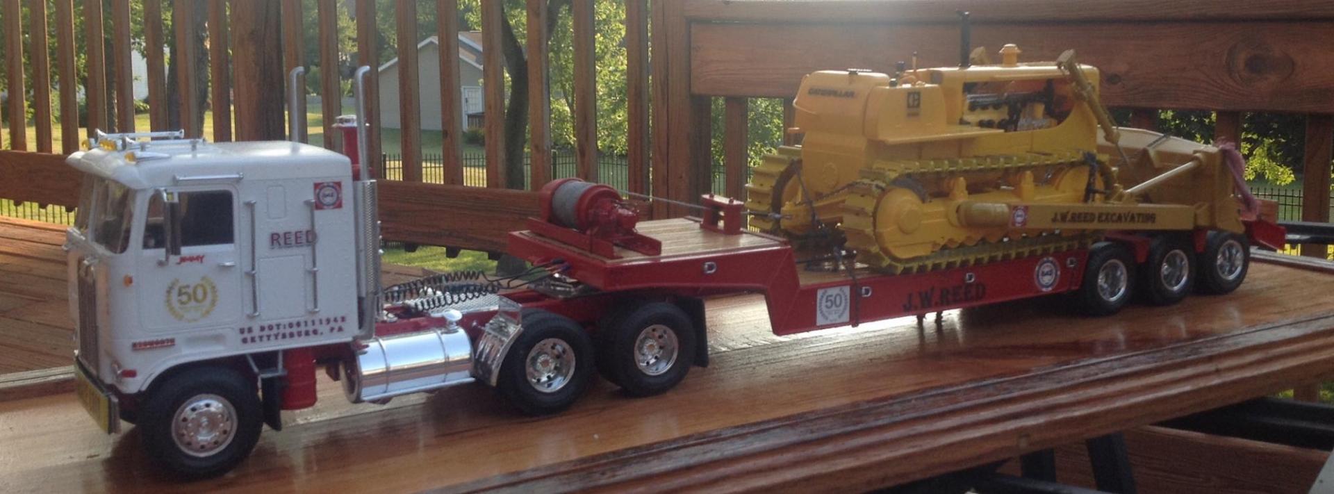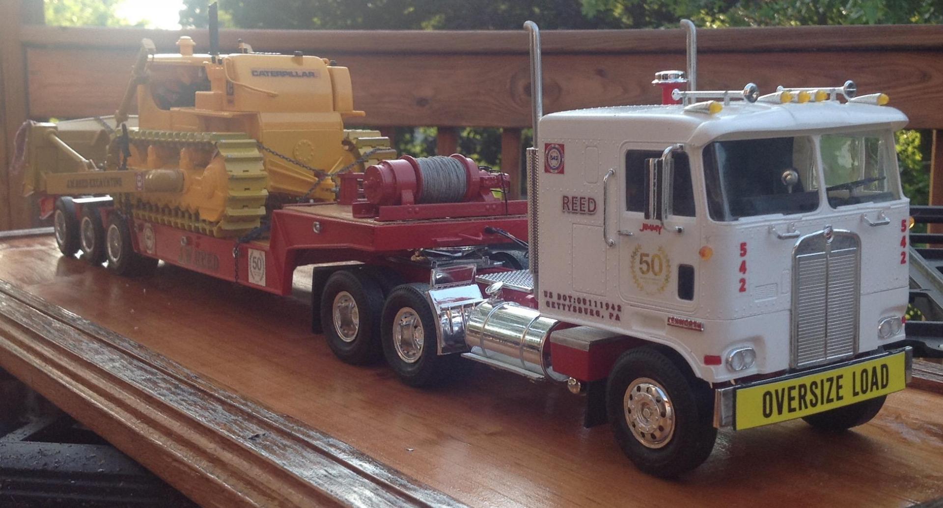 Hello all I'd like to start by saying these trucks are very challenging, I am hoping by the time I have built 6 of either one I will be completely satisfied with them. As for moluminum the Tulsa winch is amazing, very well done, the chain binders are excellent, I wish I had thought to modify them prior to installing them, I believe if you could make these out of metal there would be some advantages, I used 8.5 links per inch chain which I am happy with, but the binders didn't quite bite well enough and I got to thinking if these were metal I would have been able to adjust the hooks and the binder would remain reusable, thinking that the g-scale community would probably beat your doors down, just a thought. I am posting these trucks here because I can think of no better way to thank the members of this site for the help, every issue, stumble, hurdle you guys just had the answers, I almost wish you had been here to remind me to read and understand all steps of the instructions, to stopping me from being blinded by the step/decal debacle on the Kenworth to sending both cabs off to clear coat without painting the windshield gaskets, hind site I suppose, thank you a million thank yous. I do apologize for the pictures, my little buddy, painter, photographer went on vacation just prior to the completion of the Kenworth and has of yet to see the Peterbilt. As for Jim his sacrifice, dedication and support for our family is unprecedented, I can think of no better husband, father, grandfather, father in law or friend. Thank you all for pulling me through this.