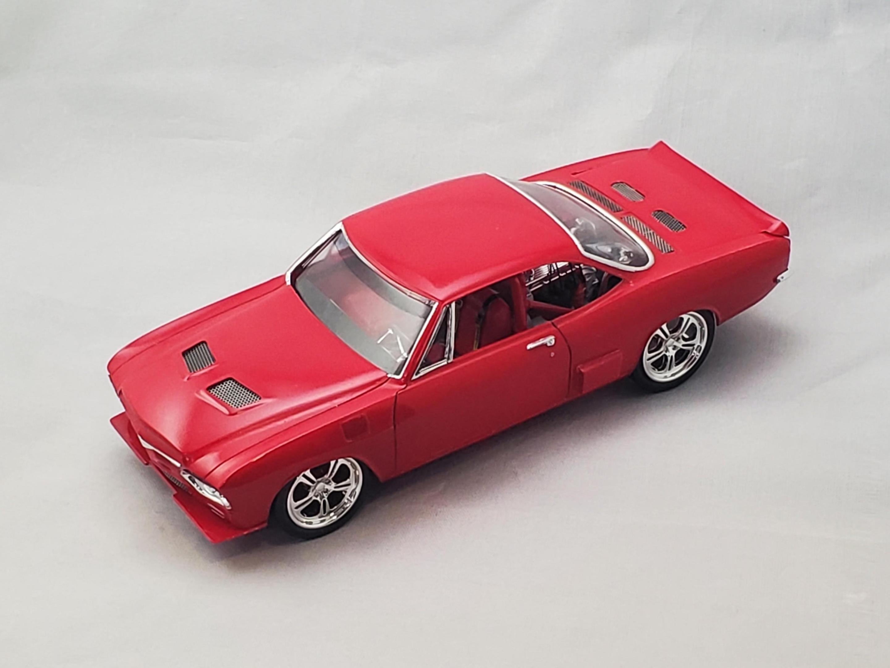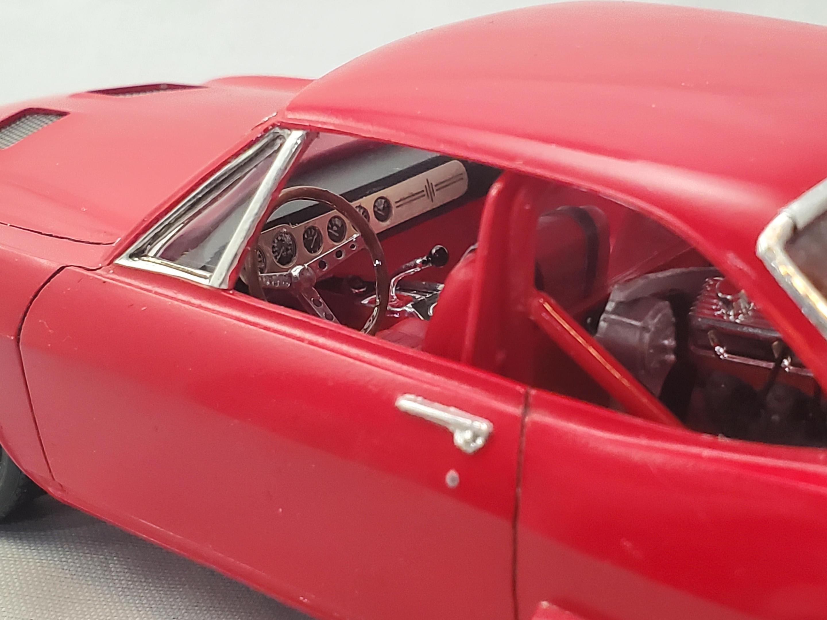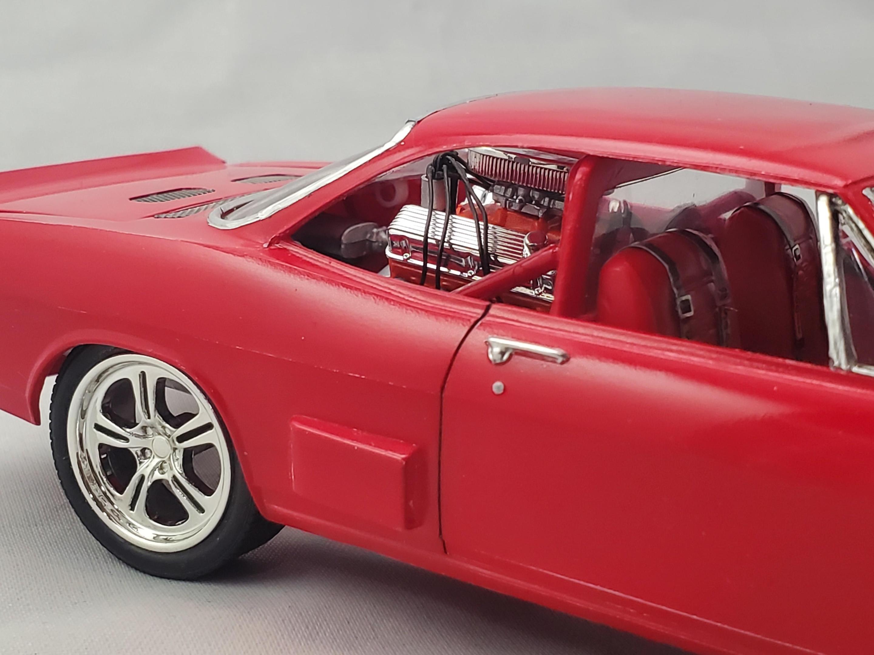 Hello All, after seeing "Rare Vair" at SEMA 2021 (pictured below), I was inspired to try my own rendition in 1:24 scale. Details on my build are under the same title as this thread in the WIP section. In summary though, I began with an AMT Chezoom, threw in some parts from an AMT '69 Corvair, added drivetrain and suspension from a Revell Foose '65 Impala, a few bits from a Revell '29 Model A Roadster, and the hood from a Revell '08 Shelby GT500. (Since our member Claude Thibodeau has nicknamed me "Dr. Frankenstein" for mashing parts together from different kits, I wanted to live up to the moniker! ) What you see below is the results of my efforts, which I have named "Unsafe At Any Speed" as an aspersion to the hack who wrote the book by the same name. These are what I call the "beauty shots": Paint was the ubiquitous Tamiya TS-8 red, TS-14 black, and TS-13 clear. For the first time, I tried my hand at sanding and polishing the paint to reduce orange peel (having some level of success). I also tried BMF in the form of Scotch 3M foil tape 3311, which I found at the auto store. Being slightly thicker than commercial BMF, I found it easier to work with my tired and clumsy hands. The grille work came in the form of Detail Master DM-2590 honeycomb grill #1. Finally, I gave it a go with wiring the engine and the use of Tamiya Panel Line Accent for the shut lines. Below are more detail photos of how it came out: Overall, I am thrilled with how this model came out, and it is easily the most complex build I have ever done. Enjoying the company of the members of this forum has spurred me on to improve my skills with each build. In this case, I am particularly happy with how the drivetrain came out, as well as the interior, and hood. I am least happy with my painting skills, the fact that I forgot to put disc brakes in before permanently gluing the wheels in place, and the devil's creation known as BMF! For those interested in more pictures of Rare Vair, how this build came together, or the pluses and minuses of the AMT Chezoom kit from my perspective, check out the WIP thread. And finally, I have to send a shout out to Misha Koslovsky whose version of Chezoom inspired me, and which I look eagerly forward to seeing completed.