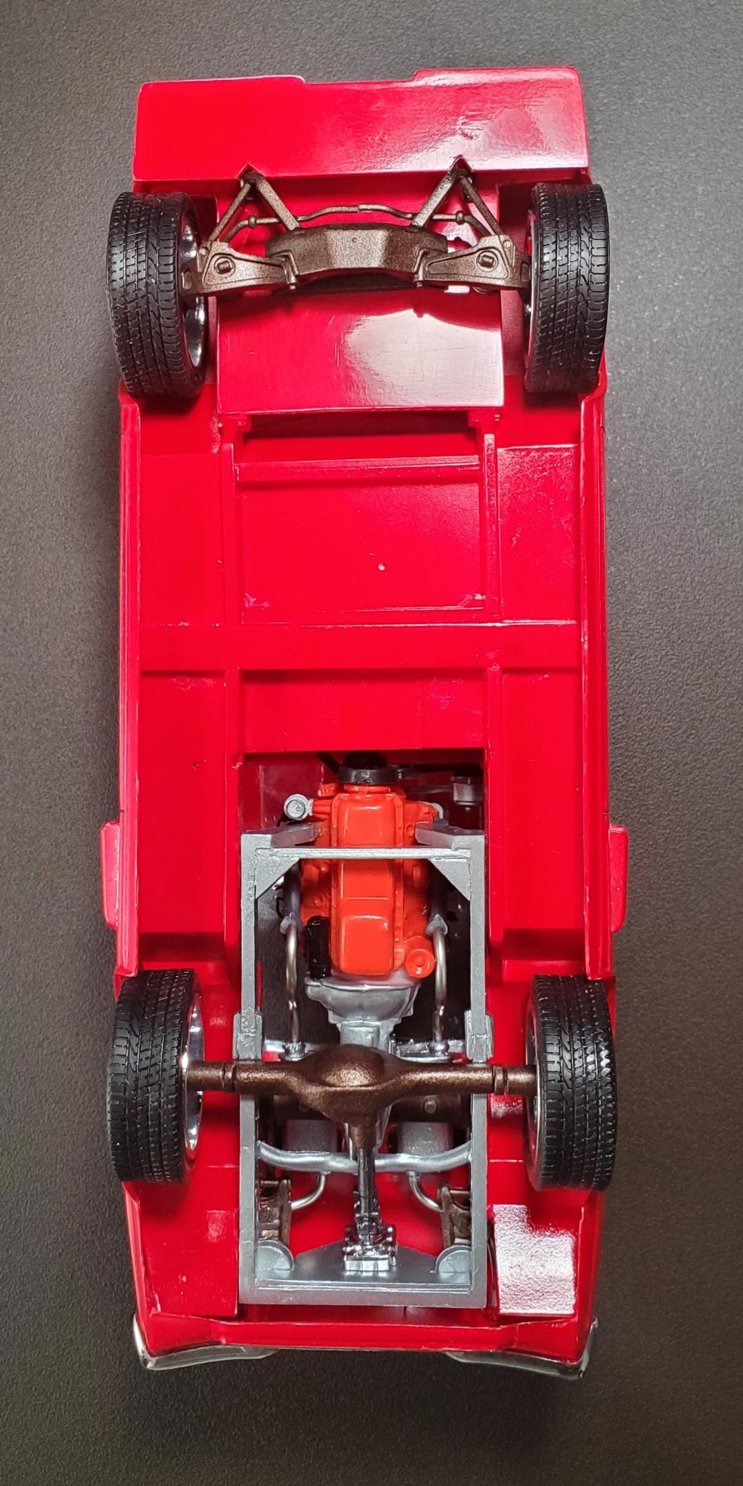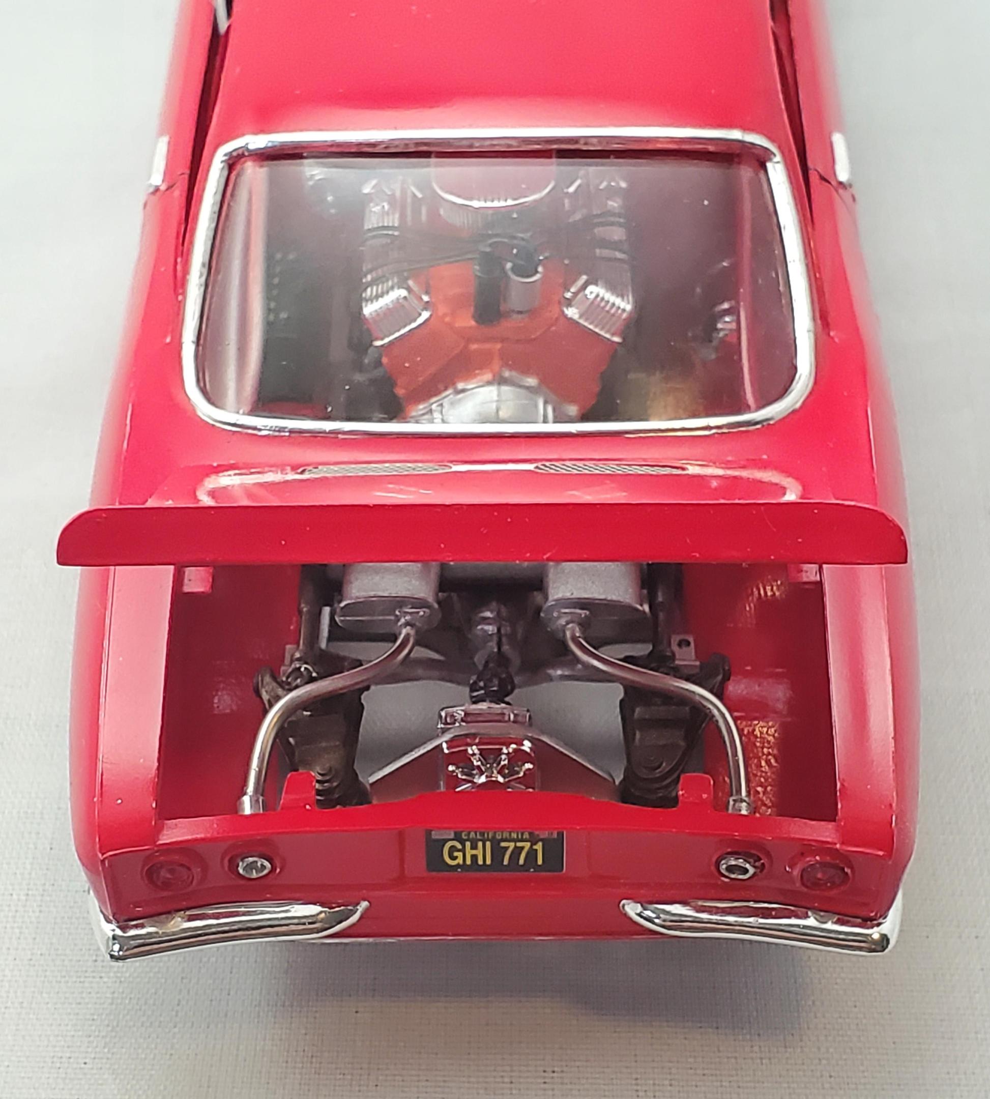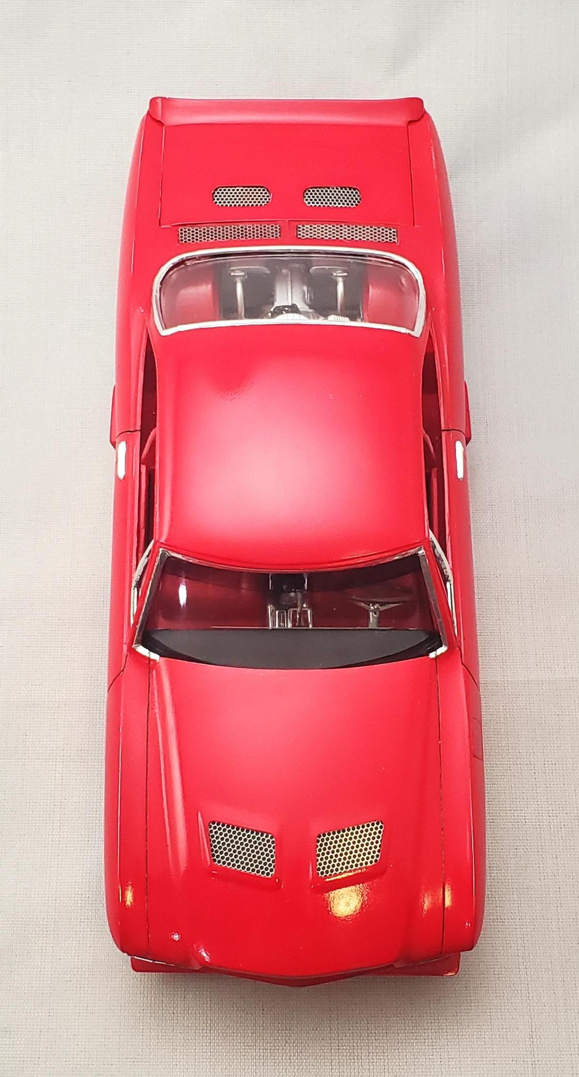 Hello All, after seeing "Rare Vair" at SEMA 2021 (pictured below), I was inspired to try my own rendition in 1:24 scale. Details on my build are under the same title as this thread in the WIP section. In summary though, I began with an AMT Chezoom, threw in some parts from an AMT '69 Corvair, added drivetrain and suspension from a Revell Foose '65 Impala, a few bits from a Revell '29 Model A Roadster, and the hood from a Revell '08 Shelby GT500. (Since our member Claude Thibodeau has nicknamed me "Dr. Frankenstein" for mashing parts together from different kits, I wanted to live up to the moniker! ) What you see below is the results of my efforts, which I have named "Unsafe At Any Speed" as an aspersion to the hack who wrote the book by the same name. These are what I call the "beauty shots": Paint was the ubiquitous Tamiya TS-8 red, TS-14 black, and TS-13 clear. For the first time, I tried my hand at sanding and polishing the paint to reduce orange peel (having some level of success). I also tried BMF in the form of Scotch 3M foil tape 3311, which I found at the auto store. Being slightly thicker than commercial BMF, I found it easier to work with my tired and clumsy hands. The grille work came in the form of Detail Master DM-2590 honeycomb grill #1. Finally, I gave it a go with wiring the engine and the use of Tamiya Panel Line Accent for the shut lines. Below are more detail photos of how it came out: Overall, I am thrilled with how this model came out, and it is easily the most complex build I have ever done. Enjoying the company of the members of this forum has spurred me on to improve my skills with each build. In this case, I am particularly happy with how the drivetrain came out, as well as the interior, and hood. I am least happy with my painting skills, the fact that I forgot to put disc brakes in before permanently gluing the wheels in place, and the devil's creation known as BMF! For those interested in more pictures of Rare Vair, how this build came together, or the pluses and minuses of the AMT Chezoom kit from my perspective, check out the WIP thread. And finally, I have to send a shout out to Misha Koslovsky whose version of Chezoom inspired me, and which I look eagerly forward to seeing completed.