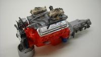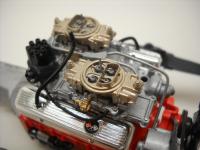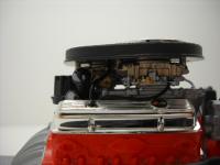 I'm kind of surprised I'm the first one to start a thread with the new Foose kit, but I won't be doing the Foose version anyway, so I guess it doesn't really matter. This is just going to be a stock Z/28 (well, about as stock as a 302 Cross Ram can be, anyway). The long-term plan for the car is metallic blue (I'll be using Duplicolor Perfect Match Medium Quasar) with white Z/28 stripes which I'll have to mask and paint myself (wish me luck!). Interior is going to be black and white with houndstooth upholstry. Recommendations on ink-jet-printer-compatible decal paper would be appreciated. I've been working on this kit for just over two weeks now, starting on the day it came in the mail, and the engine is just about finished. I'm looking forward to getting the ignition wires in there, but I can't do that until after the headers are installed, but they aren't painted yet. It took a while to get just the right Chevrolet engine red/orange color, but I think I nailed it. I used a bottle of Model Master Chevrolet engine red and added a fair amount of yellow to it until it became the ideal shade. As I've done on my last few builds, I cut the belt assembly apart and made the belt out of masking tape. I also spent a good deal of time filing the grooves into the belts, but once the belt is on there, you can't really tell. Oh well. I have had a blast building this engine and I just love how big it is! I'm adding details I never would have attempted with a 1/24 kit. Hoses and fuel lines and such are just bits of spare wire from around the house, mainly telephone wire Shifting linkage was kind of fun. The kit piece was pretty sloppy, so just cut it apart and made my own. I spent all last night working on the air cleaner. I wrapped masking tape around the foam seal to give it texture. I drilled through the wing nuts on the air cleaner and added the posts to the carbs for added realism so I can proudly display it with the air cleaner off. It took me forever, looking at tons of reference photos, to figure out where that hose that comes out of the right rocker cover goes, but I finally realized that it goes into the air cleaner, so I drilled the appropriate hole into the air cleaner base. That's it for now, let me know what you think! I don't know when my next update will be, but that depends on if it gets warm enough in the garage to spray paint any time soon.