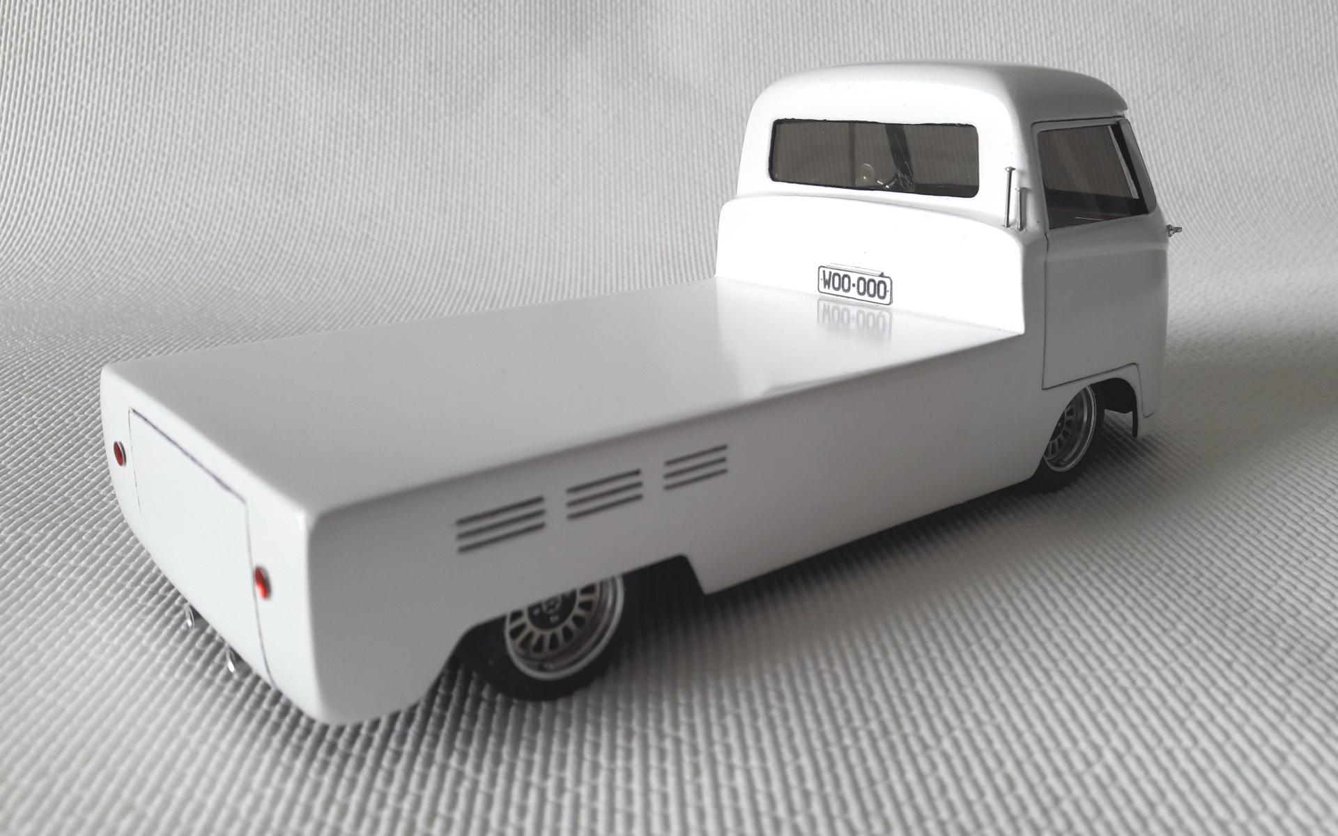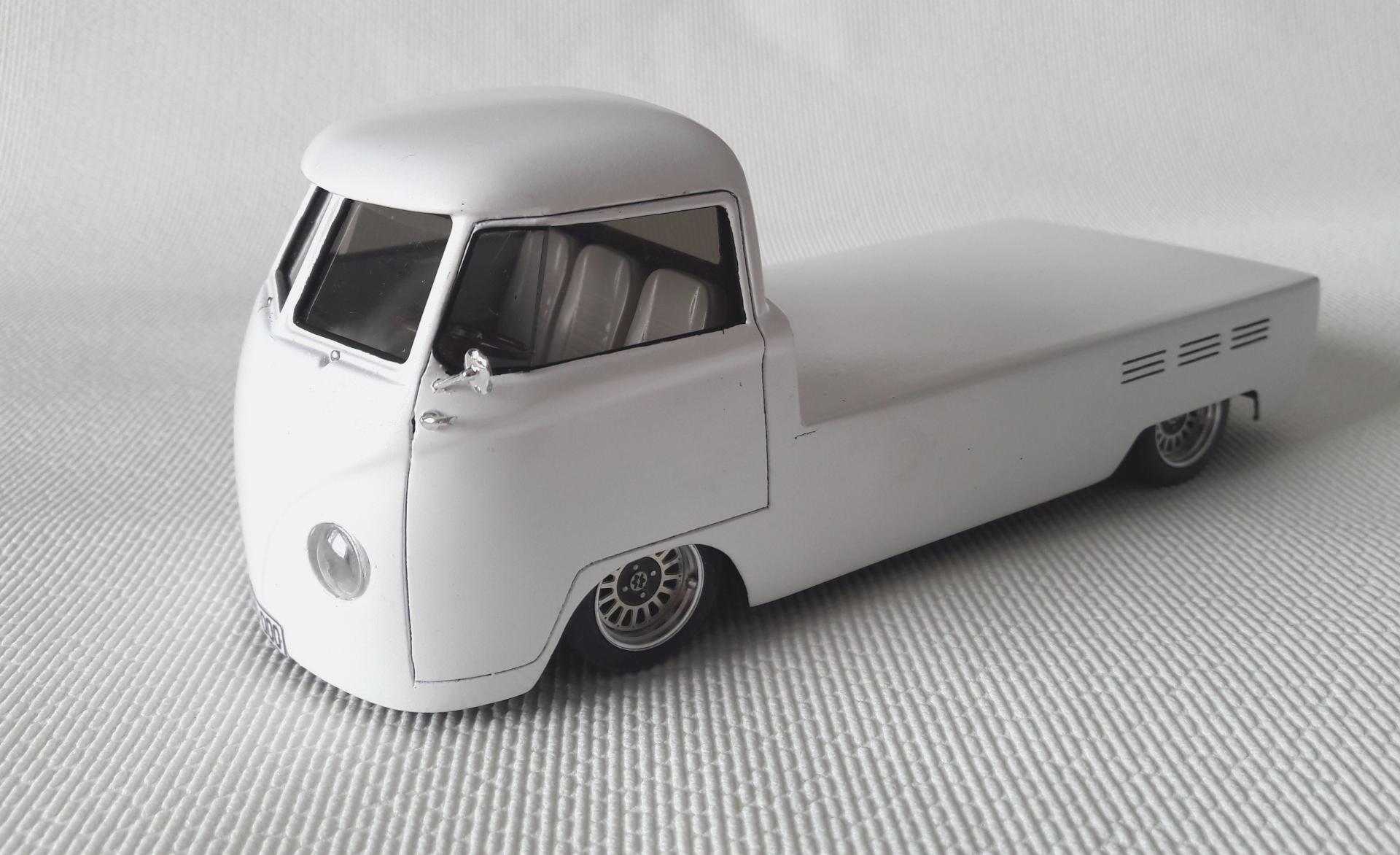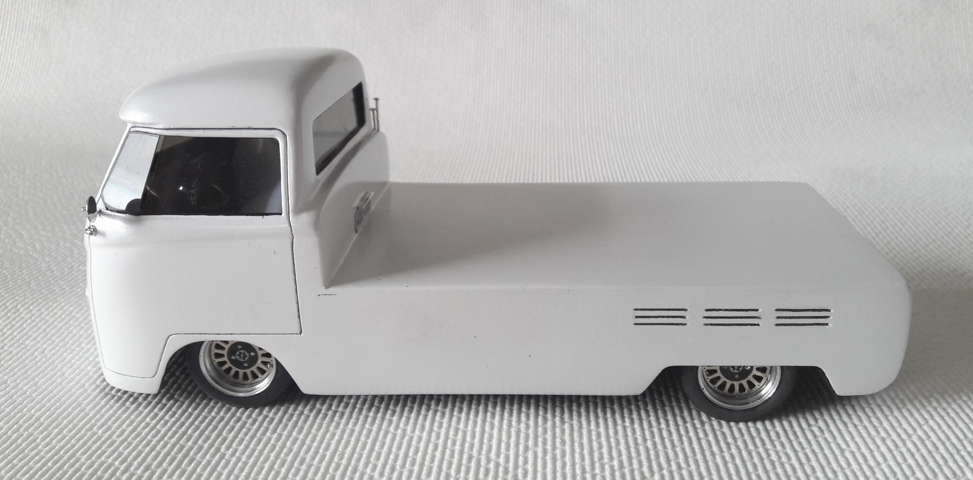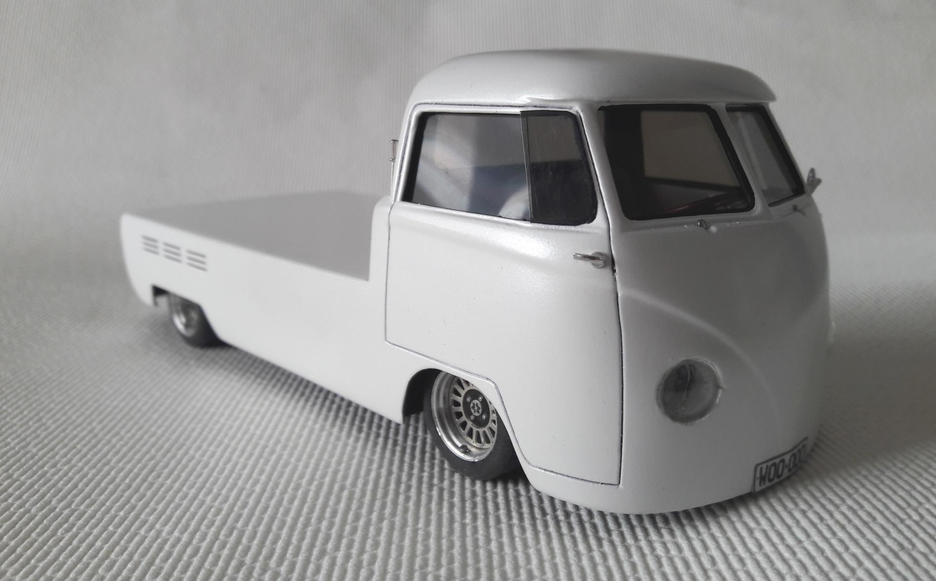 Hello! So this one is a ´67 VW Pick - Up ( or pritchenwagen in Deutsch ) kit from Hasegawa. I decided to sand away any excess detail from it and to give it a typical 90´s custom show car look; clean appearance with semi gloss pearl white paint and modern wheels.. Those 13" BBS wheels and tyres came from Scaleproduction, paint is from Tamiya and seats are resin Volvo P1800 units from Air - Trax. Finnish custom ordered licence plates. glass is made from Raboesch smoke tinted PVC- sheet. pics: