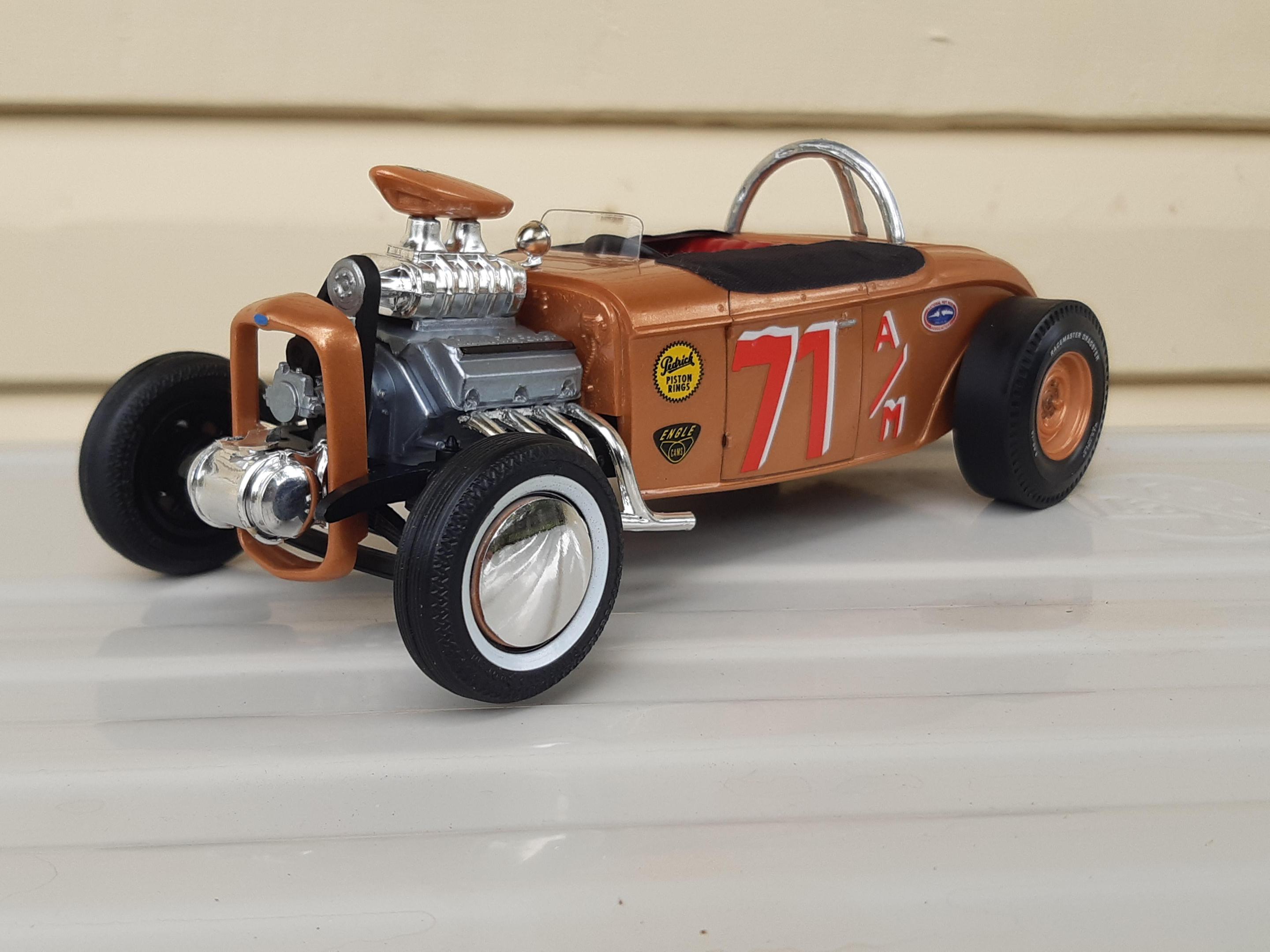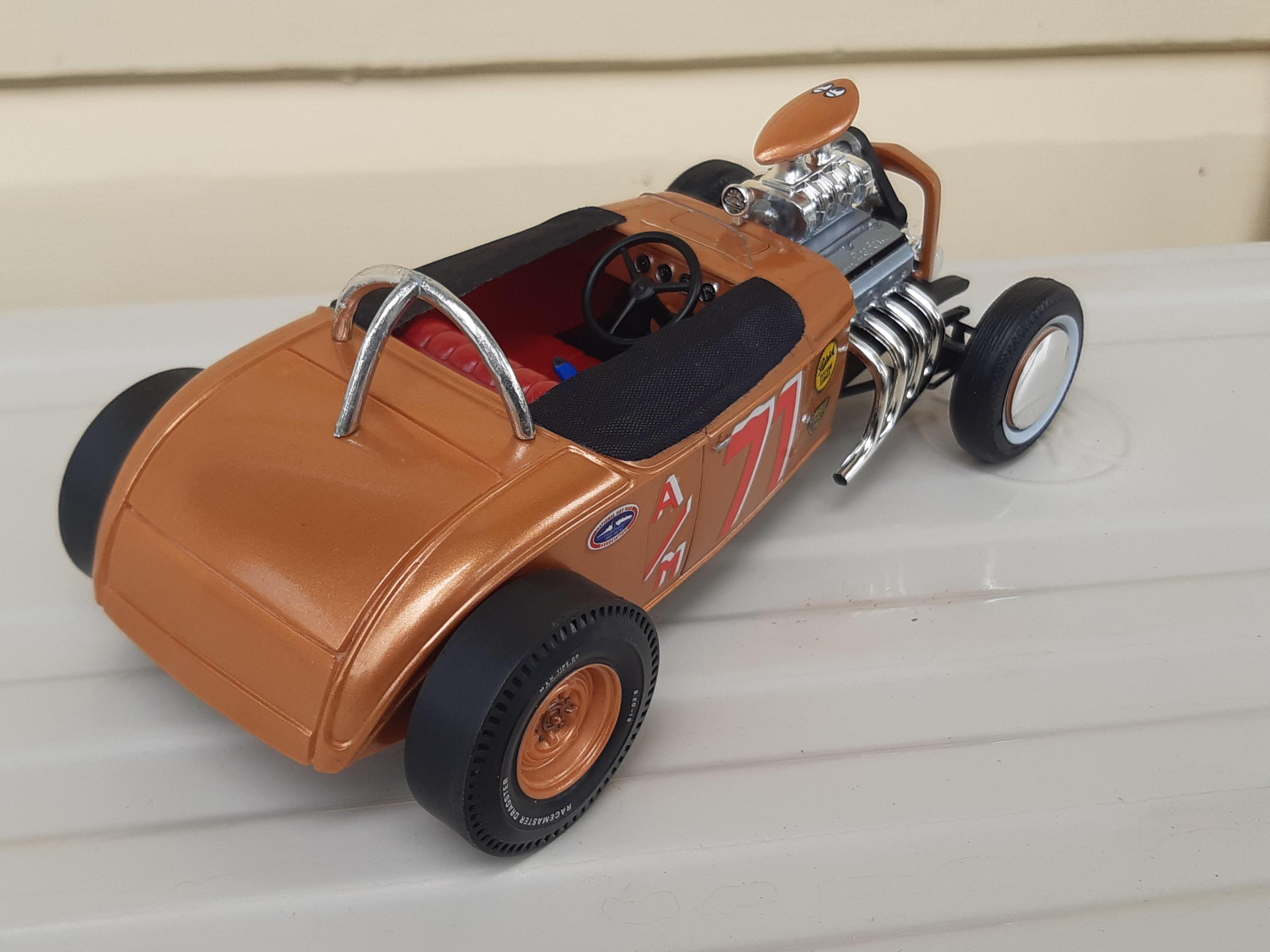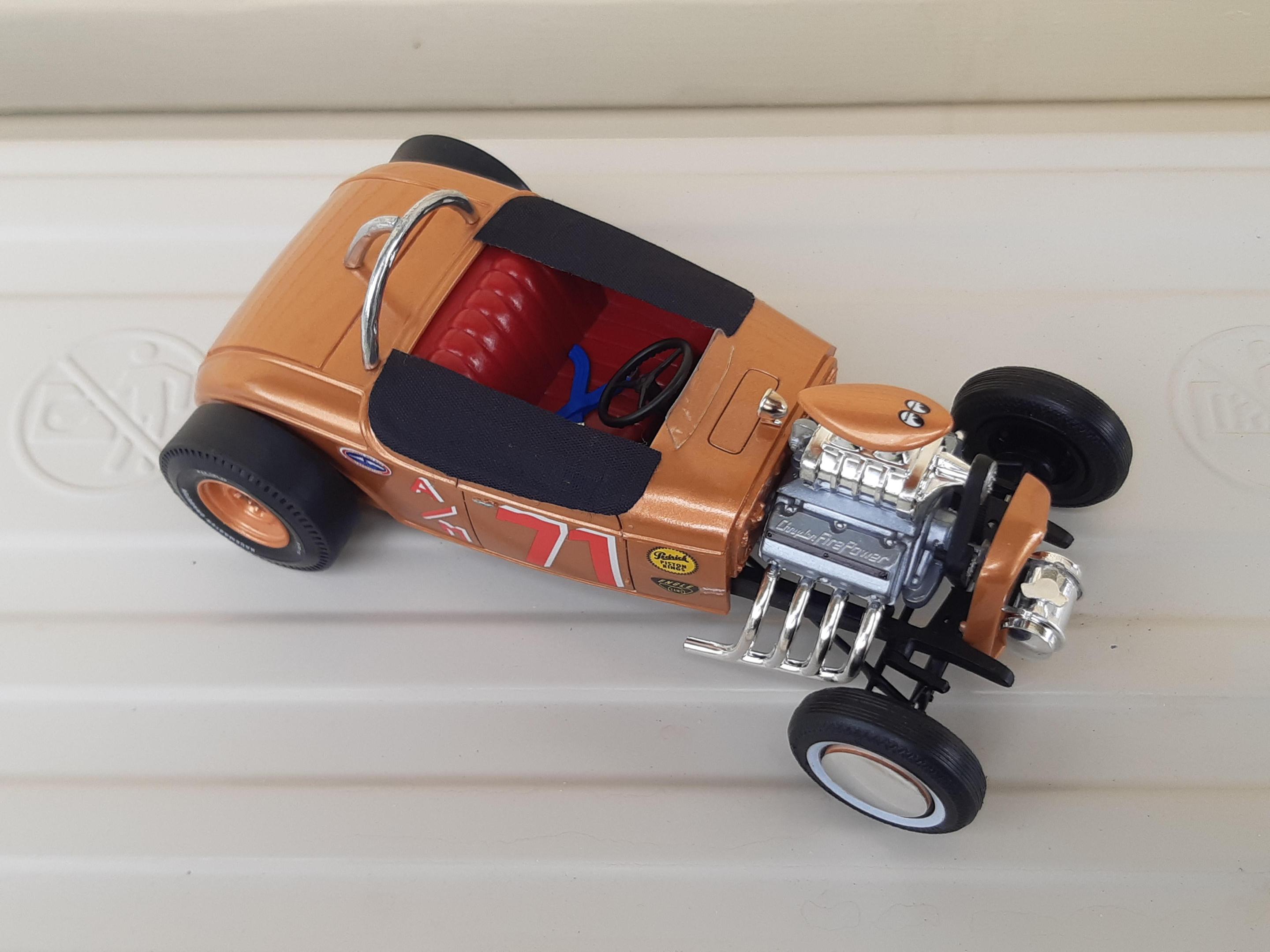 I had a couple of different 90s issues of this kit and there were some unidentified odd extra parts including a centre steering instrument panel and a small windscreen. Thanks to the wonderful Drastic Plastics website (link below) I was able to find out their origin: old Trophy Series issues. The Lindberg 32 Hot Rod kit had the required decals so I managed to produce a combination of two Trophy kits. The windscreen was unusable so used it for a pattern cut from acetate. Unfortunately the canvas 'cockpit' cover wasn't there so I made a pair from umbrella nylon. Anything else required came from the spares box. Anyway, pretty happy with the result. Let me know what you think. Drastic Plastics link: https://public.fotki.com/drasticplasticsmcc/mkiba-build-under-c/