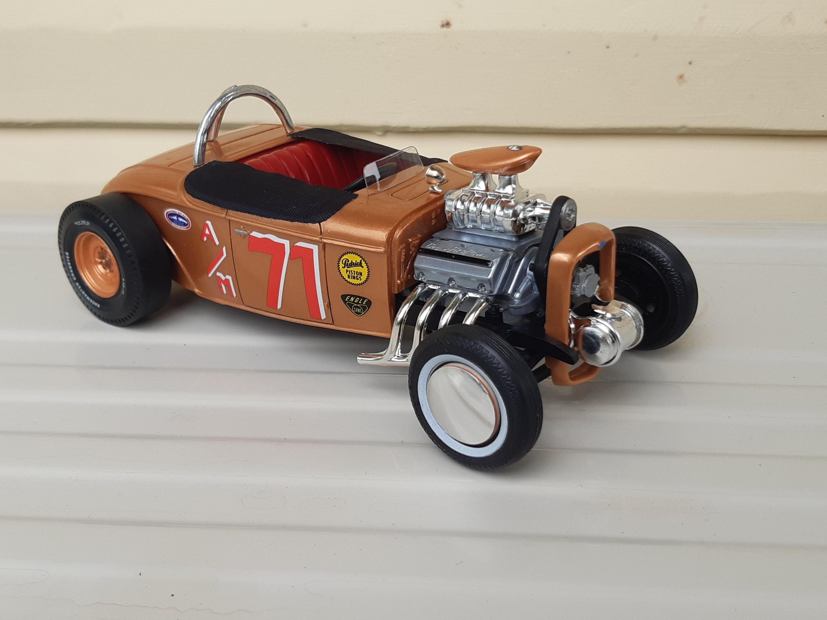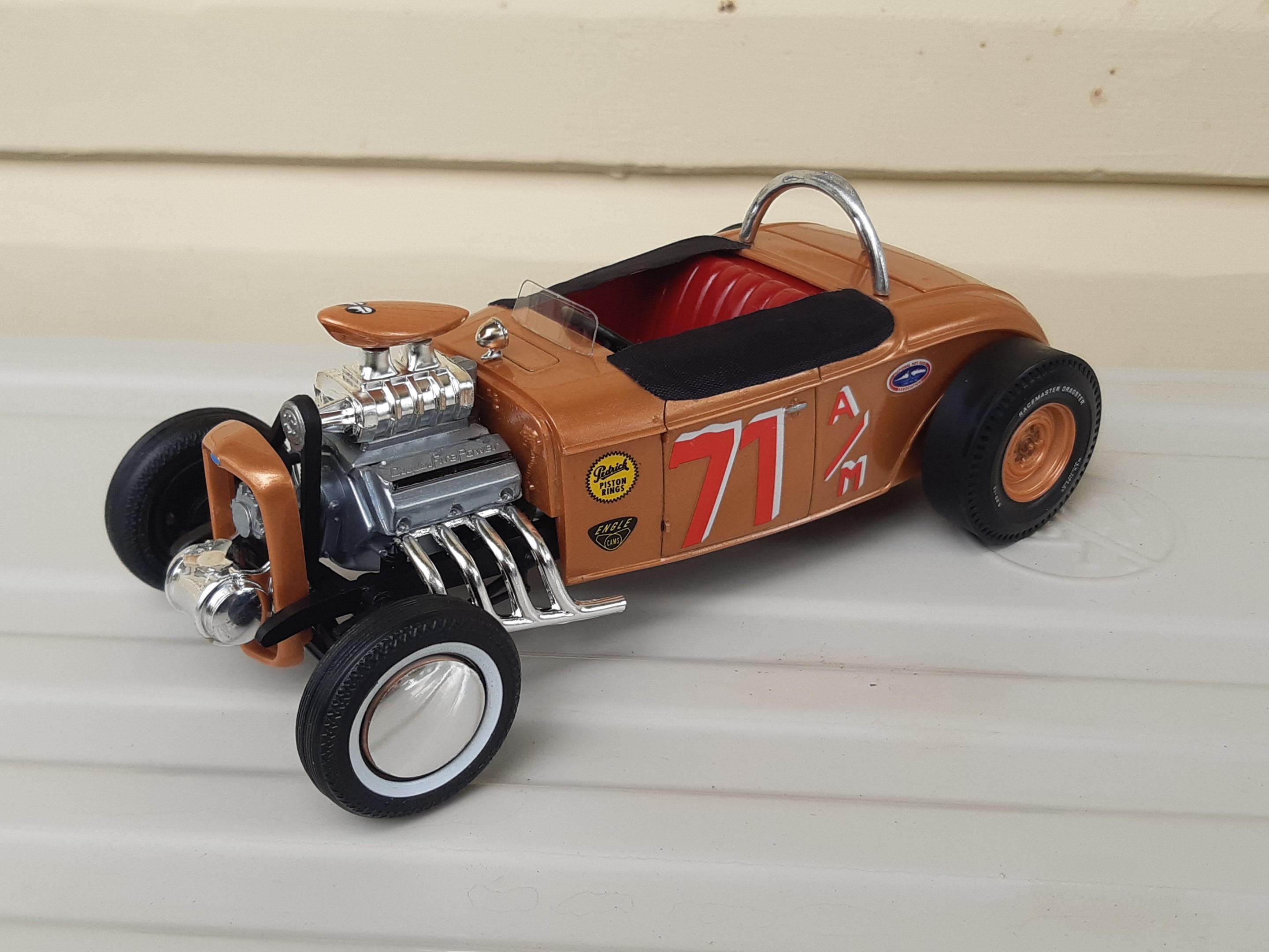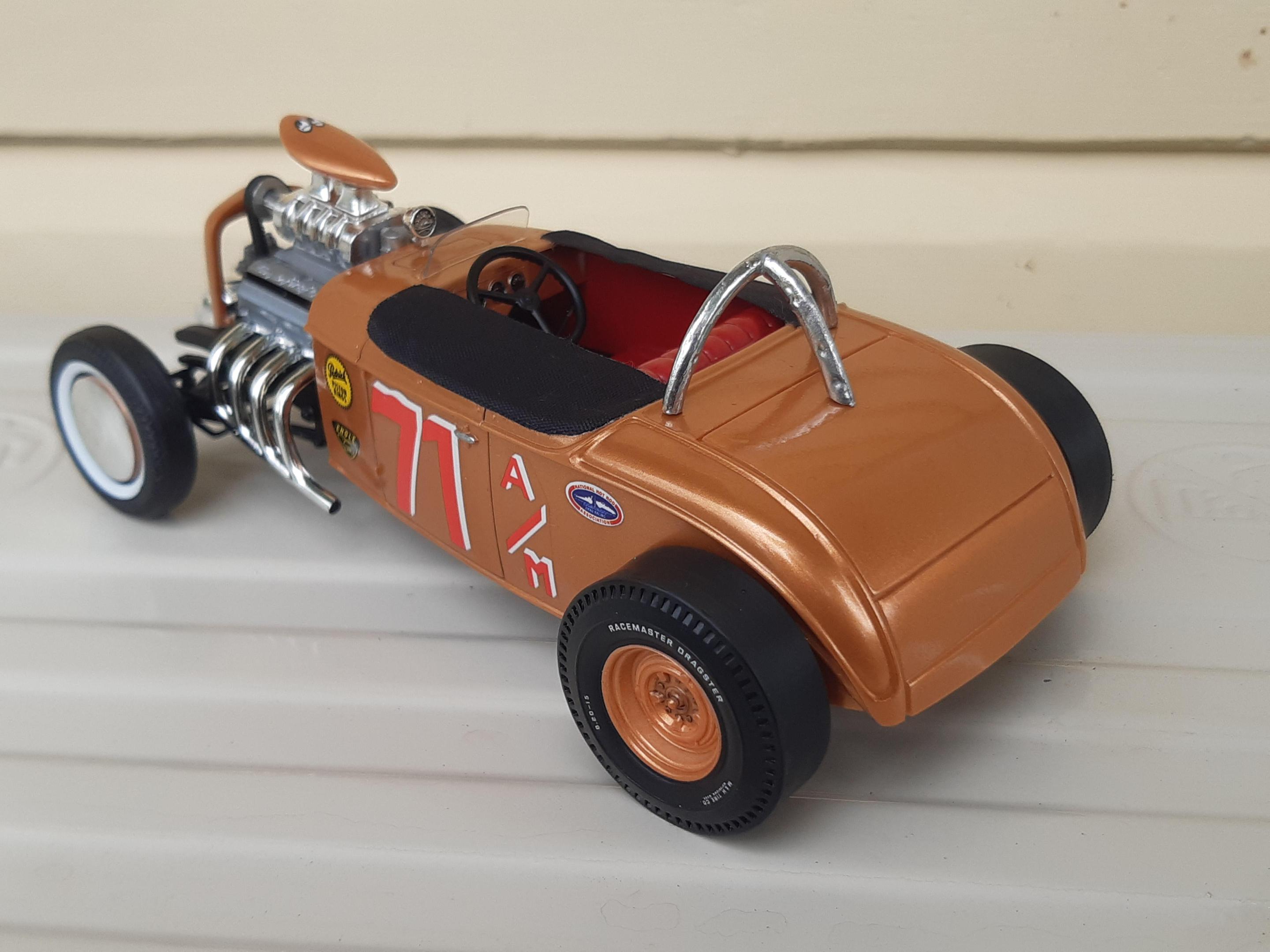 I had a couple of different 90s issues of this kit and there were some unidentified odd extra parts including a centre steering instrument panel and a small windscreen. Thanks to the wonderful Drastic Plastics website (link below) I was able to find out their origin: old Trophy Series issues. The Lindberg 32 Hot Rod kit had the required decals so I managed to produce a combination of two Trophy kits. The windscreen was unusable so used it for a pattern cut from acetate. Unfortunately the canvas 'cockpit' cover wasn't there so I made a pair from umbrella nylon. Anything else required came from the spares box. Anyway, pretty happy with the result. Let me know what you think. Drastic Plastics link: https://public.fotki.com/drasticplasticsmcc/mkiba-build-under-c/