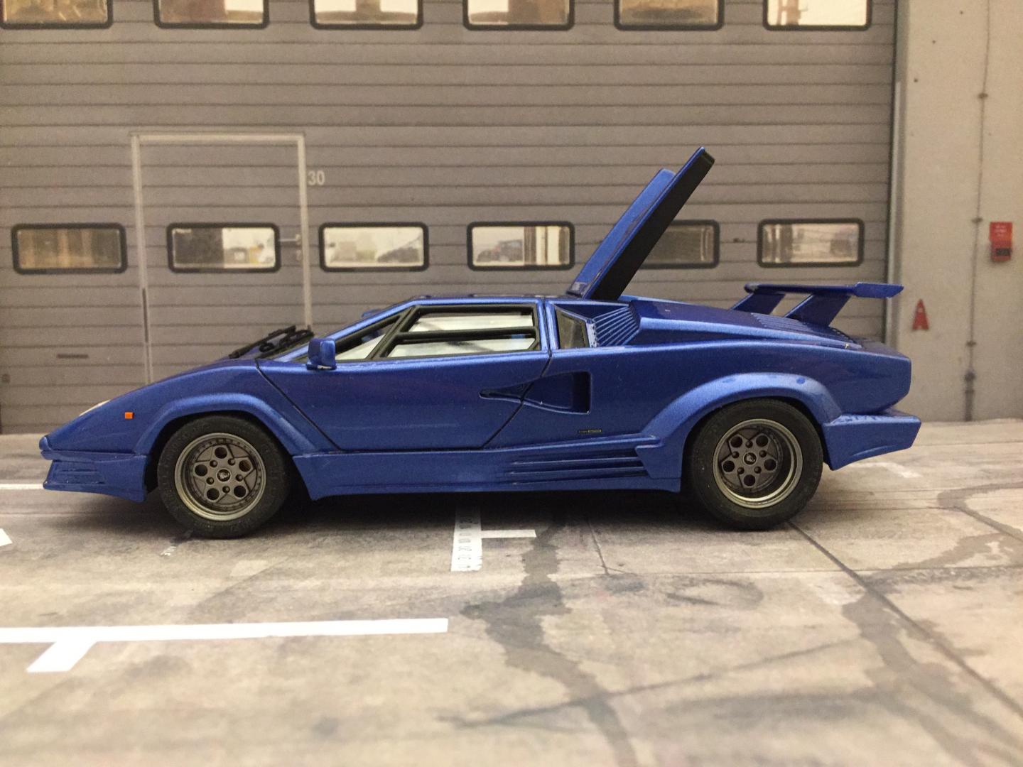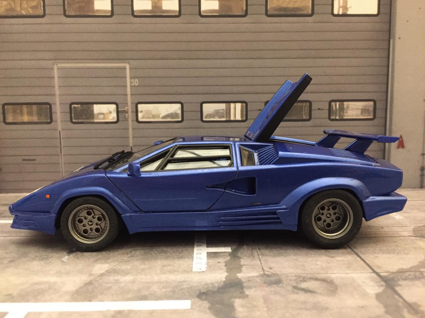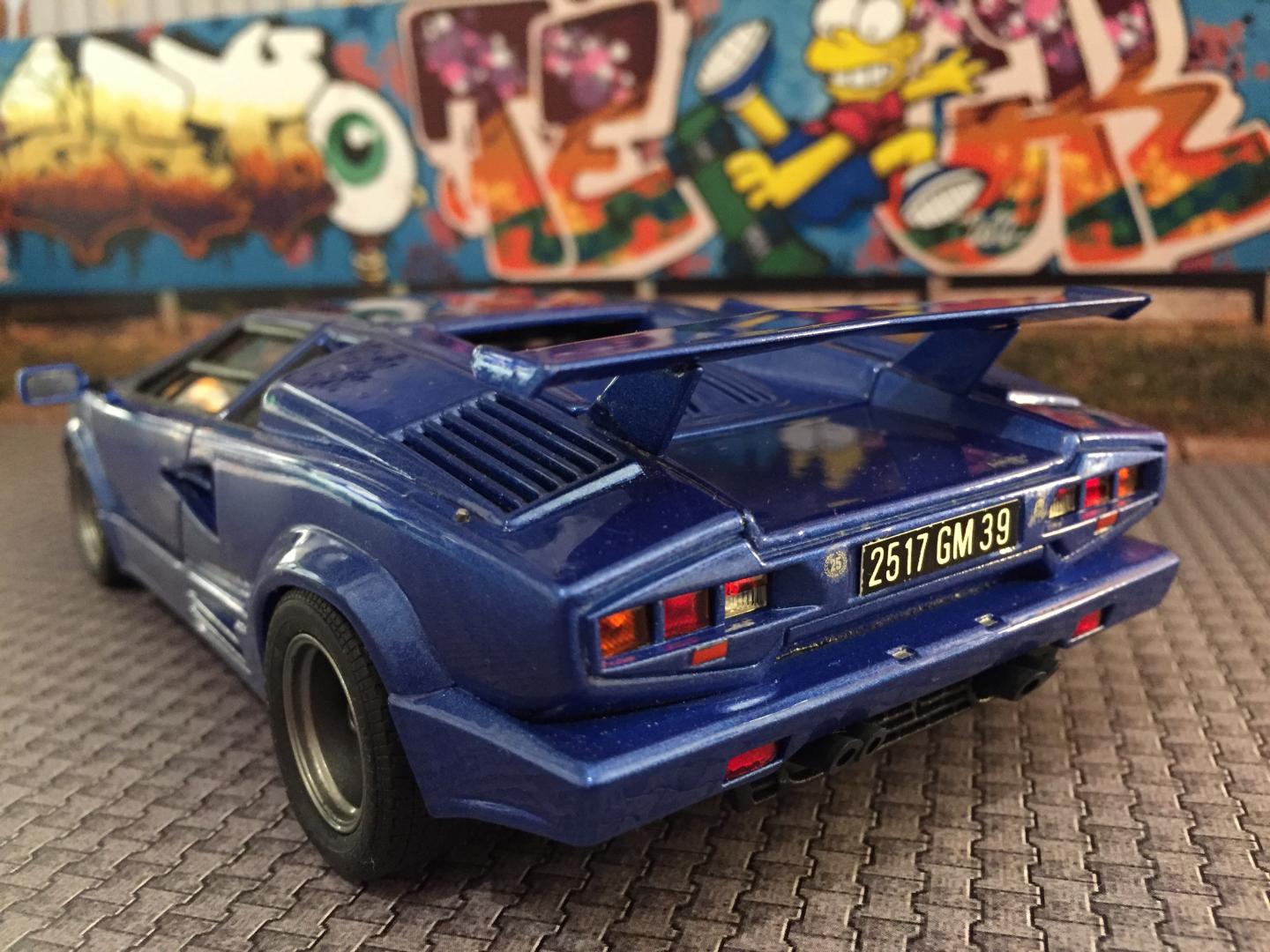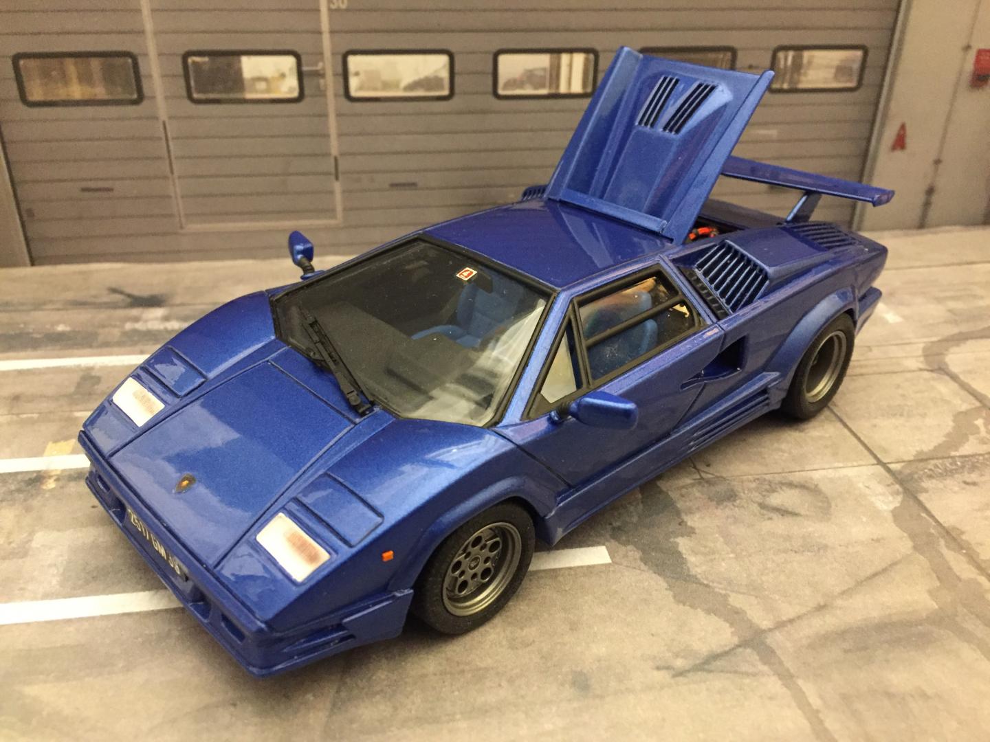 Hi folks, I would like to show you this one which I finished around 1 year ago. So right about that, Dann! The reason why I chose the Italeri over the Fujimi is... I don't know! In fact, I like the body shape of the Italeri a bit more, it's a bit wider in the front area, maybe more massive. The Fujimi probably is more true to scale, but I don't know. Anyways, I had bought the Italeri second-hand (some of the body parts were glued but that was all) so it was available. I have the Fujimi Anniversary Countach kit too, but only the non-EM kit without the engine. As I wanted to do one with an engine, this was the one to go for. As with most Italeri kits, the rims and tyres are a complete no-go. Even though the design of the rims itself is not that bad, they are all the same size and imho you just cannot do that on a Countach. As a result of my search on the internet I bought a set of Fujimi aftermarket rims + tyres with MUCH to wide rear tyres. Fortunately those were just right for Marcel_T4's massive Turbo Countach build, so he got them from me... As for my Anniversary Countach, I finally decided to use the rims from my Fujimi kit but as ALL Fujimi Countach tyres are too small in width, I had to add some wider ones from my spare parts box. Another modification that has been made is that I used the the "pointed" rear wing from the Aoshima QV 5000 kit. There are 2 wings included in that kit, the pointed one and the straight one. Back in the day, I always liked the Anniversary Countach without the rear wing but nowadays I think all Countach's except for the LP 400 HAVE to have one... The body color is ZP Lamborghini Blu Caelum, a very beautiful metallic blue which has been sealed with ZP 2k clear. Rims have been painted using AK Interactive's Gun Metal. Enough said, here come the images, hope you like them: