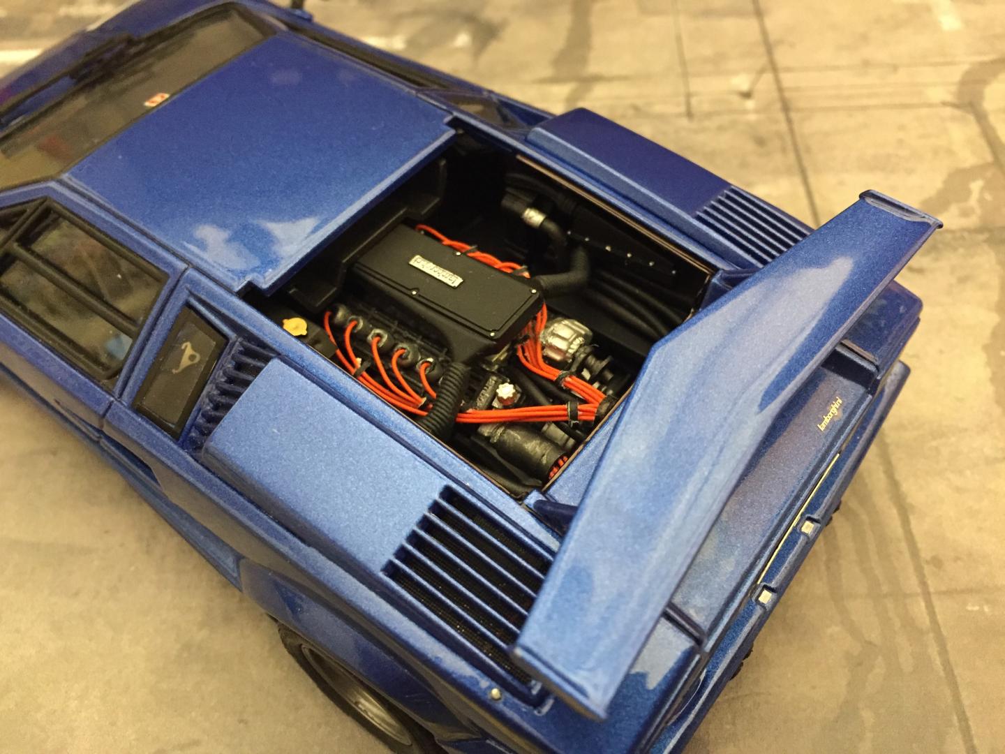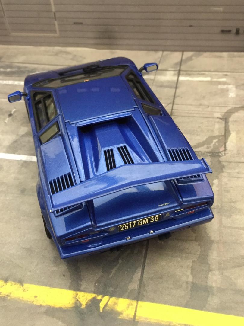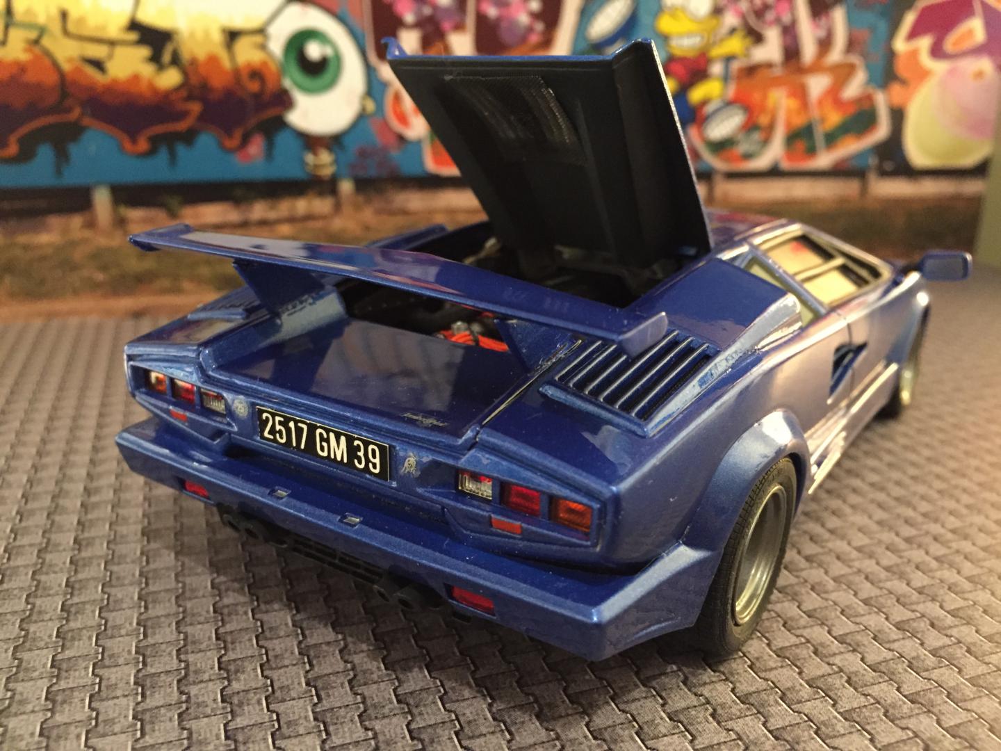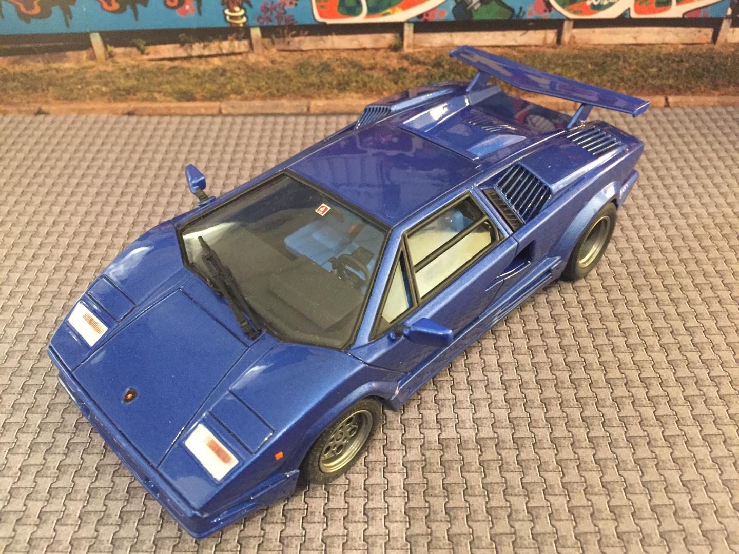Hi folks, I would like to show you this one which I finished around 1 year ago. So right about that, Dann! The reason why I chose the Italeri over the Fujimi is... I don't know! In fact, I like the body shape of the Italeri a bit more, it's a bit wider in the front area, maybe more massive. The Fujimi probably is more true to scale, but I don't know. Anyways, I had bought the Italeri second-hand (some of the body parts were glued but that was all) so it was available. I have the Fujimi Anniversary Countach kit too, but only the non-EM kit without the engine. As I wanted to do one with an engine, this was the one to go for. As with most Italeri kits, the rims and tyres are a complete no-go. Even though the design of the rims itself is not that bad, they are all the same size and imho you just cannot do that on a Countach. As a result of my search on the internet I bought a set of Fujimi aftermarket rims + tyres with MUCH to wide rear tyres. Fortunately those were just right for Marcel_T4's massive Turbo Countach build, so he got them from me... As for my Anniversary Countach, I finally decided to use the rims from my Fujimi kit but as ALL Fujimi Countach tyres are too small in width, I had to add some wider ones from my spare parts box. Another modification that has been made is that I used the the "pointed" rear wing from the Aoshima QV 5000 kit. There are 2 wings included in that kit, the pointed one and the straight one. Back in the day, I always liked the Anniversary Countach without the rear wing but nowadays I think all Countach's except for the LP 400 HAVE to have one... The body color is ZP Lamborghini Blu Caelum, a very beautiful metallic blue which has been sealed with ZP 2k clear. Rims have been painted using AK Interactive's Gun Metal. Enough said, here come the images, hope you like them: