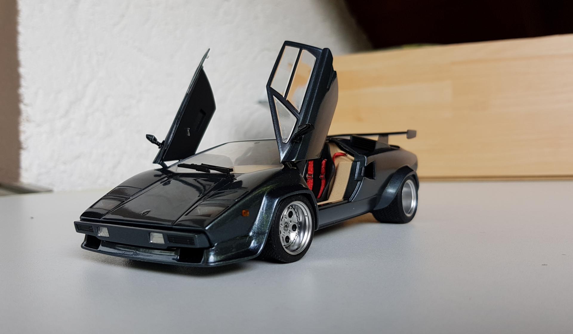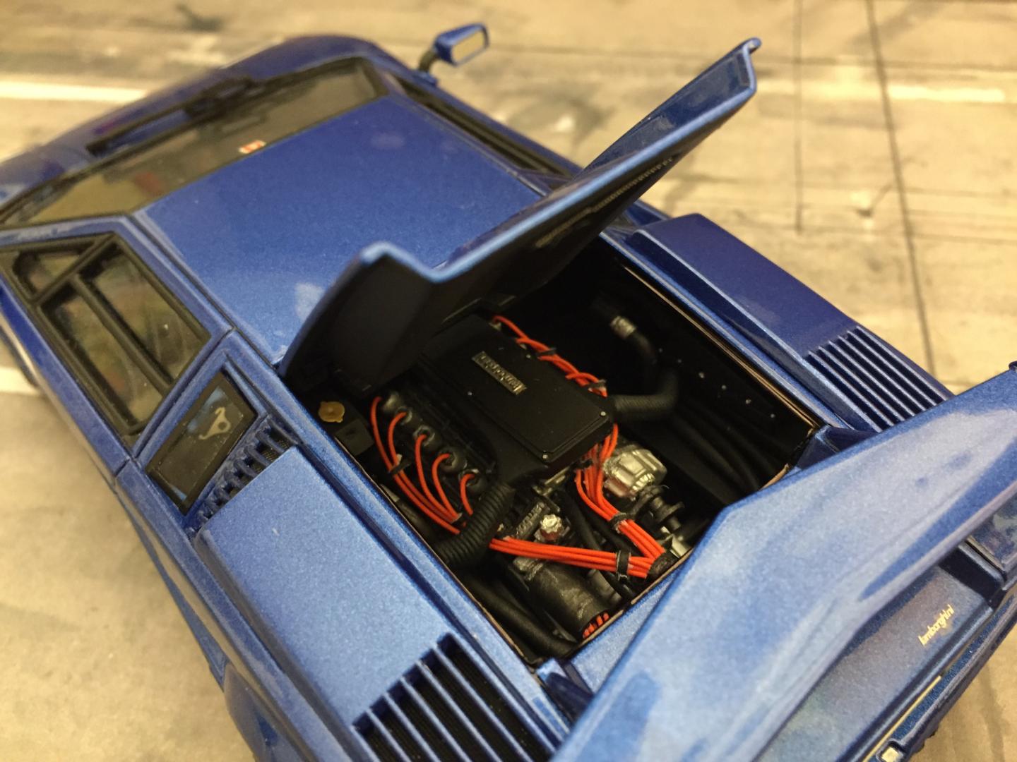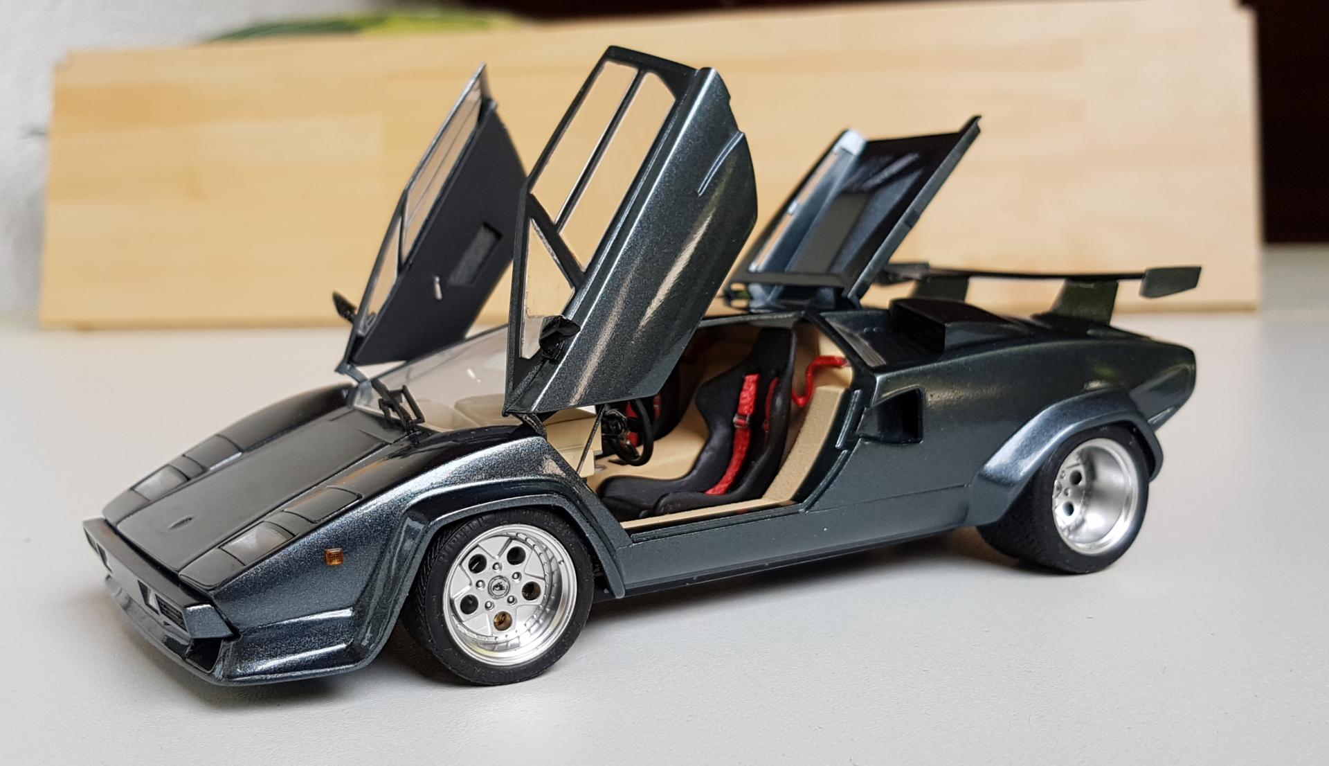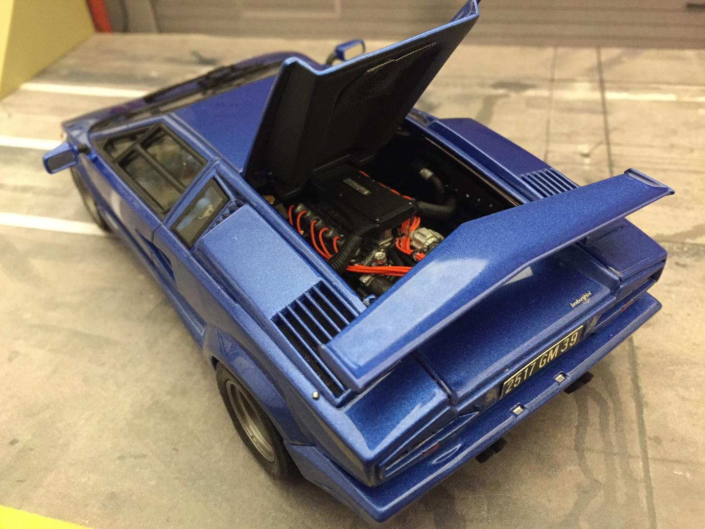 Hi folks, I would like to show you this one which I finished around 1 year ago. So right about that, Dann! The reason why I chose the Italeri over the Fujimi is... I don't know! In fact, I like the body shape of the Italeri a bit more, it's a bit wider in the front area, maybe more massive. The Fujimi probably is more true to scale, but I don't know. Anyways, I had bought the Italeri second-hand (some of the body parts were glued but that was all) so it was available. I have the Fujimi Anniversary Countach kit too, but only the non-EM kit without the engine. As I wanted to do one with an engine, this was the one to go for. As with most Italeri kits, the rims and tyres are a complete no-go. Even though the design of the rims itself is not that bad, they are all the same size and imho you just cannot do that on a Countach. As a result of my search on the internet I bought a set of Fujimi aftermarket rims + tyres with MUCH to wide rear tyres. Fortunately those were just right for Marcel_T4's massive Turbo Countach build, so he got them from me... As for my Anniversary Countach, I finally decided to use the rims from my Fujimi kit but as ALL Fujimi Countach tyres are too small in width, I had to add some wider ones from my spare parts box. Another modification that has been made is that I used the the "pointed" rear wing from the Aoshima QV 5000 kit. There are 2 wings included in that kit, the pointed one and the straight one. Back in the day, I always liked the Anniversary Countach without the rear wing but nowadays I think all Countach's except for the LP 400 HAVE to have one... The body color is ZP Lamborghini Blu Caelum, a very beautiful metallic blue which has been sealed with ZP 2k clear. Rims have been painted using AK Interactive's Gun Metal. Enough said, here come the images, hope you like them: