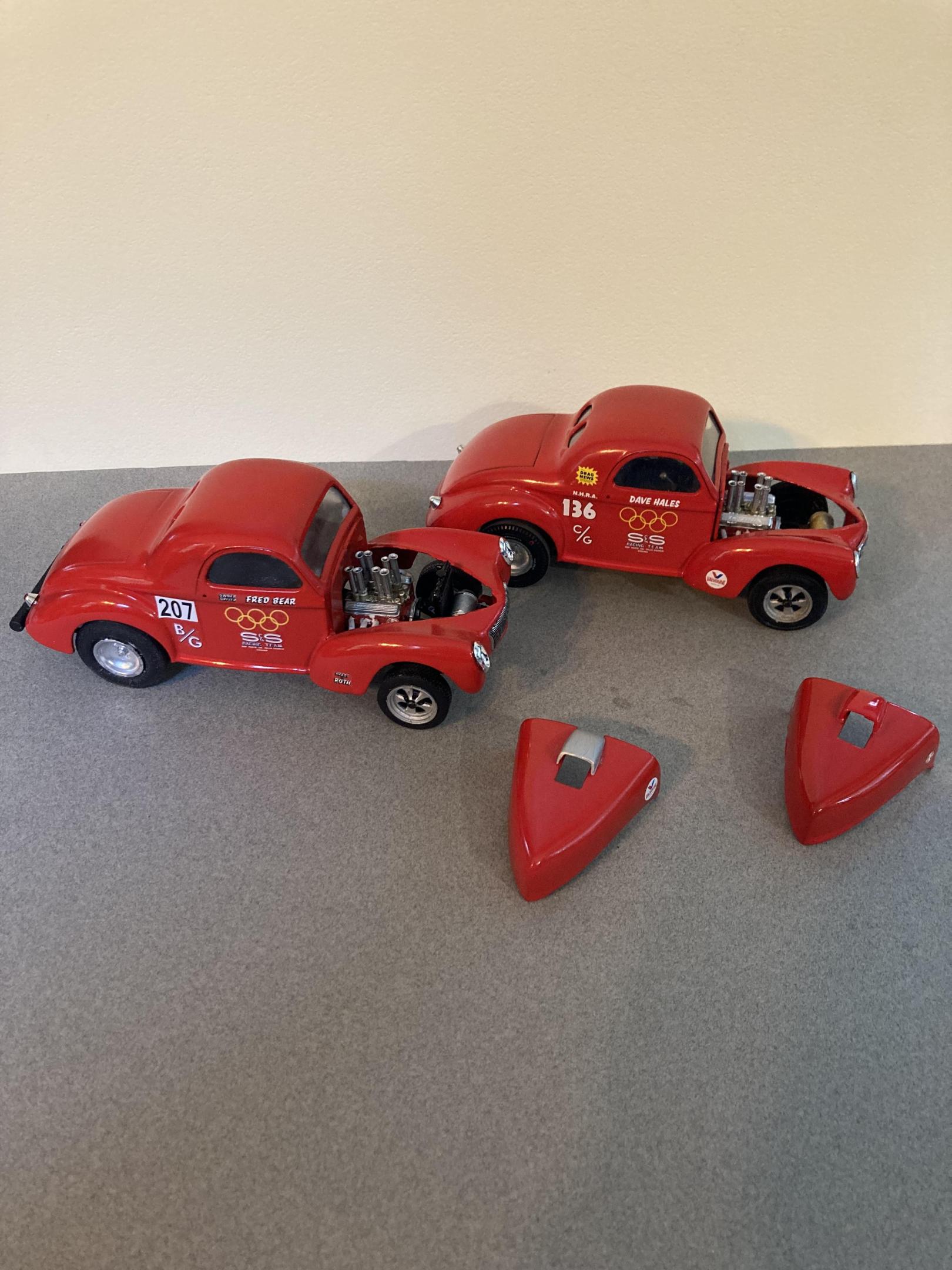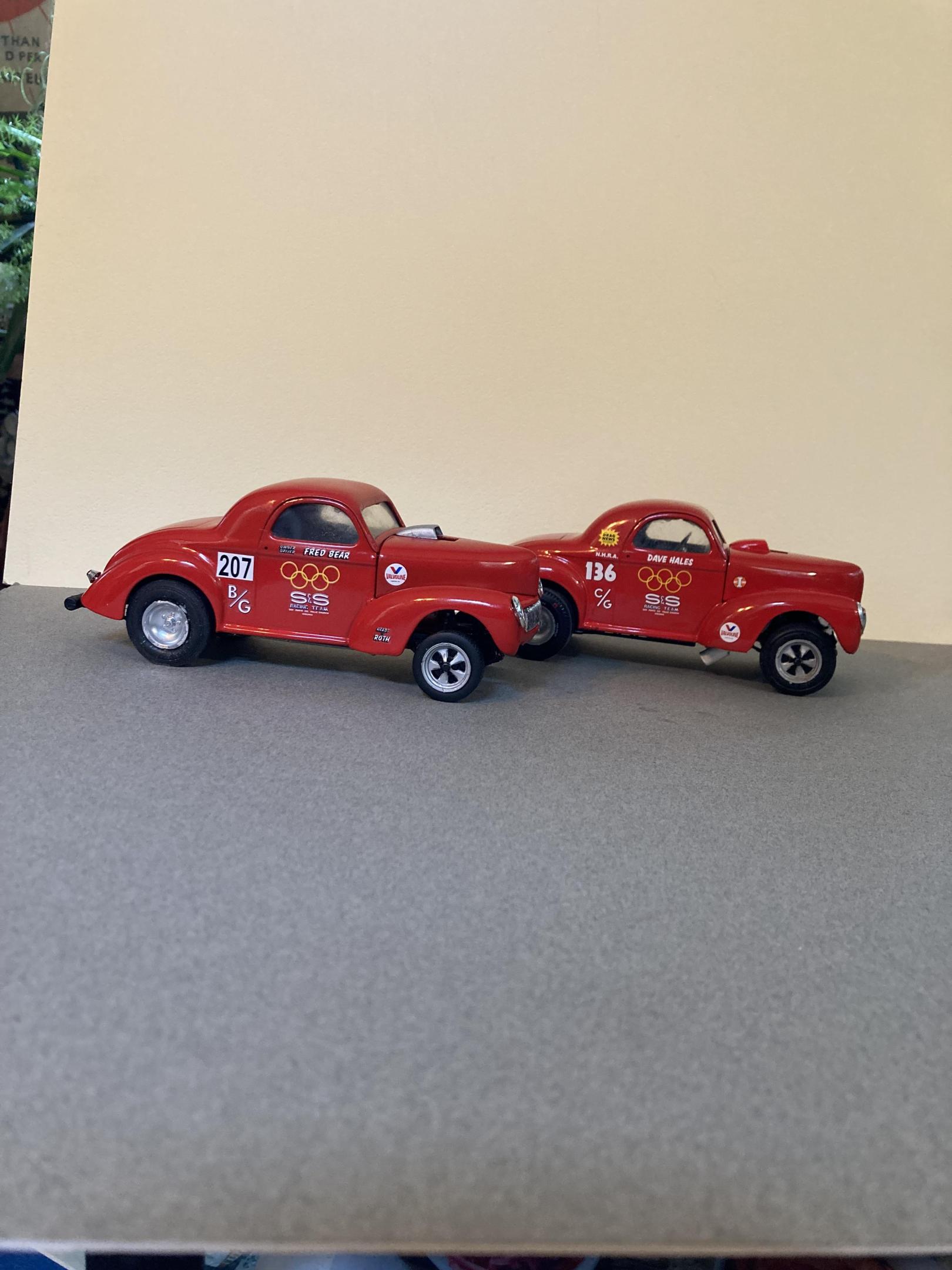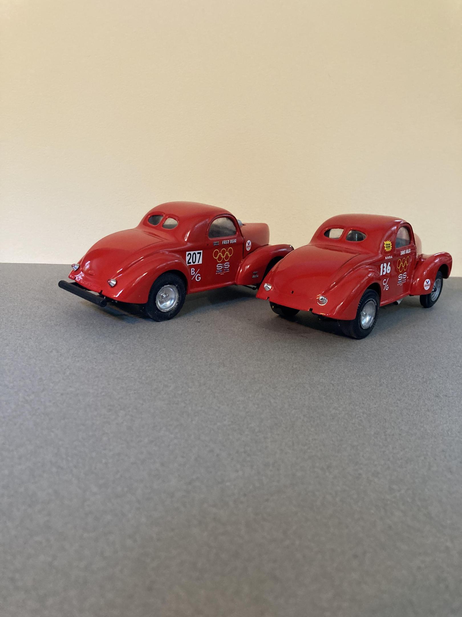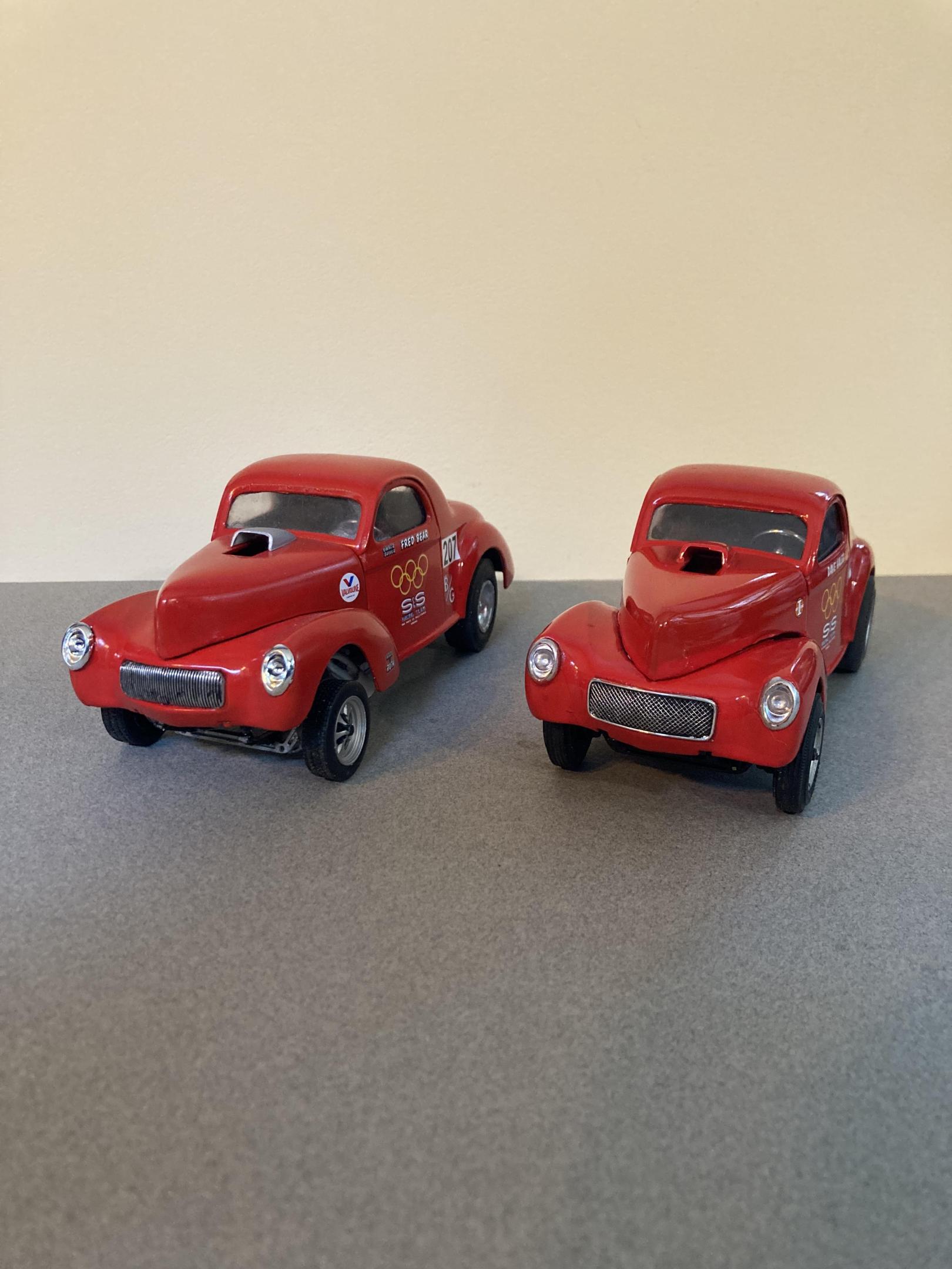 These two Willy’s started out as late 80’s ertl amt reissues that I turned into to glue bombs . I originally built one as Stone Woods and Cooke and one as mazmanian . Twenty eight years later I took them apart and started over. After reading a really good article in the rodders journal about the s&s team . I used the small block Chevy engines , and back wheels from the double dragster kit the hood scoops came from the amt 37 Chevy kit . I chose tamyia bright red for the color and slixx provided the decals. Body work comprised of cutting the hood away from fenders . Then attaching than to lower fender extensions of the body. This is relatively easy thing to do and it makes it a much better looking model . In most ways the revell willys is a better kit, but I already had these amt kits that needed to be saved . they are really great kits with all of the right speed parts. Thanks for looking ? , Mike