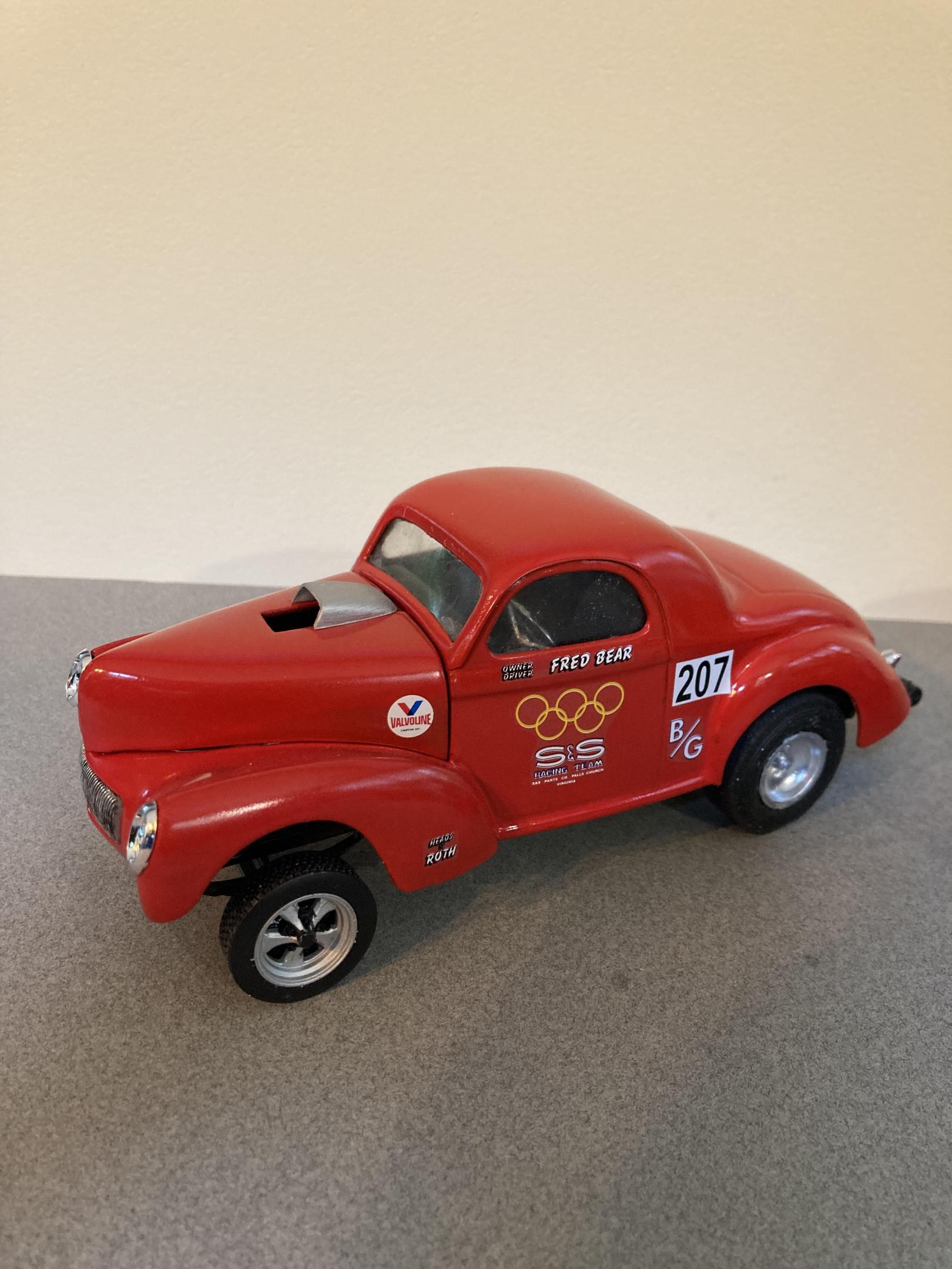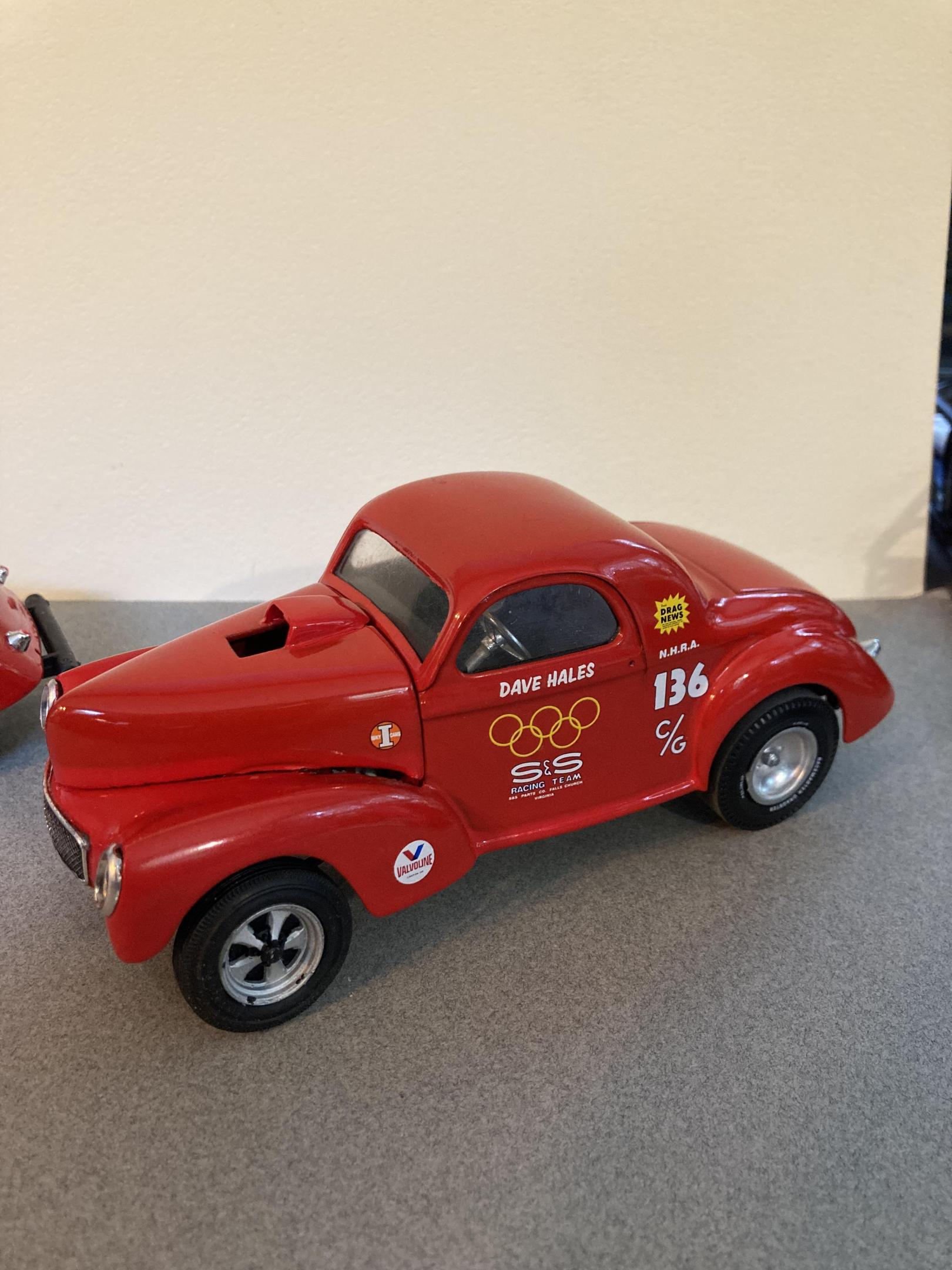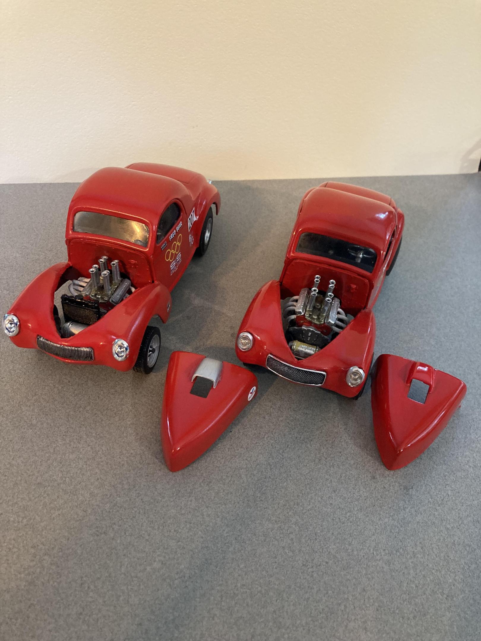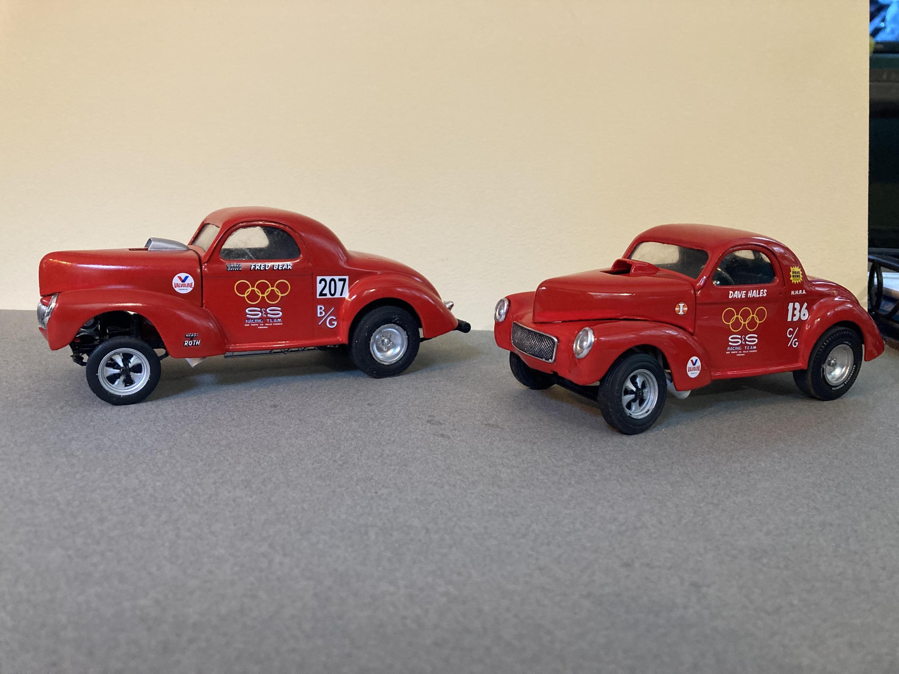 These two Willy’s started out as late 80’s ertl amt reissues that I turned into to glue bombs . I originally built one as Stone Woods and Cooke and one as mazmanian . Twenty eight years later I took them apart and started over. After reading a really good article in the rodders journal about the s&s team . I used the small block Chevy engines , and back wheels from the double dragster kit the hood scoops came from the amt 37 Chevy kit . I chose tamyia bright red for the color and slixx provided the decals. Body work comprised of cutting the hood away from fenders . Then attaching than to lower fender extensions of the body. This is relatively easy thing to do and it makes it a much better looking model . In most ways the revell willys is a better kit, but I already had these amt kits that needed to be saved . they are really great kits with all of the right speed parts. Thanks for looking ? , Mike