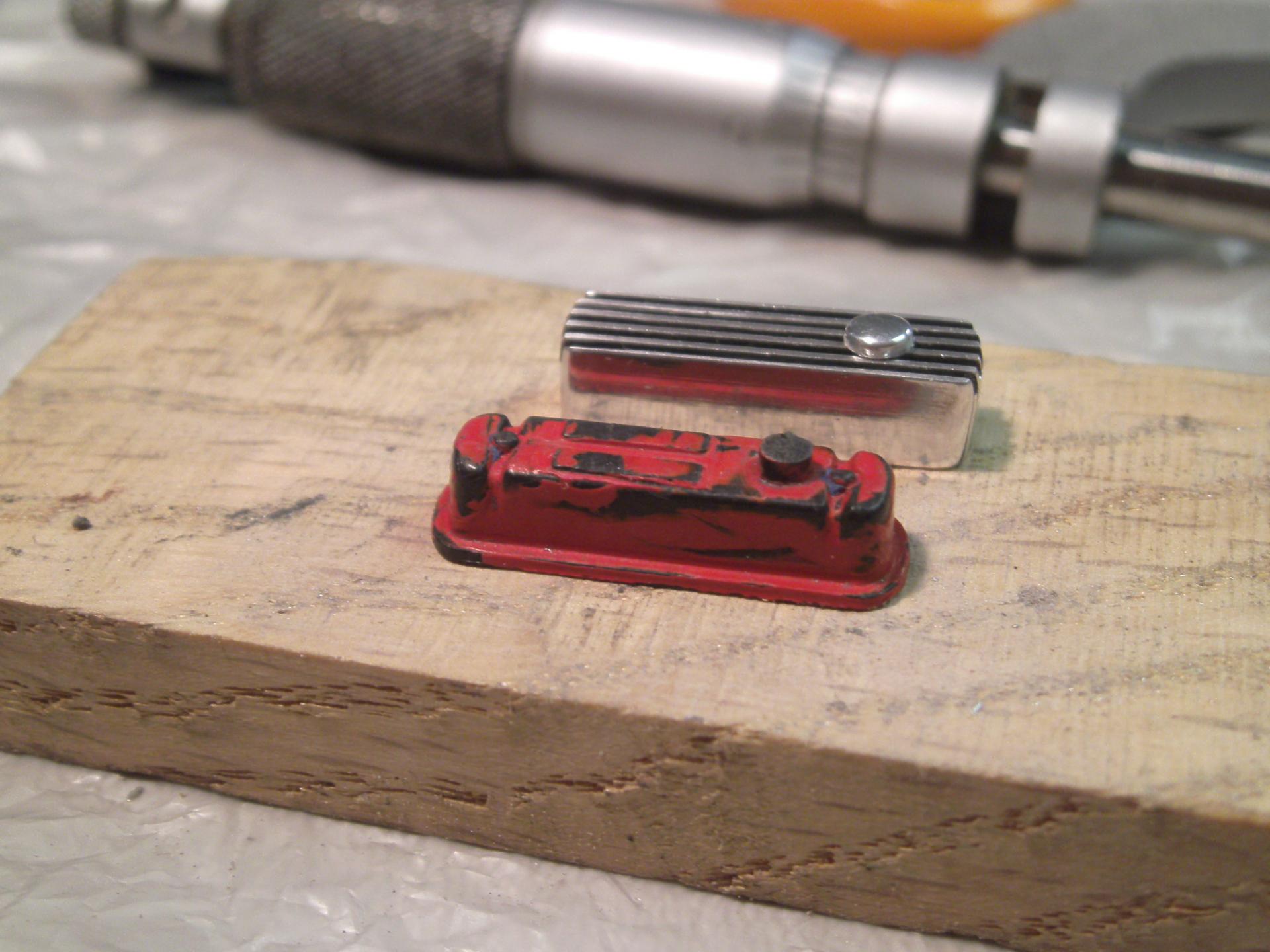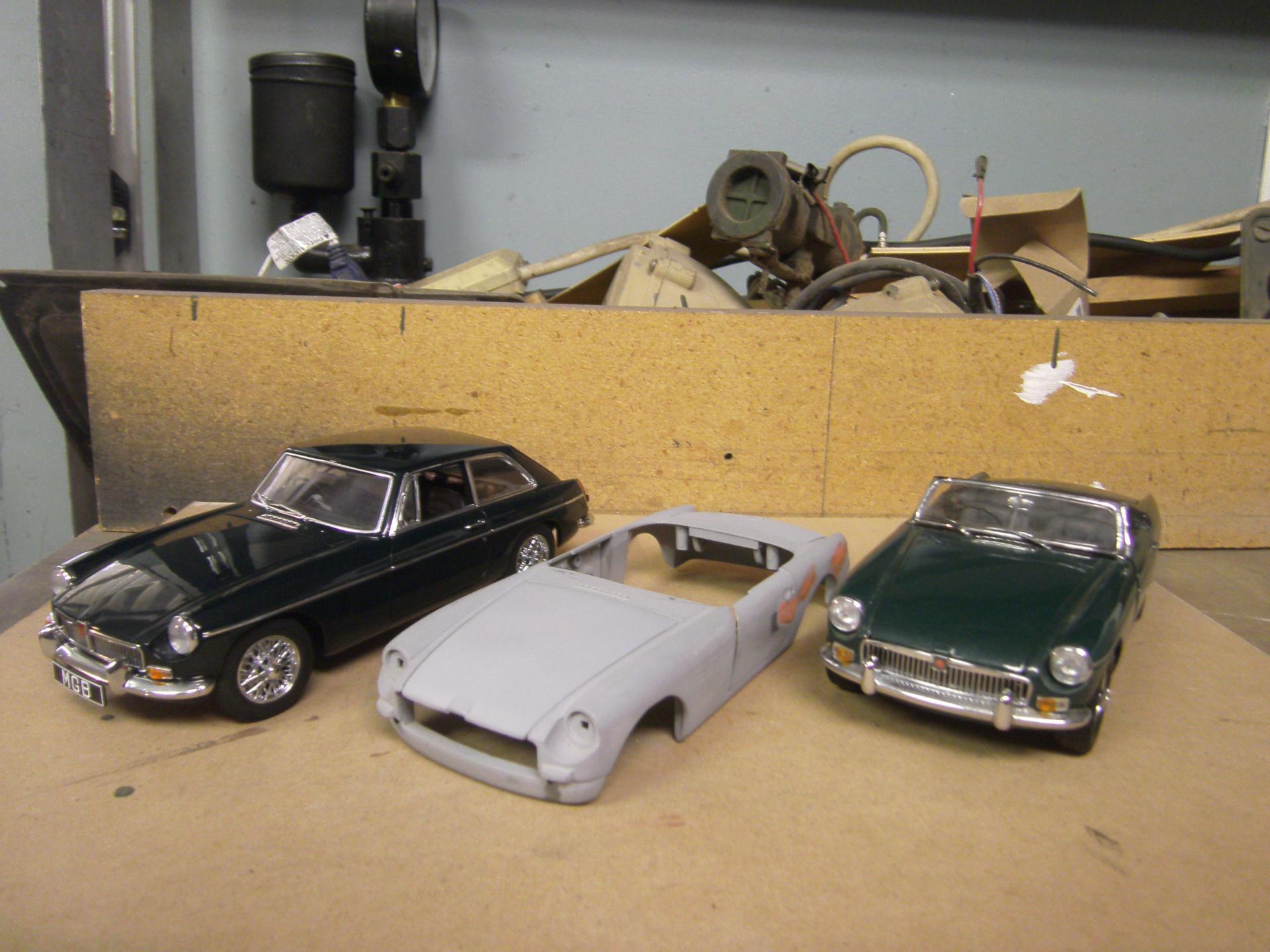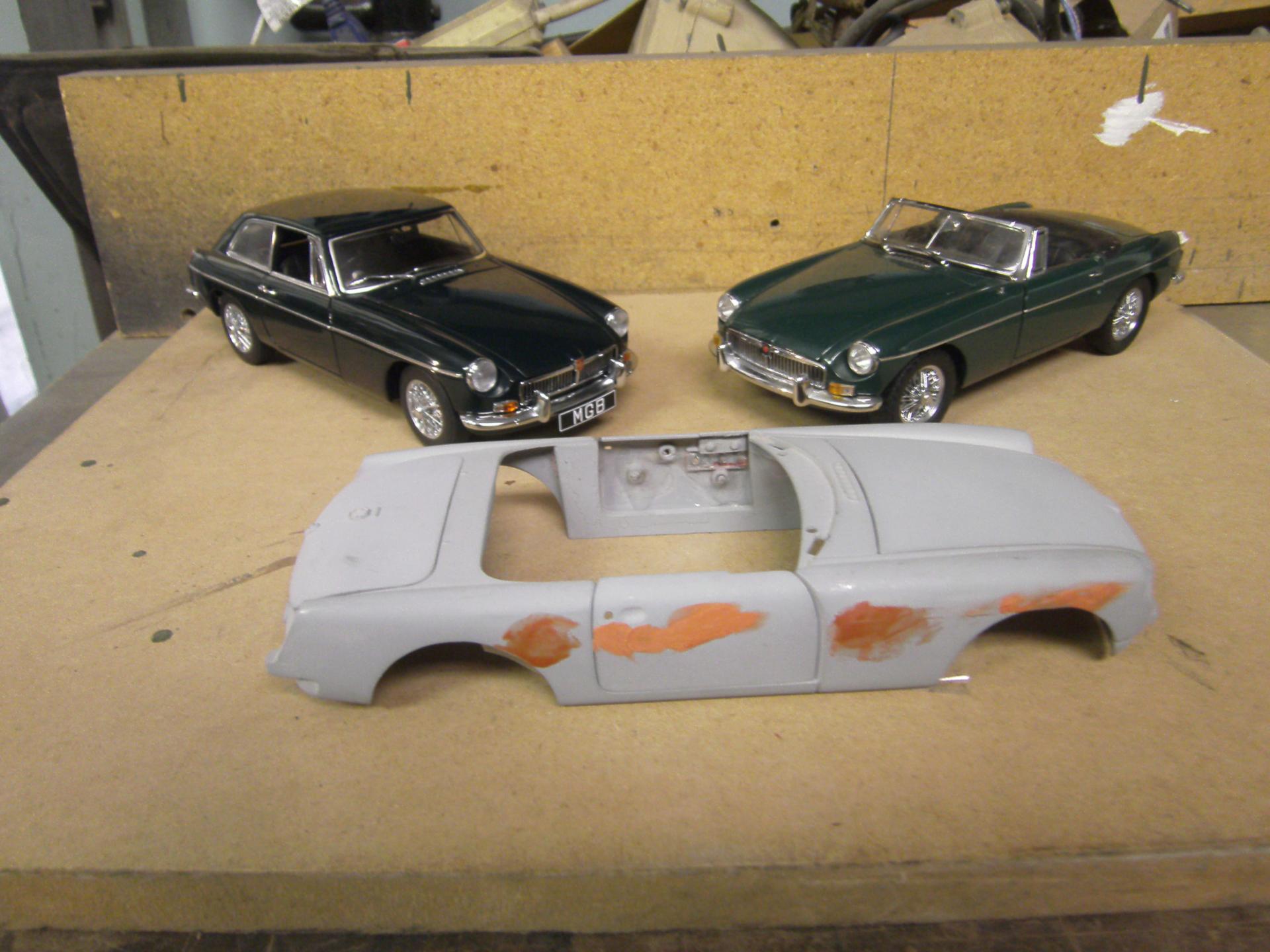 If this diecast build is not proper for this thread, please move it to the correct place. It's on my work bench so I put it here. 30 years ago, I raced E Production MGB's. Over the years I've owned over 60 MGB's and still have a 1970 MGB GT. I guess you could say I'm an MG enthusiast. When the Corgi diecast version came out, I bought 2 of them in the hopes of building a replica of my second racer and maybe do one of my first racer (which I rolled at Bridgehampton) and paint it as it was when I was doing road rallies with it. I think some parts of the Corgi die cast stacks up fairly well against the Kyoscho and Auto Arts versions ... but most if it is really pretty dismal. As seen, I stripped off the paint and de-chromed the body. My car had an aluminum finned valve cover, so I scratched one out of aluminum and turned a cap for it. I have tried for 20 years to find a set of minilites for this build. I tried scratch building one to make a mold from, but couldn't quite get it. After lurking here I while, I took a chance and placed a post. AFX sold me a set ... and here I am. Not *exactly* minilites, but close enough. I ran 2 in. S.U. carbs on my car. I modified the velocity stacks from a set of Weber side drafts. I built this set a long time ago. The odd color on the engine is engine paint for late 60's MGB's. The color seen in the next picture down is a better representation. I got 12 cans of this paint from Moss Motors when I had my last repair shop over 20 years ago ... and it's still good. The tops on the SU's and the spark plugs are bits of Allen wrenches that I modified on my lathe. The distributor, oil filter and pulleys are also turnings. The sparkly stuff on the block is just dust. I know there is a lot of touching up to do and one of the plugs is in backwards. Blame it on my 66 year old eyes and cheap glasses. The chassis wasn't bad, but a lot of stuff, like the molded in center console and the 4 inch thick floor had to go. My racer had no heater ... and a lot of the stuff in the engine bay just wasn't correct. It's almost all gone. The MGB has a unibody instead of a chassis ... but Corgi left out a whole lot ... so I'm making adjustments. I'm trying to decide if i should try to grind off the fuel and brake lines and do it right. More to come here. Just like the real thing, the seat in the Corgi MGB is TERRIBLE for a race car. On the real car, I used a seat out of a 914 Porsche. For this build, I scratched up something out of aluminum and bits of plastic to hold me in the car better. Another shot of the valve cover.