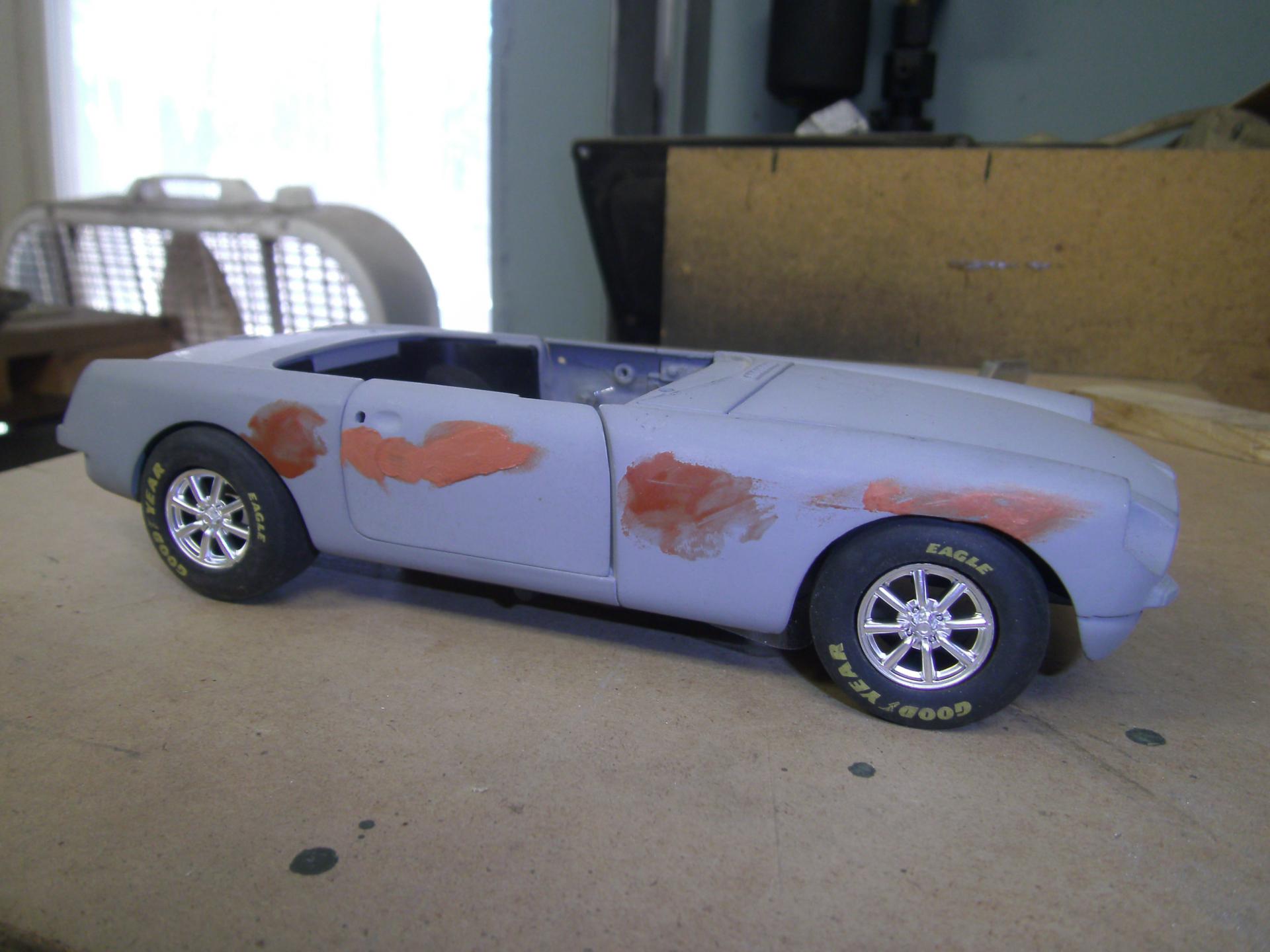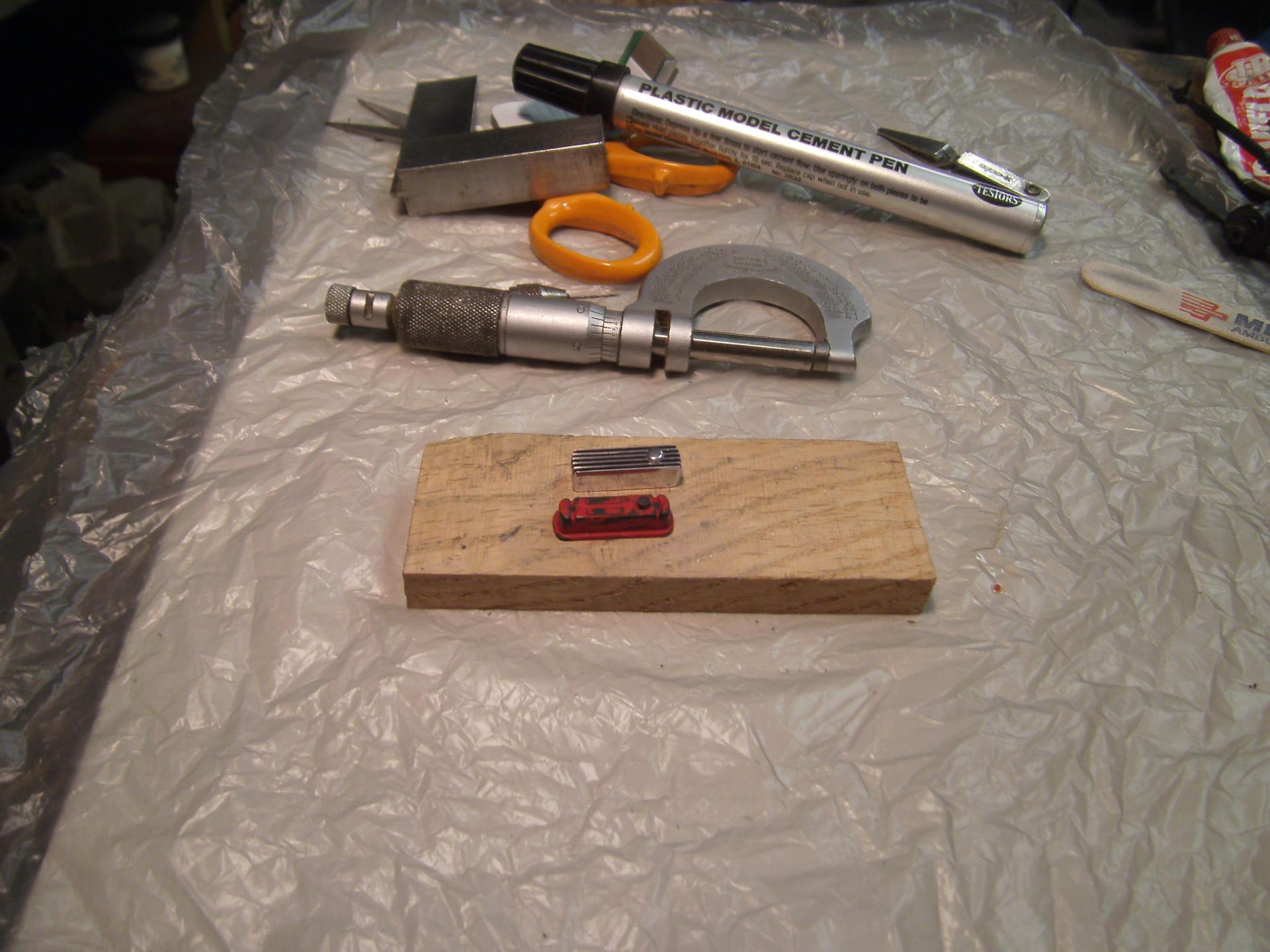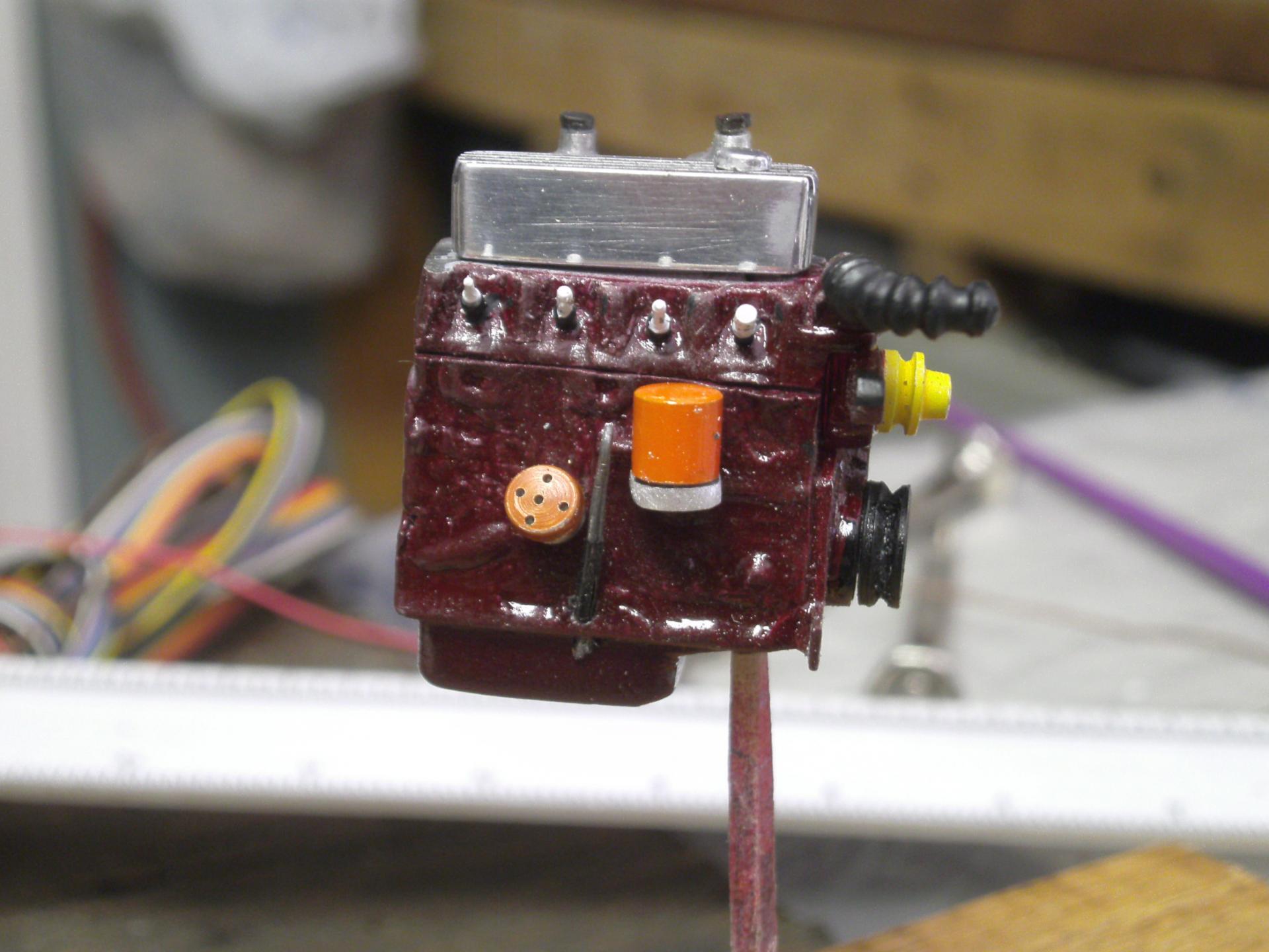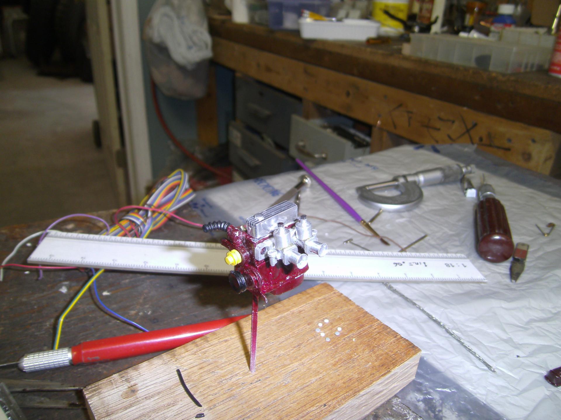 If this diecast build is not proper for this thread, please move it to the correct place. It's on my work bench so I put it here. 30 years ago, I raced E Production MGB's. Over the years I've owned over 60 MGB's and still have a 1970 MGB GT. I guess you could say I'm an MG enthusiast. When the Corgi diecast version came out, I bought 2 of them in the hopes of building a replica of my second racer and maybe do one of my first racer (which I rolled at Bridgehampton) and paint it as it was when I was doing road rallies with it. I think some parts of the Corgi die cast stacks up fairly well against the Kyoscho and Auto Arts versions ... but most if it is really pretty dismal. As seen, I stripped off the paint and de-chromed the body. My car had an aluminum finned valve cover, so I scratched one out of aluminum and turned a cap for it. I have tried for 20 years to find a set of minilites for this build. I tried scratch building one to make a mold from, but couldn't quite get it. After lurking here I while, I took a chance and placed a post. AFX sold me a set ... and here I am. Not *exactly* minilites, but close enough. I ran 2 in. S.U. carbs on my car. I modified the velocity stacks from a set of Weber side drafts. I built this set a long time ago. The odd color on the engine is engine paint for late 60's MGB's. The color seen in the next picture down is a better representation. I got 12 cans of this paint from Moss Motors when I had my last repair shop over 20 years ago ... and it's still good. The tops on the SU's and the spark plugs are bits of Allen wrenches that I modified on my lathe. The distributor, oil filter and pulleys are also turnings. The sparkly stuff on the block is just dust. I know there is a lot of touching up to do and one of the plugs is in backwards. Blame it on my 66 year old eyes and cheap glasses. The chassis wasn't bad, but a lot of stuff, like the molded in center console and the 4 inch thick floor had to go. My racer had no heater ... and a lot of the stuff in the engine bay just wasn't correct. It's almost all gone. The MGB has a unibody instead of a chassis ... but Corgi left out a whole lot ... so I'm making adjustments. I'm trying to decide if i should try to grind off the fuel and brake lines and do it right. More to come here. Just like the real thing, the seat in the Corgi MGB is TERRIBLE for a race car. On the real car, I used a seat out of a 914 Porsche. For this build, I scratched up something out of aluminum and bits of plastic to hold me in the car better. Another shot of the valve cover.