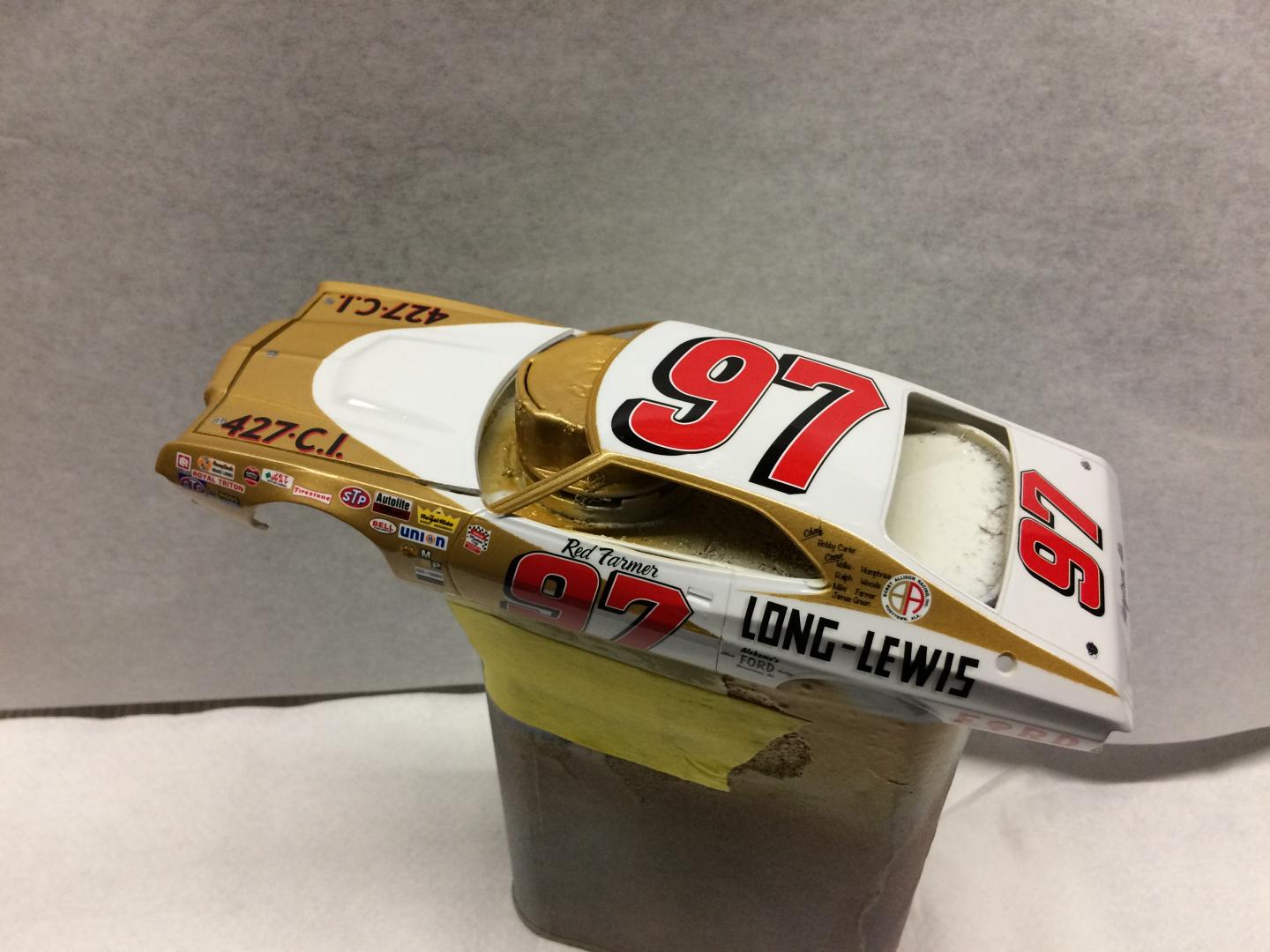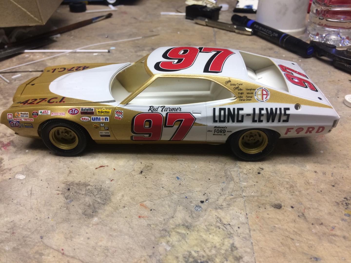 This car was the last nascar Grand National racecar to be made from a driven home from the dealer new. Built by Red and Bobby Allison in Hueytown Alabama. The kit is a Johan Torino. The rear suspension is scratchbuilt around an AMT 9” rearend. I worked off pictures I had found on line of the rear suspension. Its getting a 427 out of a Polar Lights Talladega.