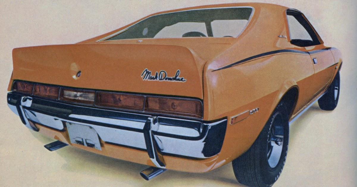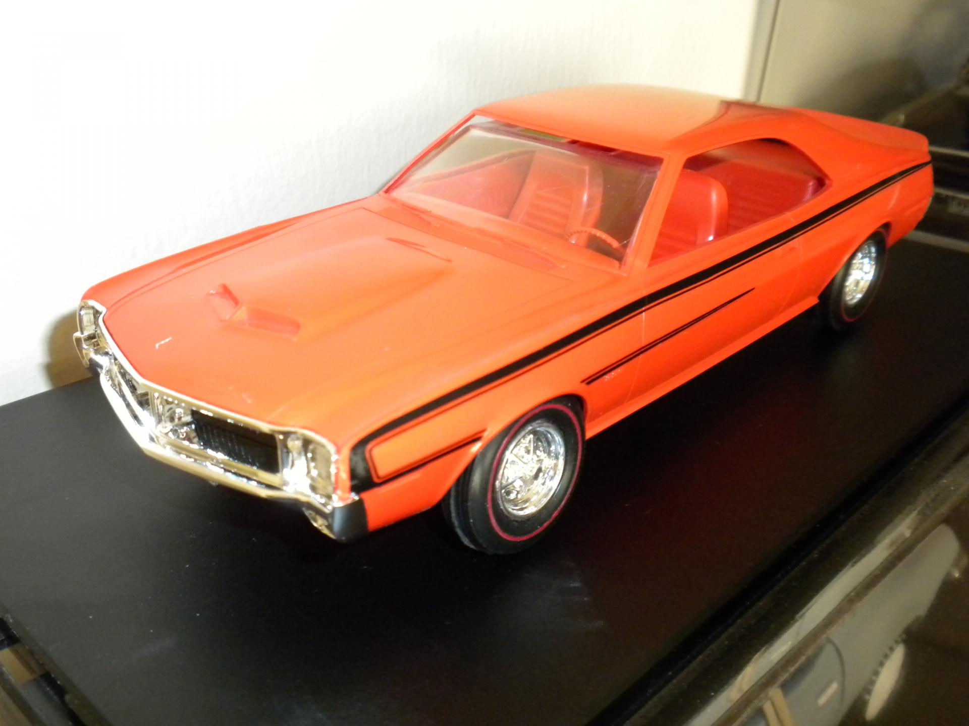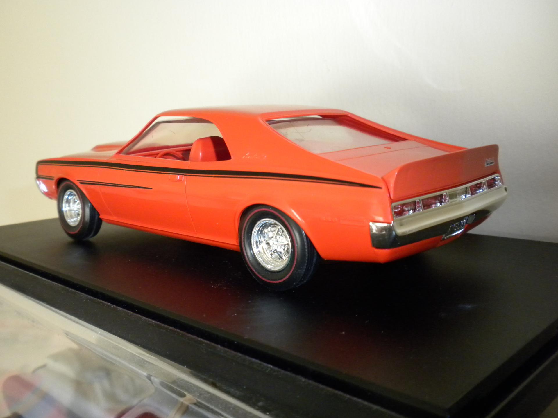 Greetings, A brief promotional model rehabilitation project this. Here is seen a recent $8 antique store purchase originally painted in some mystery black enamel finish complete with lurid decals, Jo-Han Maverick promotional model wheels, plus scale rear slicks! Happily the awful paint finish fell away for delicate efforts made to strip the same, whereas given this Big Bad Orange example remained far from perfect (i.e. both A-pillars are twinged if you will), I thought I'd make a mild effort to create an unofficial Mark Donohue edition of what remained (see the adjoining period advertising image). A spare Jo-Han 1970 Mark Donohue Trans Am spoiler was added with white glue after painting the part with Tamiya aerosol - a fair match it seems. Noticed too will be the very acceptable Fred Cady '70 Javelin SST stripe work rarely seen applied. The rims are Jo-Han Magnum 500's with promo-style axle mounting points, while more appropriate tires perhaps might otherwise have taken the form of Goodyear Polyglas GT's with the tiny raised white letters. A defense can be offered up to the extent that Javeiin SST promotional models in '70 typically featured redlines. Given this, I opted to use a set of Stevens International vinyl tires from the early 1990's I had which seemed to employ the original Jo-Han tire molds but substituting softer material and featuring much better quality control on the redline detail itself. Obsolete kit glass replaces the damaged original fitment (not fitting too well in full truth), whereas the front and rear bumpers have been rechromed. Thanks for examining this brief post... Mike K. M.K.