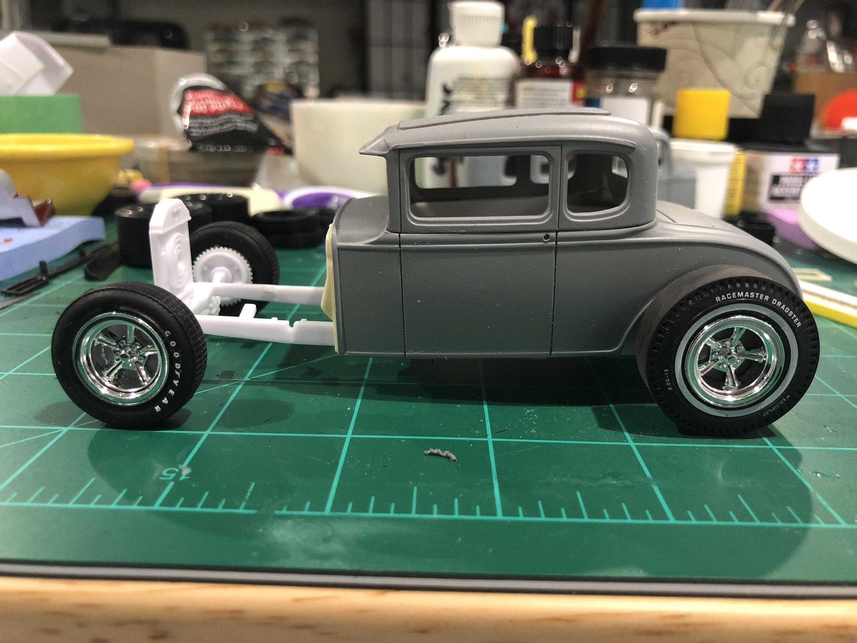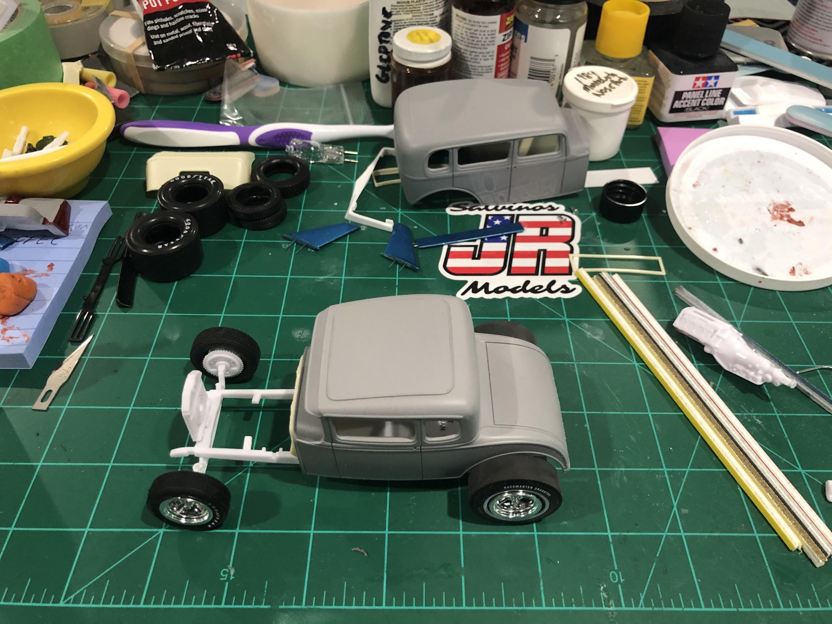 My rendition of the 34 Ford 5 window coupe. Drag City Castings chopped body, Base kit by AMT with a few Revell components mixed in. The engine is Pontiac from the Blue Printers Series, Splash Paints Seamist Green, custom mix Tamyia gold, semi and flat black colors. I added my own fuel and brake lines, made a set of taillights, scratch made the headers and exhaust from evergreen styrene. The interior is somewhat detailed but hard to see through the diminished windows. Thanks for looking.... The Build-