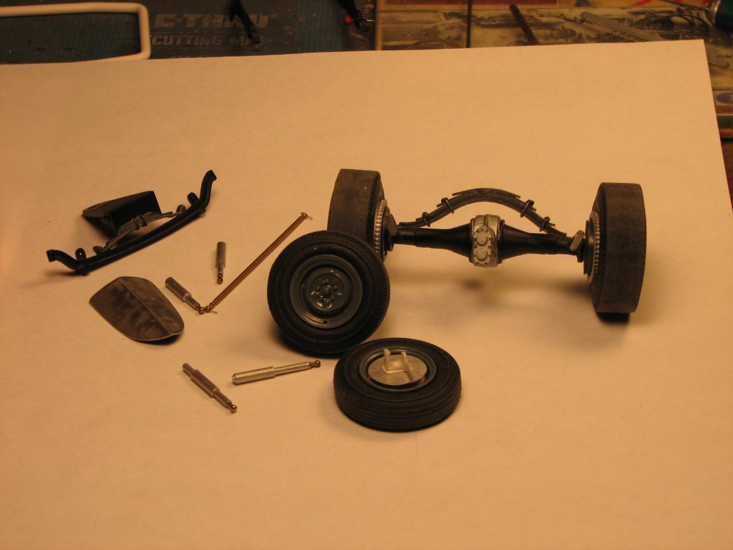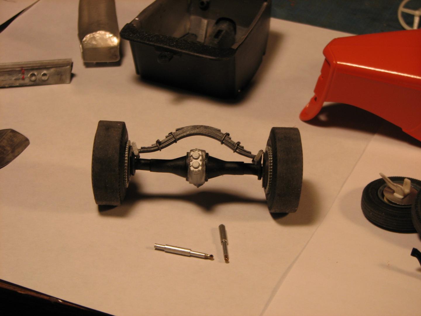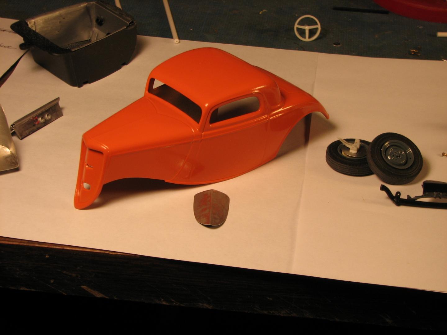 In mid-March, I will be leaving Minnesota after almost 14 years, and returning home to Colorado. As my time here dwindles, I picked up Revell's '34 coupe snapper, determined to finish something...anything, before I go. Just a few of the modifications I've made include a scratchbuilt rear spring, a front axle from Revell's old Model A Pickup kit, aluminum door panels, firewall, dash and seat made from .005" aluminum flashing (GREAT stuff! Especially after its been sanded free of its plastic coating, and annealed.). The spindles are scratched from Evergreen channel, strip and rod. Front wheels are from a Revell Thunderbolt kit, rears from an old AMT Deuce. Shocks are aluminum tubing with mounts (and tie rod ends) made of HO scale handrail stanchions. Orange paint is Krylon, directly from the can. It's not my best work, but, I am really burning it at both ends, trying to finish it before I am packed and on the road! Comments welcome. Oh, yeah--this complies with NHRA rules for a modified coupe in either 1959 or 1960.
