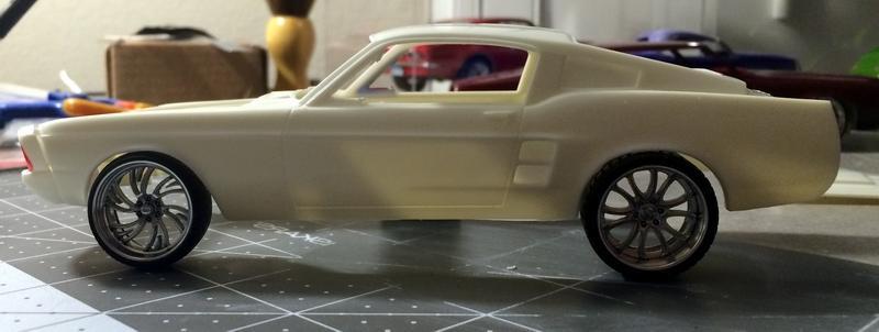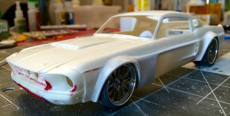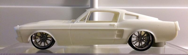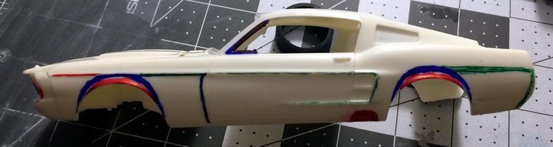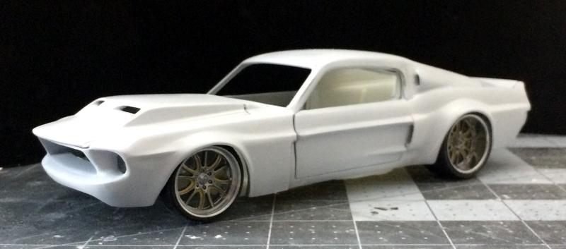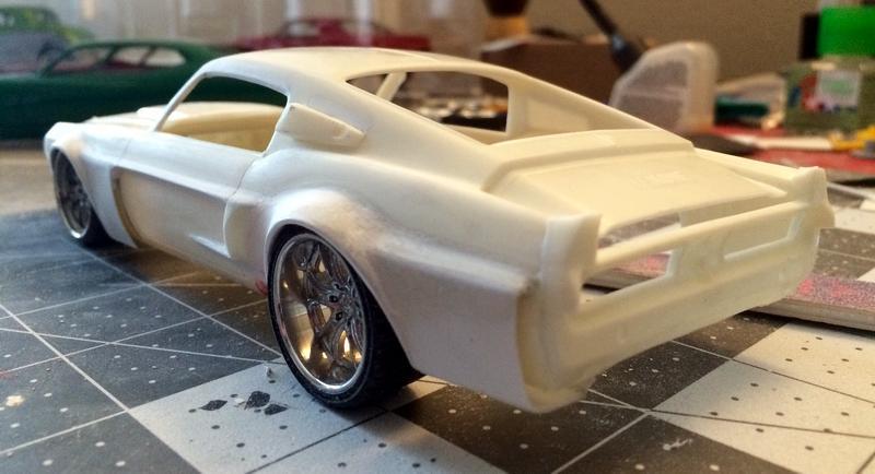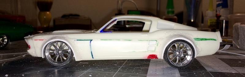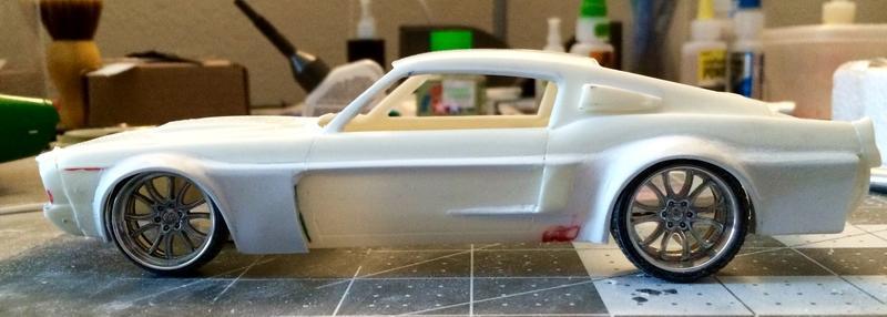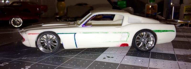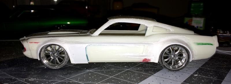 Saw a rendering by Ragle of a Mustang race-concept protouring and said I have to build this. Starting with the AMT Shelby GT-350 Looked at variations for stance, not doing this, just to show what the wheels and tires I will be using look like in a stock position Thought about tucked in the wheel wells... nah... everyone does this with building an Eleanor... Drew out a starting position for trimming... Trimmed out a lot more than I first thought... This is the stance I was looking for and the rendering by Ragle Started the flares... Added the front sail-vent behind the front wheel and modified the side window opening to give it a new lower-chopped look. Also added a deeper body line tying the front sail-vent to the rear scoop and molded it all in. Note the smaller side sail scoop, I think it looks better cut down by a third of the orginal size, this will be moilded in as well.. Created the rear sail-vent behind the rear wheel... haven't decided if I will change the shape of it yet... Feedback? Finally... in primer 3/6... Primary body mods are complete, next is custom racing chassis with ground effects package, splitters, air-dams and rear diffuser