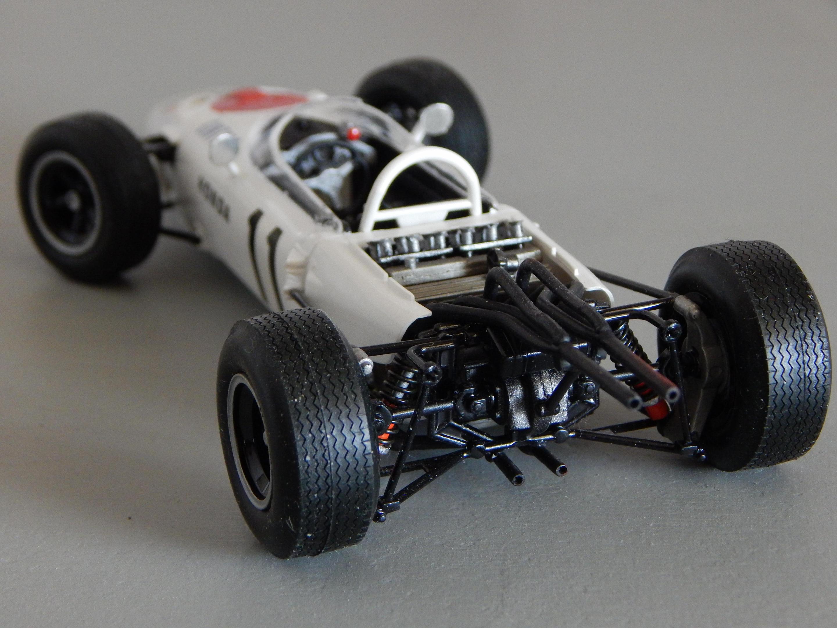 The last one I'll get finished this year, still have a couple on the bench. I really enjoyed building this, the engine was a little fidgety with the intake horns and drilling out the tailpipes was an adventure. The kit came with real metal springs for the rear suspension. Although it looks frail it is actually pretty rugged. I painted the rising sun as I was afraid the supplied decal wouldn't conform. All in all I'm pretty pleased with it. Honda's first F1 victory in 1965 at the Mexican GP. Comments welcome, thanks for looking.