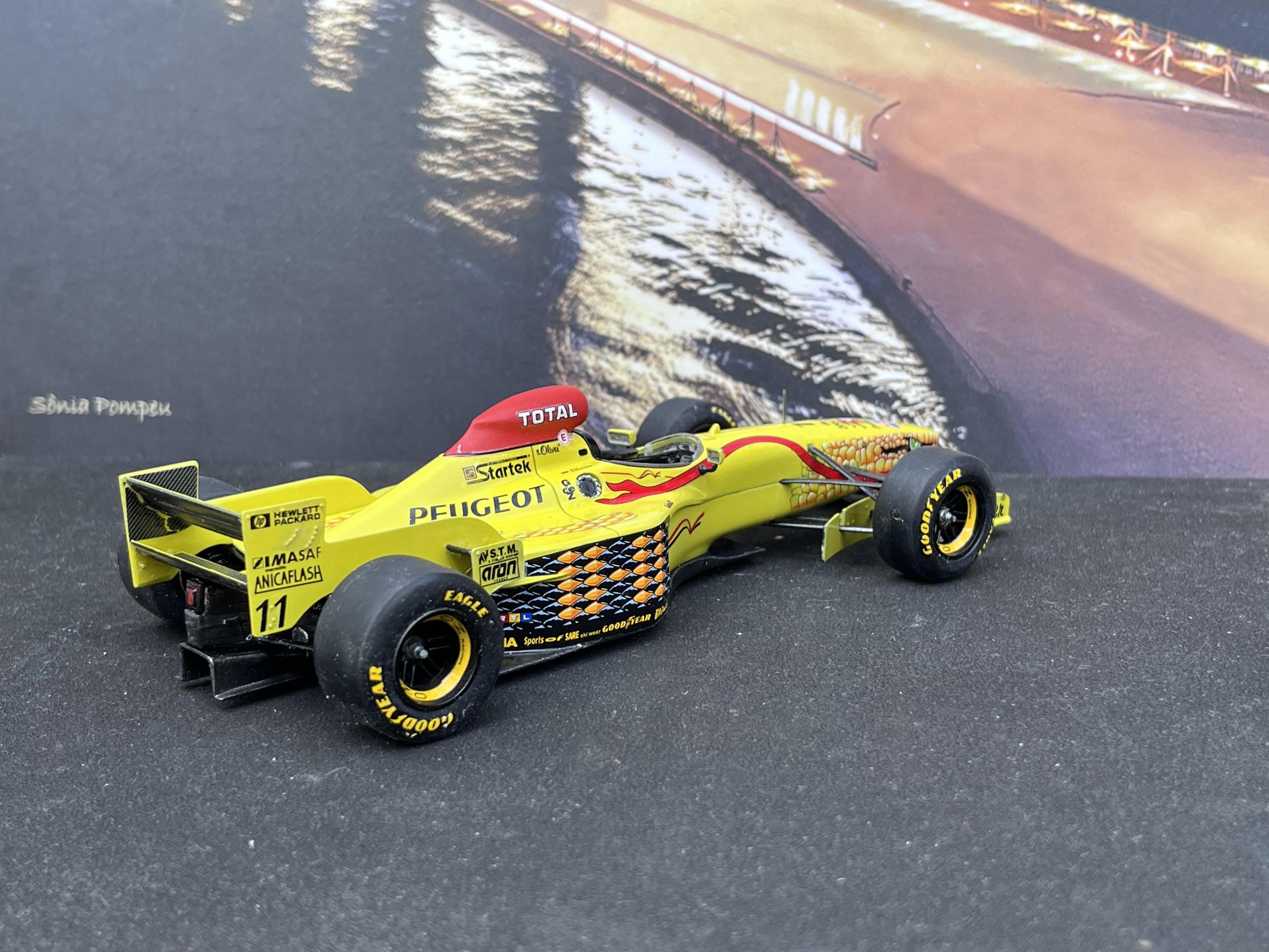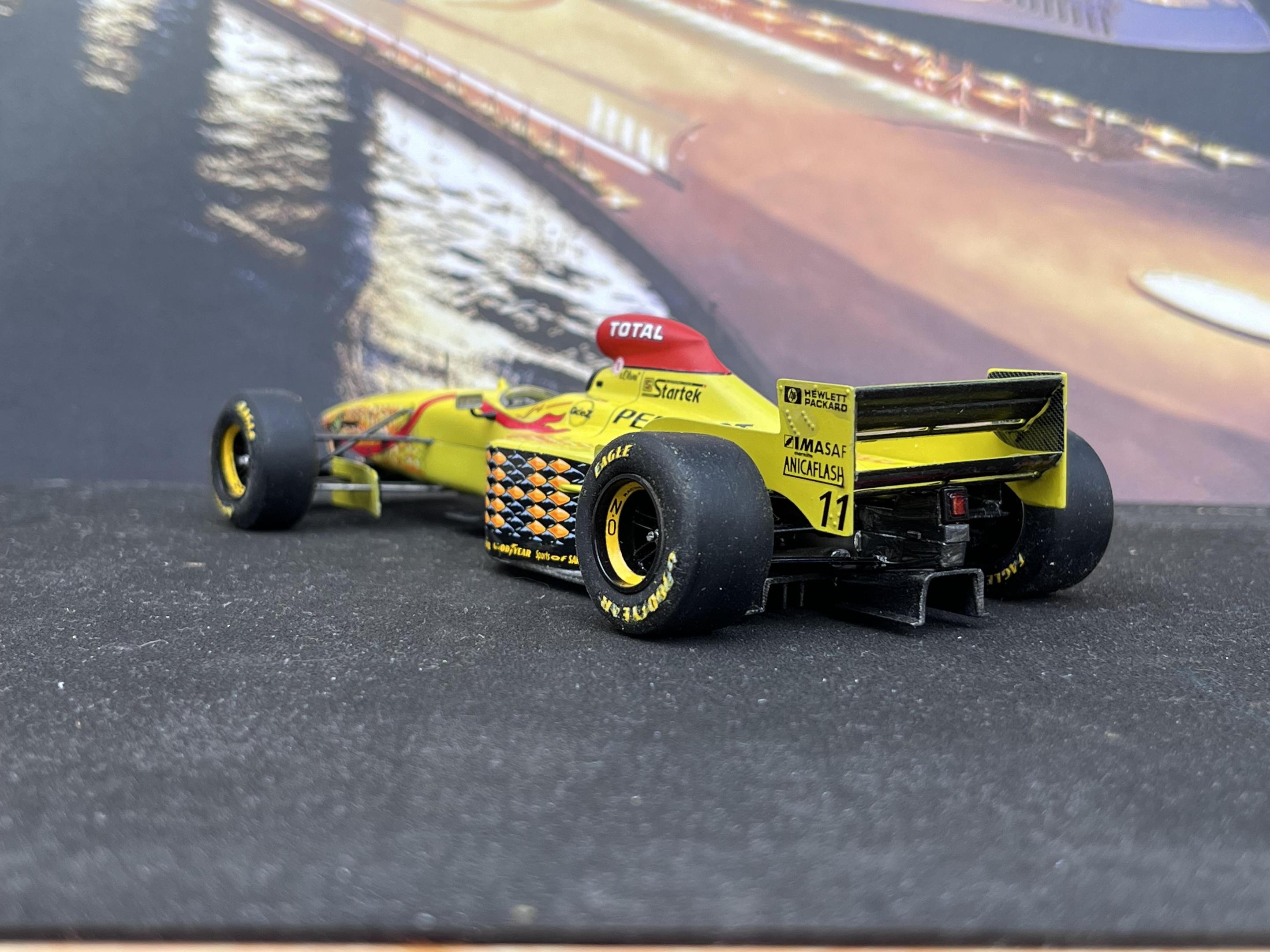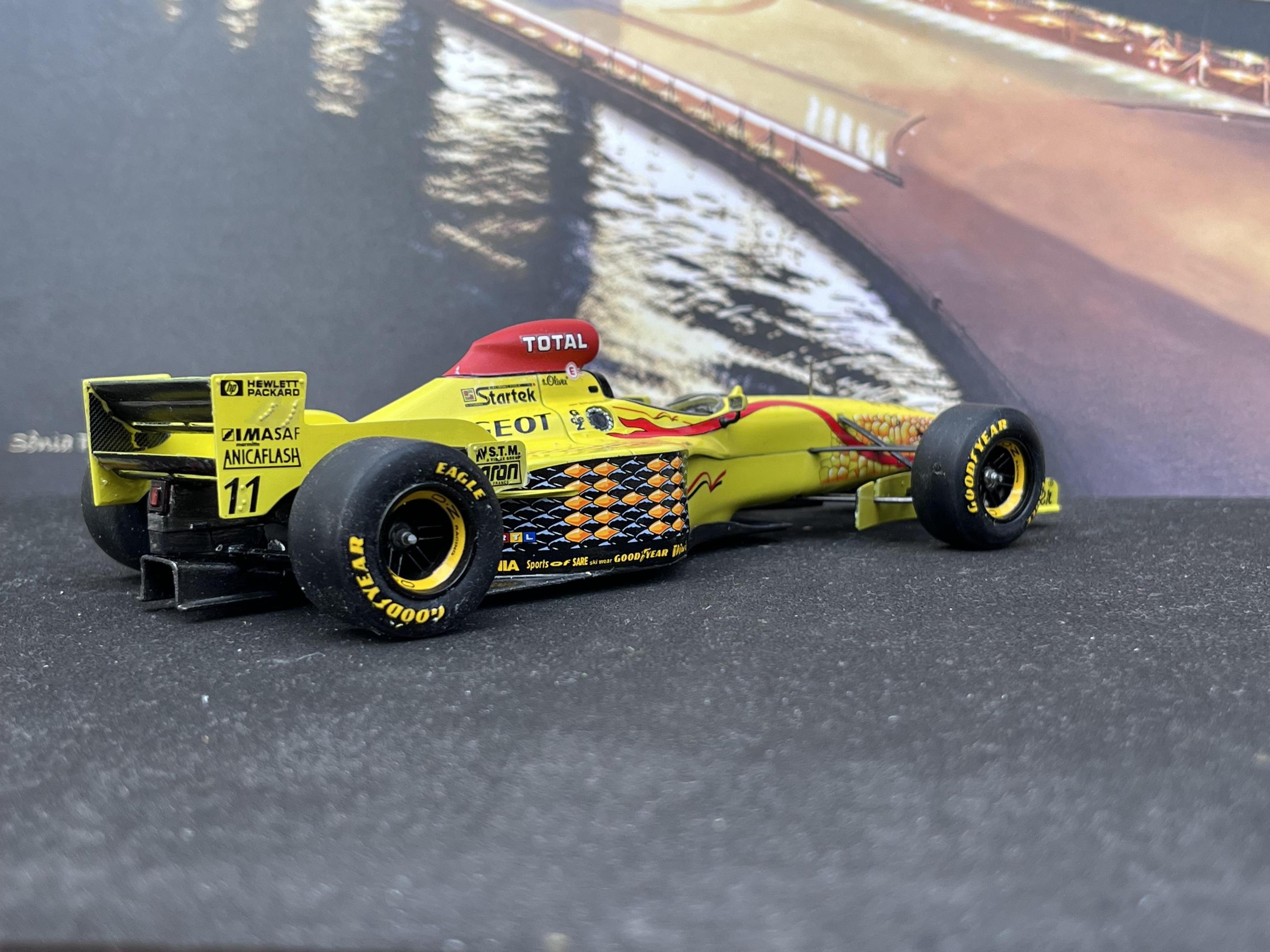 I have a personal relationship to this particular machine even though I made it as #11 instead of the #12 that we used to have in our monter back in 2005 when we where touring the swedish Junior Touring car Championchip. The car we had was on auction couple of years ago and as it seems it must have been a spare chassi or something since it does't have a chassi number, Looks the part though and I remember gaming Grand turismo in it as well as standing next to it while others where gaming. and I remember that it was quite light when we pushed it back an forth in to the trailer, even though the tires had low pressure. Here is a link to the one we had with uss. Jordan Peugeot 197, Formel 1-bil — 1997 på Bilweb Auctions I made this build mostly during a week when I was feeling under the weather. Box stock except for antenna that was replaced by a needle. Had a clear coat problem on the tires so the decals got a bit damaged. Far from perfect but I like these cars and it felt good to get something done. It was a nice kit to build, in 1/24 scale and nice decals, some where realy hard to get them to stick to the body and form around the curvature even though i was using solvents. Paint is Tamiya LP yellow airbrushed on and al other colors are by Vallejo. first time I tried the method to use a nylon sock to Make it to look like CF which turned out ok.