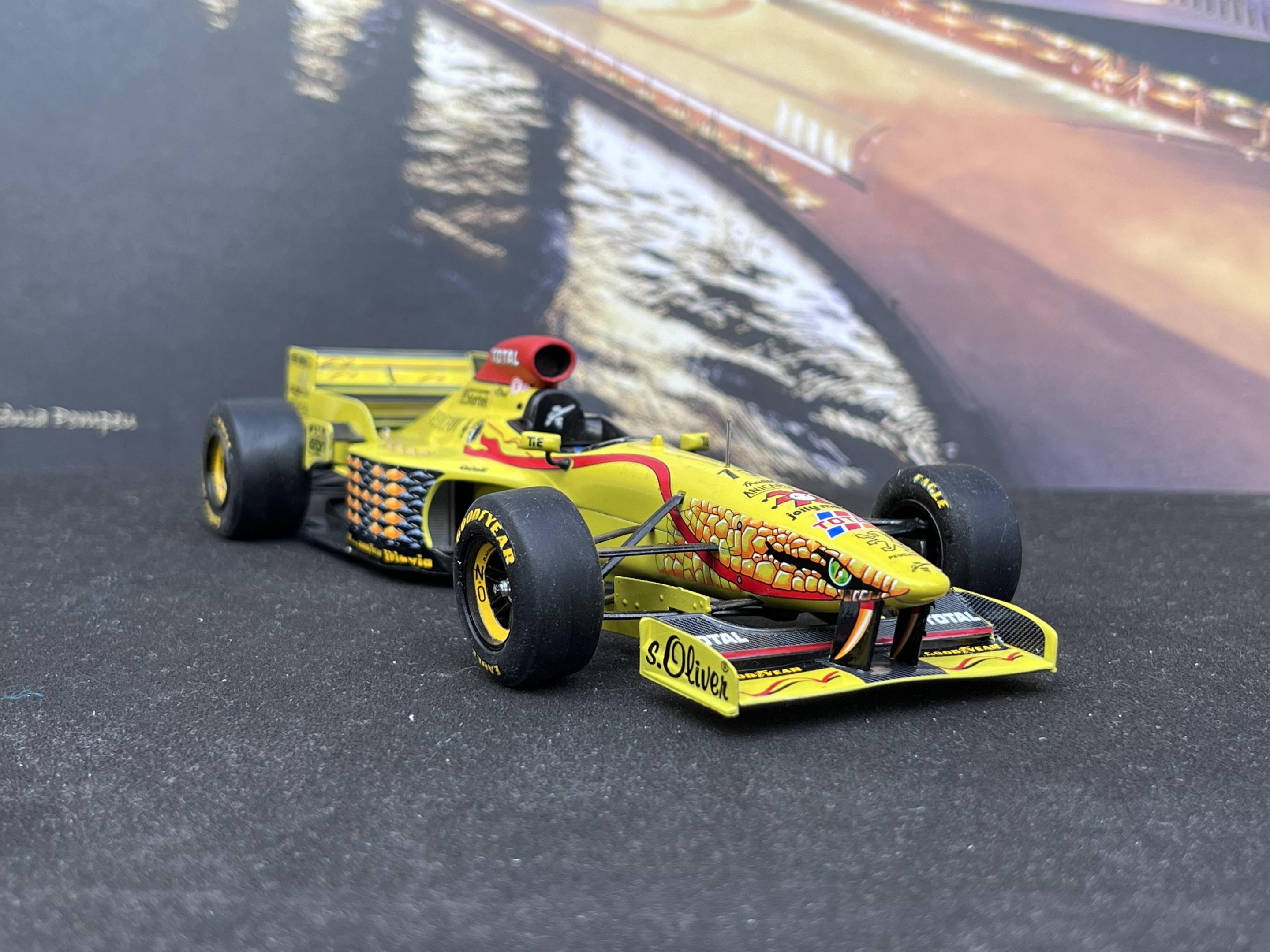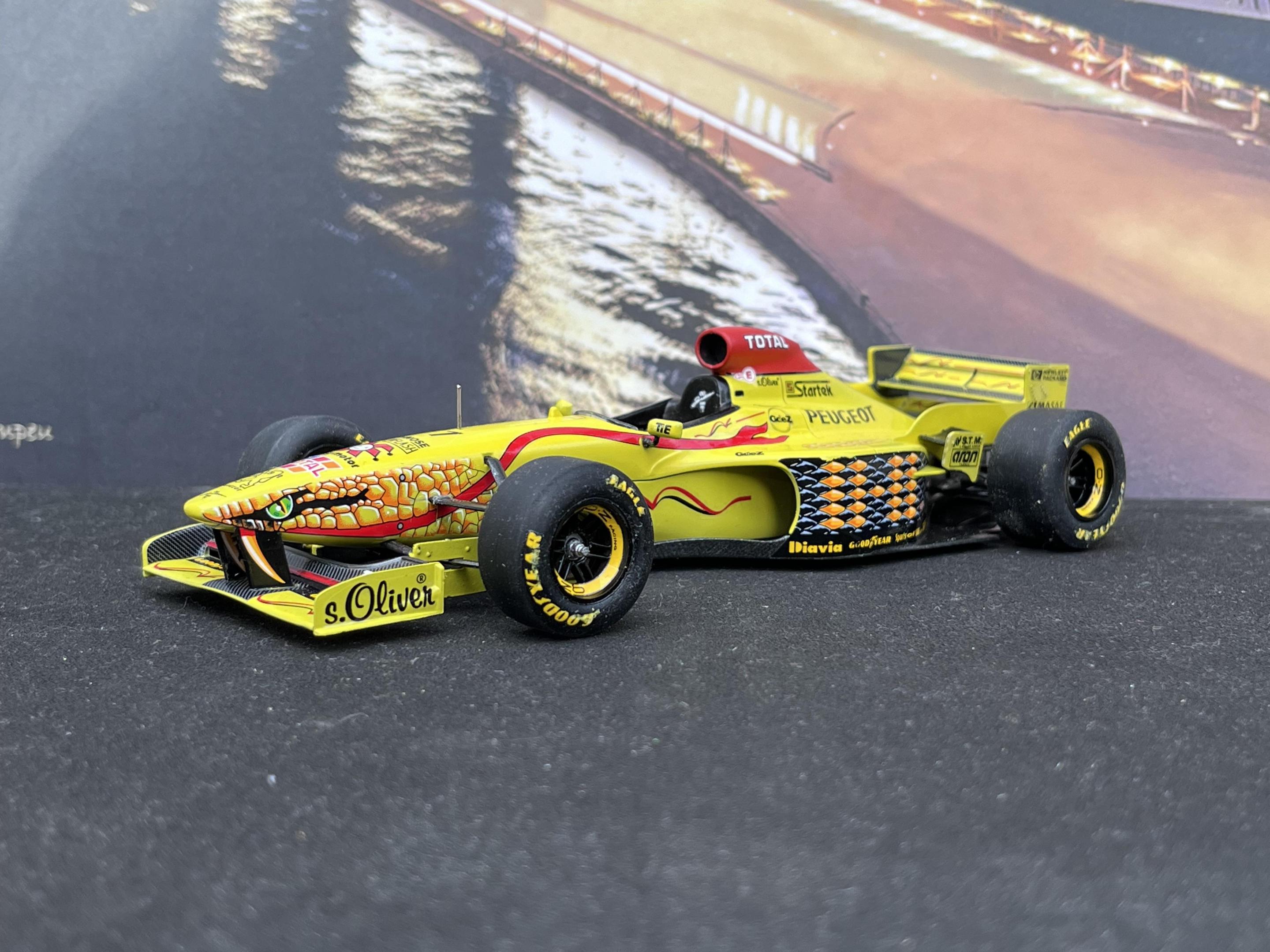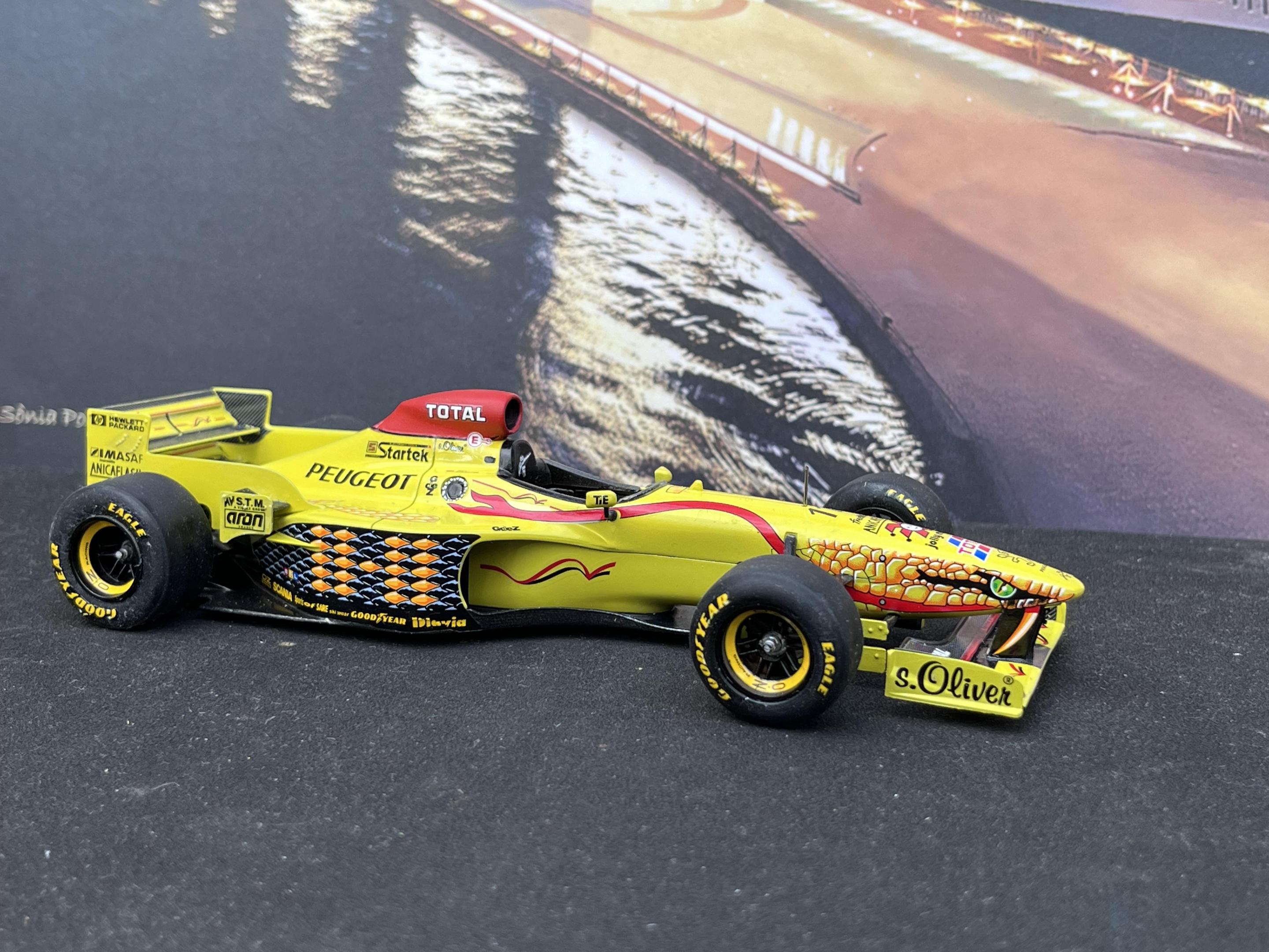 I have a personal relationship to this particular machine even though I made it as #11 instead of the #12 that we used to have in our monter back in 2005 when we where touring the swedish Junior Touring car Championchip. The car we had was on auction couple of years ago and as it seems it must have been a spare chassi or something since it does't have a chassi number, Looks the part though and I remember gaming Grand turismo in it as well as standing next to it while others where gaming. and I remember that it was quite light when we pushed it back an forth in to the trailer, even though the tires had low pressure. Here is a link to the one we had with uss. Jordan Peugeot 197, Formel 1-bil — 1997 på Bilweb Auctions I made this build mostly during a week when I was feeling under the weather. Box stock except for antenna that was replaced by a needle. Had a clear coat problem on the tires so the decals got a bit damaged. Far from perfect but I like these cars and it felt good to get something done. It was a nice kit to build, in 1/24 scale and nice decals, some where realy hard to get them to stick to the body and form around the curvature even though i was using solvents. Paint is Tamiya LP yellow airbrushed on and al other colors are by Vallejo. first time I tried the method to use a nylon sock to Make it to look like CF which turned out ok.