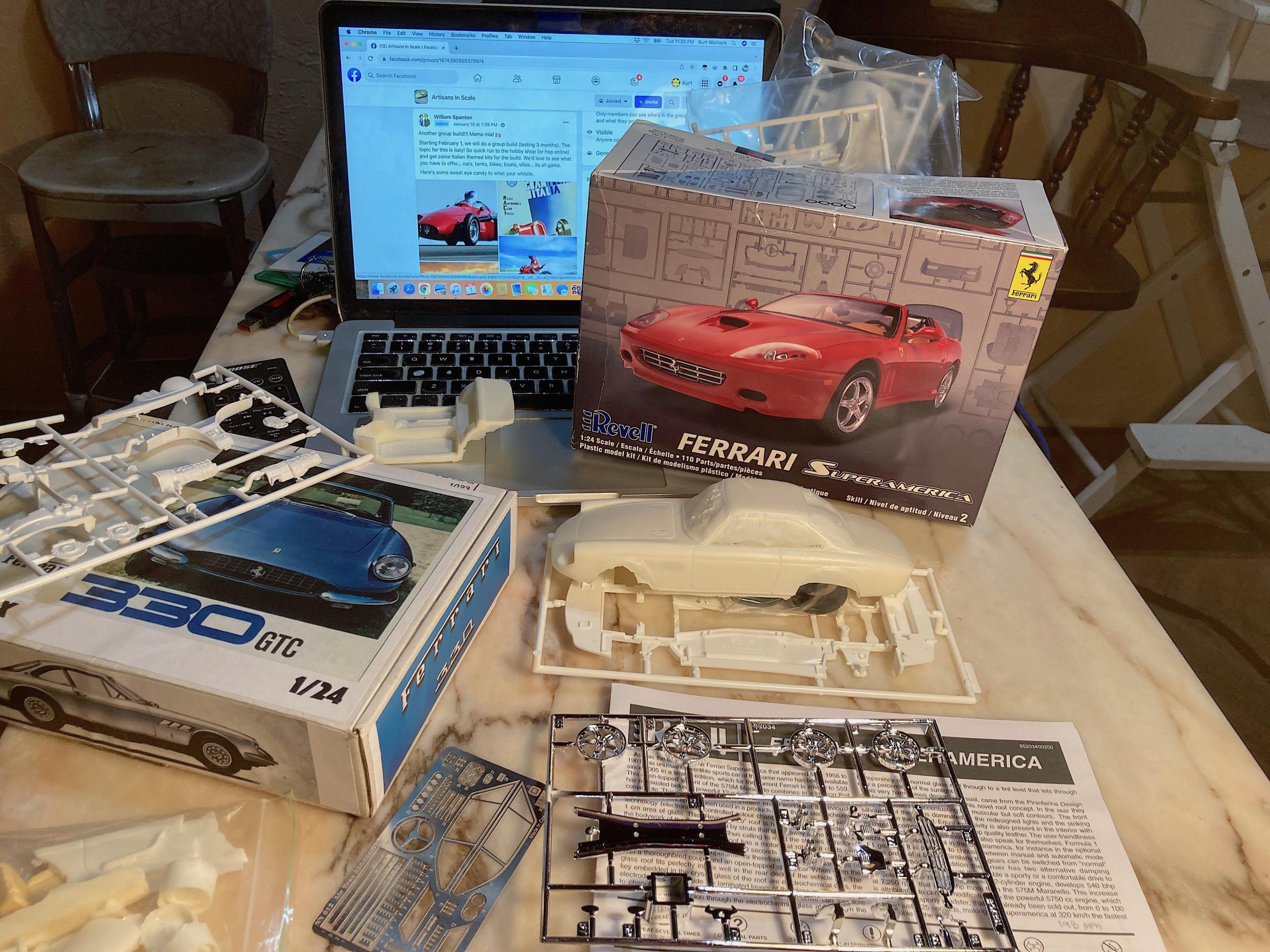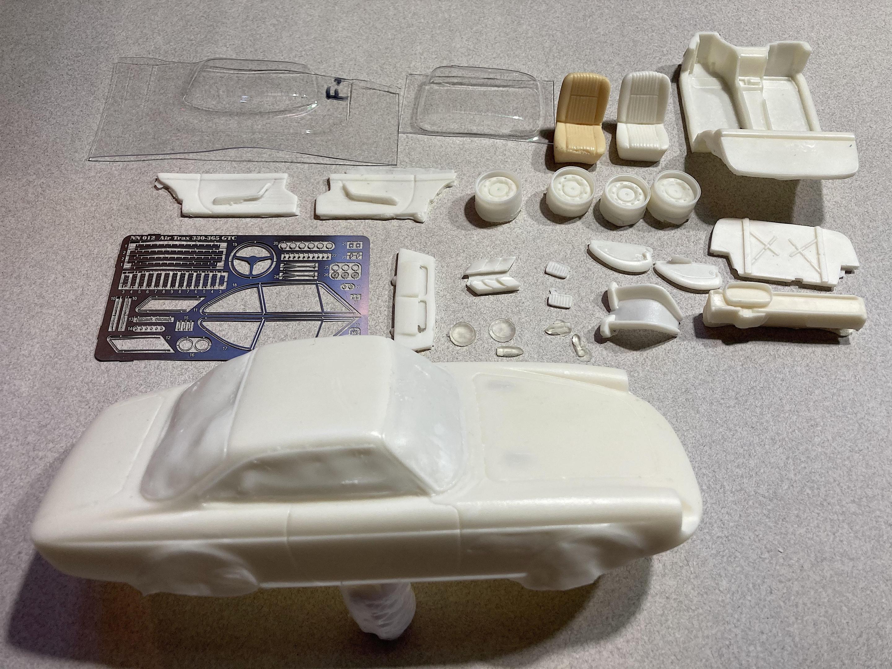 Kitbashing the Airtrax Ferrari 330 GTC resin kit with the Revell 575 M Superamerica. The reason I have always wanted the 330 GTC, when I was a kid, my dad knew someone who had one (and an Aston Martin, and a BMW Bavaria, and a Mercedes 300 SC), and after incessant begging he took me for a ride. Even though it needed a tuneup, it sure made an impression on me. Because of this forum, I found the source, so I sprung for it. Found the pictures online, to print out for the box art. The body appears to be accurate, the photo-etch is really nice even though there is no "Ferrari" or Prancing Horse emblems (have that covered). You need to provide tires, and a chassis, I guess the 250 SWB or 275 GTB/S, or even the Daytona, would be the most accurate, but I wanted something different. Found the Superamerica at a swap meet in town (not a model swap meet) for $10. The wheelbase is almost the same, track width might be a challenge, but that's what flares are for. Doing this for a Fakebook community build, maybe I will nickname it Mama Mia! ?? Owners manual, will photo-reduce for a final detail. A look at the parts. No instructions. Need to make the steering wheel rim, might try using wood like what Replicas & Miniatures of MD has done. I have rally lights left over from my Cannonball WRC Subaru (not shown). Custom box: Community build started 1/01/22, proof that I didn't get a head start. ? One wheel is terrible, but since I didn't plan to use them, not a big deal.