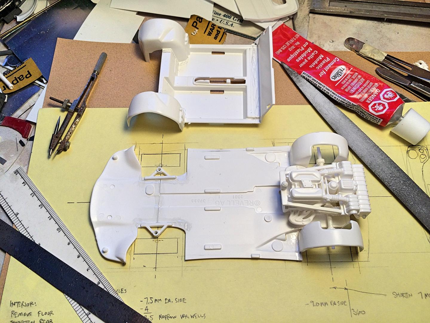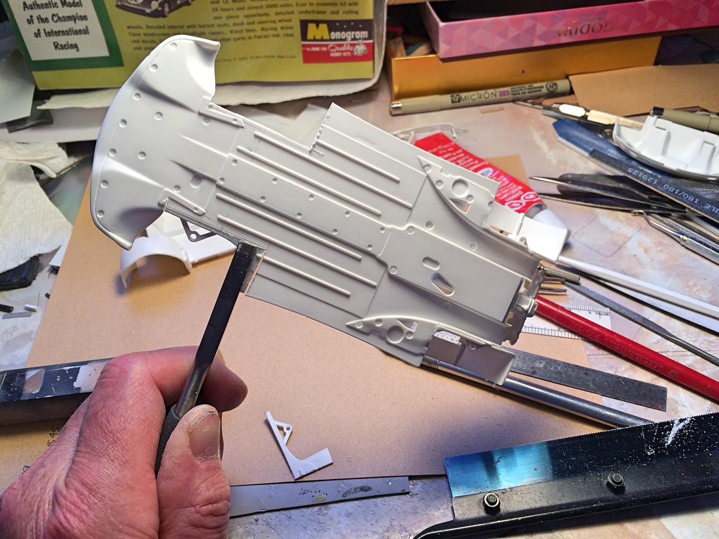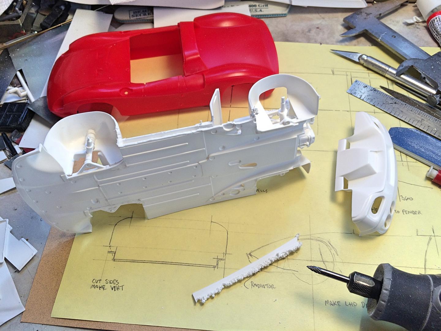 Gestation happened in my Monogram Ferrari 275P vintage kit review thread. I started by barely tacking the engine together and onto the chassis pan. Measured and drew plans to figure out where to chop and modify. I thought cutting down the engine components would help, and considering the way Revell engineered it, nobody would notice. Each surface was filed down before reassembling with just a little more glue, but still can separate to paint. Cut apart the plenum, air filter and canister part. Sawed off the engine bay sides. I sawed, and in some cases scribed and broke apart the chassis pan. The suspension is really non-existent, lower A-arms were easy to relocate. The back has been narrowed. Shortened the pan behind the front axle line. I glued all this with regular toxic Testors glue, and Flex-i-file liquid cement, much like welding. That way if I needed to adjust, could pull apart, and I could squirm it around for adjustment (supergluing does not allow this). I used the Dremel with this bit for everything, here I just removed the edge of the pan. I really cut apart the interior tub, with a saw, and filed down and straightened the cuts. I needed to keep this as a separate piece, for being able to get the struts in later. I tacked parts onto the pan, but welded all together as I went. I adjusted my plan as needed, kept the tunnel which will need some modification to the chrome trim part. I really like the tunnels, so cut off the rear body part, made several saw cuts. Front of the pan was sawed off, some Dremel grinding to shape, real rough at this time. But it all fits in great, and don't need an engine hump! Thinking of how to add fender flares, simple round bumps most likely. Still need to shorten front axles. Modified the rear, decided to keep the original grills, but going to be modified at the bottom, and will be mesh. Drilled holes for the Mondial taillights, have also done for the headlights. The valance edge will be refined later. I was going to have the exhausts exit through holes similar to the Mondial, but it will be easier (I hope) to direct down from the mufflers into the tunnels, and then back. Now I need to leave it alone, so the cement will cure. I discovered the body is twisted, so need to consider how to straighten with strategic body mounts using screws. The fender flares will be fun. Interior should have simple door panels, and dashboard. Need to figure out the radiator in front, thinking laid almost flat, with channels exiting before the wheels. Then when all that is done, cut off the engine lid, and then will need to fabricate chassis box thingies and framework continued from the engine part. Two more radiators in back, modify the body ducts. Then exhaust pipes. Then seats, I got some cool aftermarket units at the DSC show. Color, Ferrari red with a pearl overcoat. Dann will hate that.