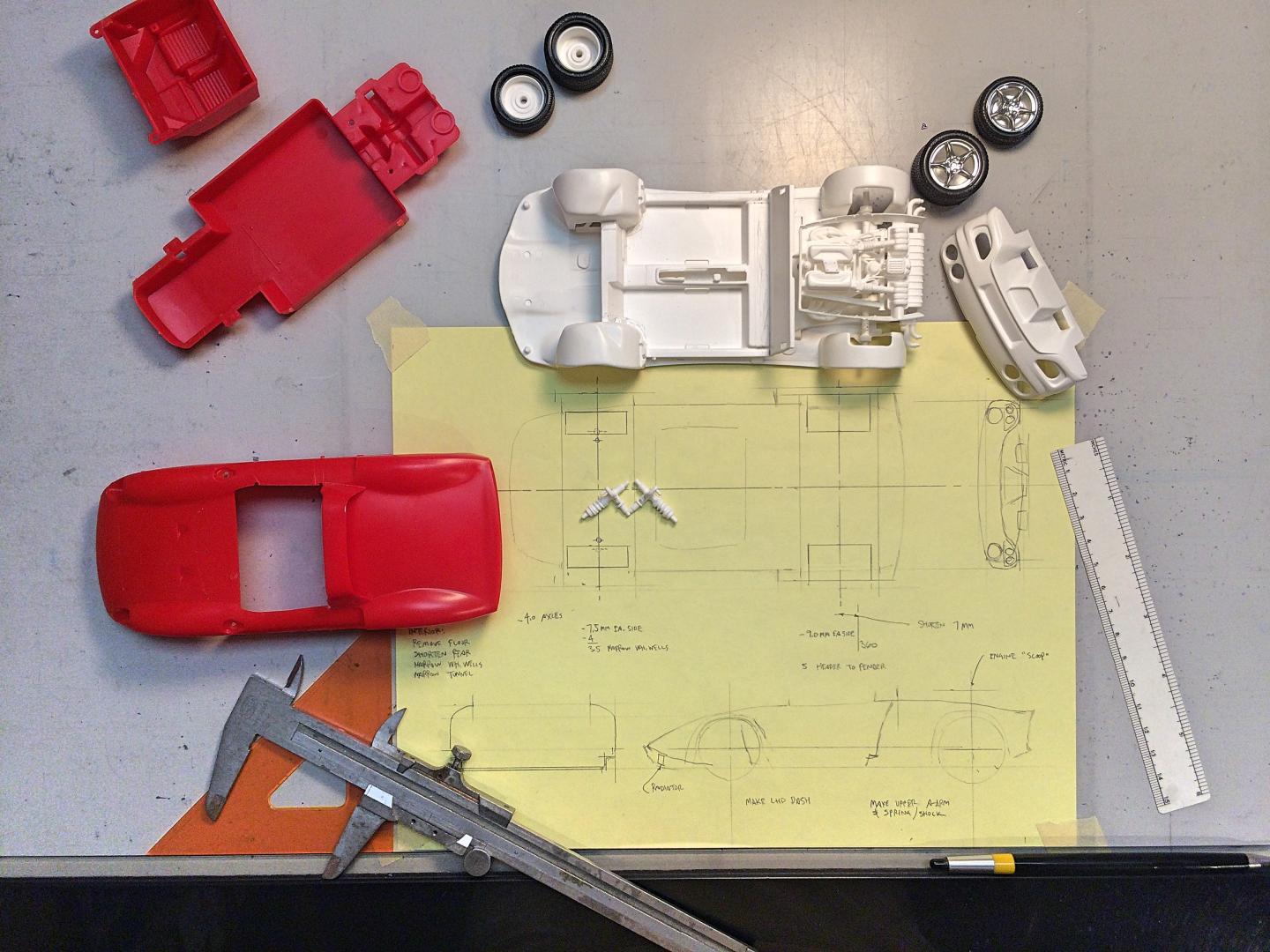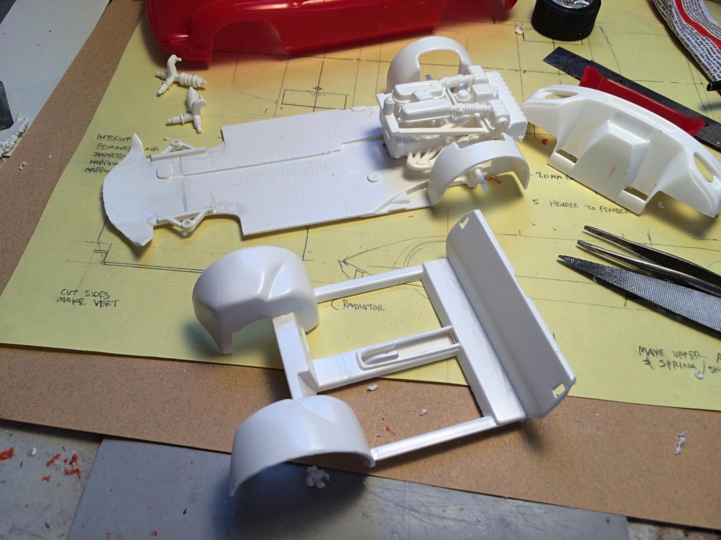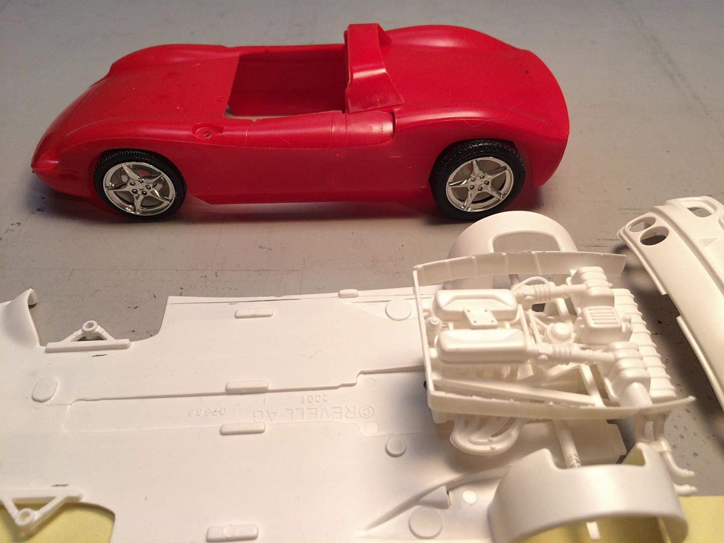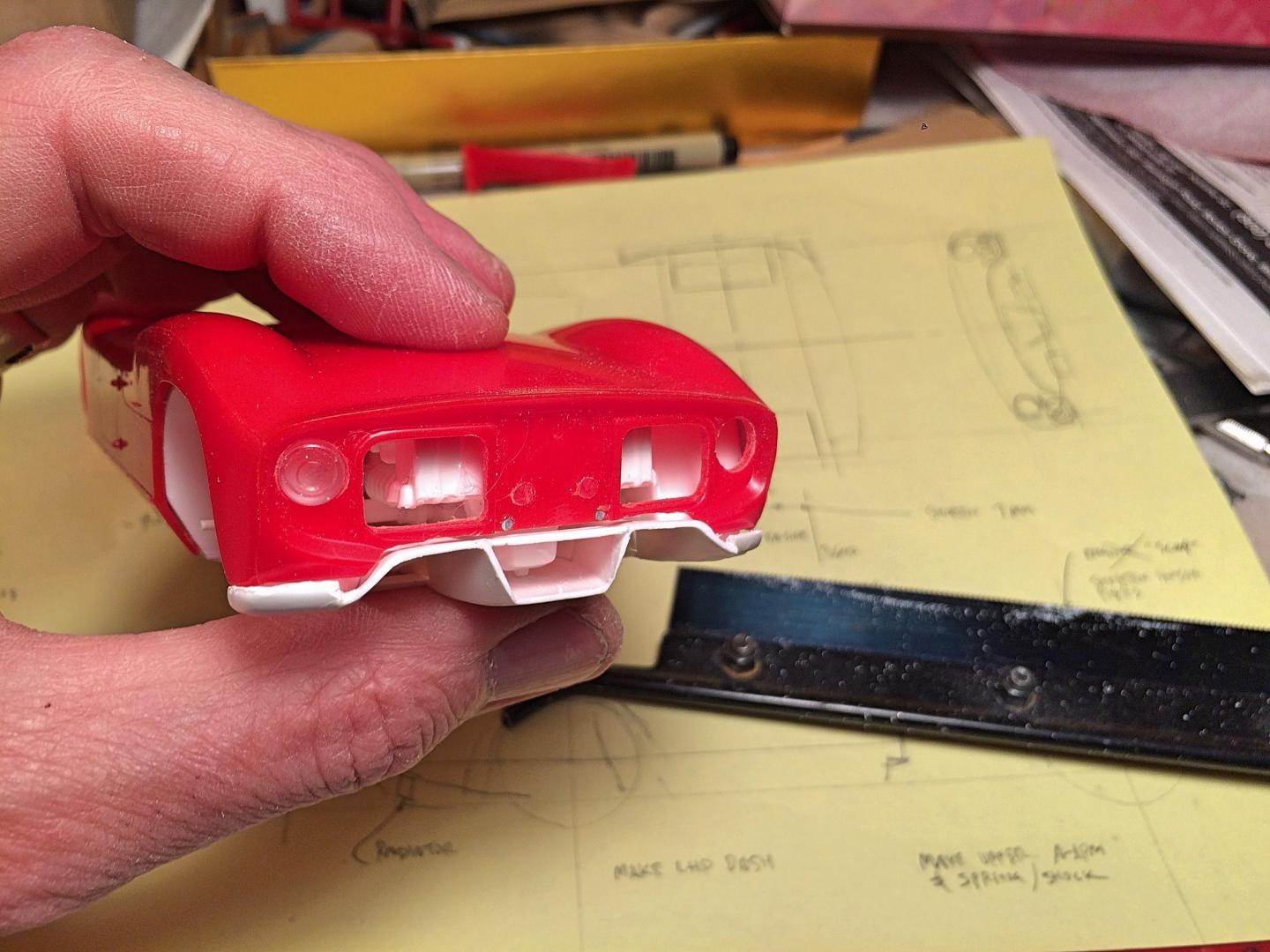 Gestation happened in my Monogram Ferrari 275P vintage kit review thread. I started by barely tacking the engine together and onto the chassis pan. Measured and drew plans to figure out where to chop and modify. I thought cutting down the engine components would help, and considering the way Revell engineered it, nobody would notice. Each surface was filed down before reassembling with just a little more glue, but still can separate to paint. Cut apart the plenum, air filter and canister part. Sawed off the engine bay sides. I sawed, and in some cases scribed and broke apart the chassis pan. The suspension is really non-existent, lower A-arms were easy to relocate. The back has been narrowed. Shortened the pan behind the front axle line. I glued all this with regular toxic Testors glue, and Flex-i-file liquid cement, much like welding. That way if I needed to adjust, could pull apart, and I could squirm it around for adjustment (supergluing does not allow this). I used the Dremel with this bit for everything, here I just removed the edge of the pan. I really cut apart the interior tub, with a saw, and filed down and straightened the cuts. I needed to keep this as a separate piece, for being able to get the struts in later. I tacked parts onto the pan, but welded all together as I went. I adjusted my plan as needed, kept the tunnel which will need some modification to the chrome trim part. I really like the tunnels, so cut off the rear body part, made several saw cuts. Front of the pan was sawed off, some Dremel grinding to shape, real rough at this time. But it all fits in great, and don't need an engine hump! Thinking of how to add fender flares, simple round bumps most likely. Still need to shorten front axles. Modified the rear, decided to keep the original grills, but going to be modified at the bottom, and will be mesh. Drilled holes for the Mondial taillights, have also done for the headlights. The valance edge will be refined later. I was going to have the exhausts exit through holes similar to the Mondial, but it will be easier (I hope) to direct down from the mufflers into the tunnels, and then back. Now I need to leave it alone, so the cement will cure. I discovered the body is twisted, so need to consider how to straighten with strategic body mounts using screws. The fender flares will be fun. Interior should have simple door panels, and dashboard. Need to figure out the radiator in front, thinking laid almost flat, with channels exiting before the wheels. Then when all that is done, cut off the engine lid, and then will need to fabricate chassis box thingies and framework continued from the engine part. Two more radiators in back, modify the body ducts. Then exhaust pipes. Then seats, I got some cool aftermarket units at the DSC show. Color, Ferrari red with a pearl overcoat. Dann will hate that.